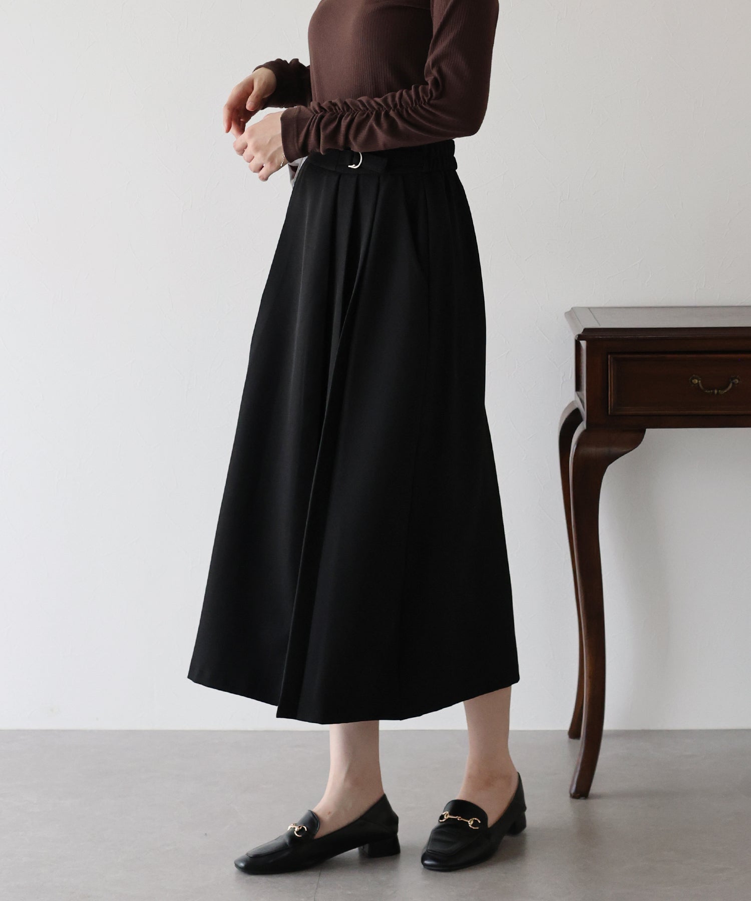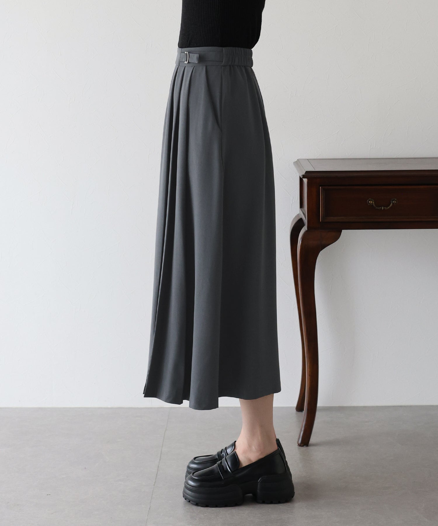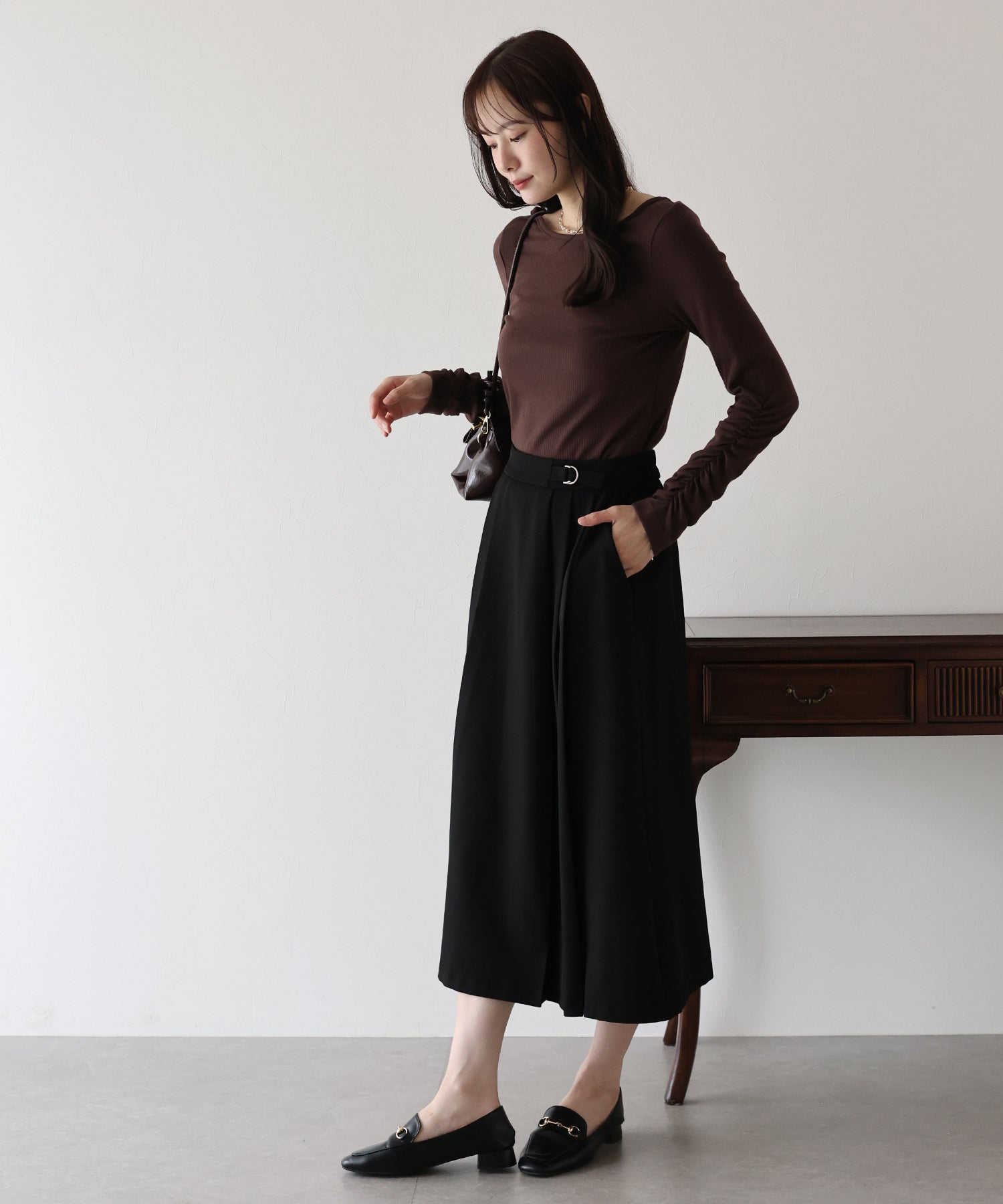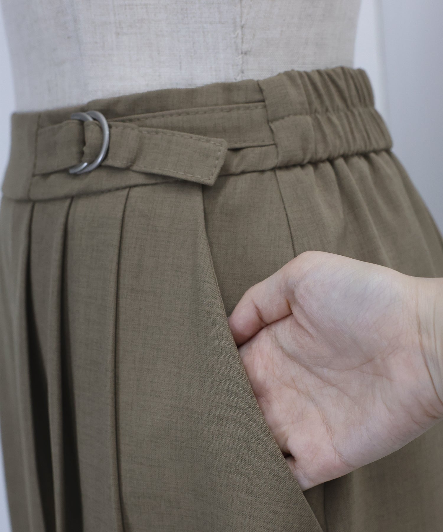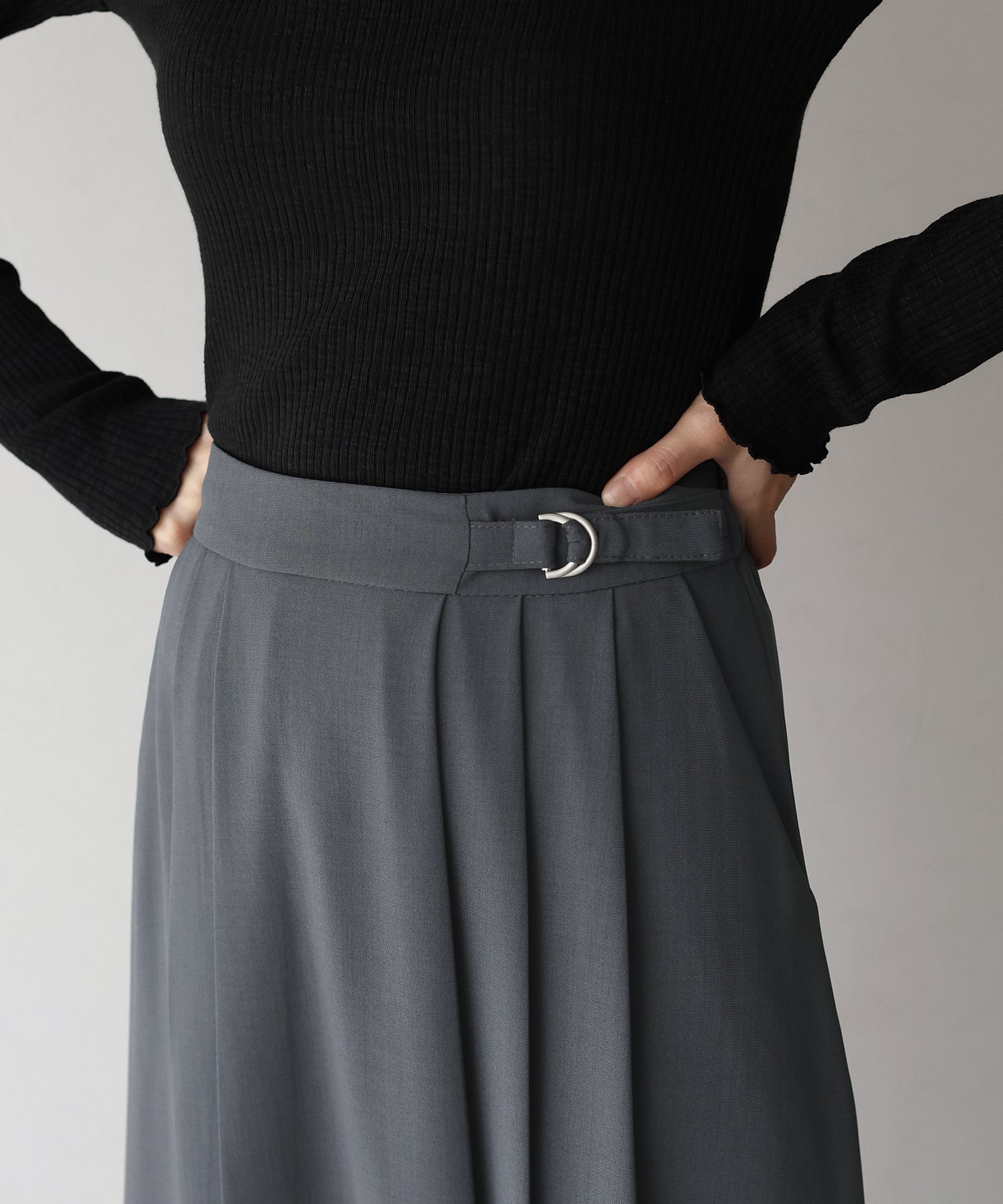 ウエストのバックルデザインがアクセントになり、きれいめですっきりとした印象をプラス。