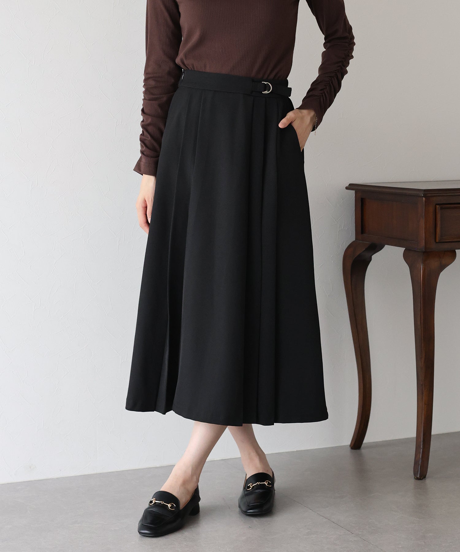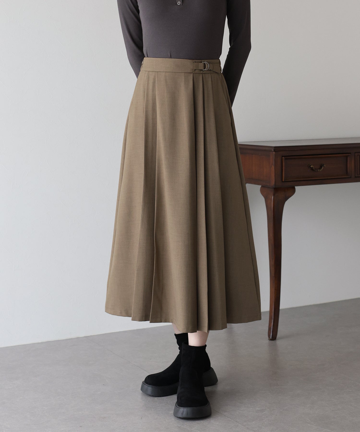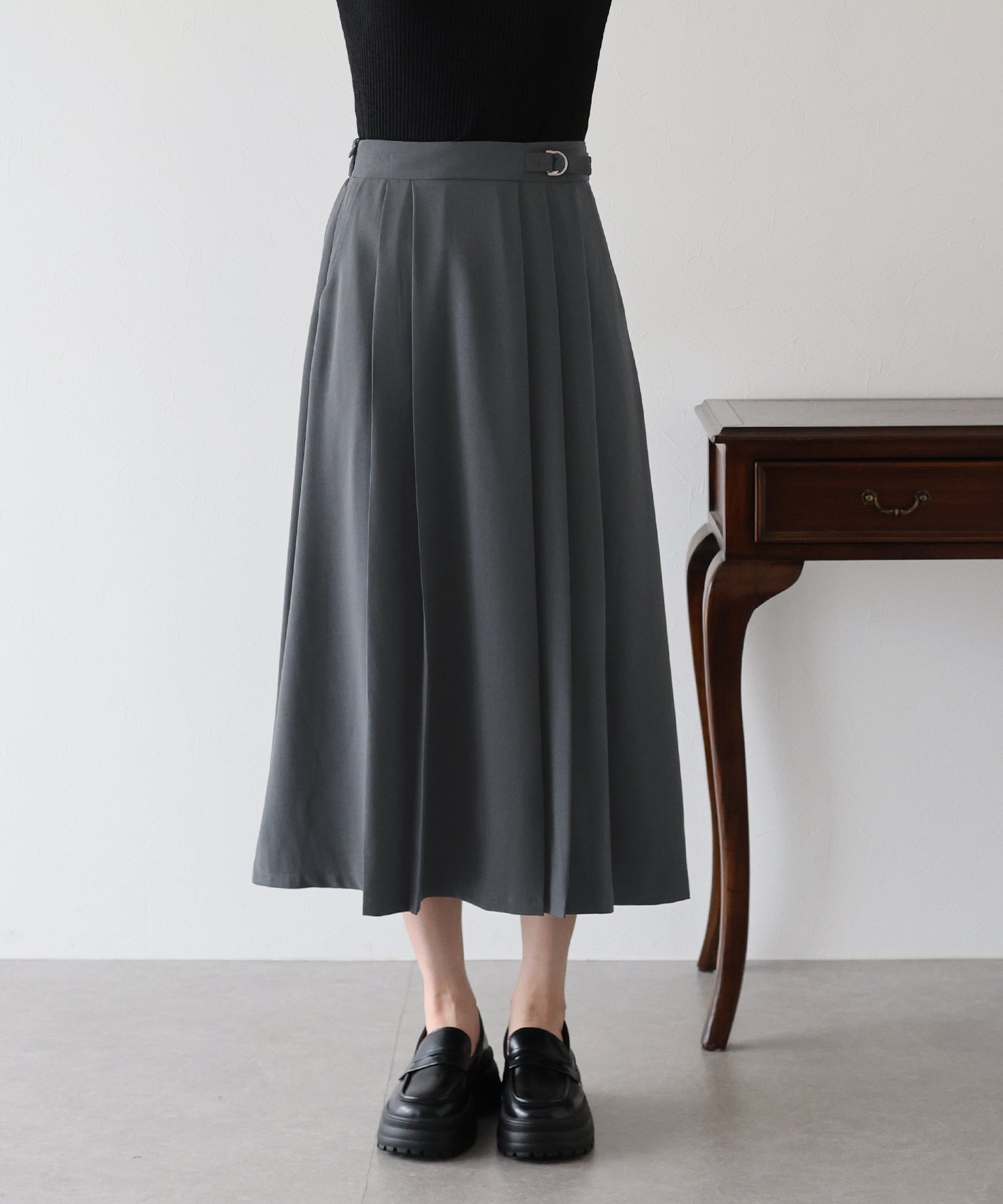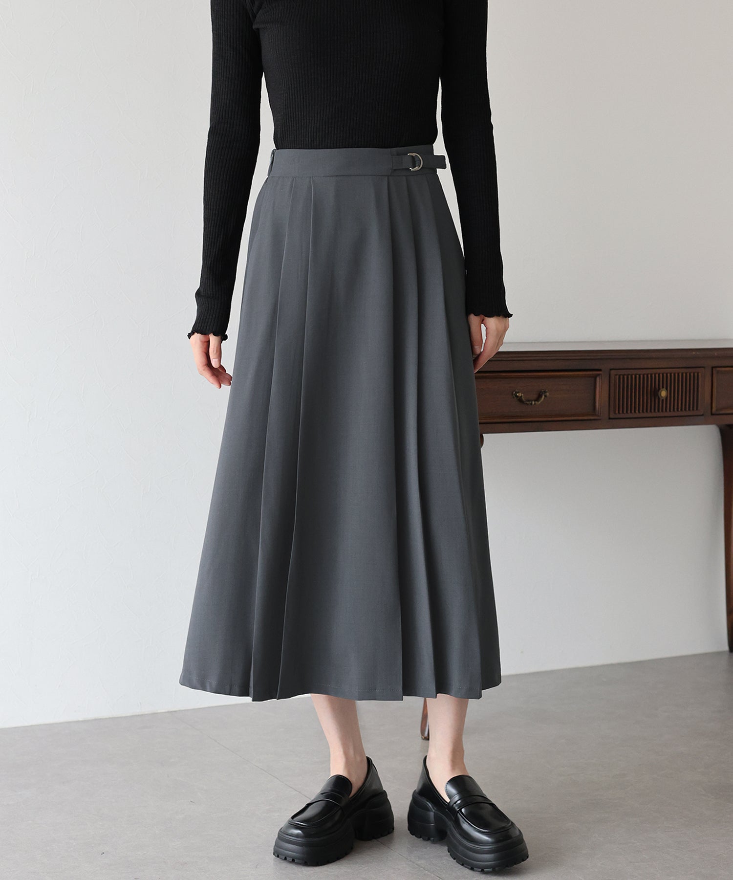 ウエストのバックルデザインがアクセントになり、きれいめですっきりとした印象をプラス。