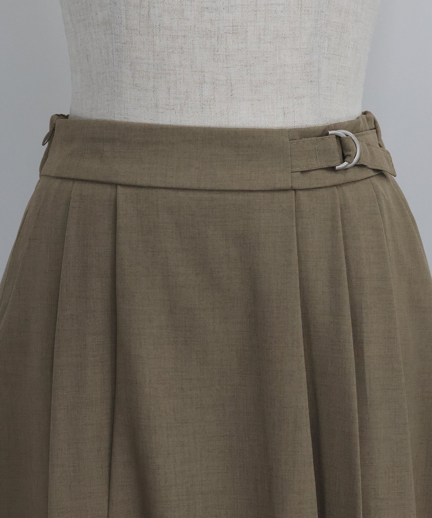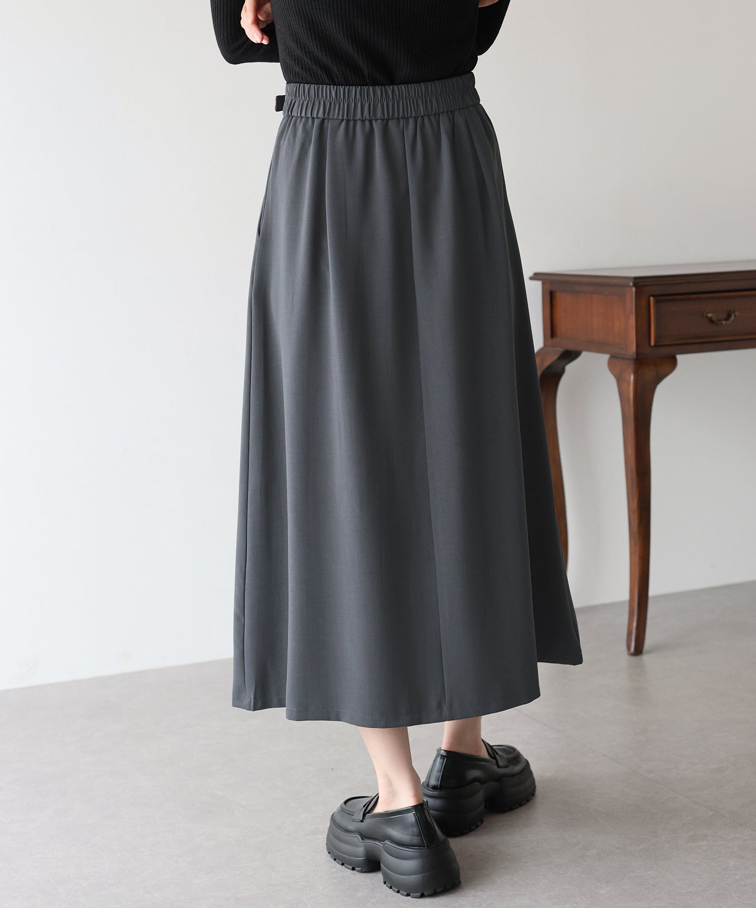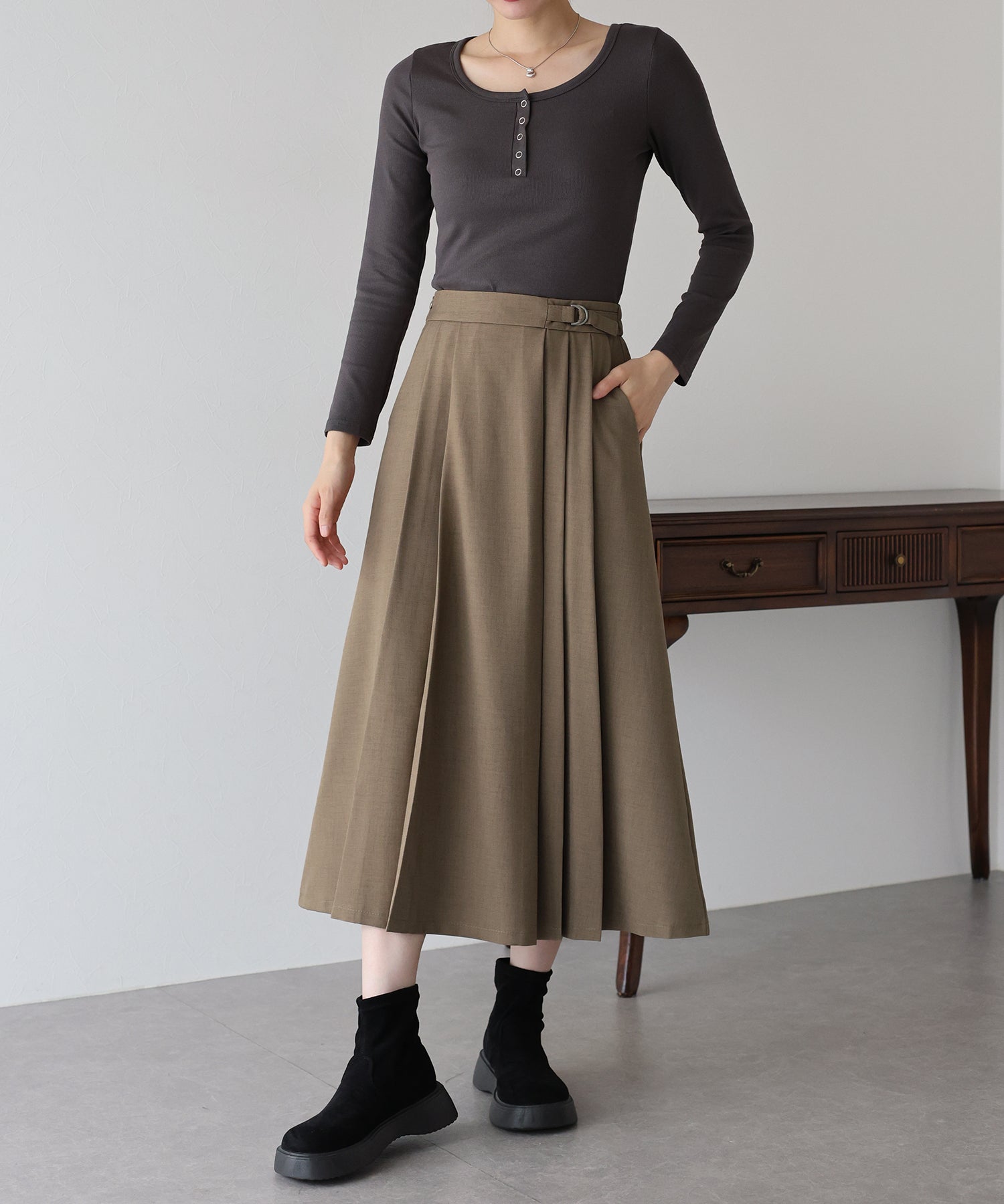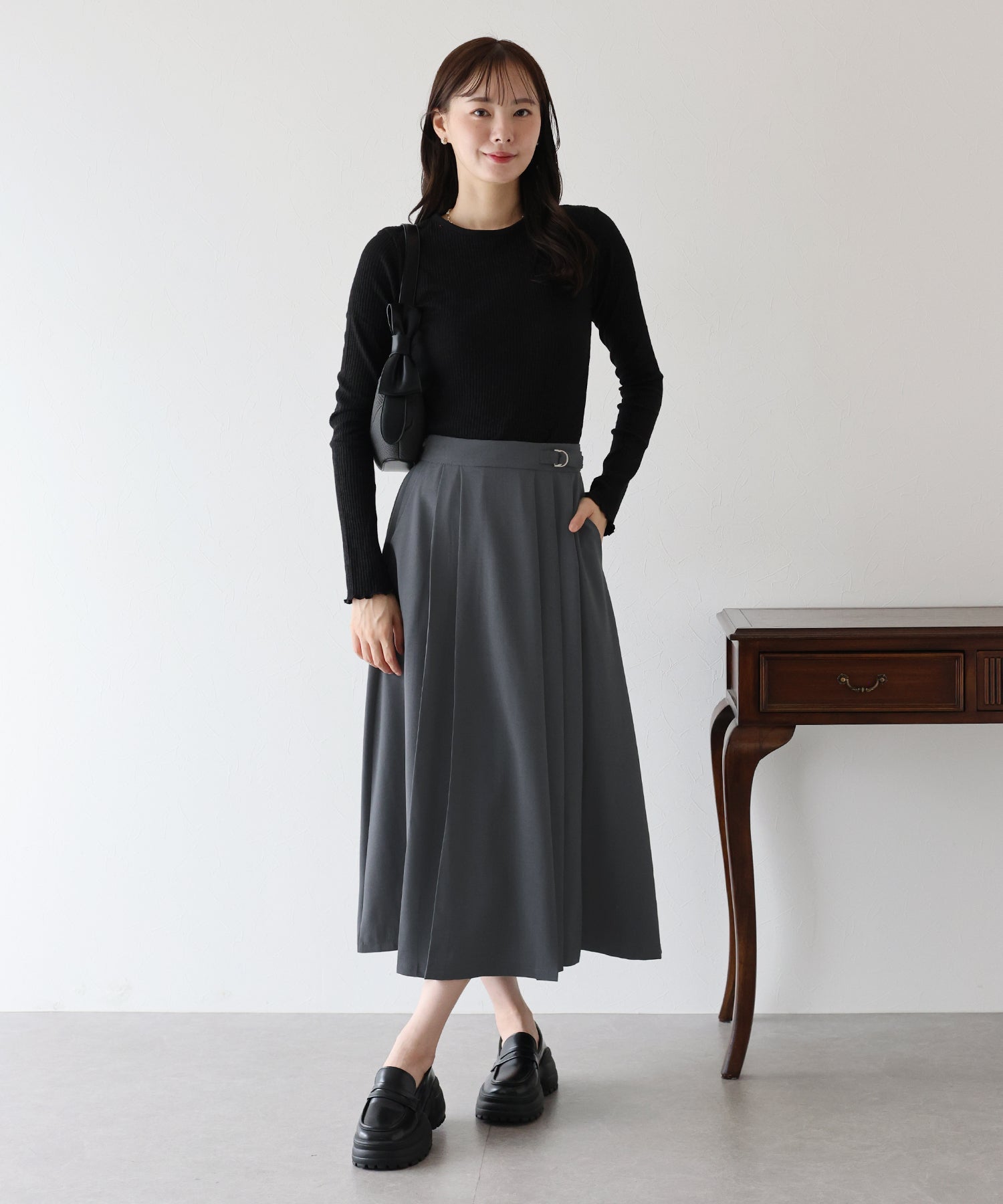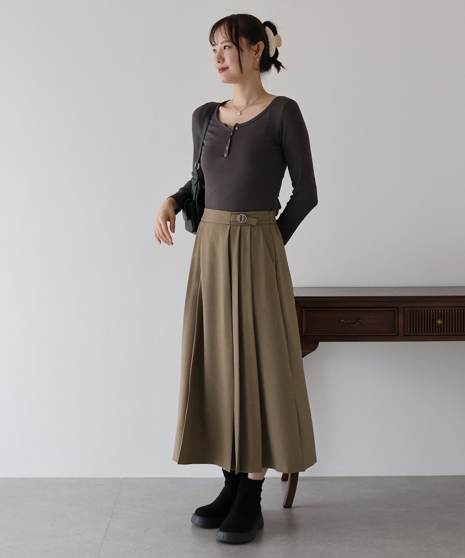ウエストのバックルデザインがアクセントになり、きれいめですっきりとした印象をプラス。
