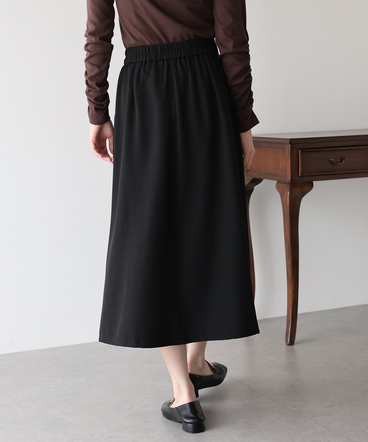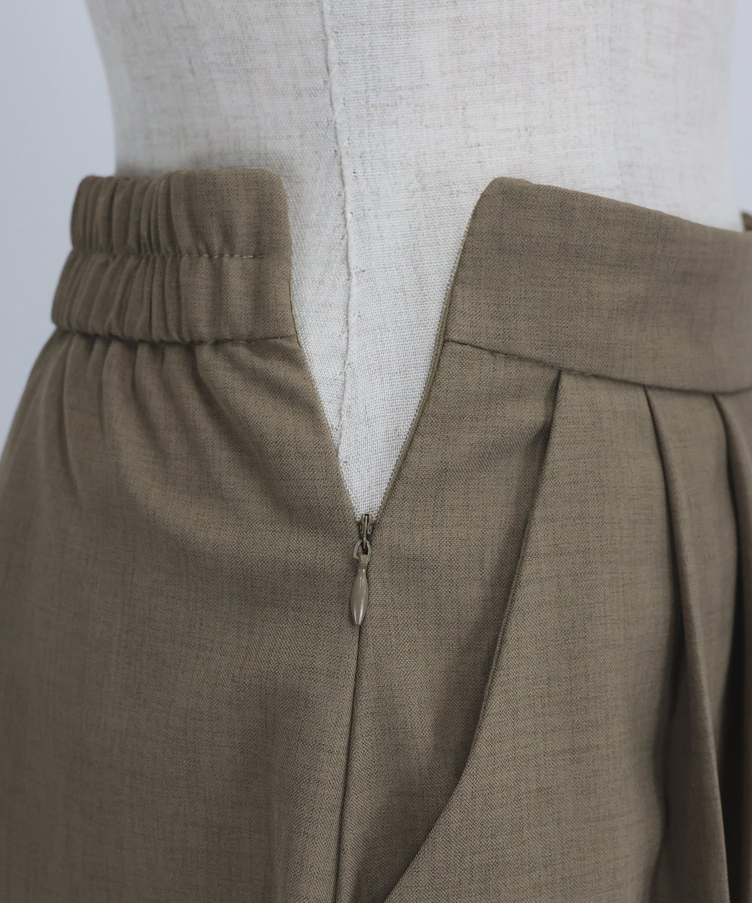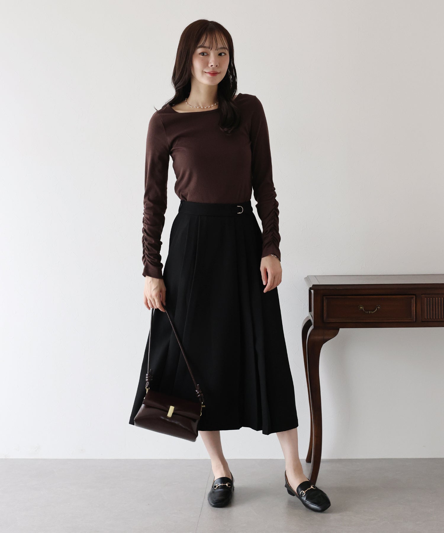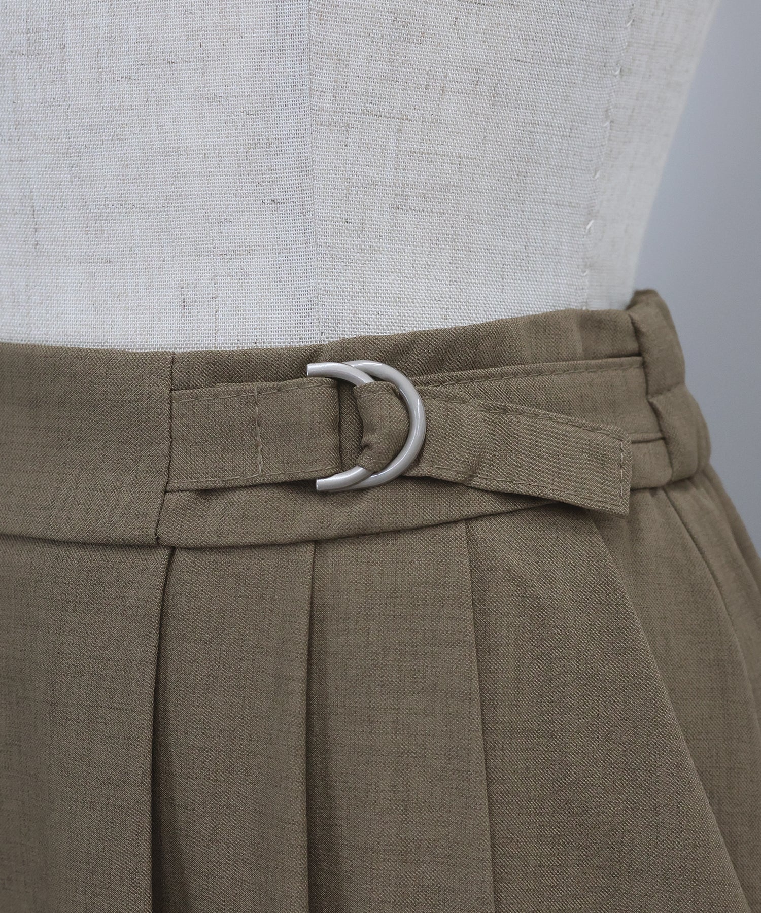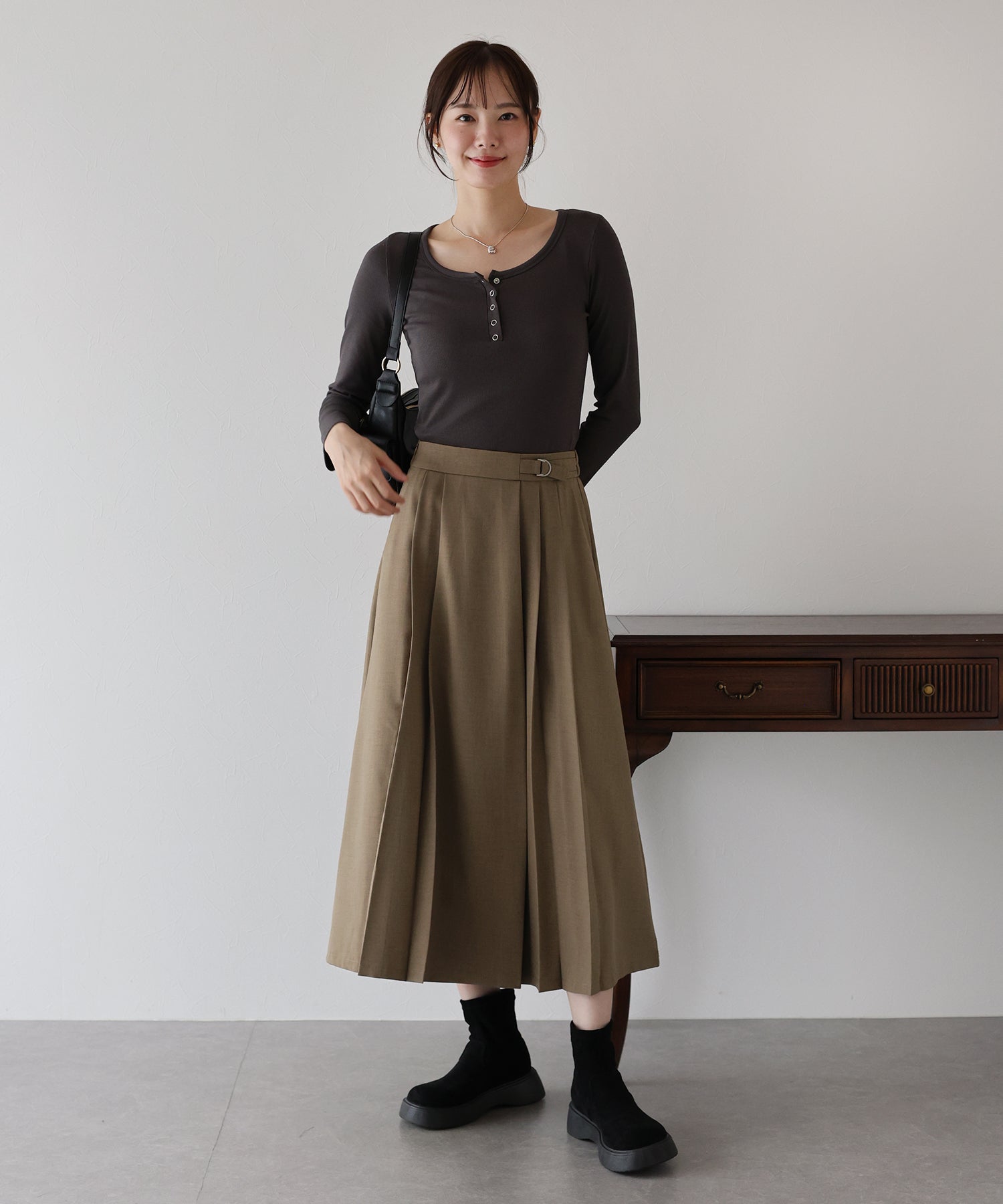 ウエストのバックルデザインがアクセントになり、きれいめですっきりとした印象をプラス。