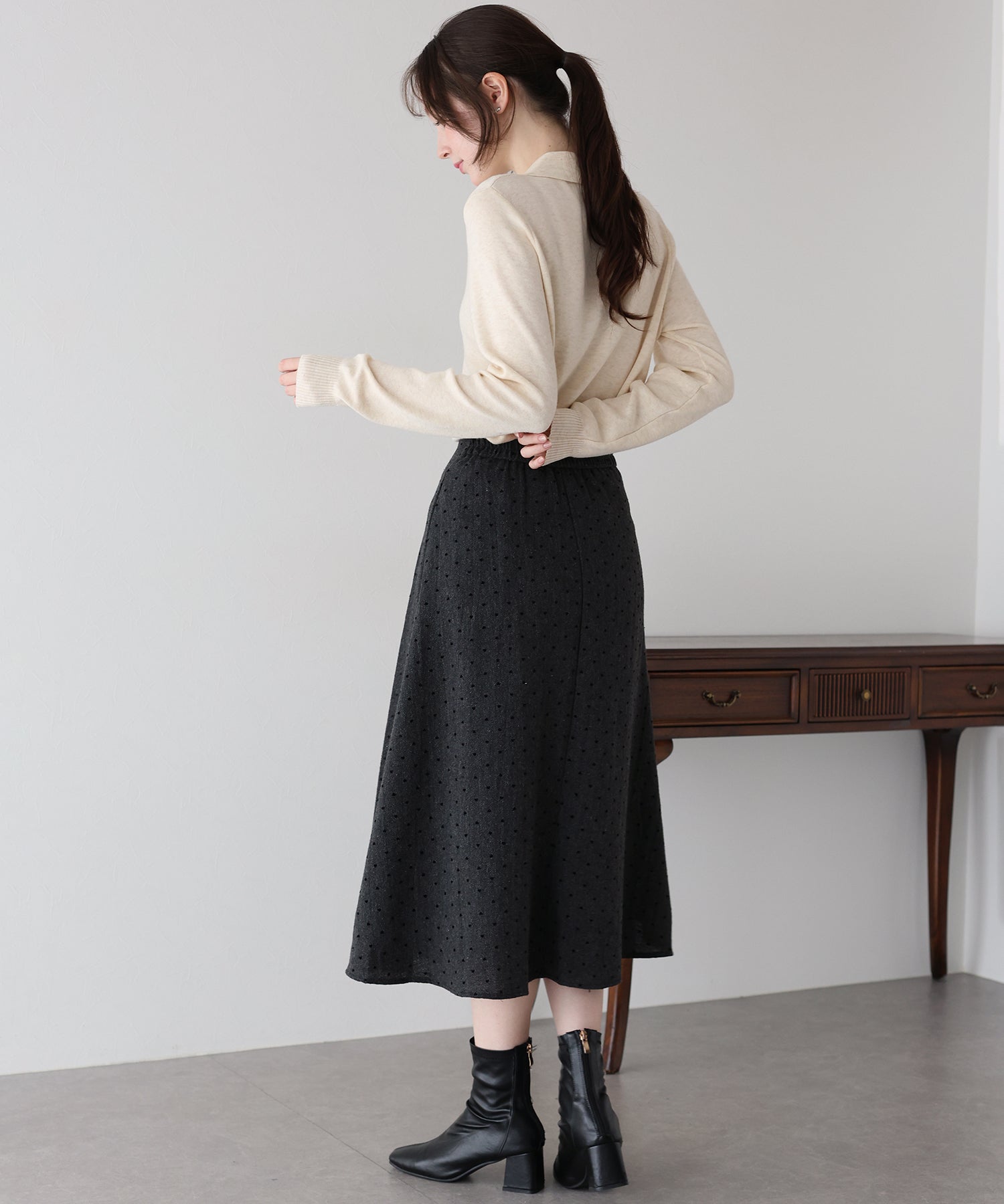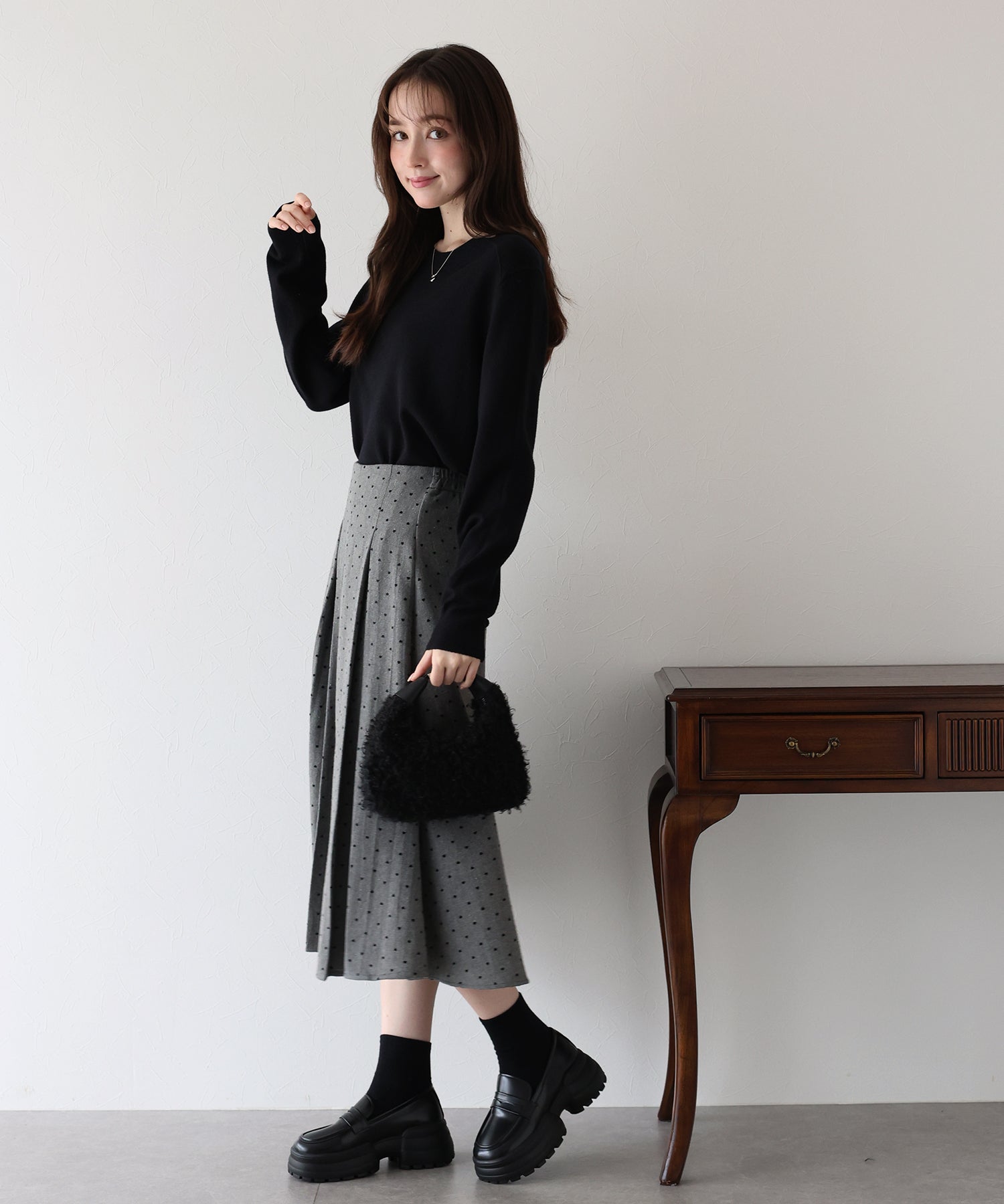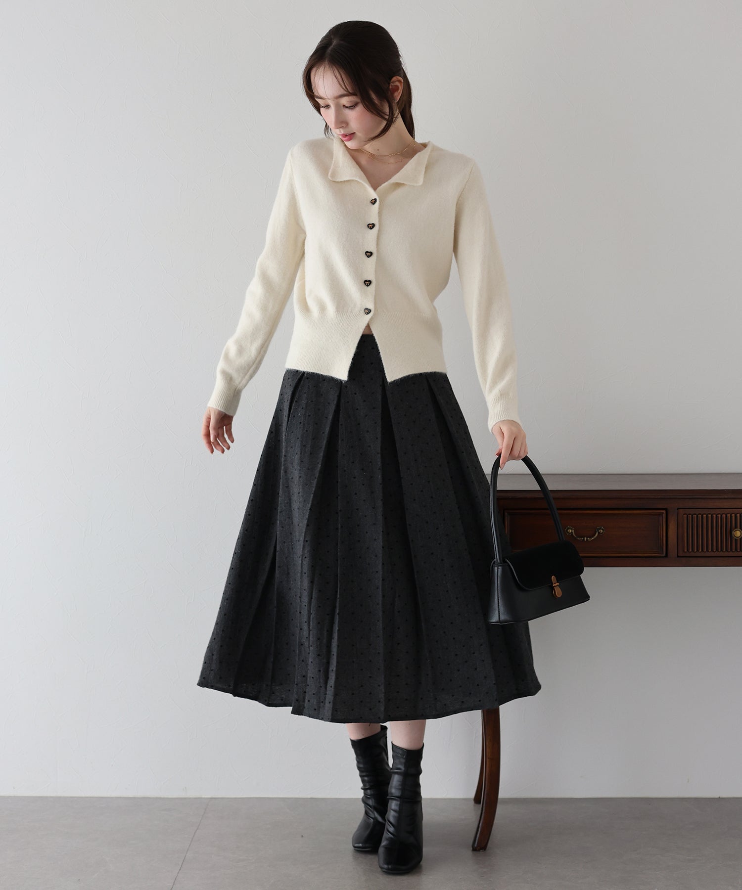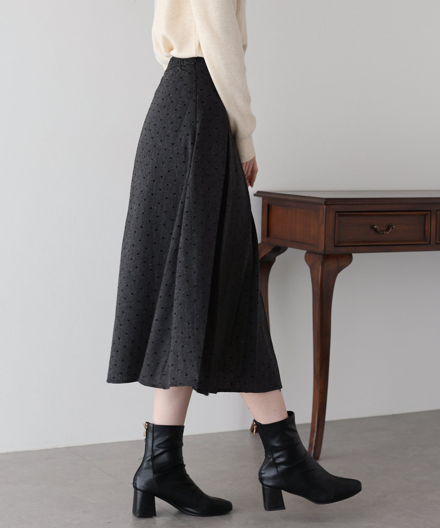 ハートドットのフロッキー加工を施し、さりげなく大人ガーリーな印象に。