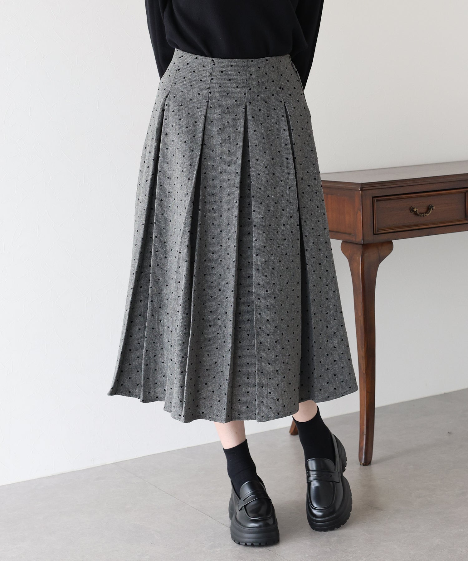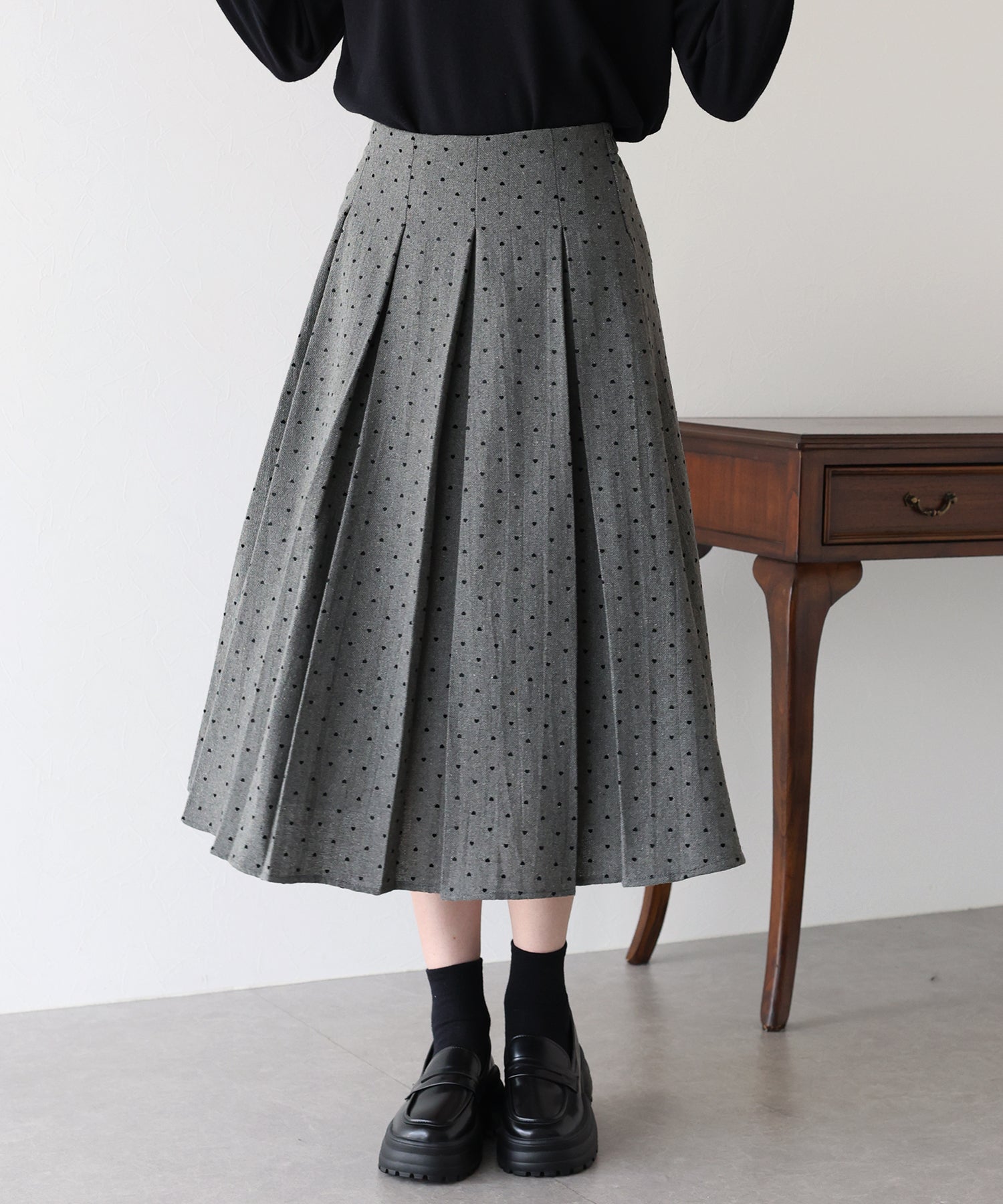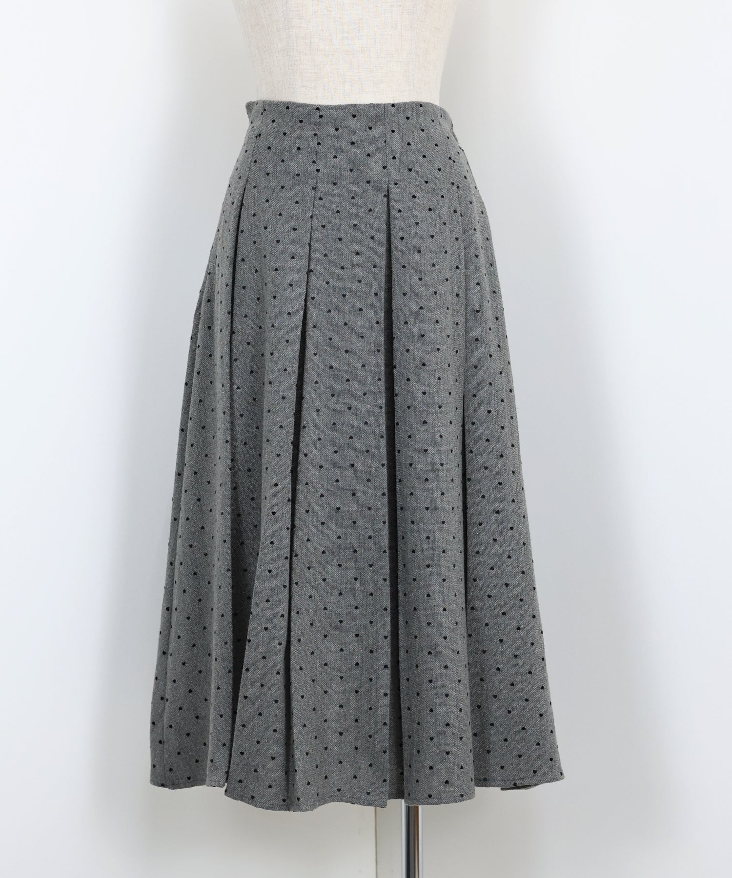 ツイード×ハート柄フロッキーが秋冬らしい魅力のプリーツスカート。