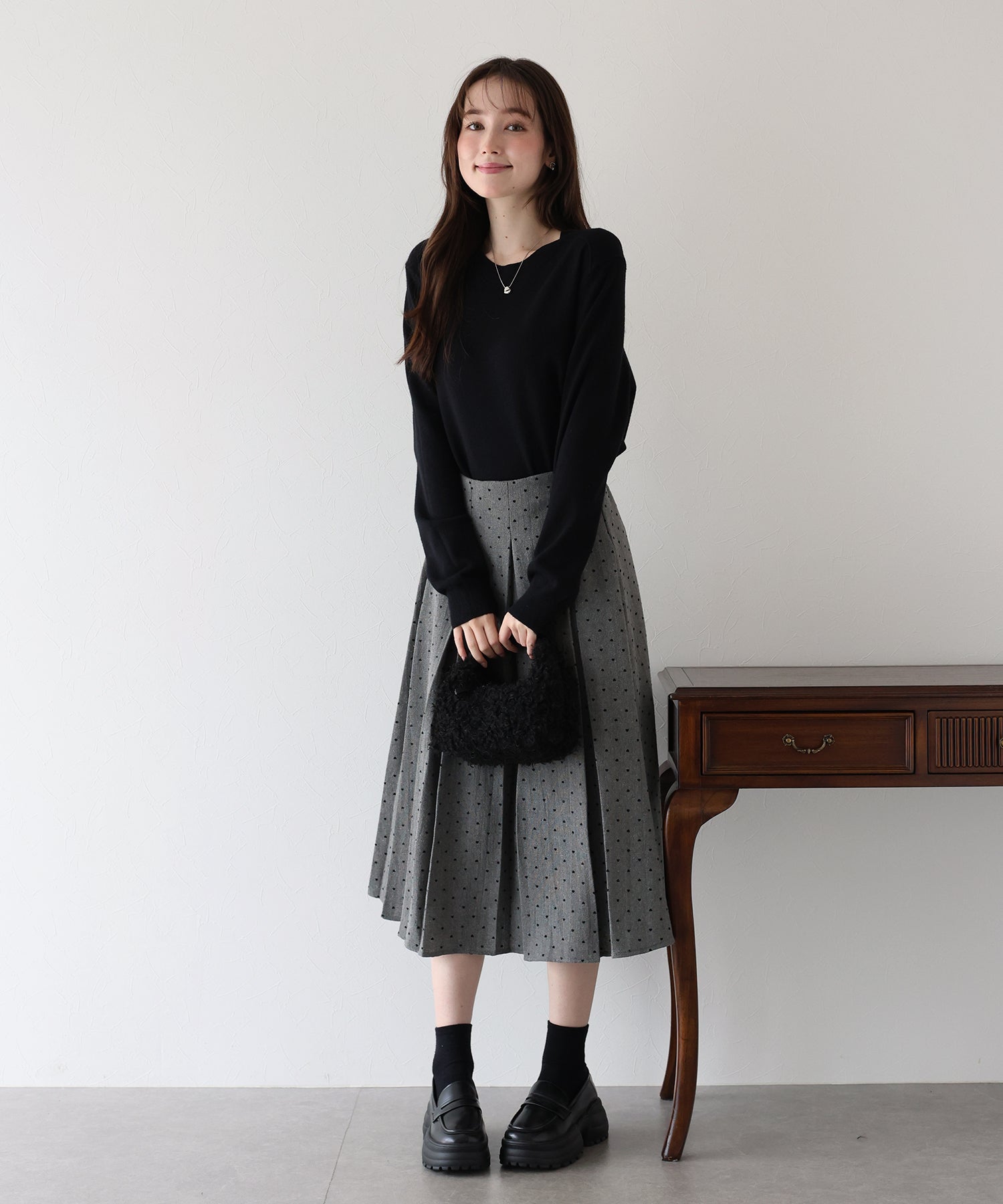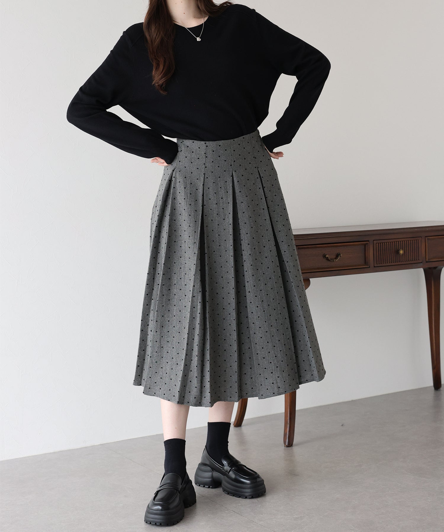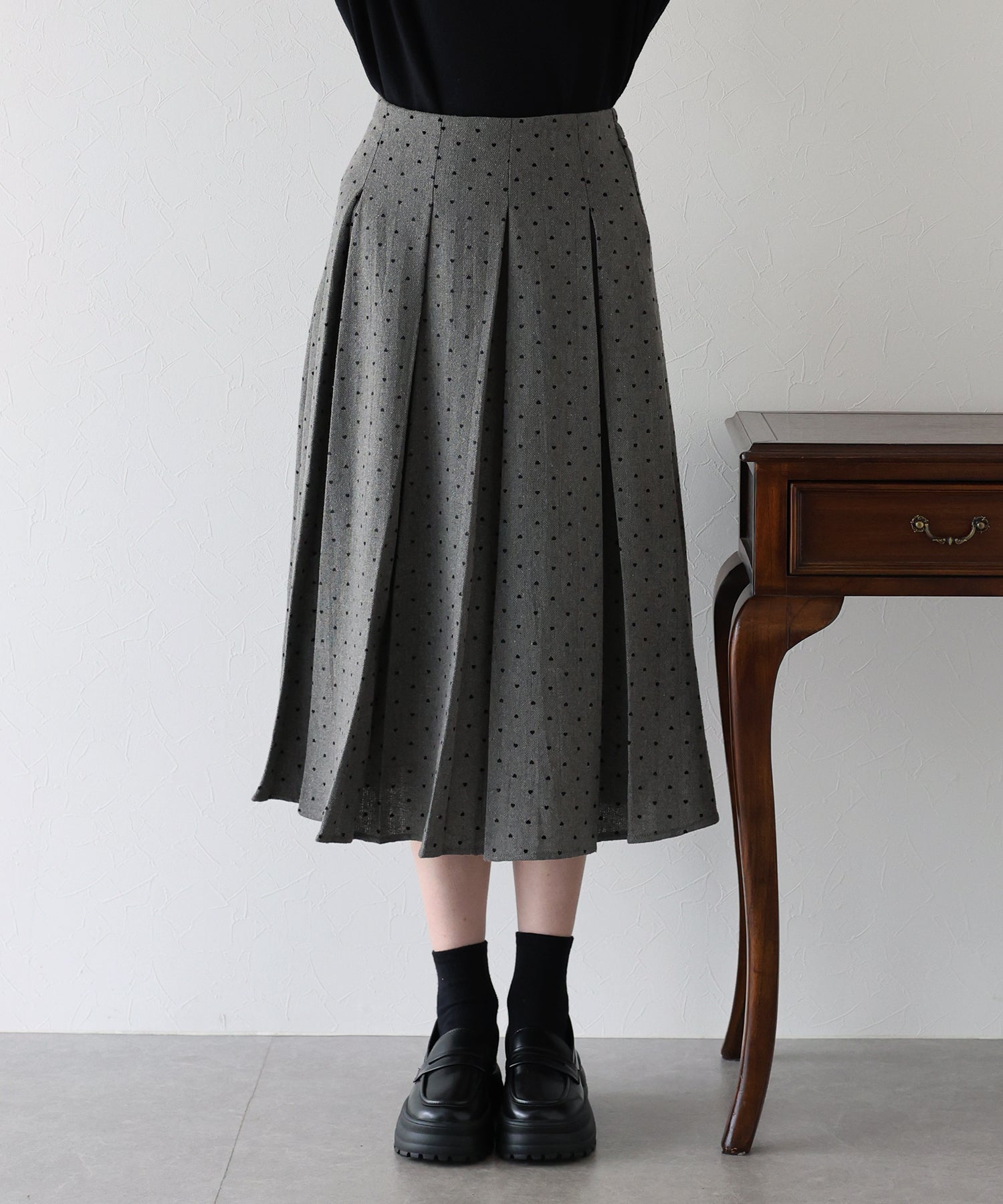 ツイード×ハート柄フロッキーが秋冬らしい魅力のプリーツスカート。