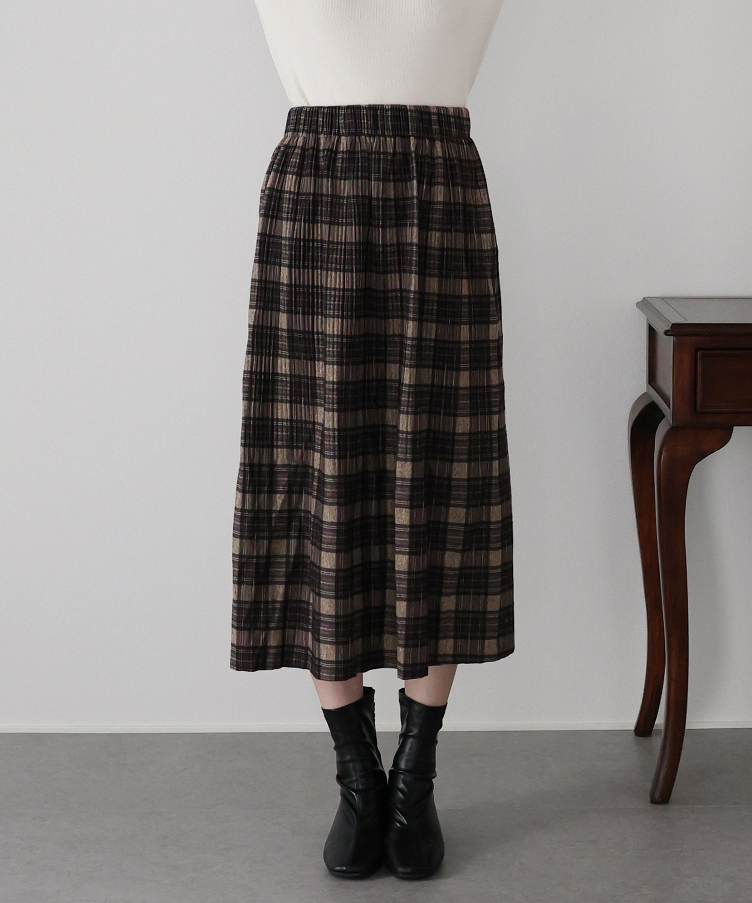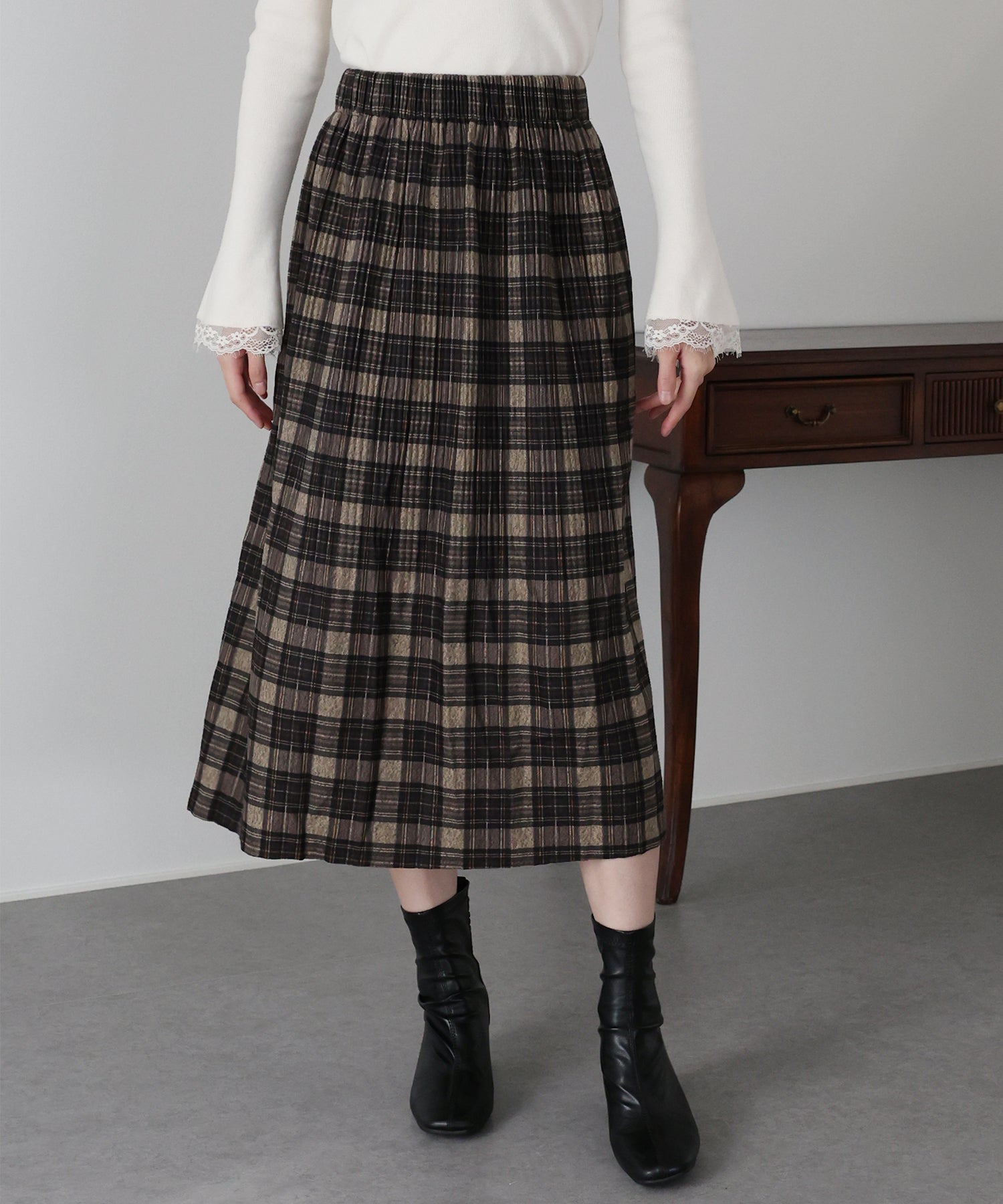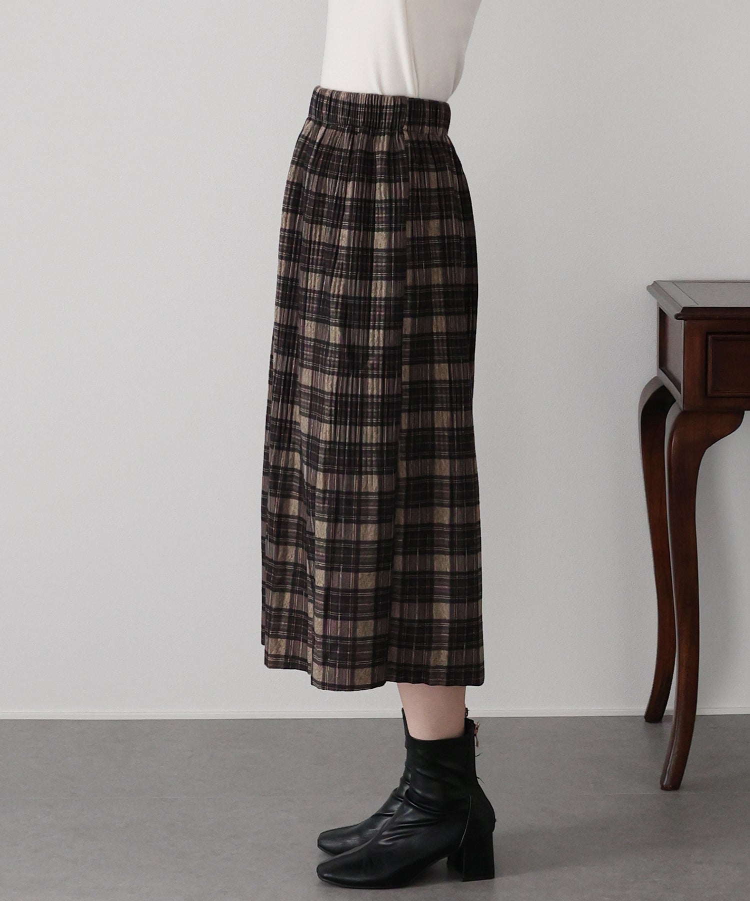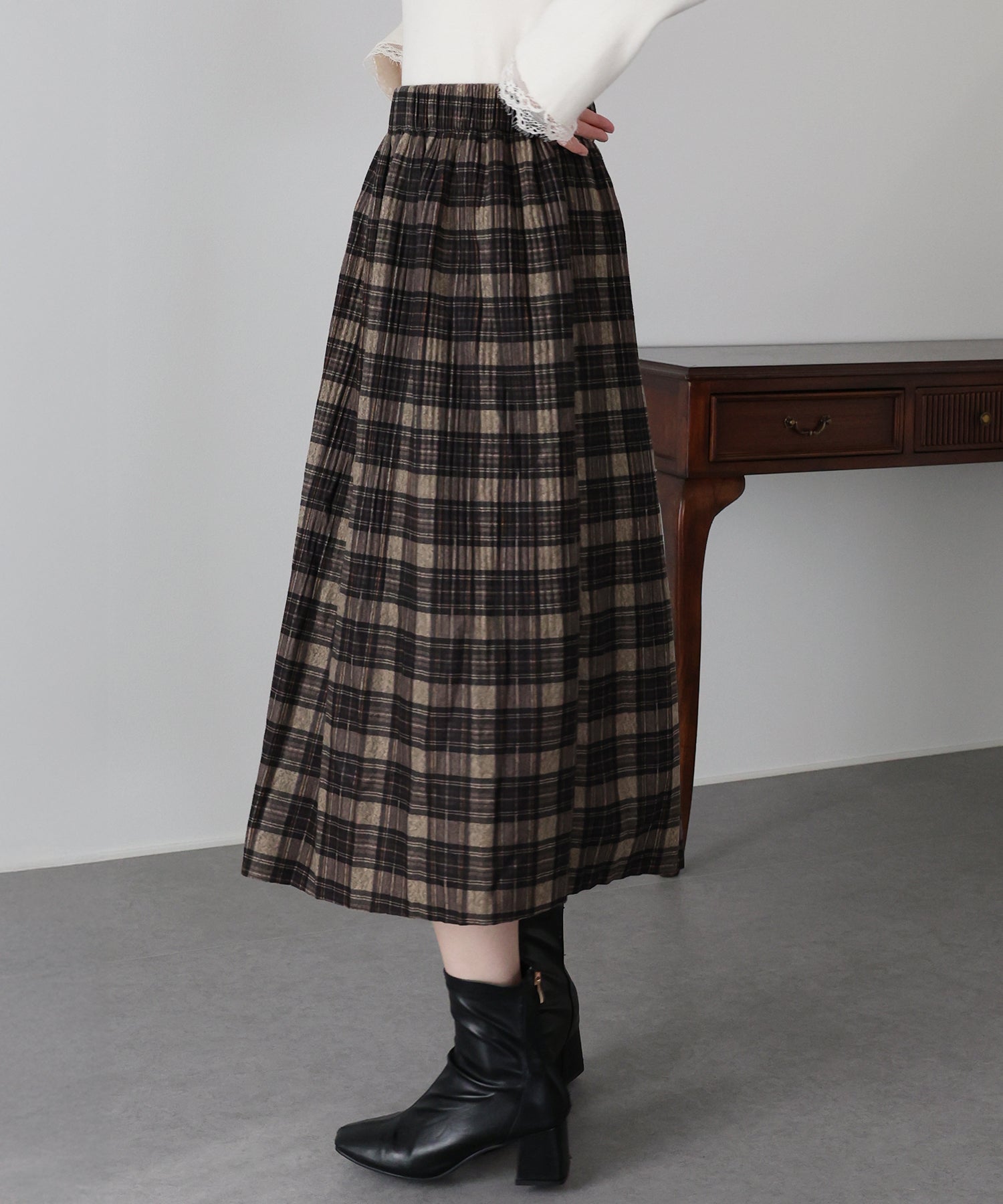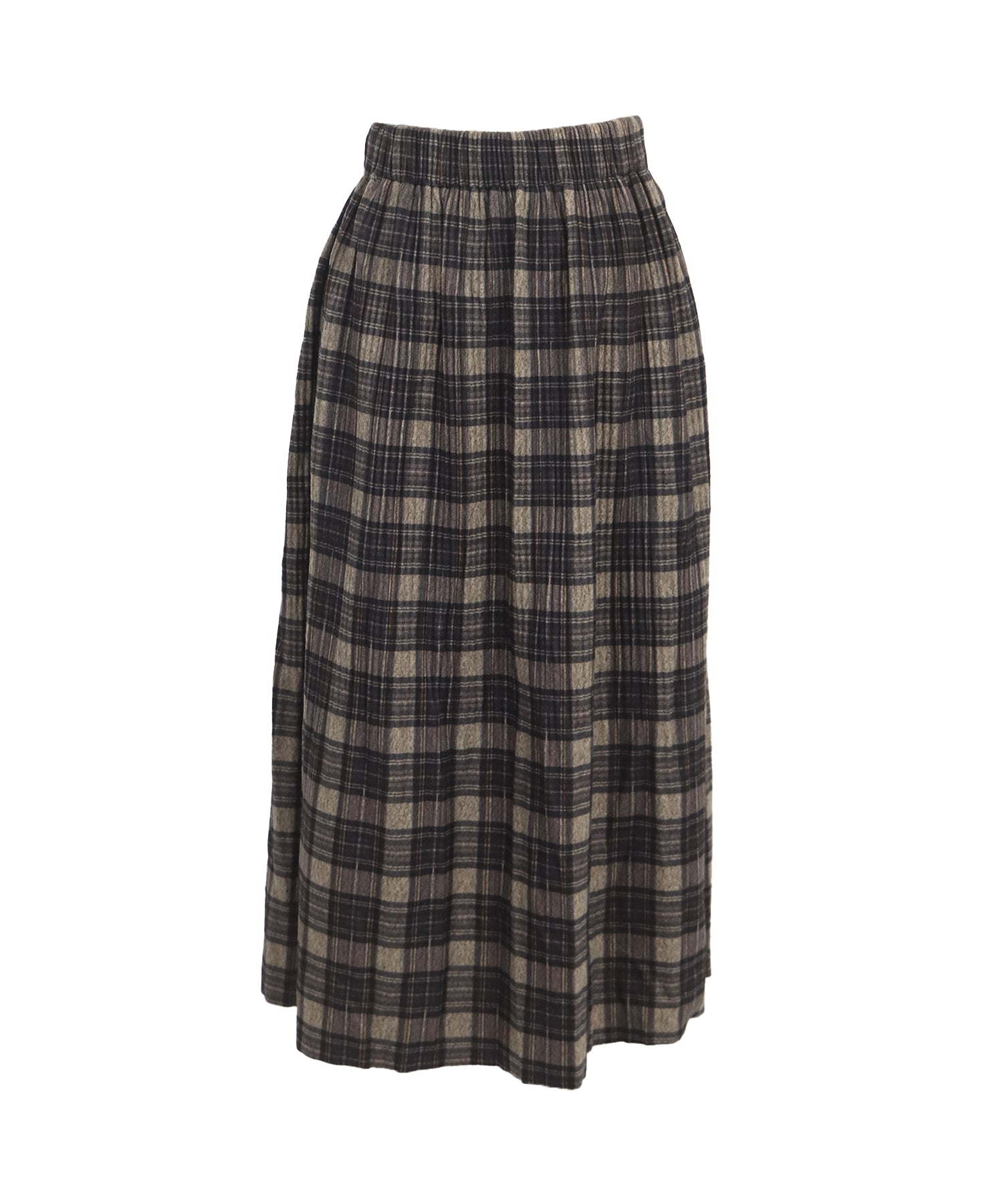 秋冬らしいチェック柄に、繊細な細プリーツを施したロングスカート。