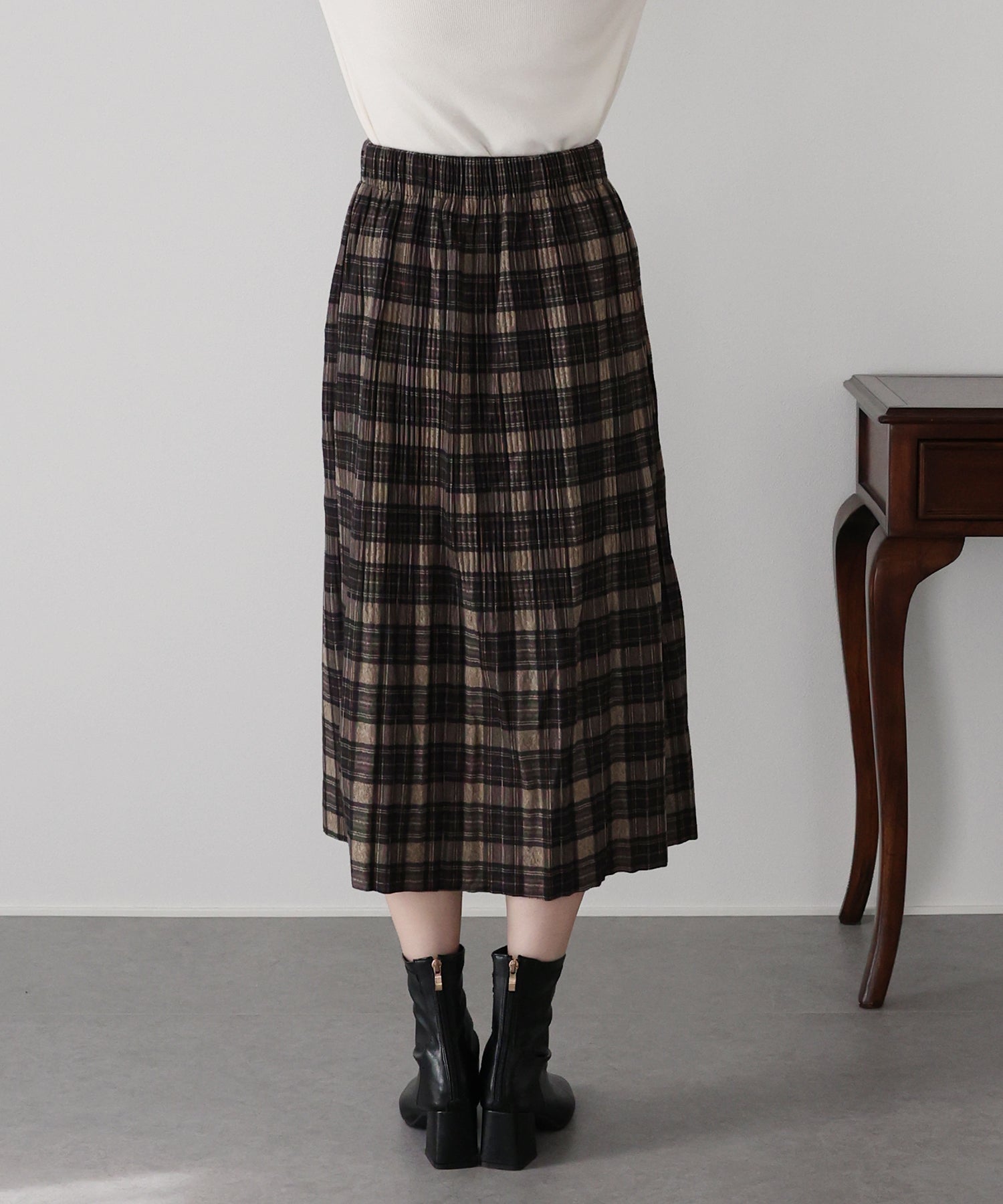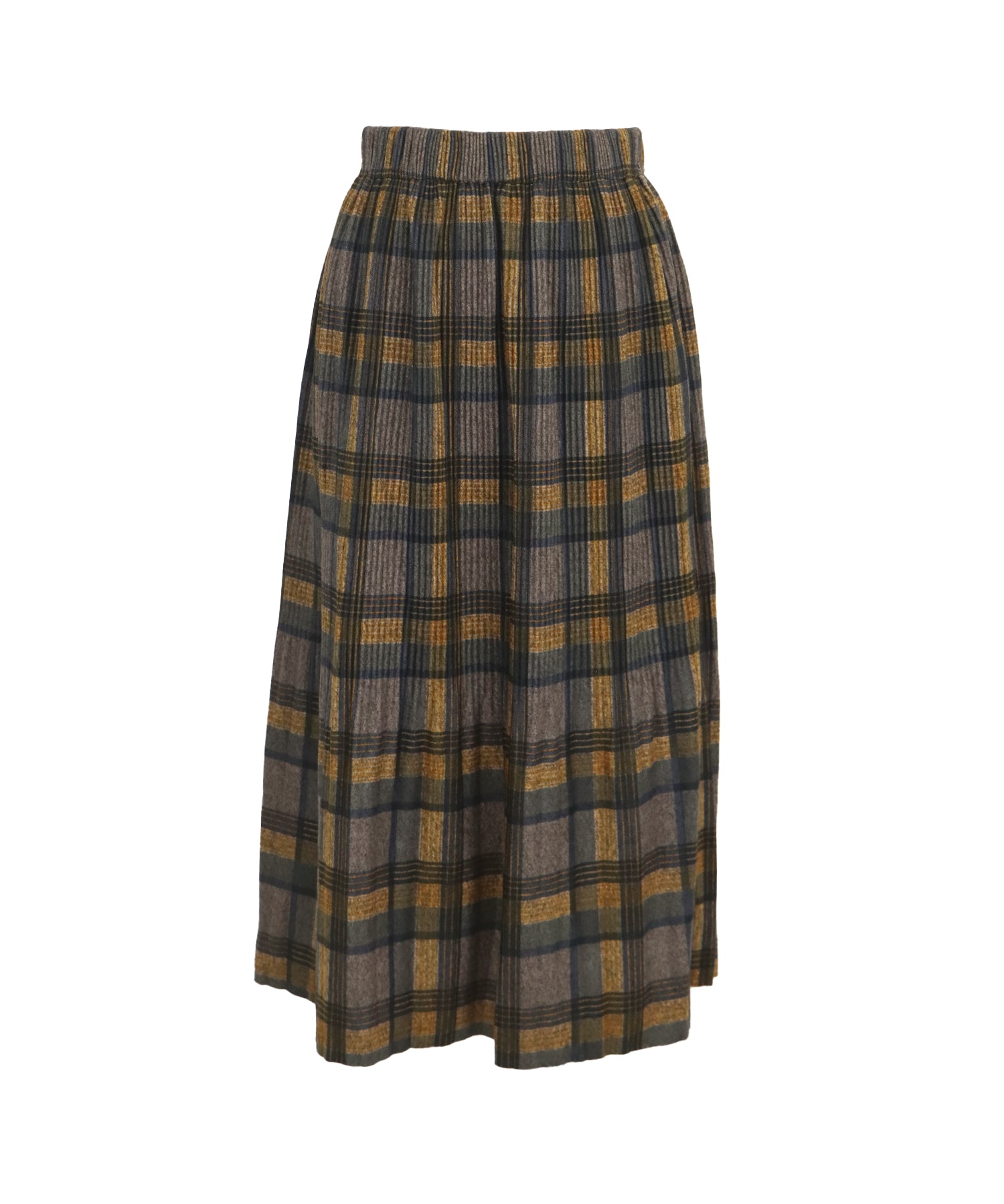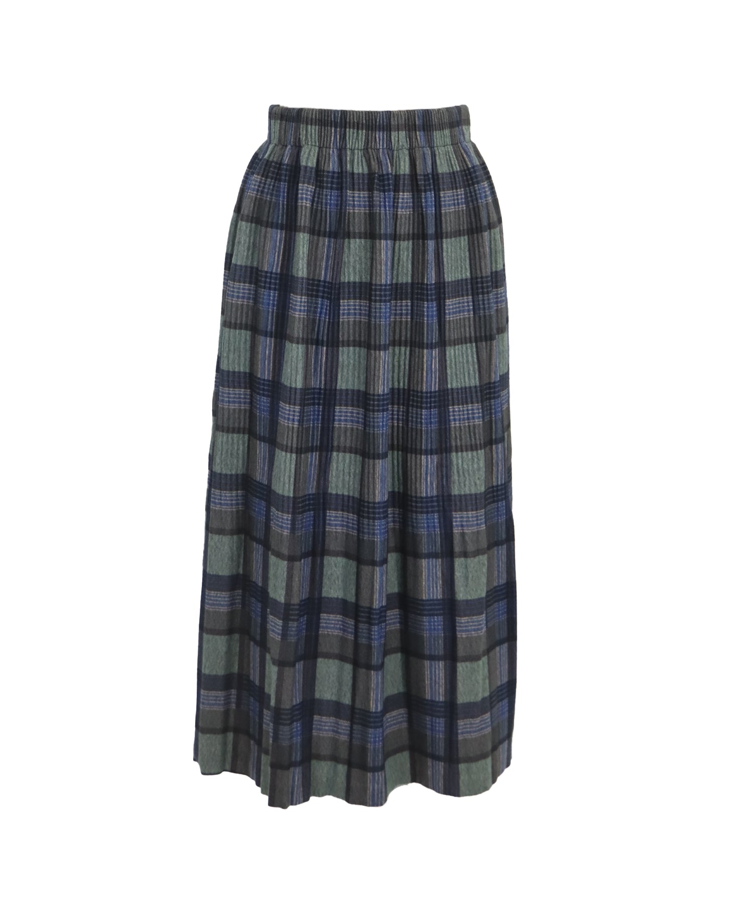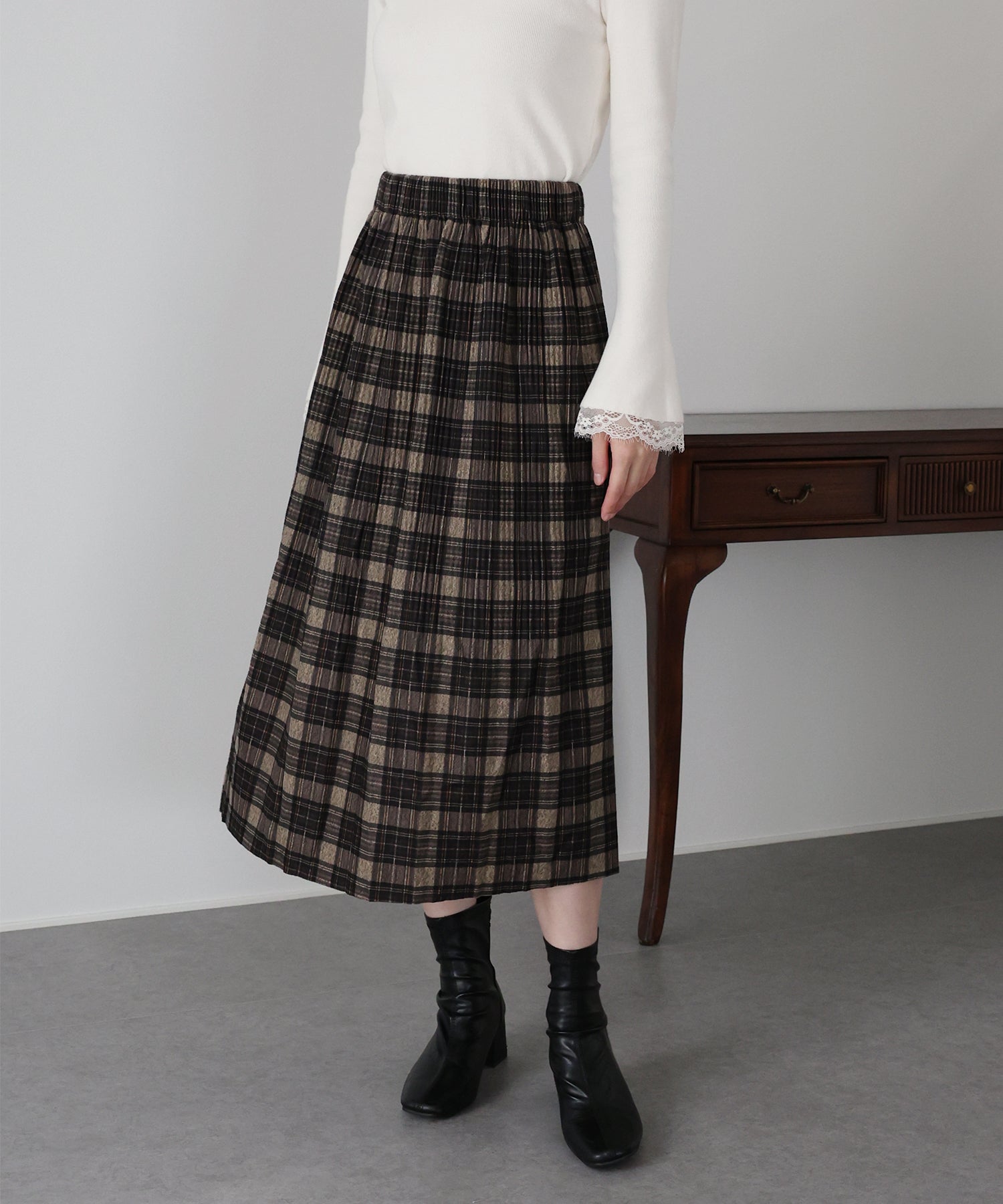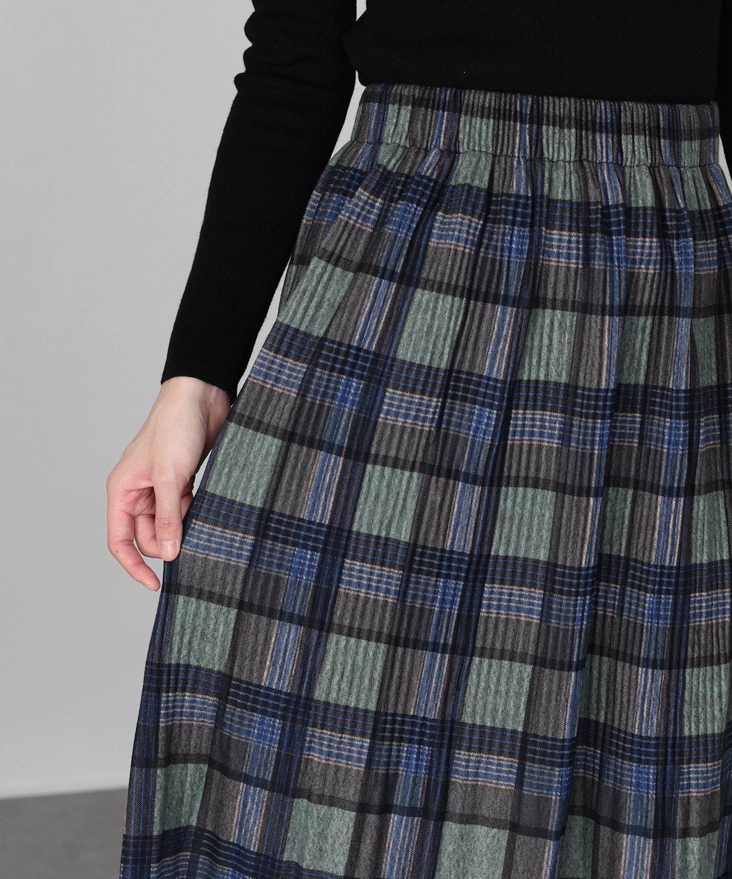 秋冬らしいチェック柄に、繊細な細プリーツを施したロングスカート。