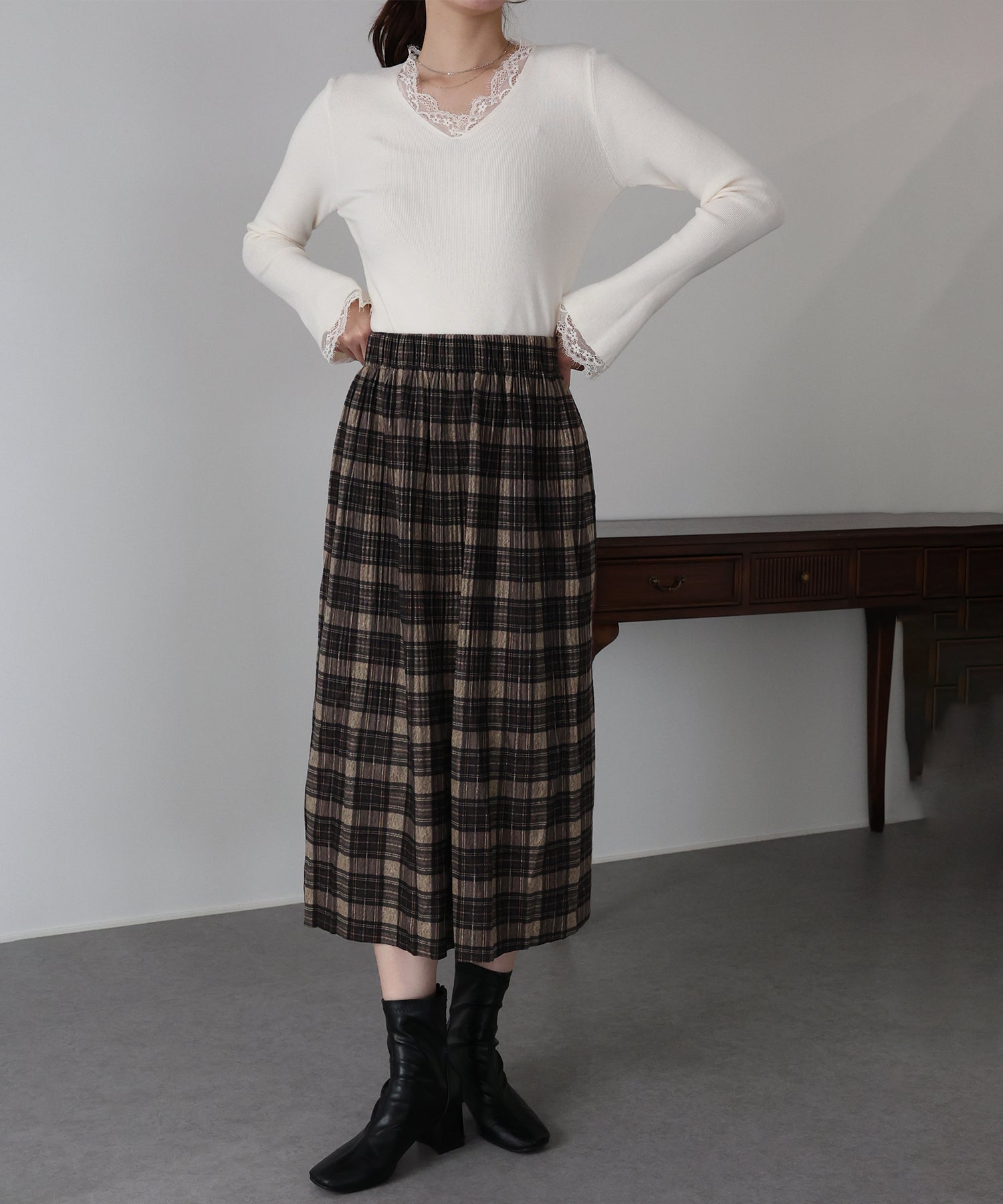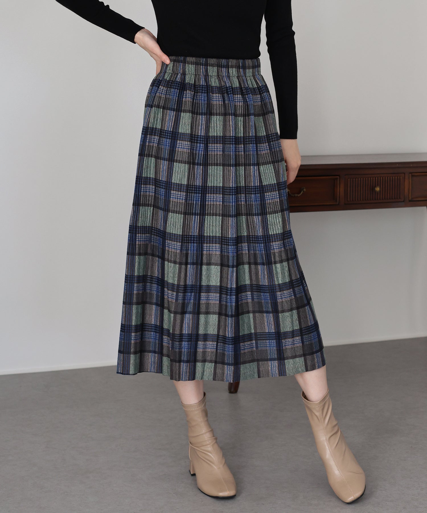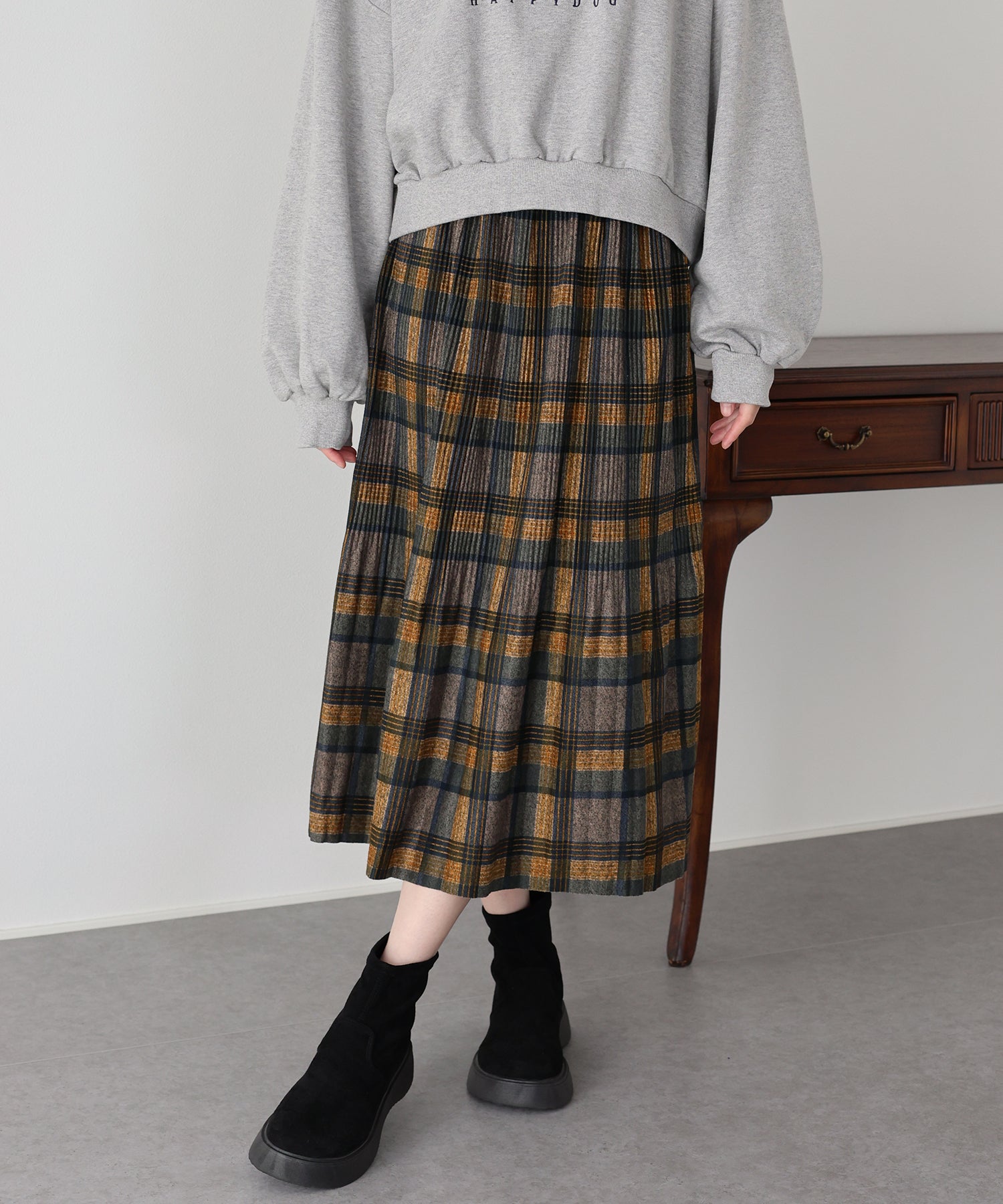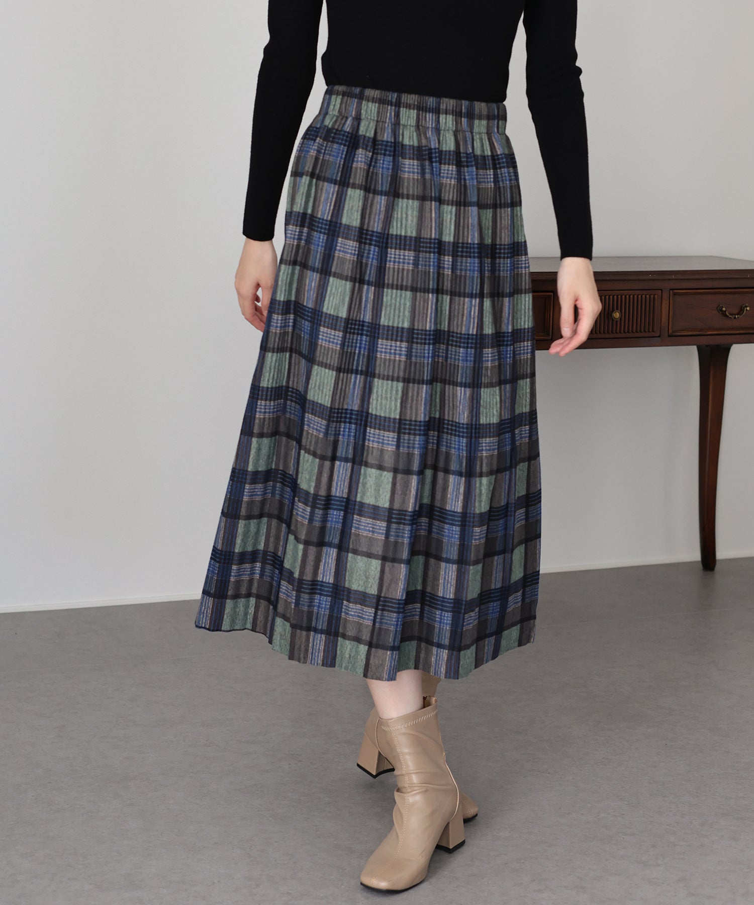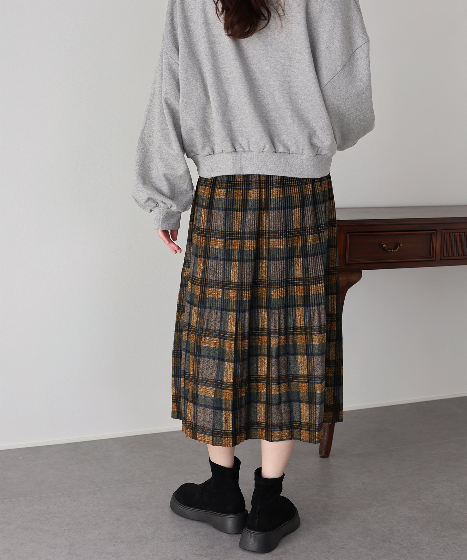 秋冬らしいチェック柄に、繊細な細プリーツを施したロングスカート。
