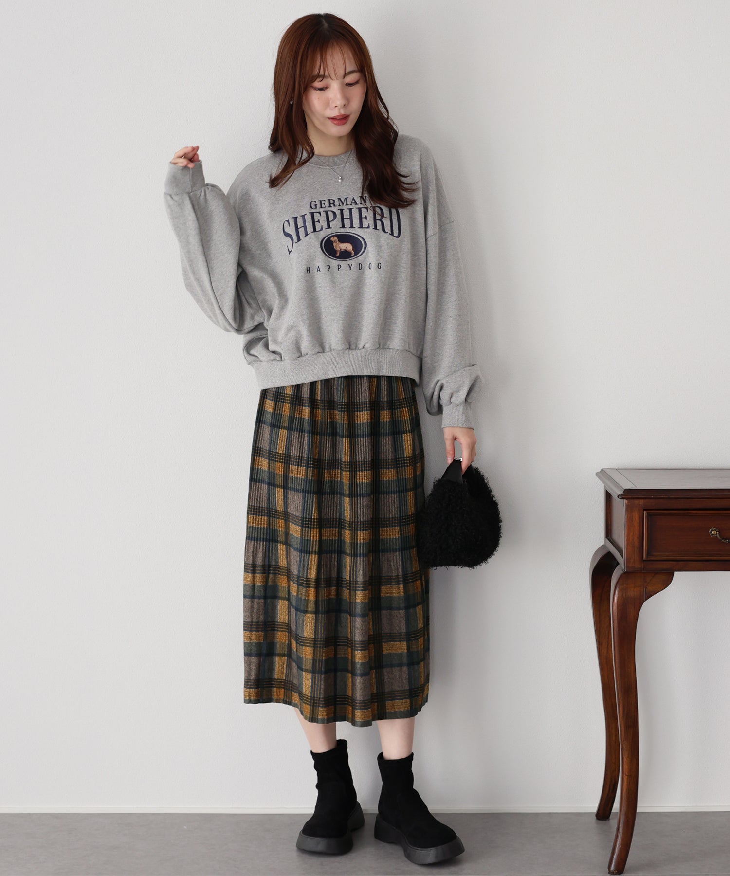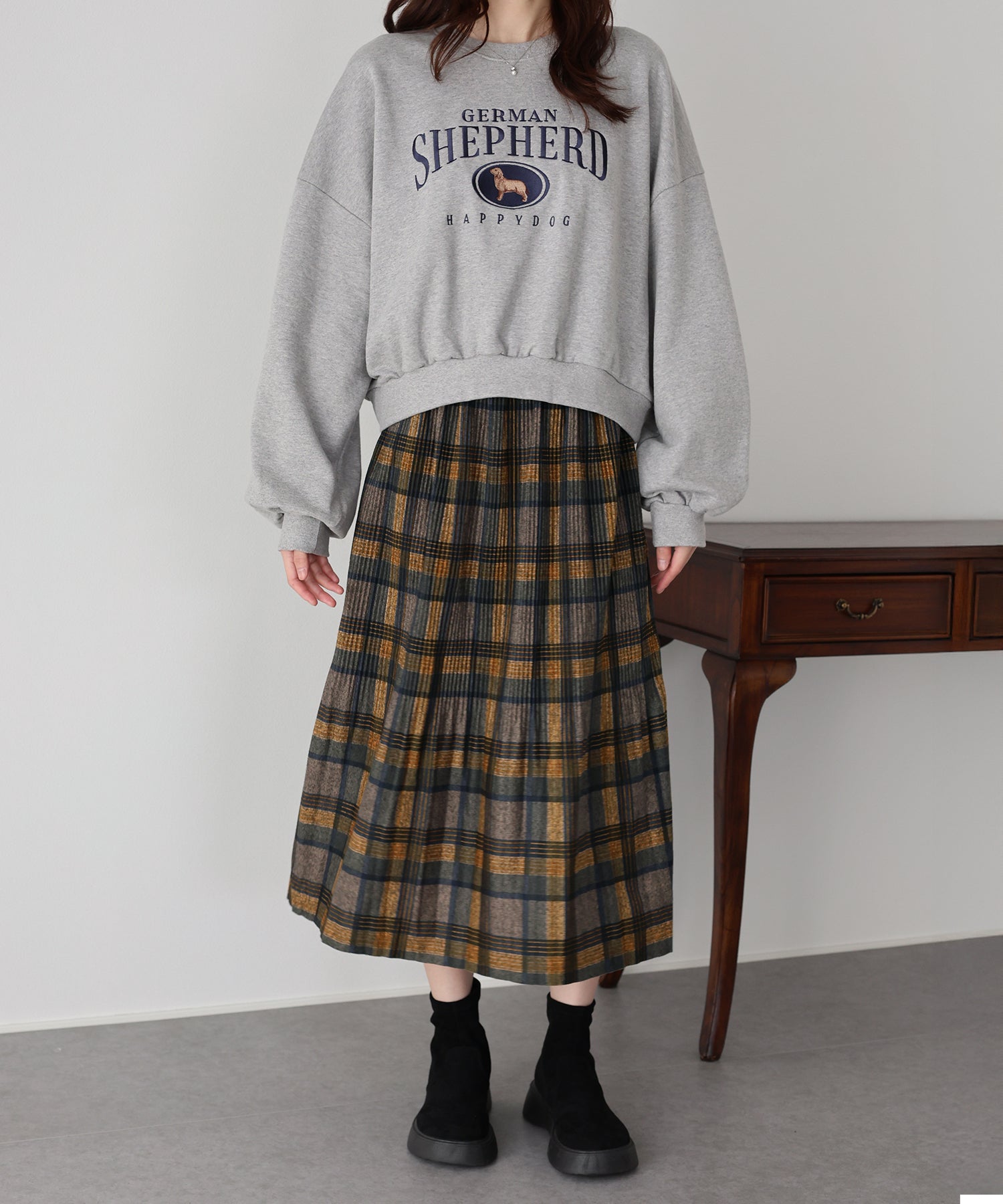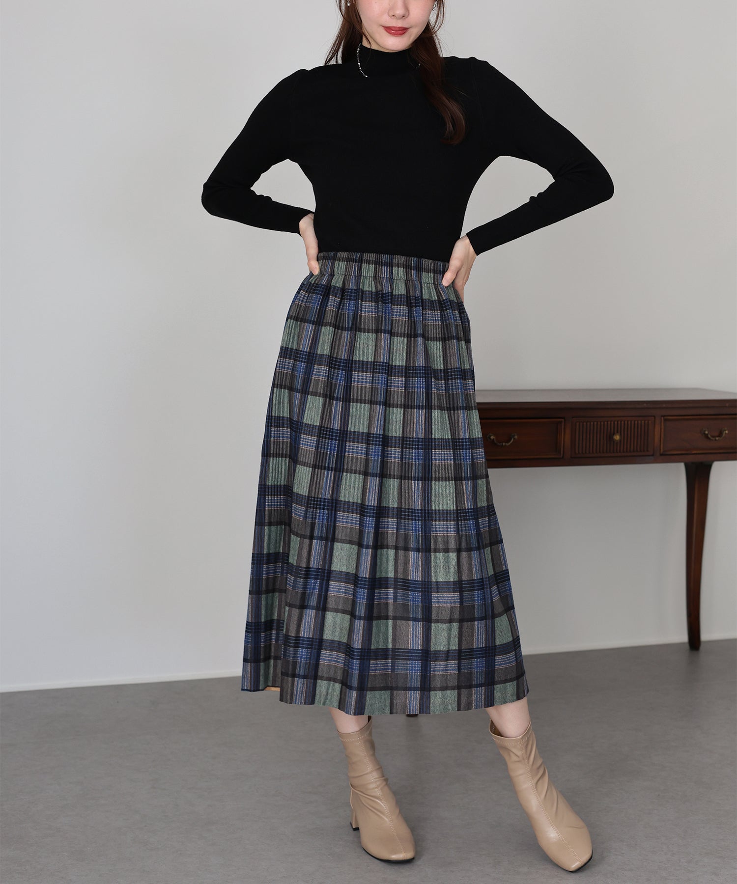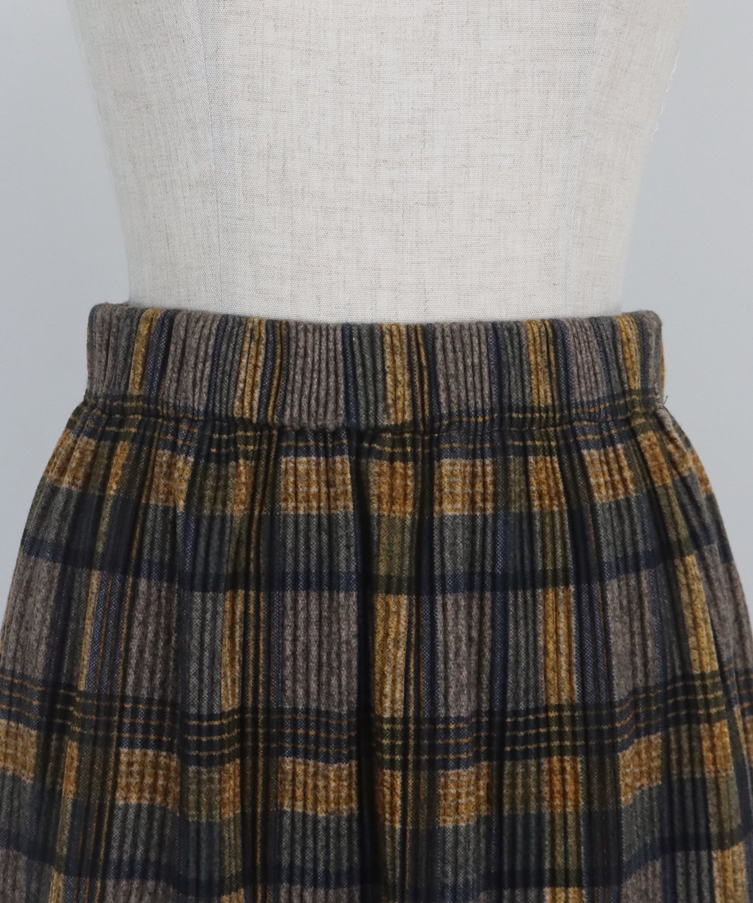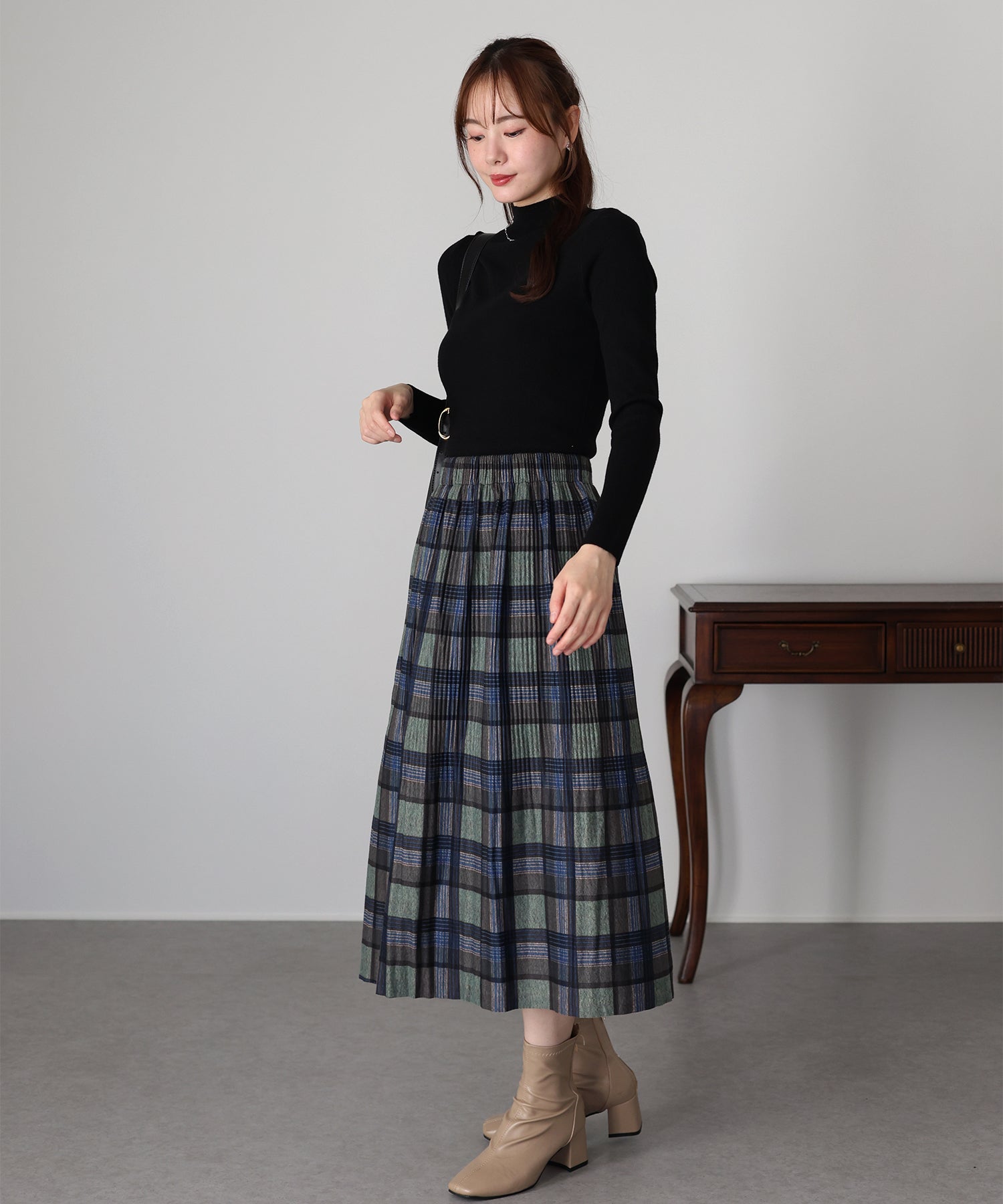 秋冬らしいチェック柄に、繊細な細プリーツを施したロングスカート。