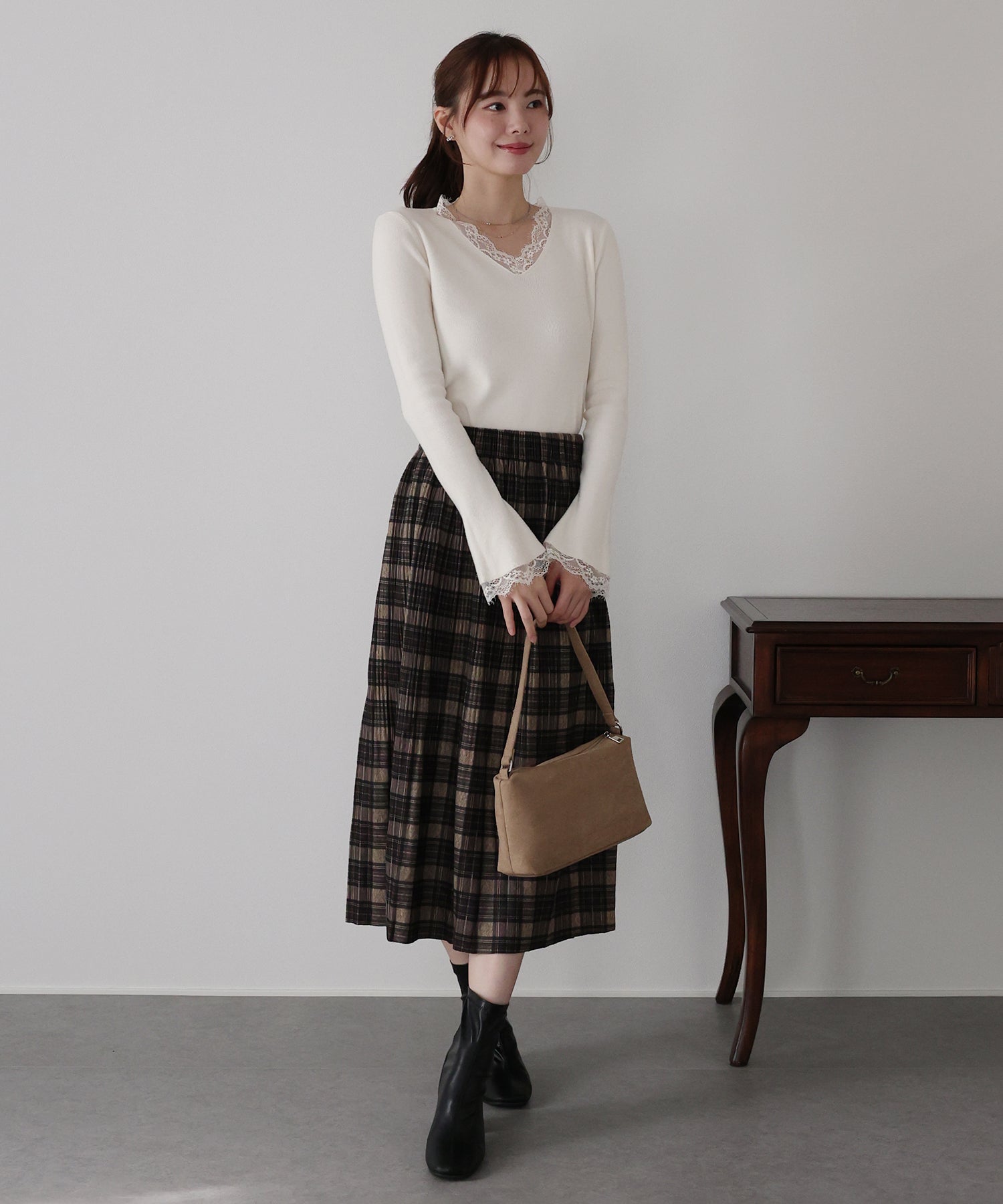 動くたびにふんわりと揺れるプリーツが、クラシカルな雰囲気の中に華やかさを添えます。