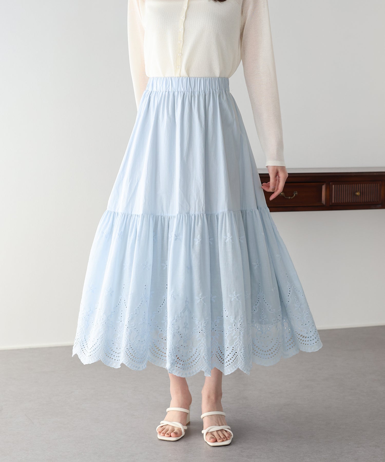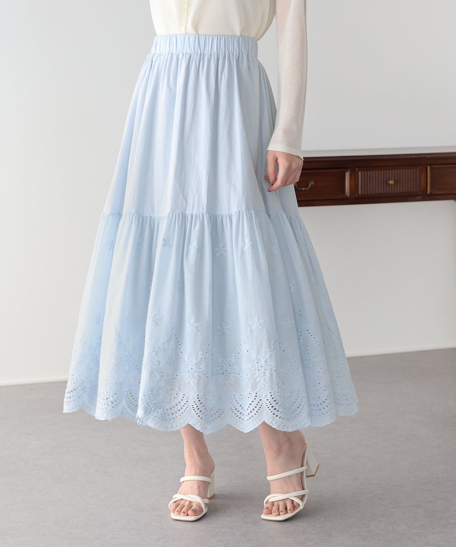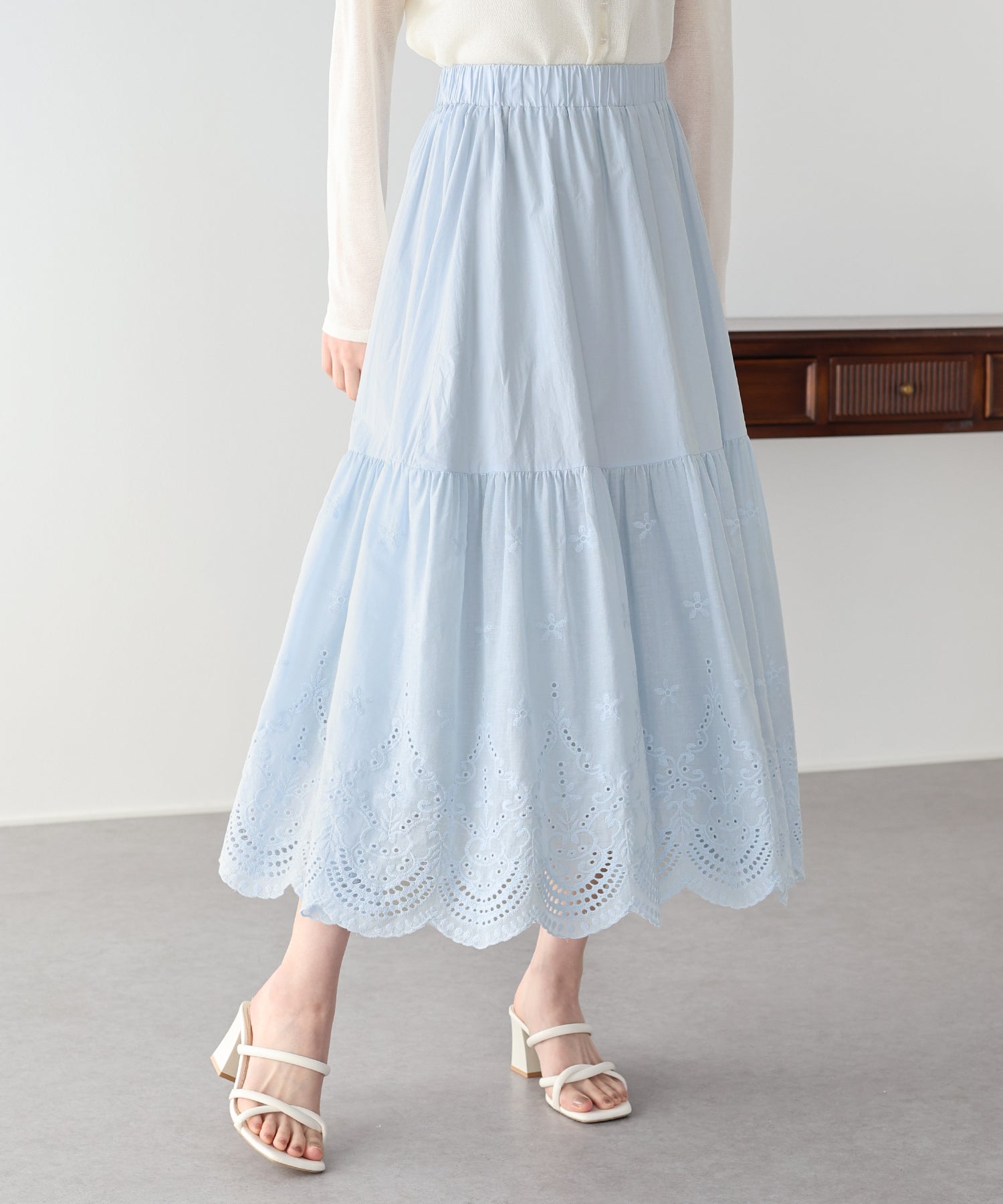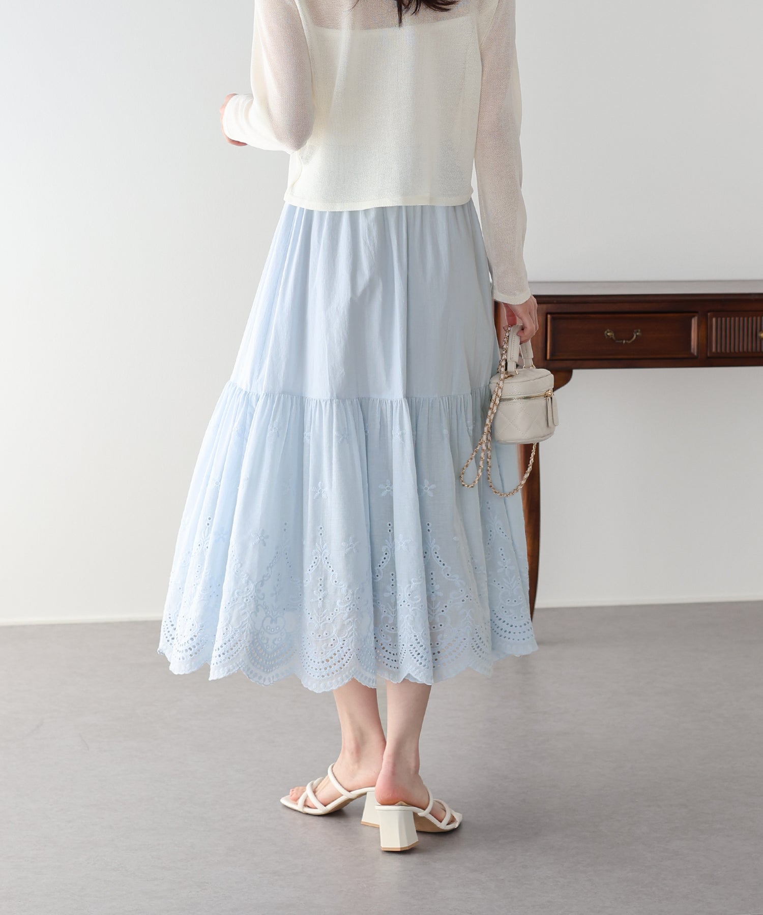 繊細な花柄刺繍が彩るナチュラルフェミニンなカットワークレーススカート