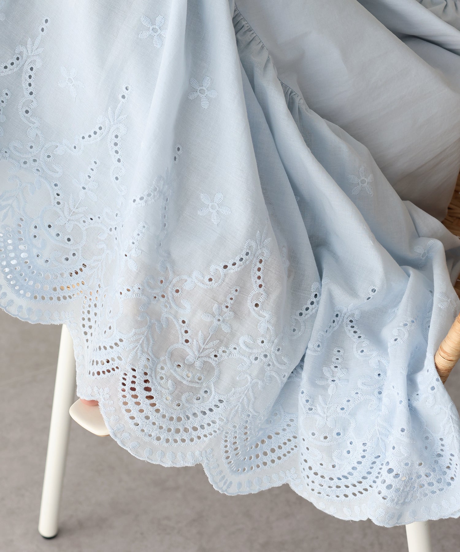 裾に繊細な花柄刺繍とカットワークレースが施し、可憐で上品なアクセントに。