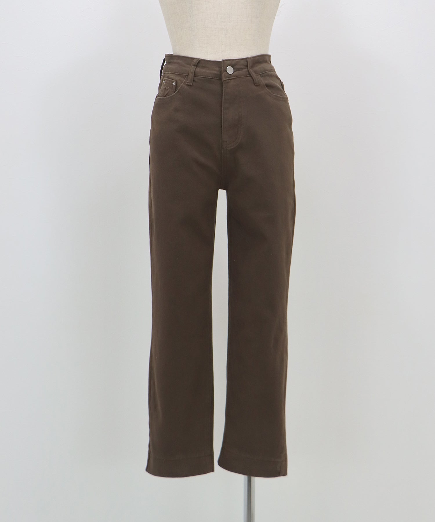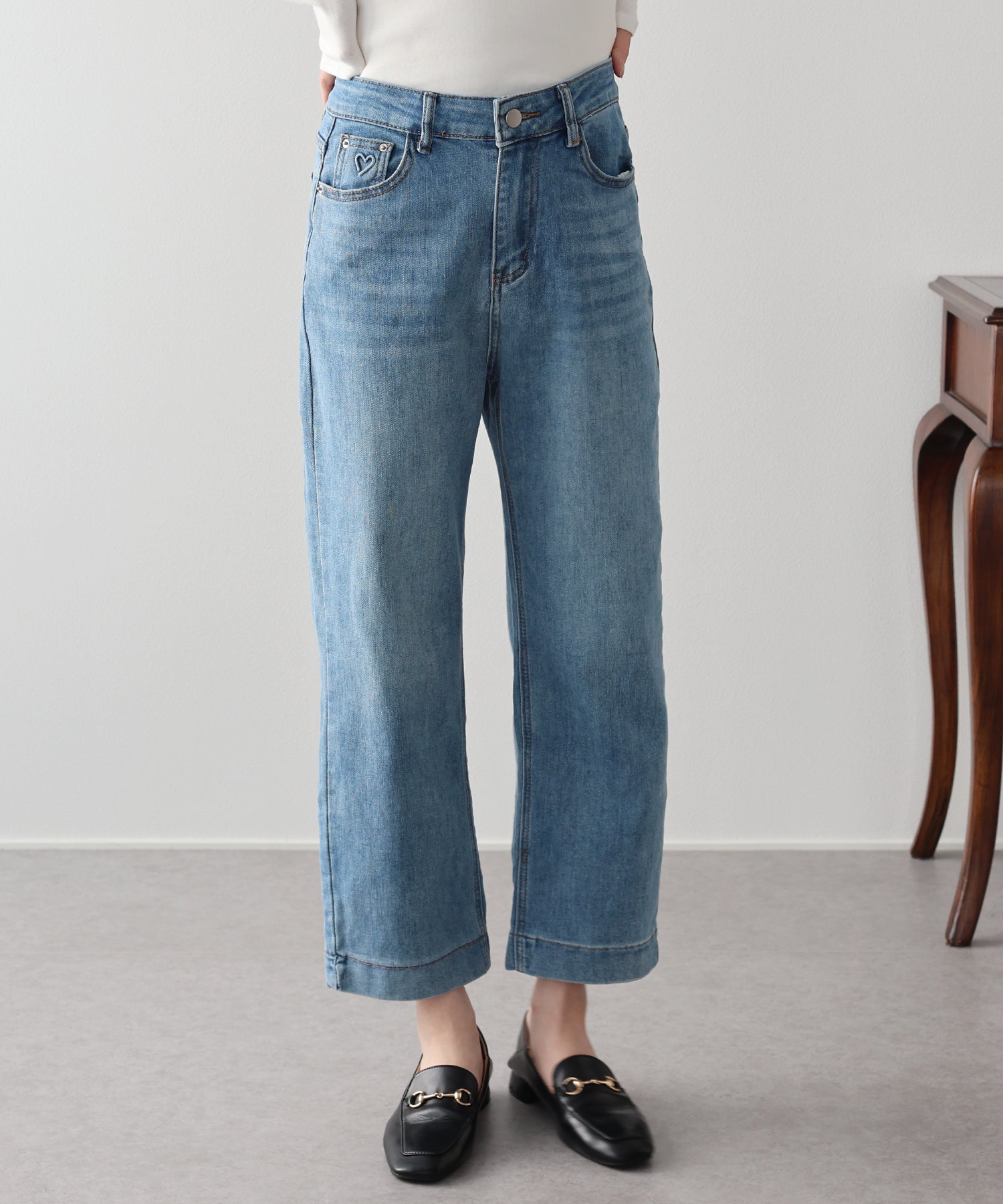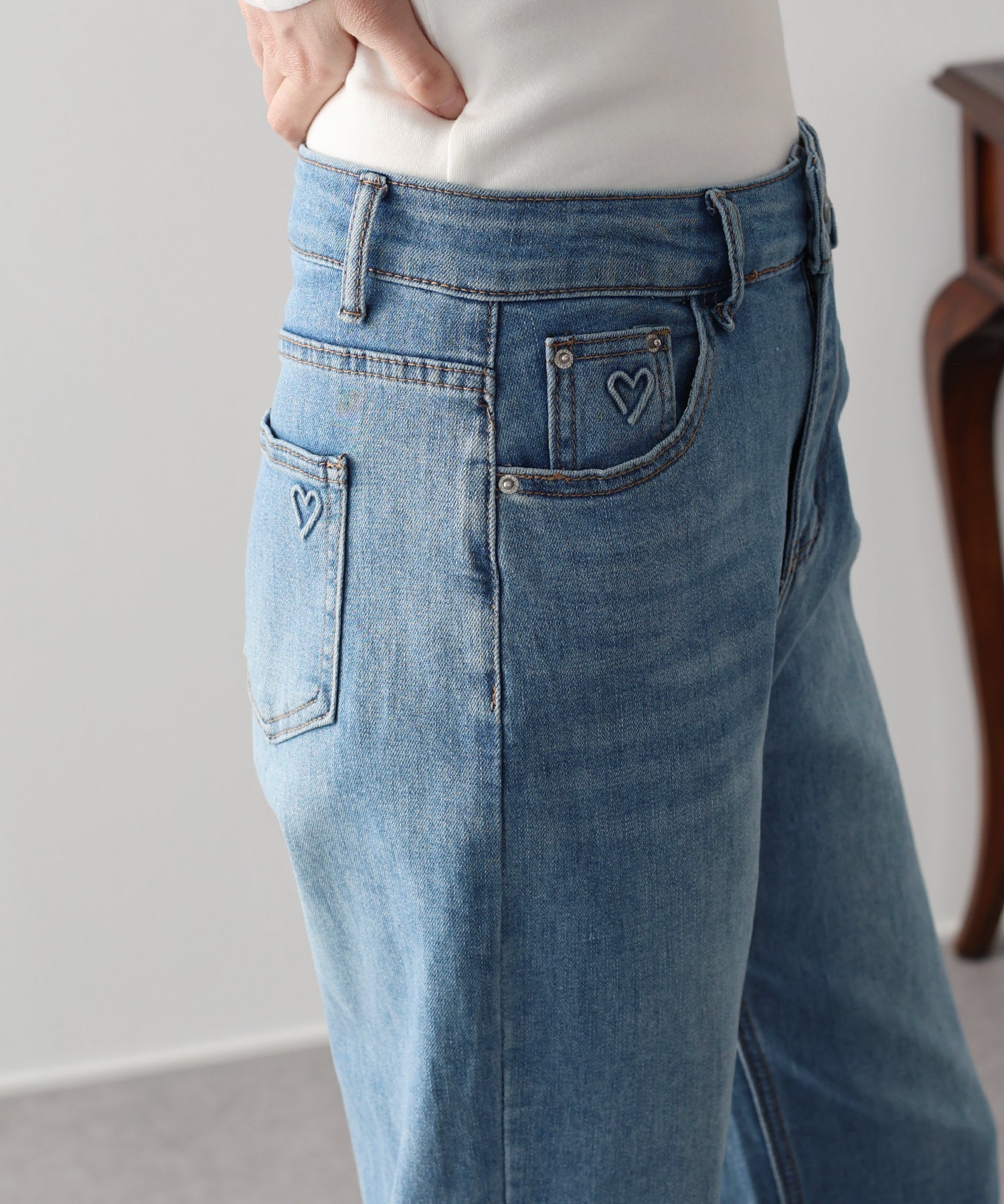 年中着用できる定番のデニムに、さりげないハートの型押しをあしらった大人可愛いデニムパンツ。