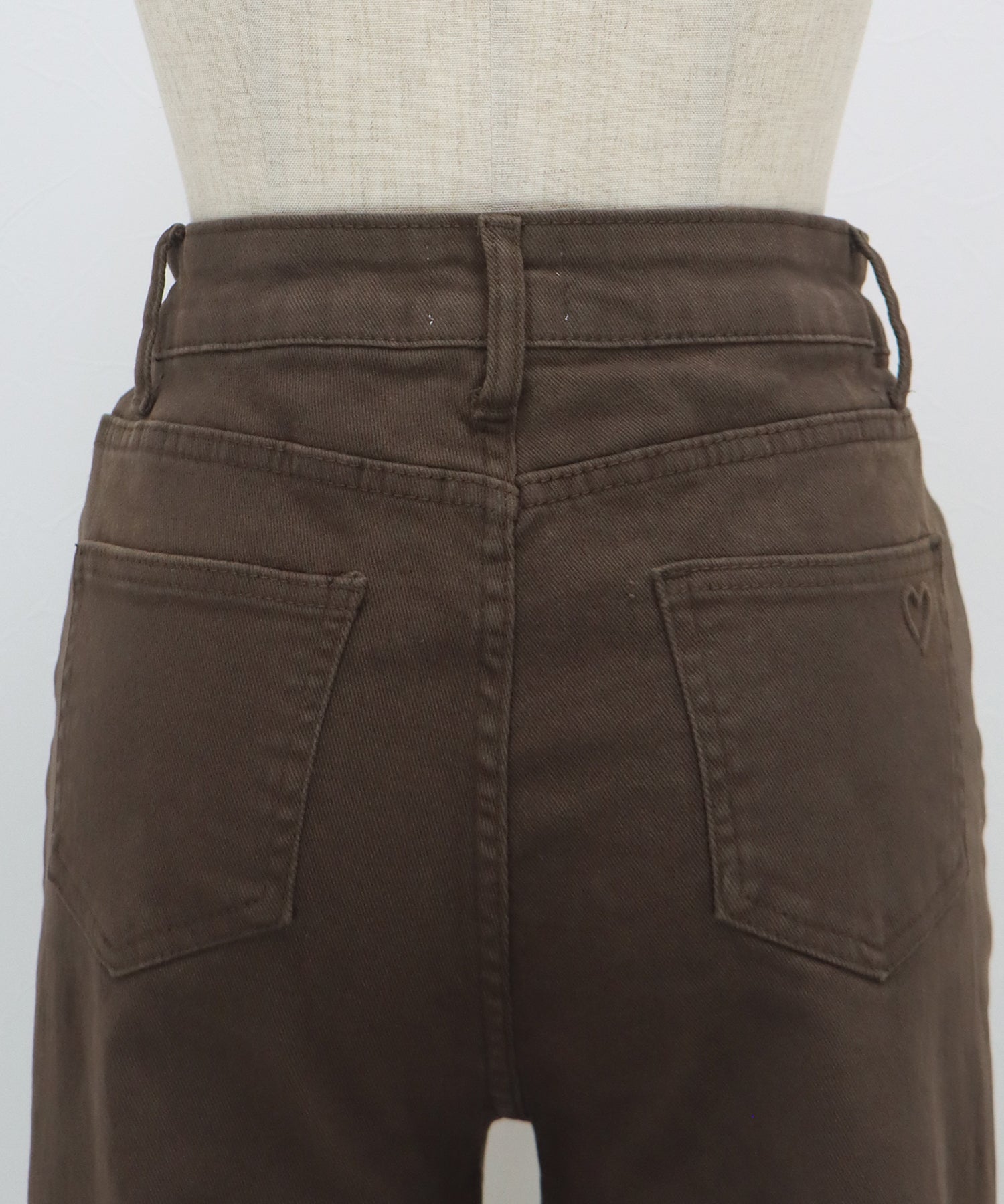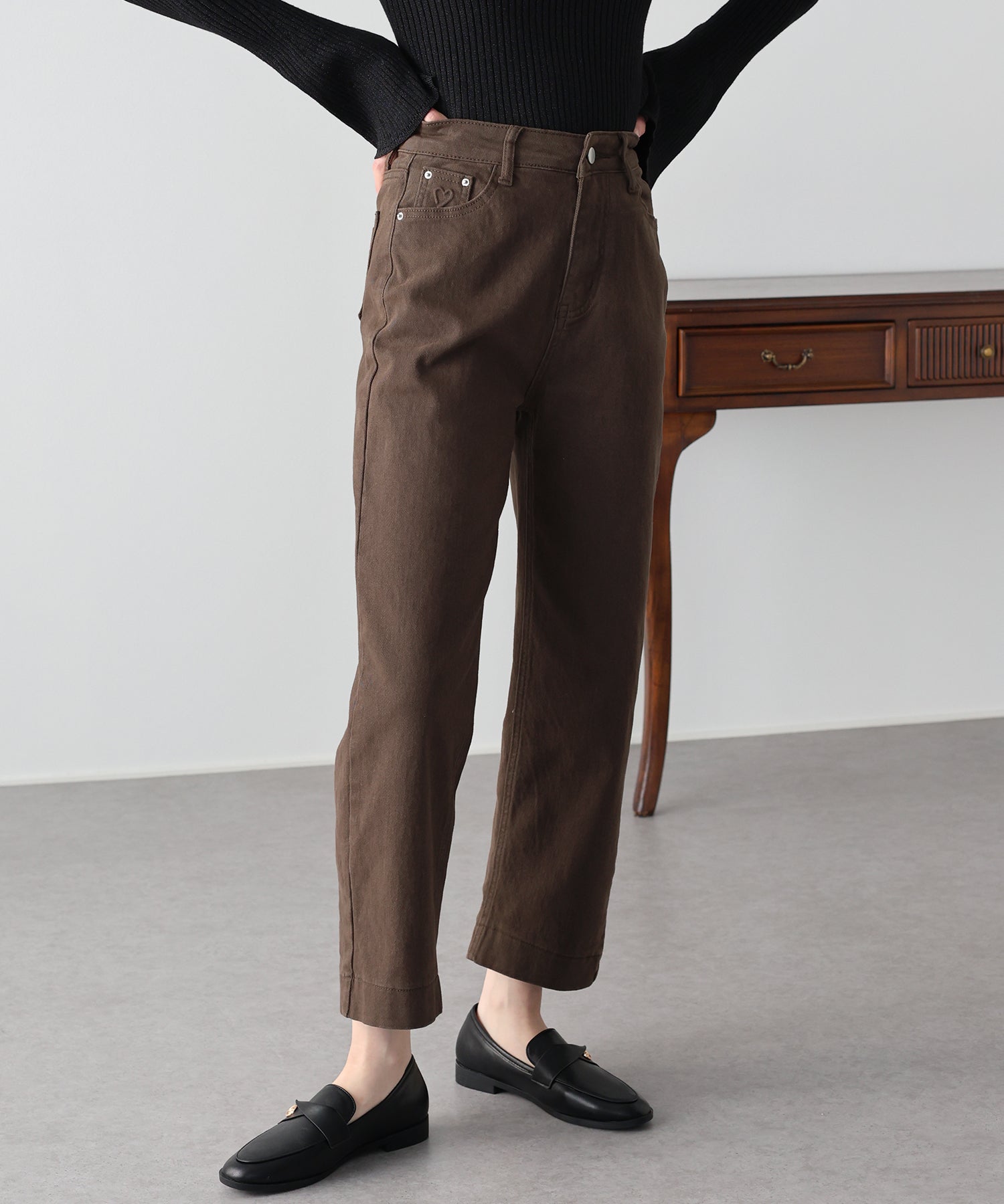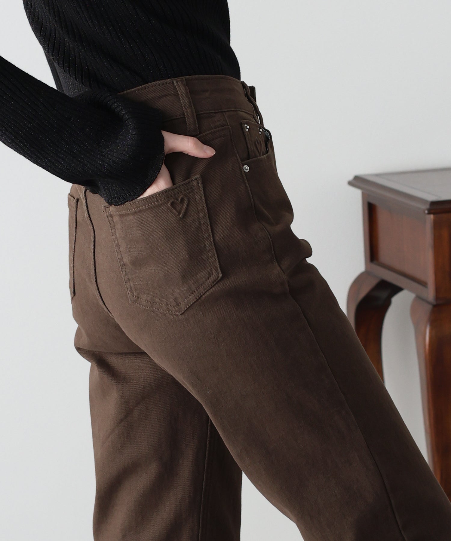 年中着用できる定番のデニムに、さりげないハートの型押しをあしらった大人可愛いデニムパンツ。