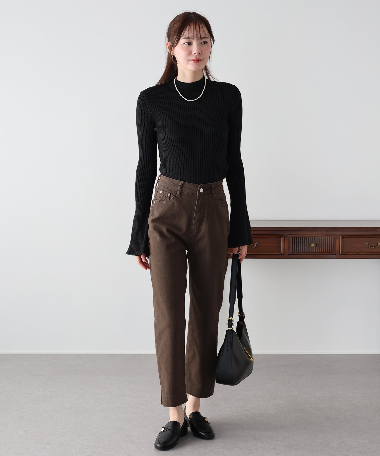 足首が見える丈感なので、パンプスやバレエシューズ、スニーカーなど足元のアレンジも自在です。