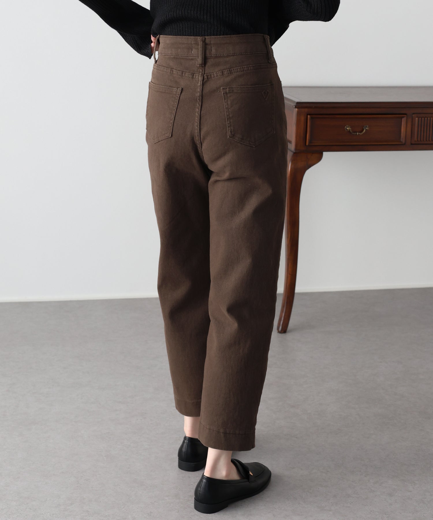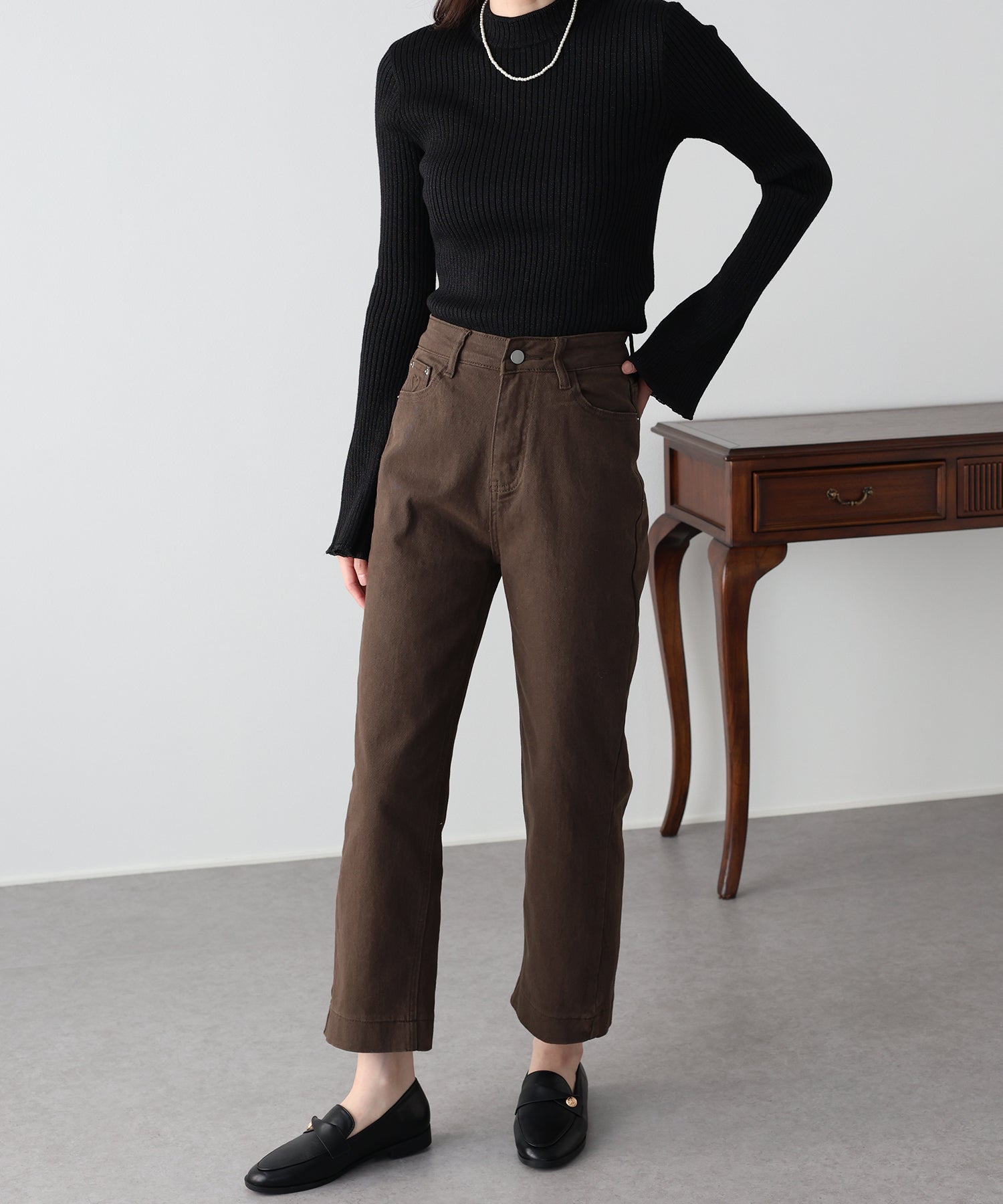 シルエットはすっきりとしたストレートラインで、足首が見える丈感のため抜け感のある印象に仕上がります。