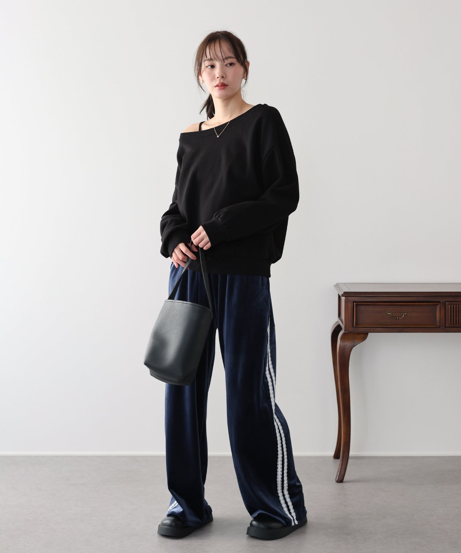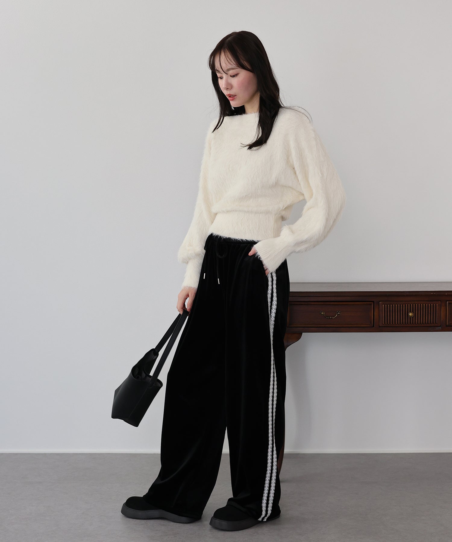 サイドにあしらったホワイトレースが、スポーティーなスウェットにフェミニンなアクセントをプラス。
