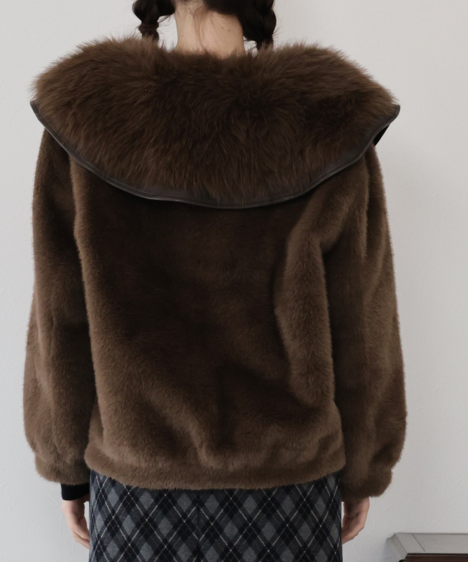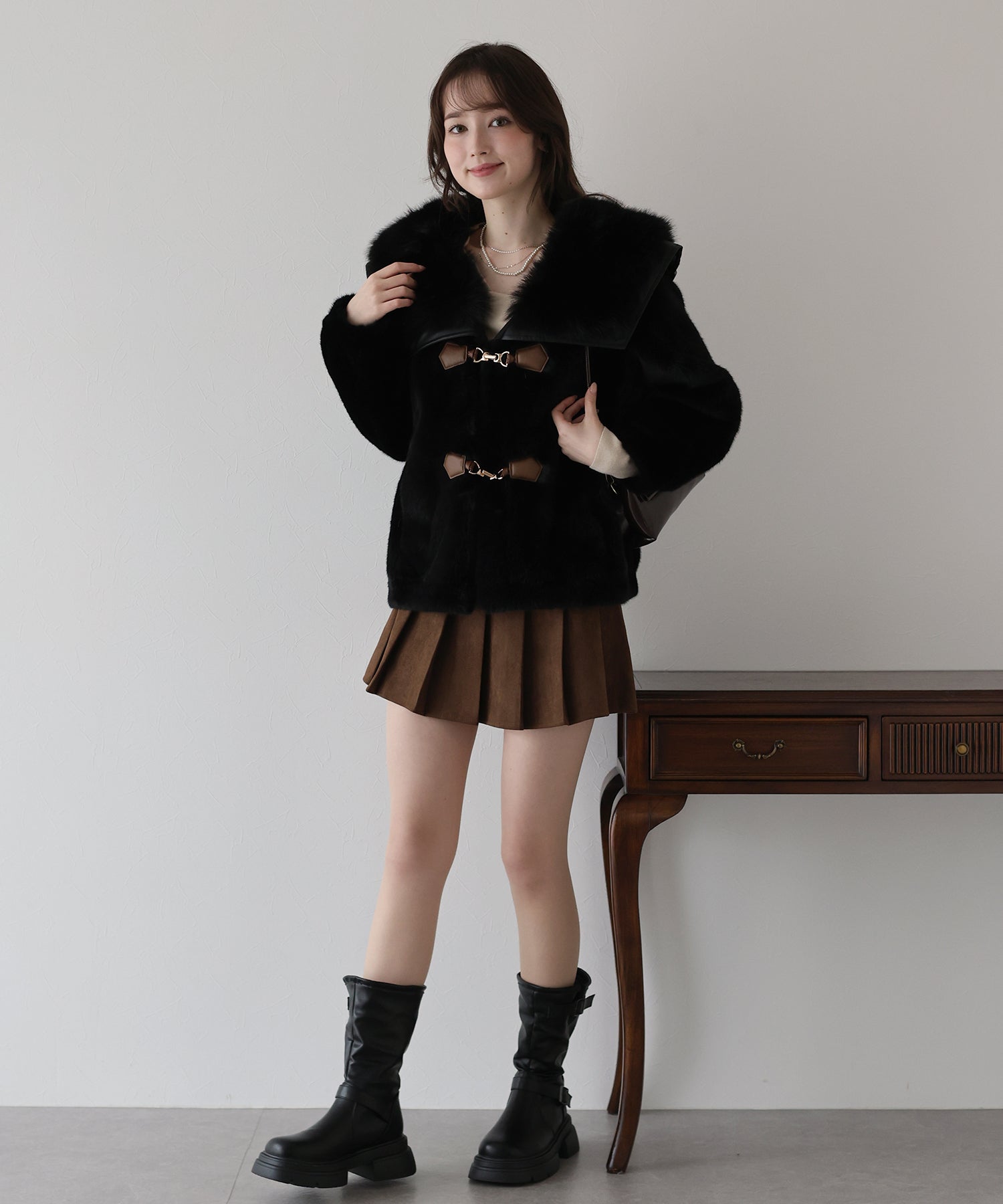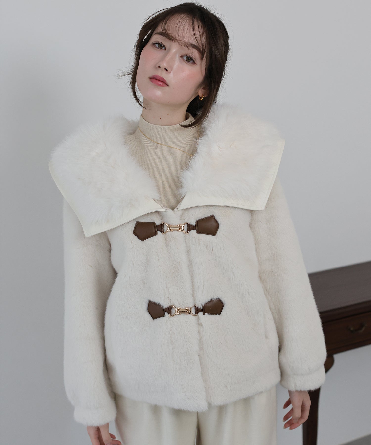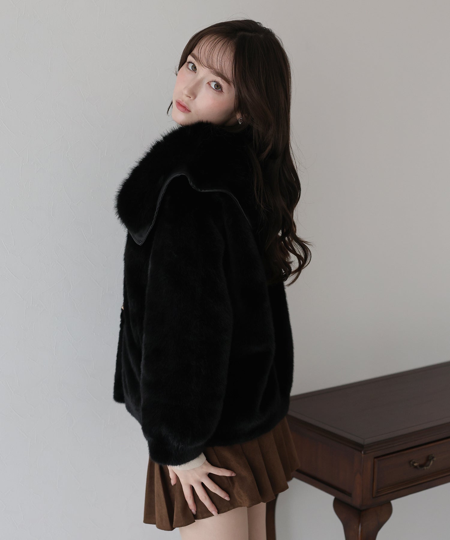 大きめのサイズ感がガーリーな襟は、フェイクレザーにファーが付いたデザインで、