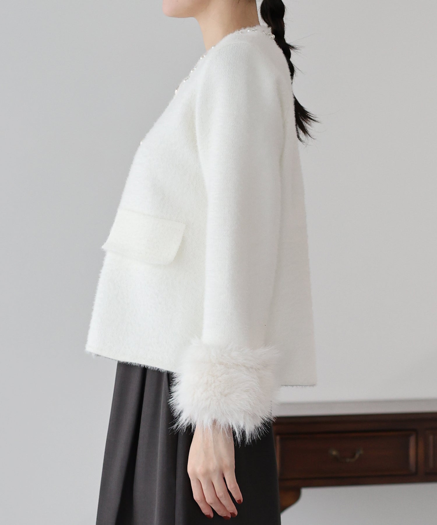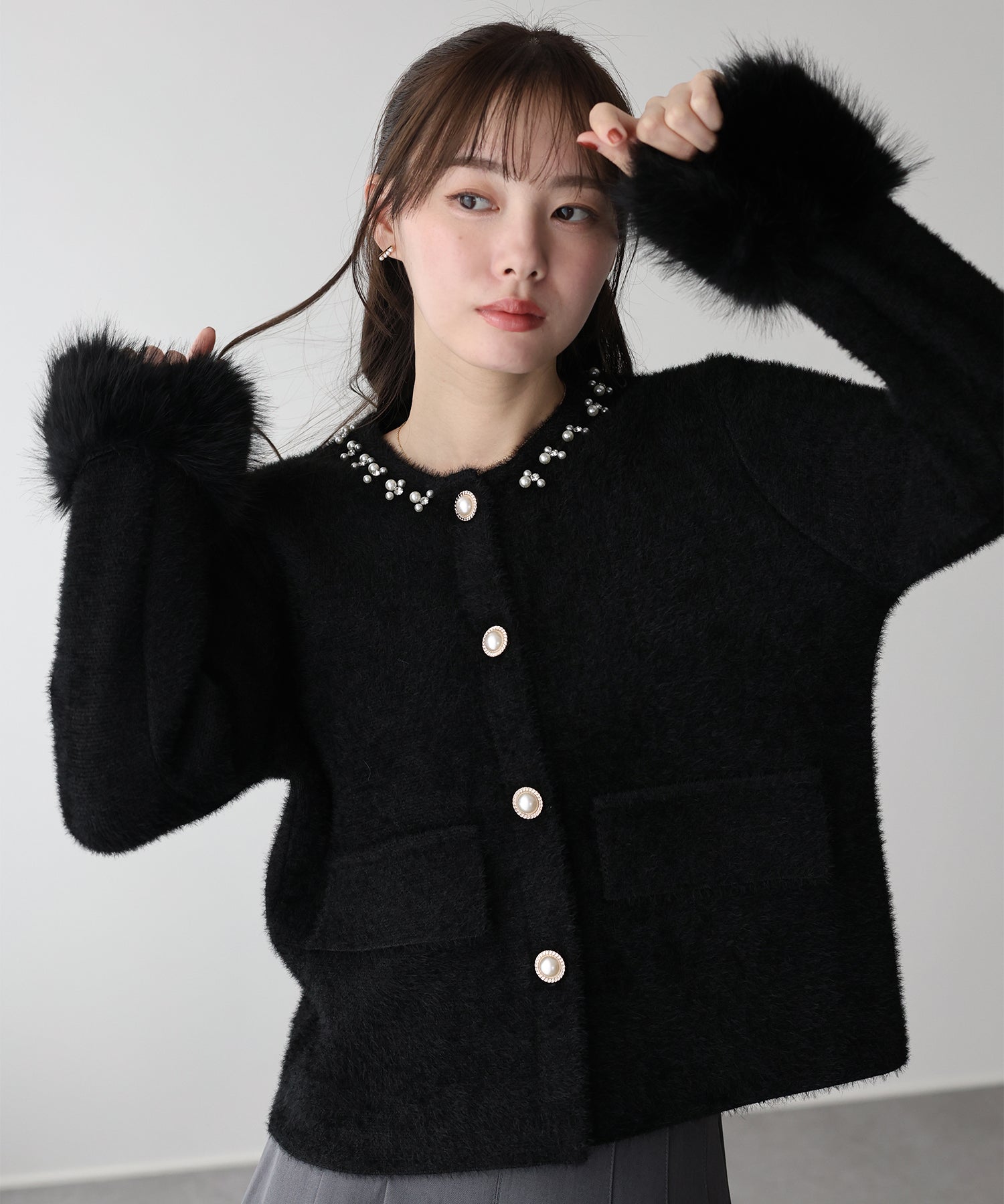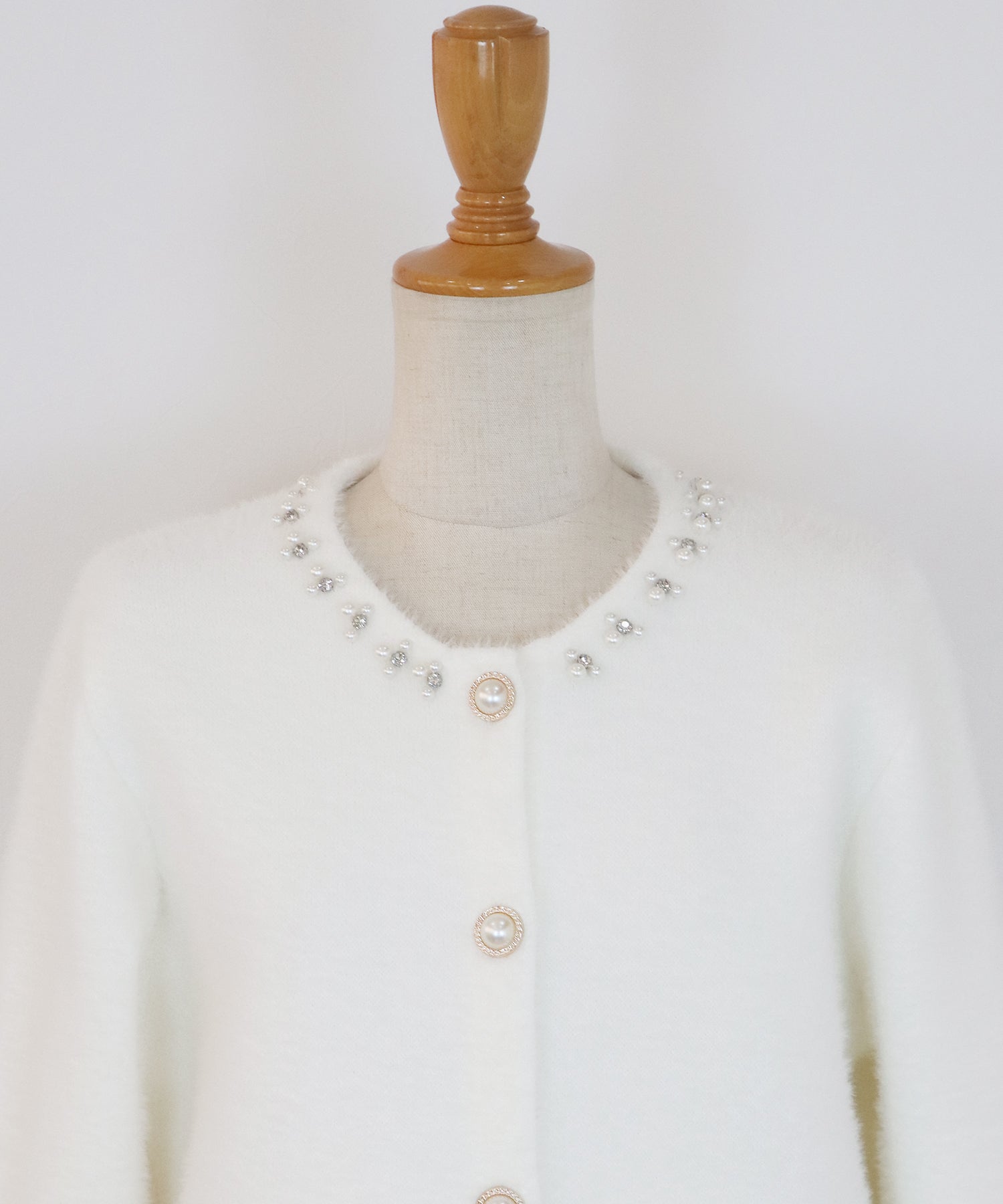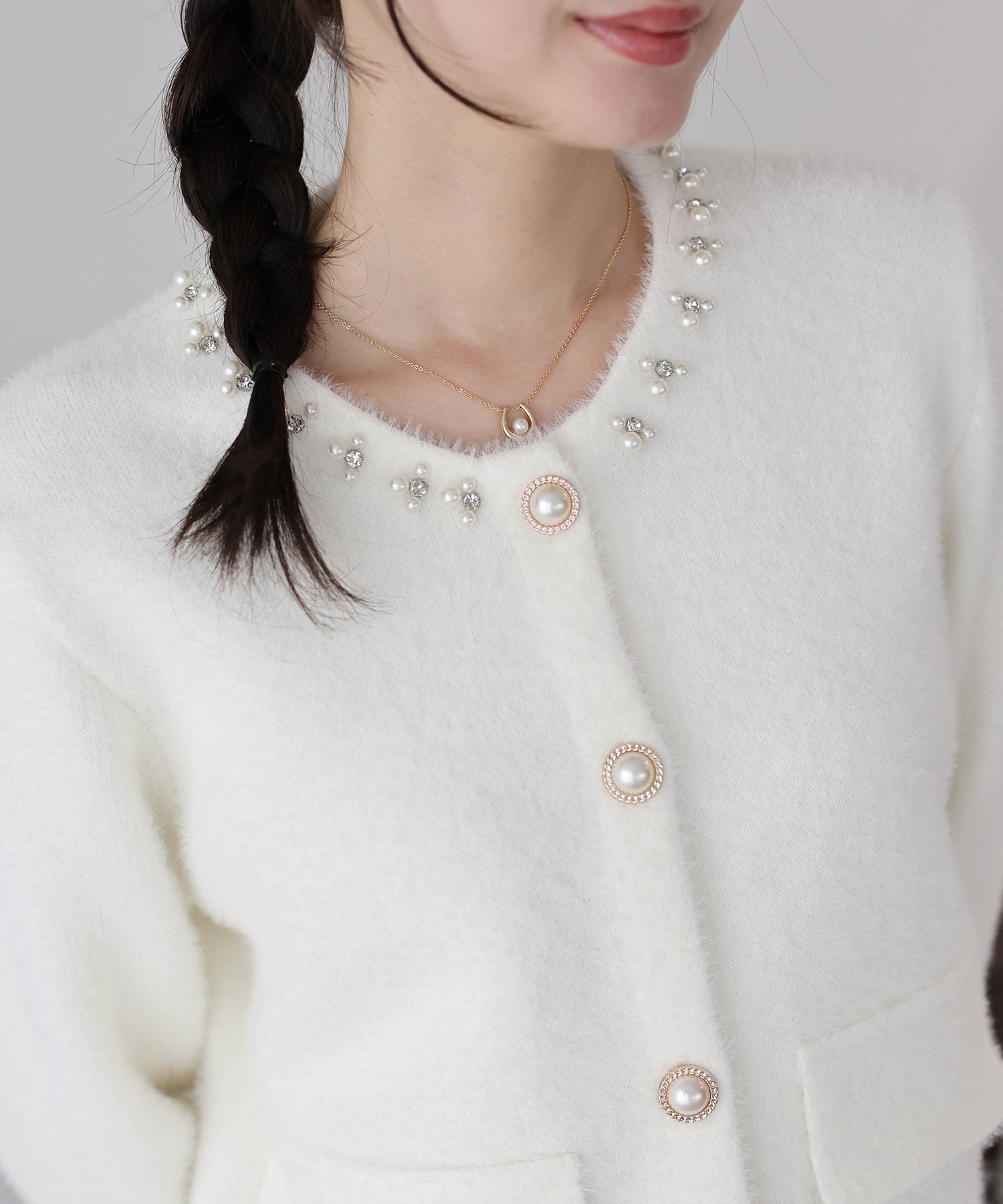 ネックにあしらったビジュー&パールがかわいらしいシャギーニットジャケット。