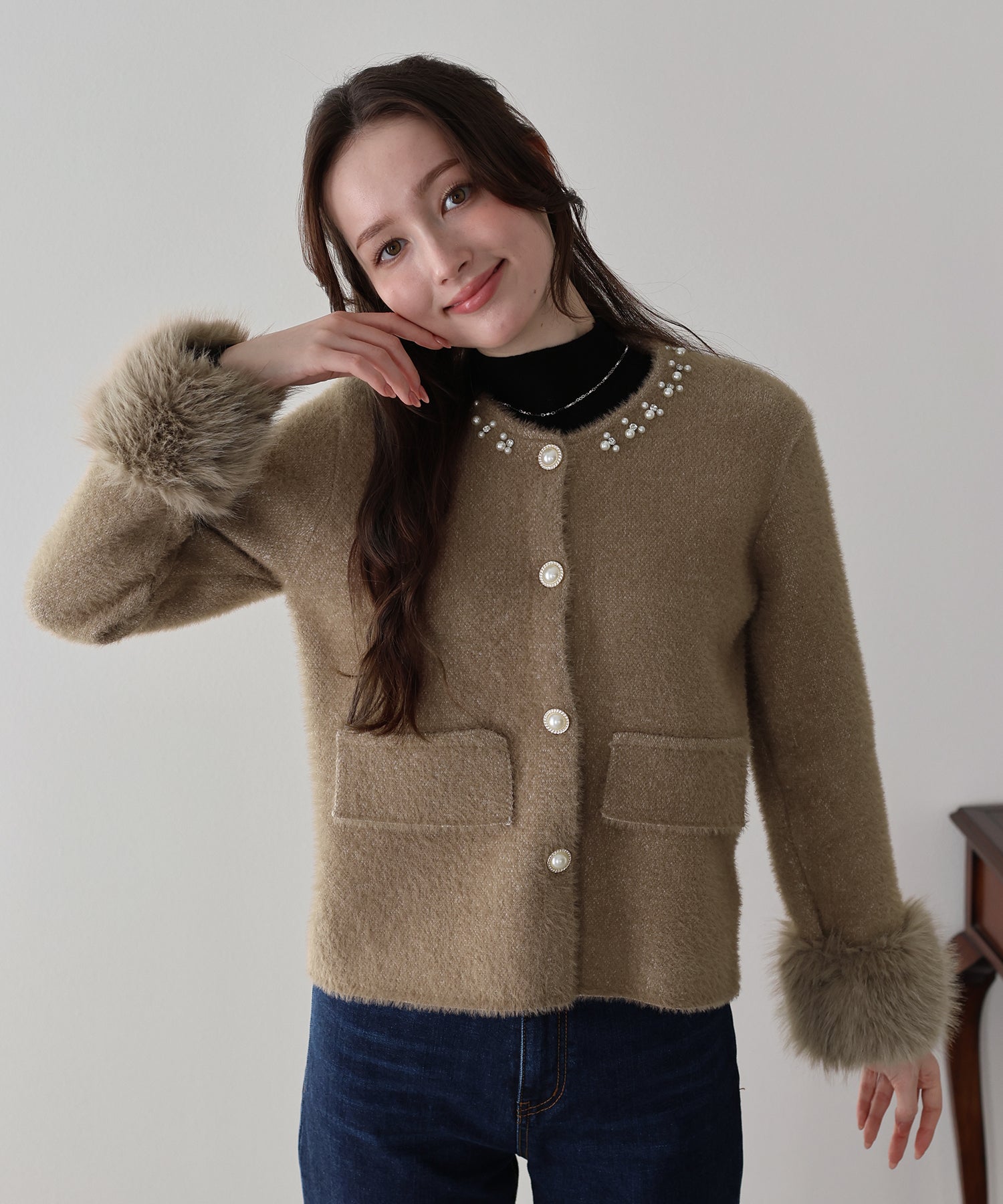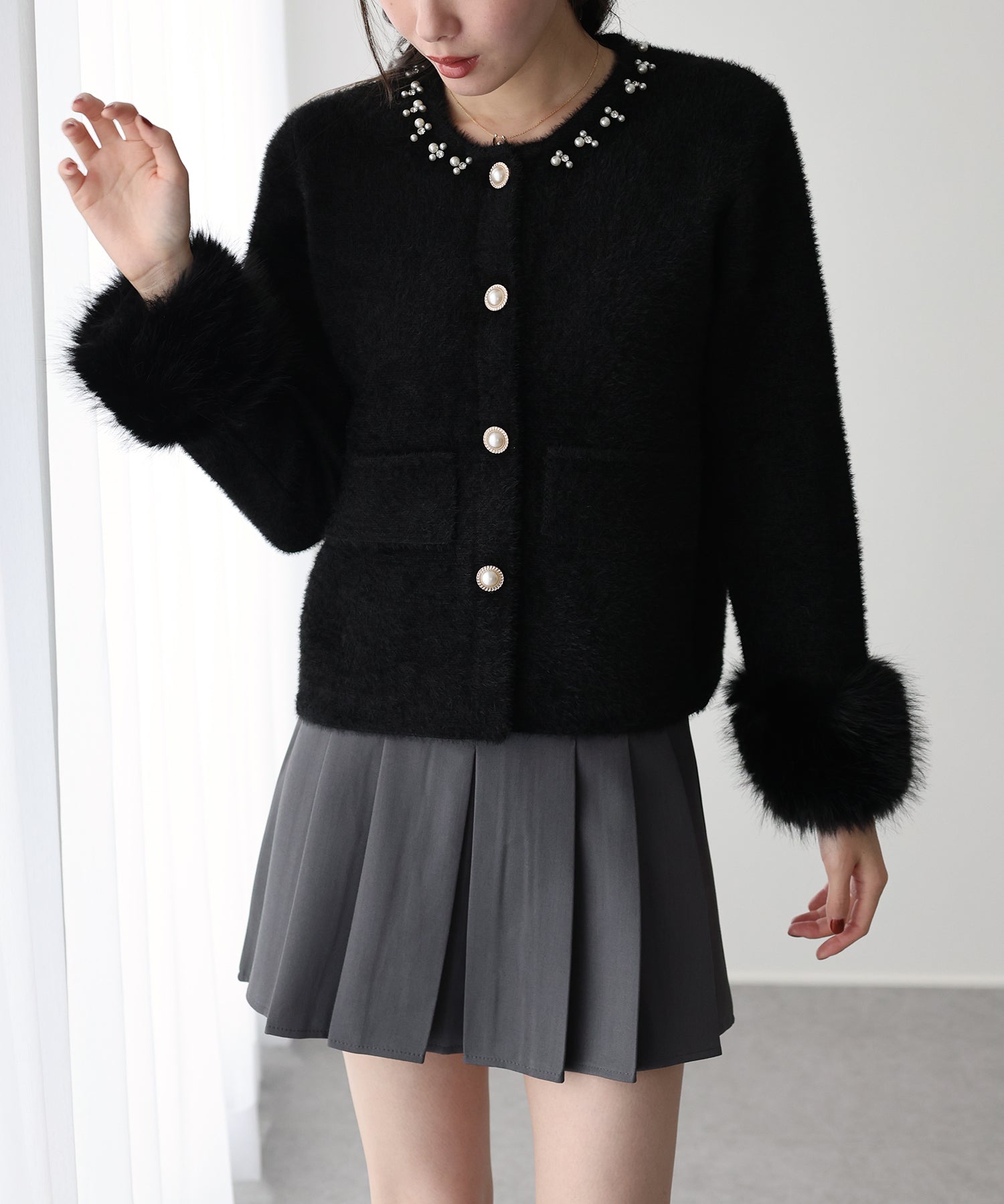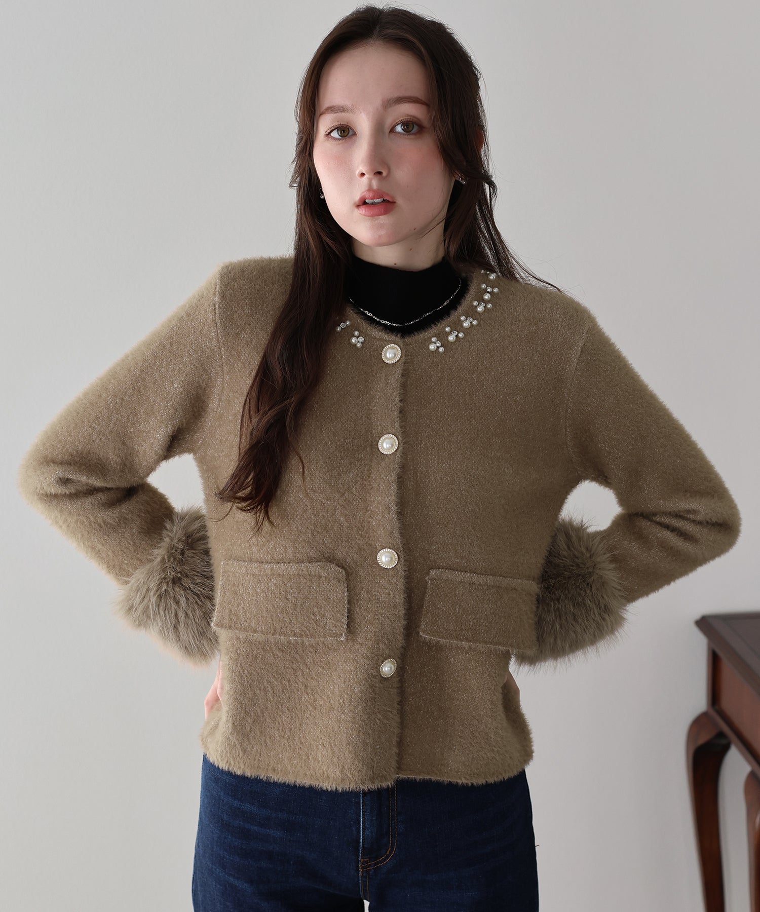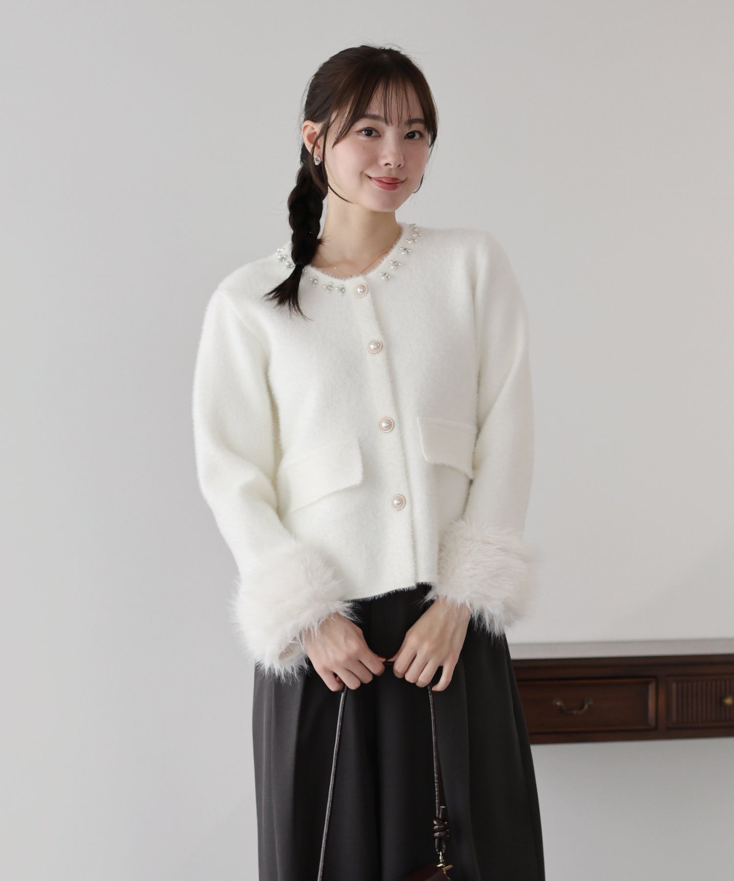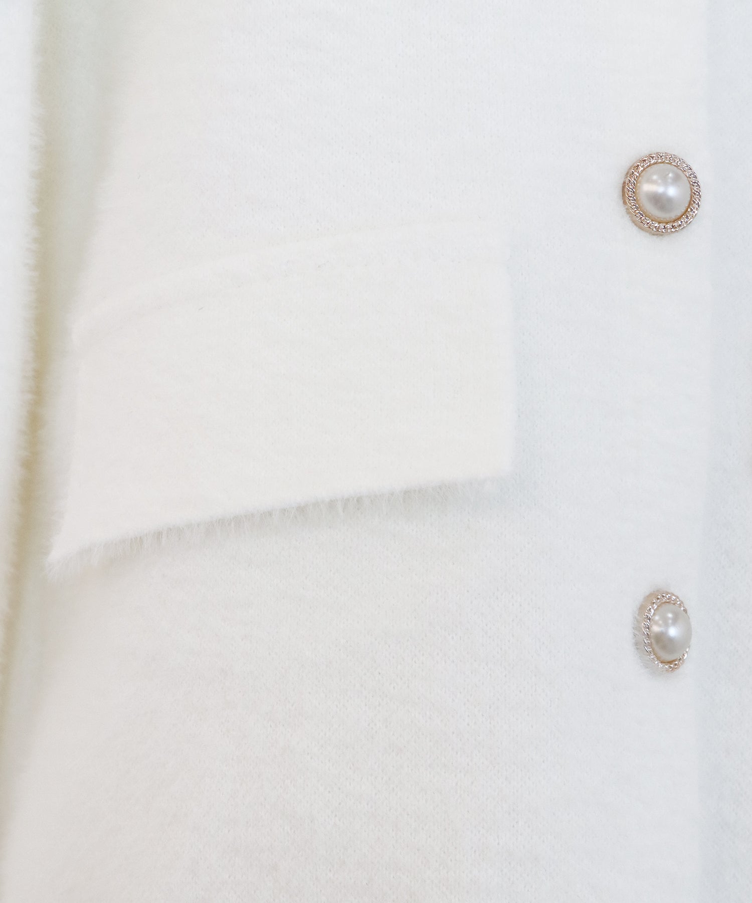 ネックにあしらったビジュー&パールがかわいらしいシャギーニットジャケット。