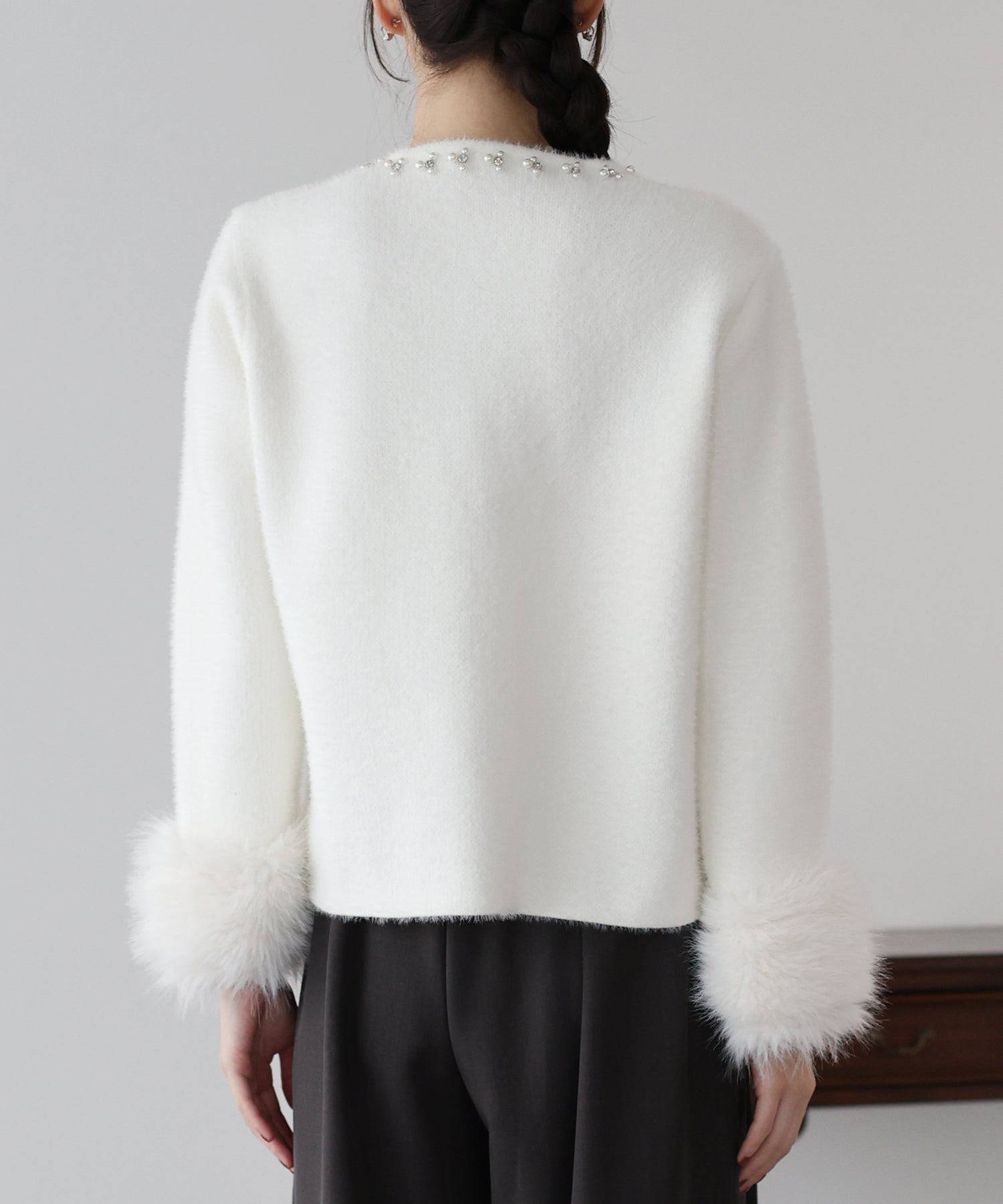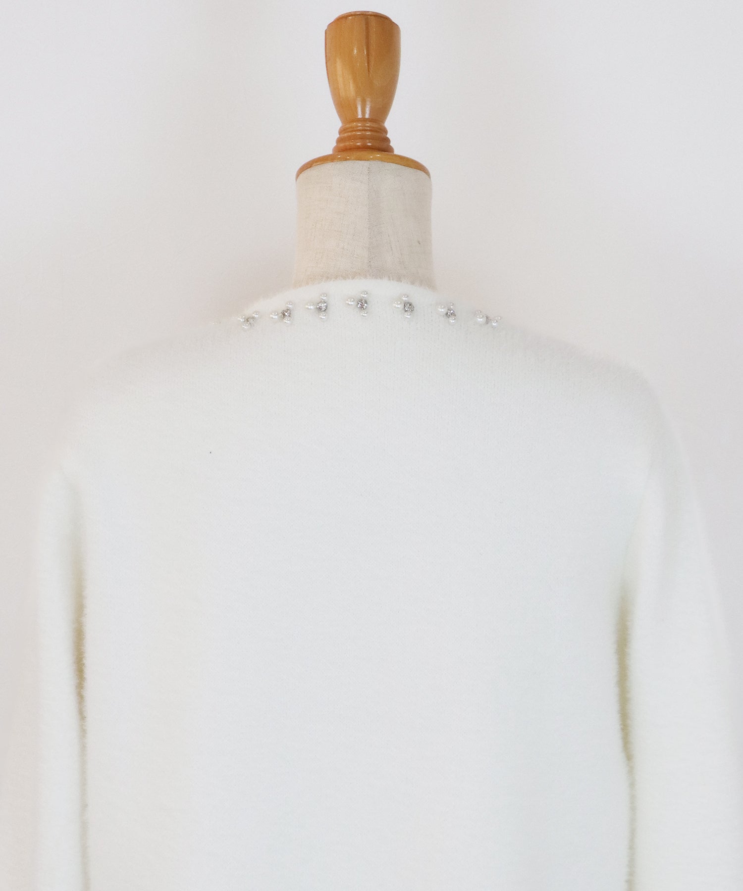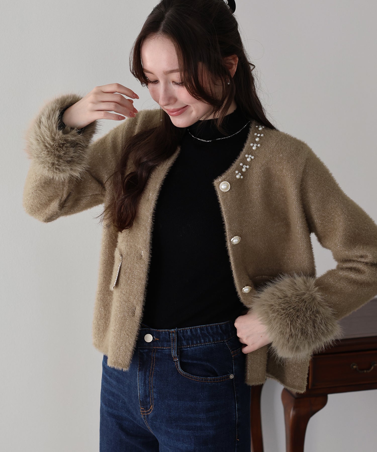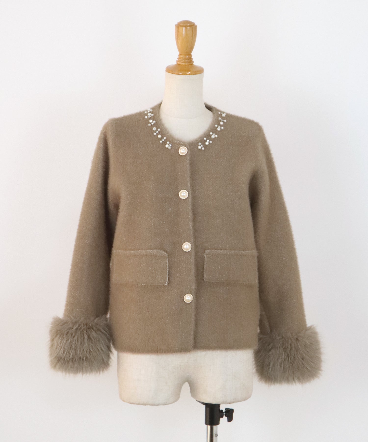 ネックにあしらったビジュー&パールがかわいらしいシャギーニットジャケット。