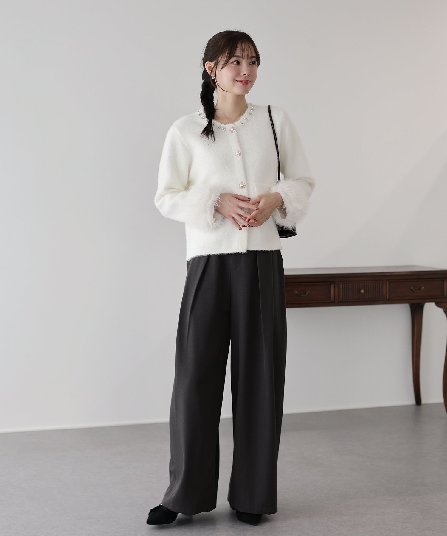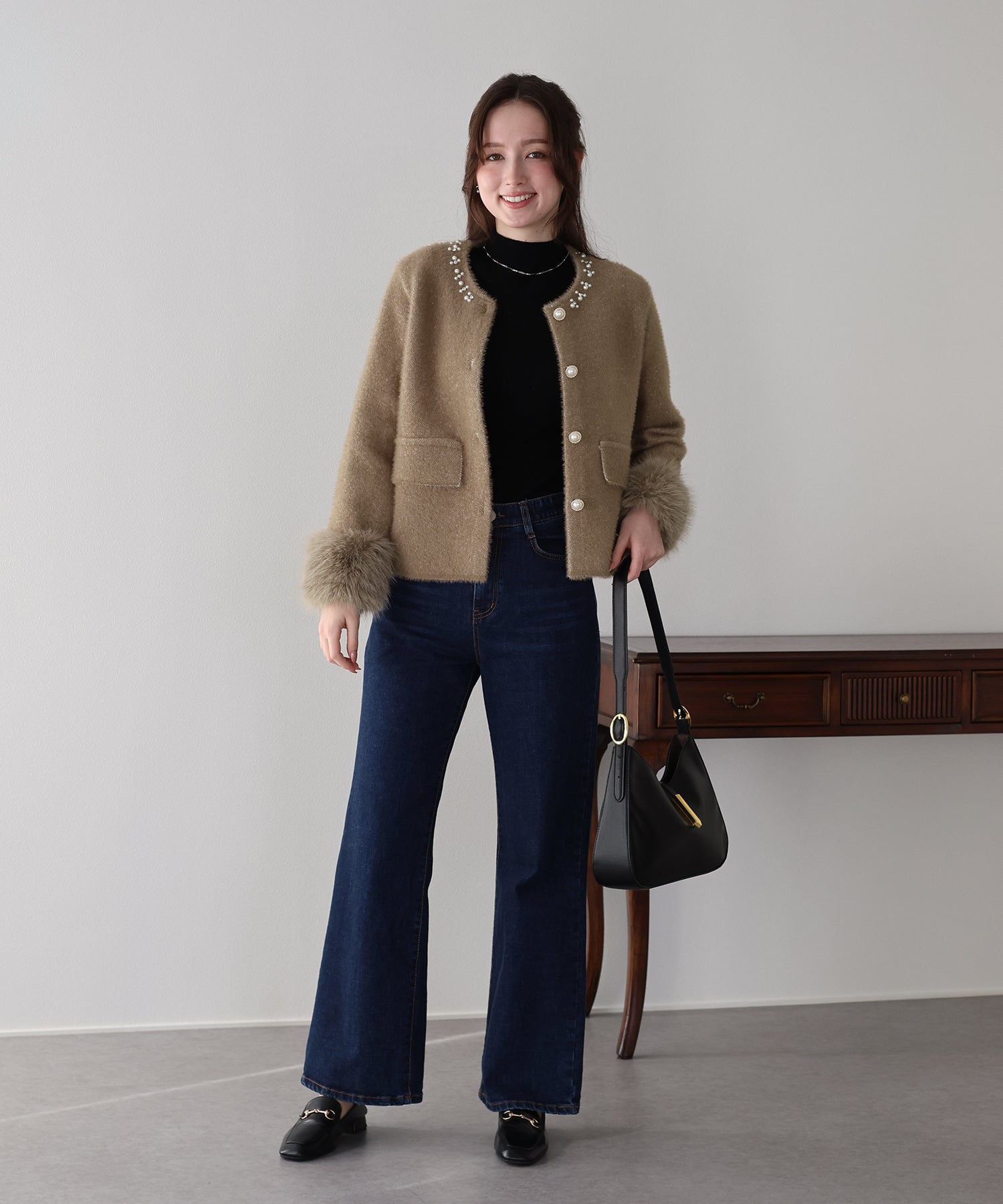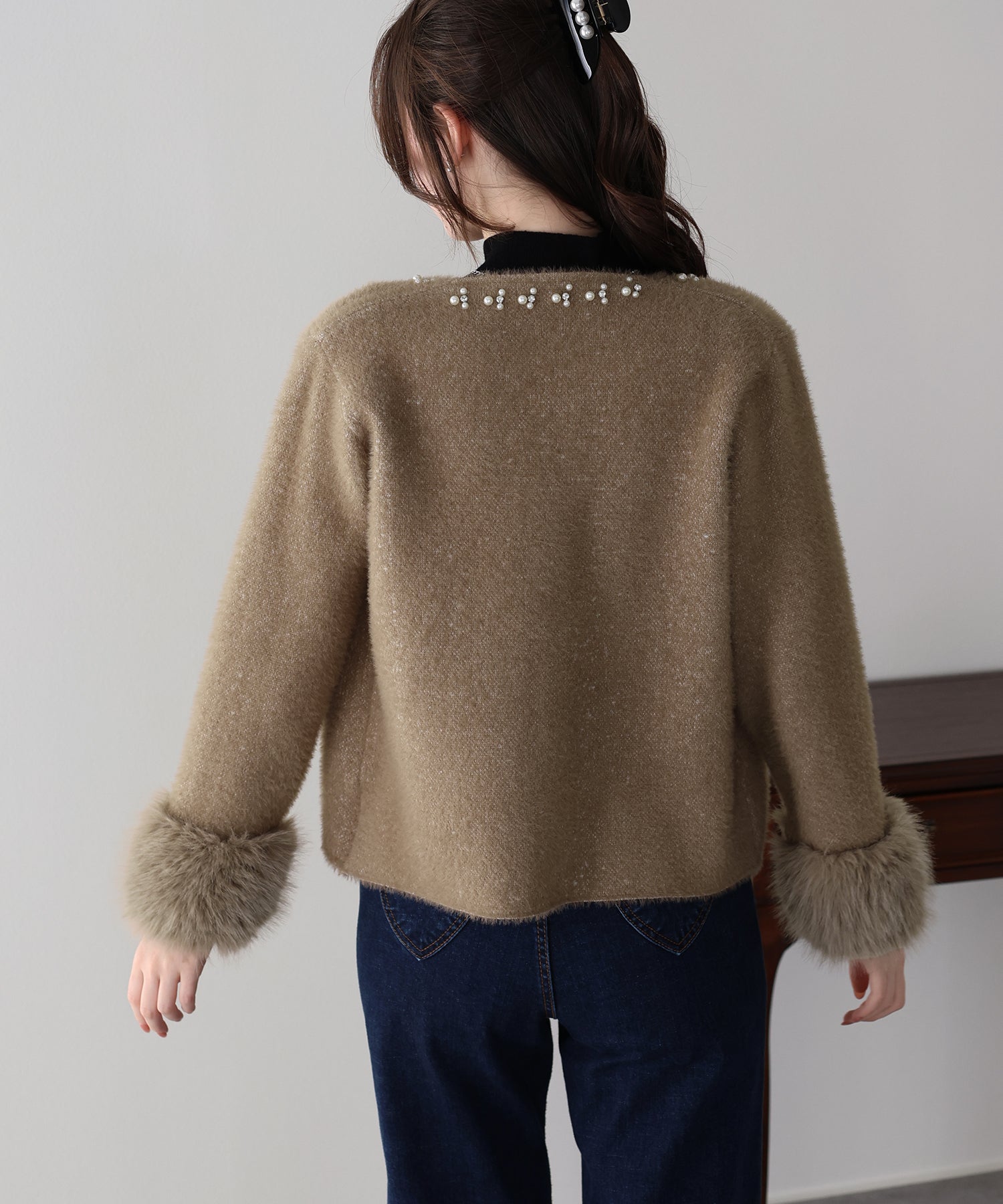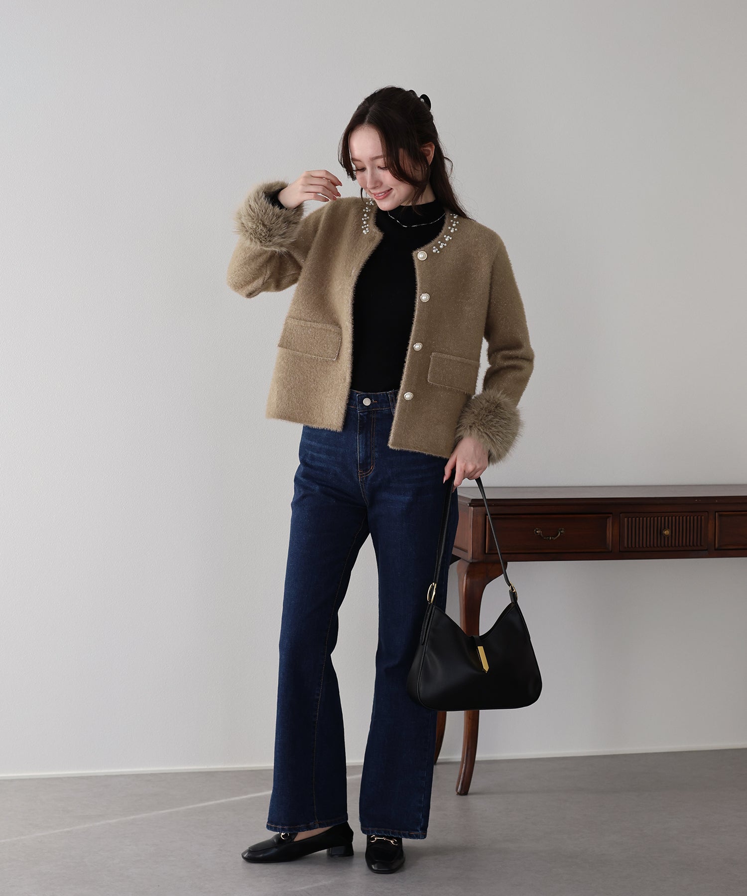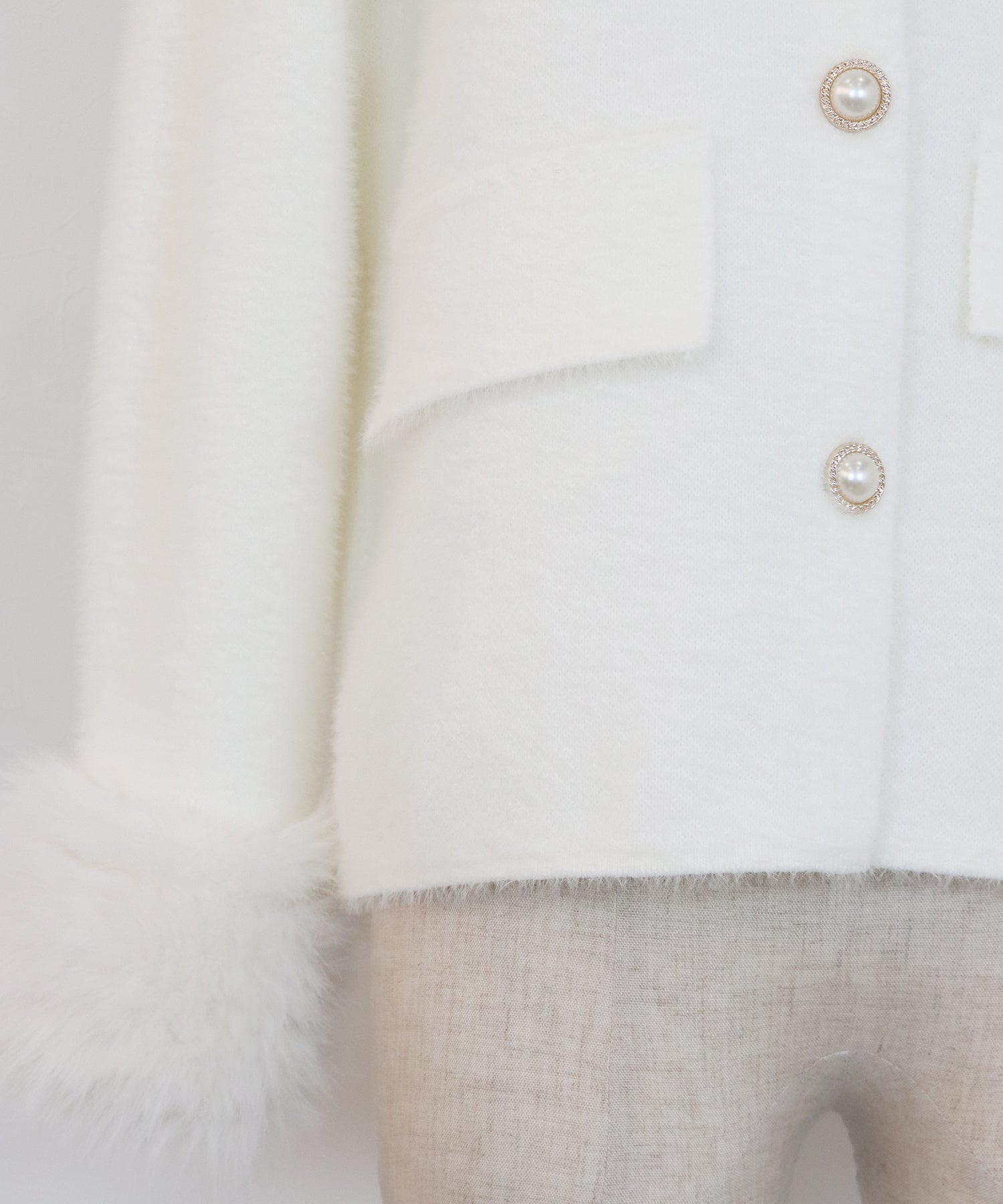 ネックにあしらったビジュー&パールがかわいらしいシャギーニットジャケット。