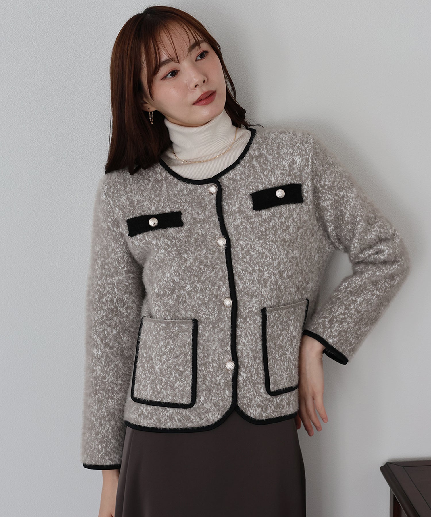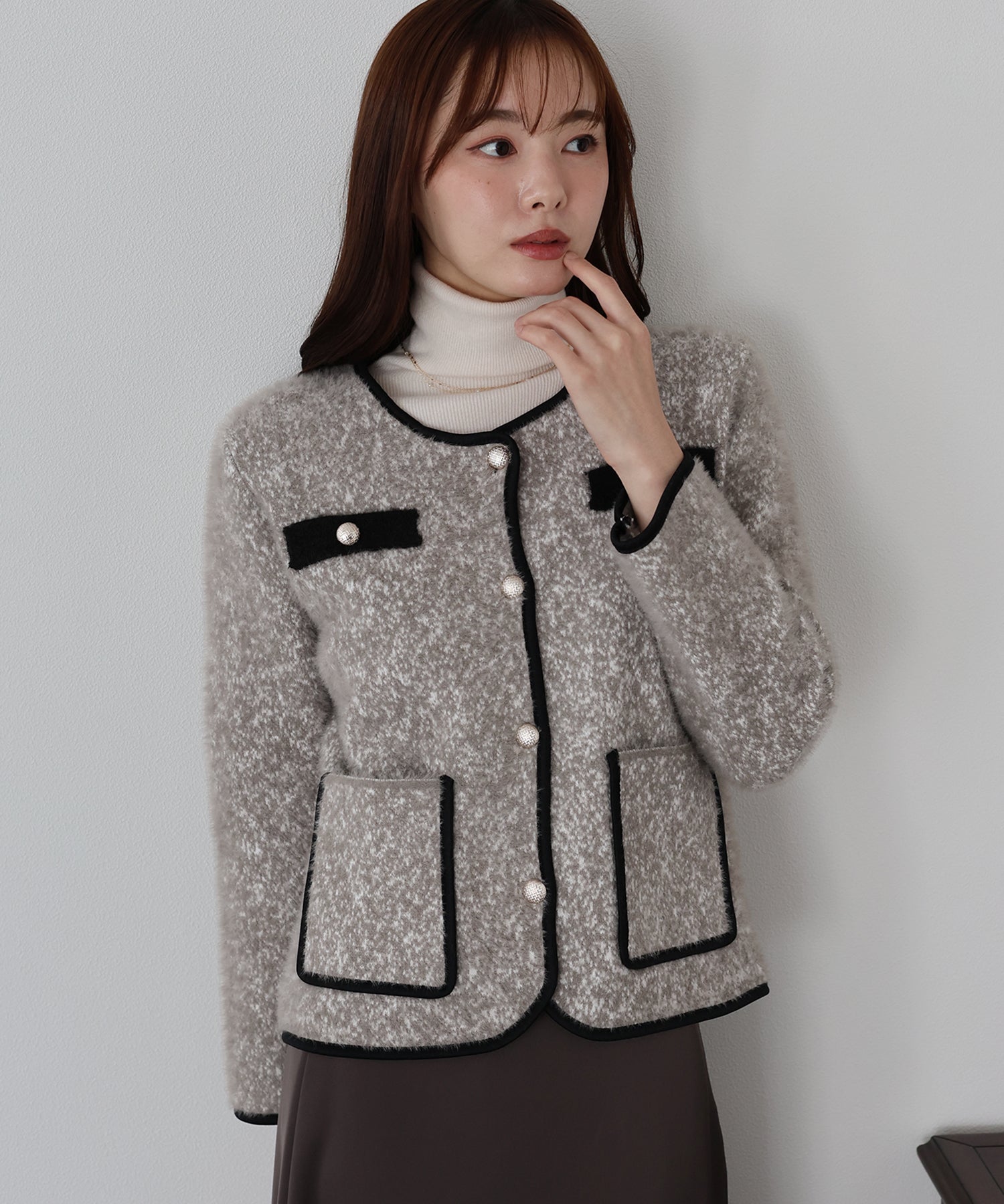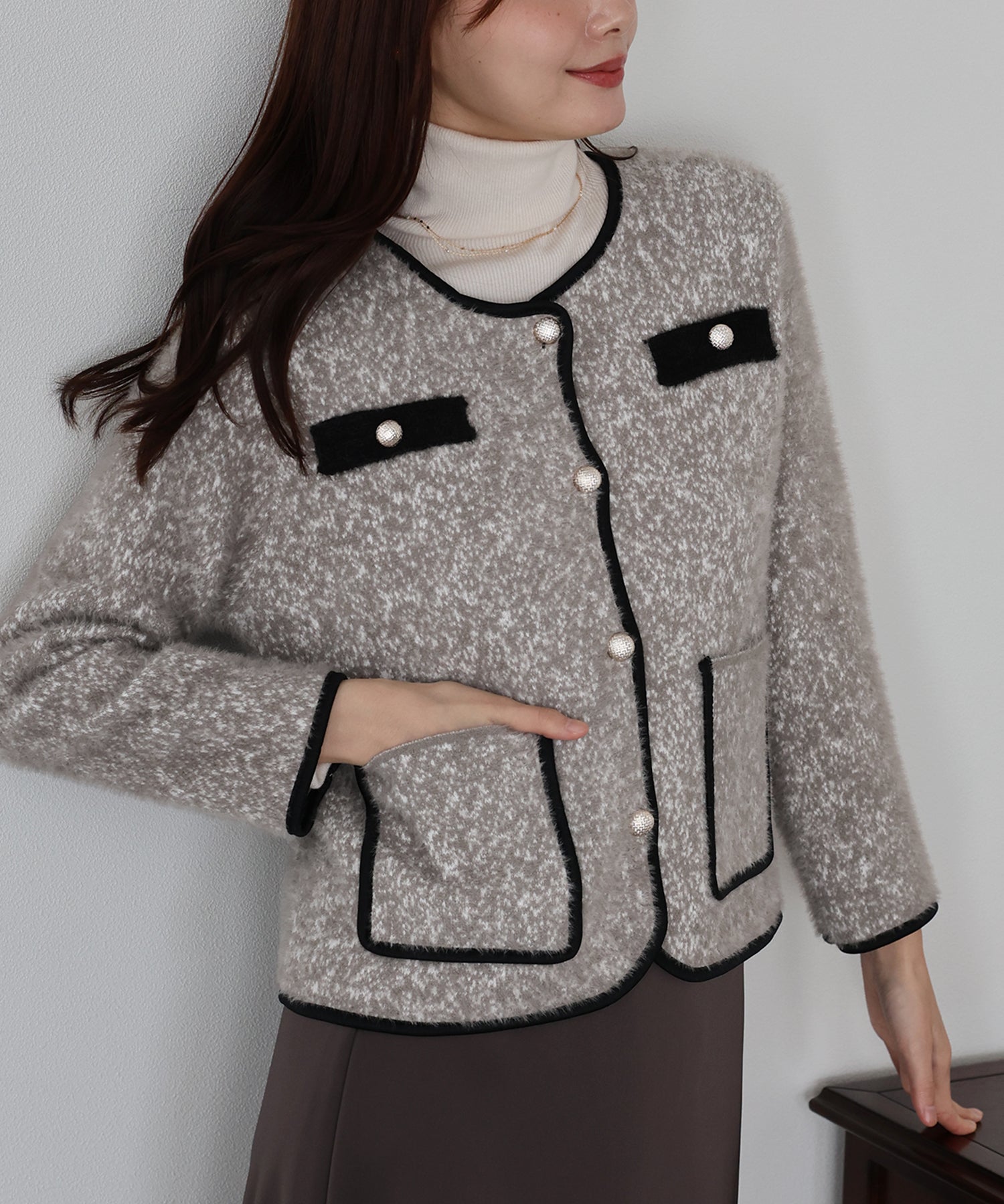 ミックスカラーのシャギー生地が上品な印象のノーカラージャケット。