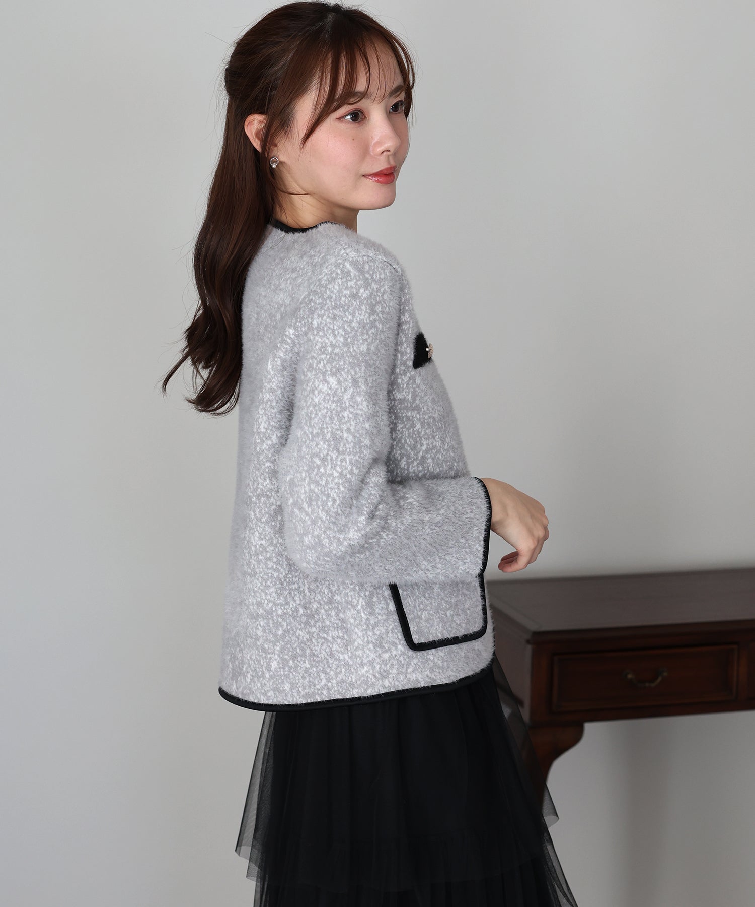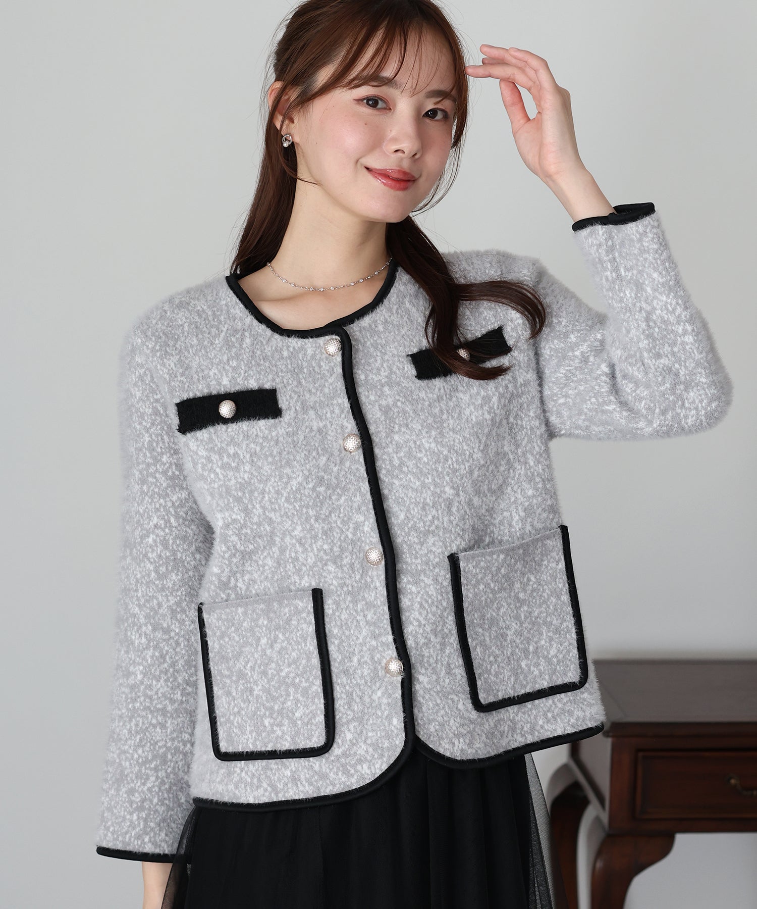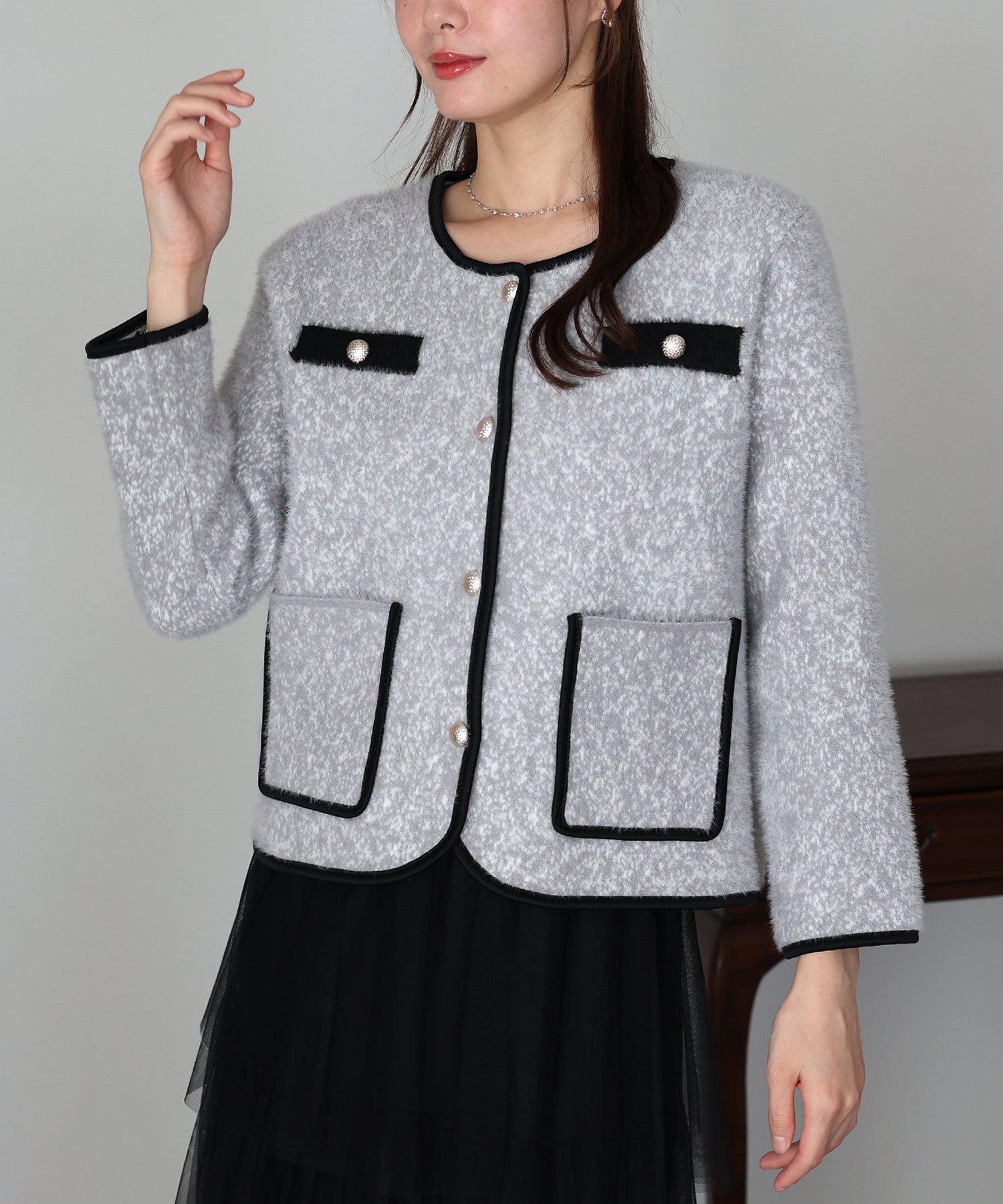 ミックスカラーのシャギー生地が上品な印象のノーカラージャケット。