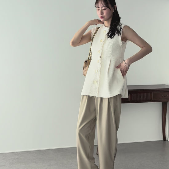 ウエスト部分で切り替えたペプラムシルエットが特徴のツイードジレ。