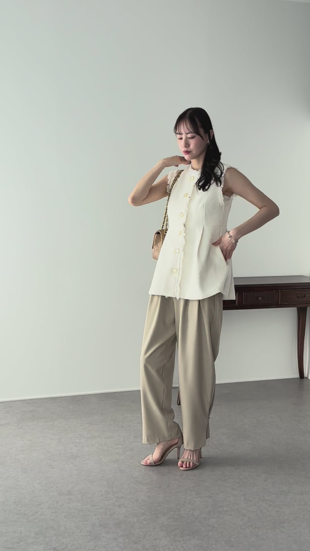 上品でクラシカルな雰囲気を漂わせるフリンジツイードベスト