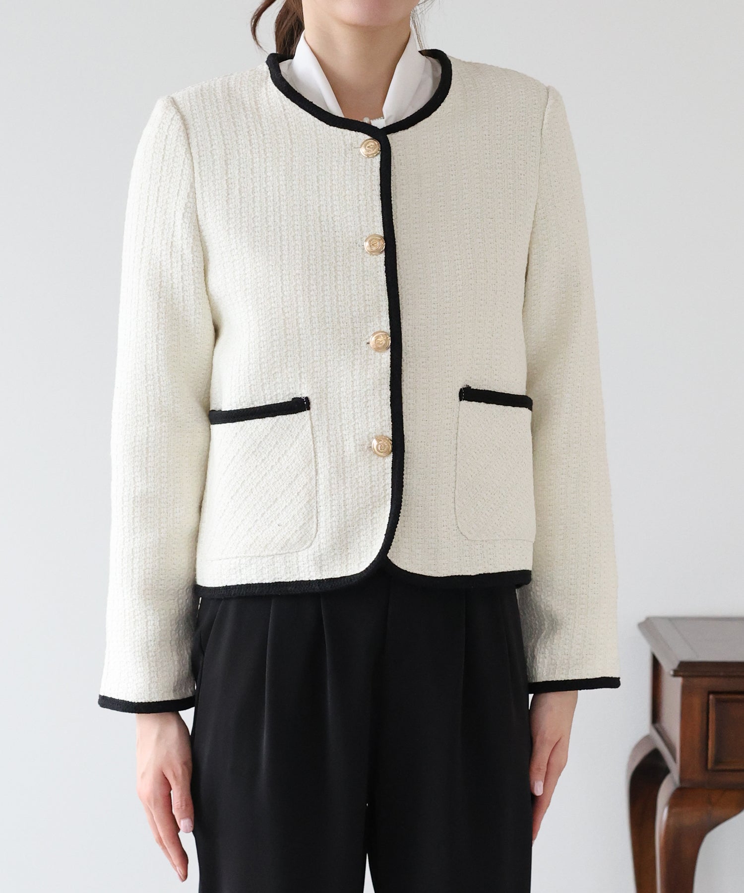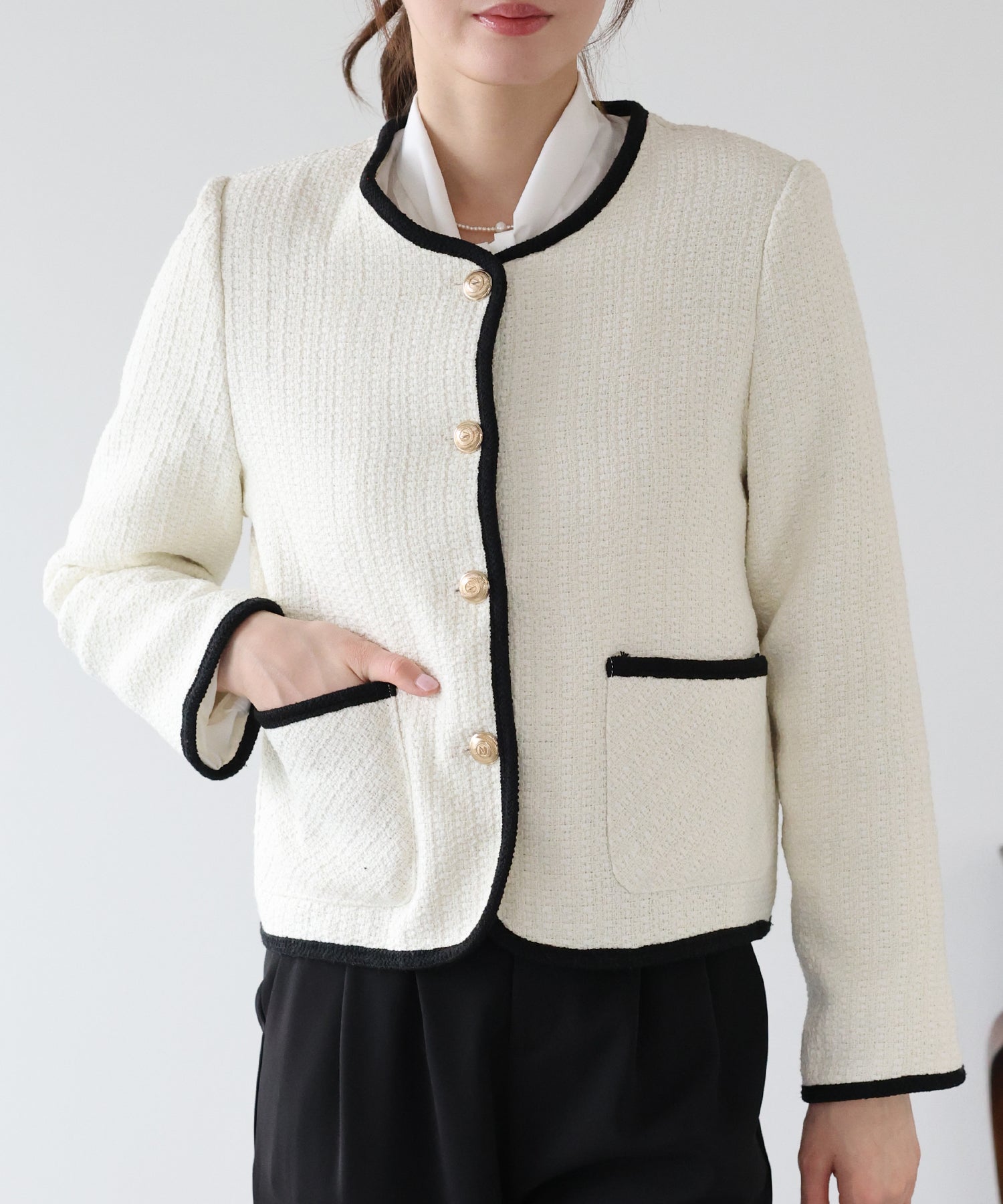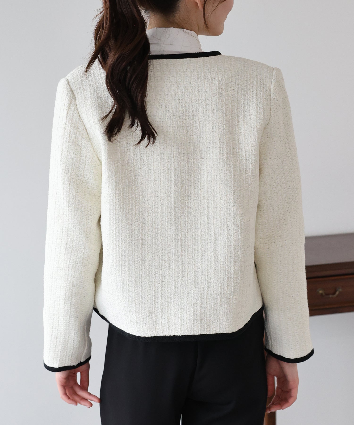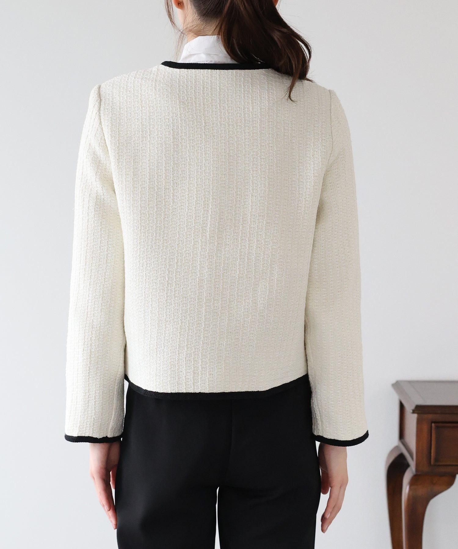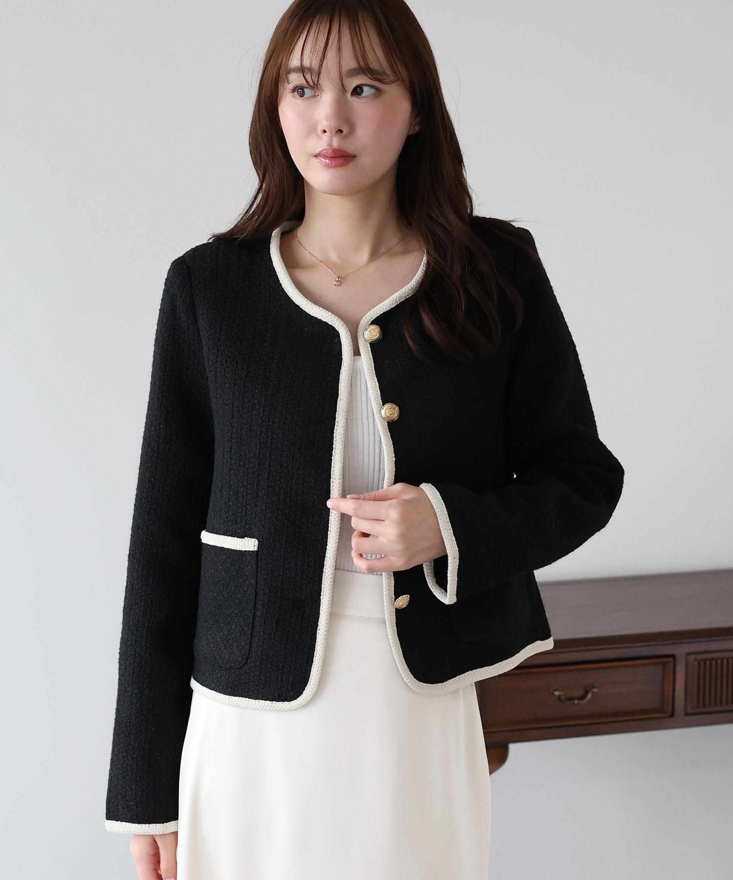 クラシカルなツイード素材に、配色のパイピングを効かせたトレンド感のあるノーカラージャケット。