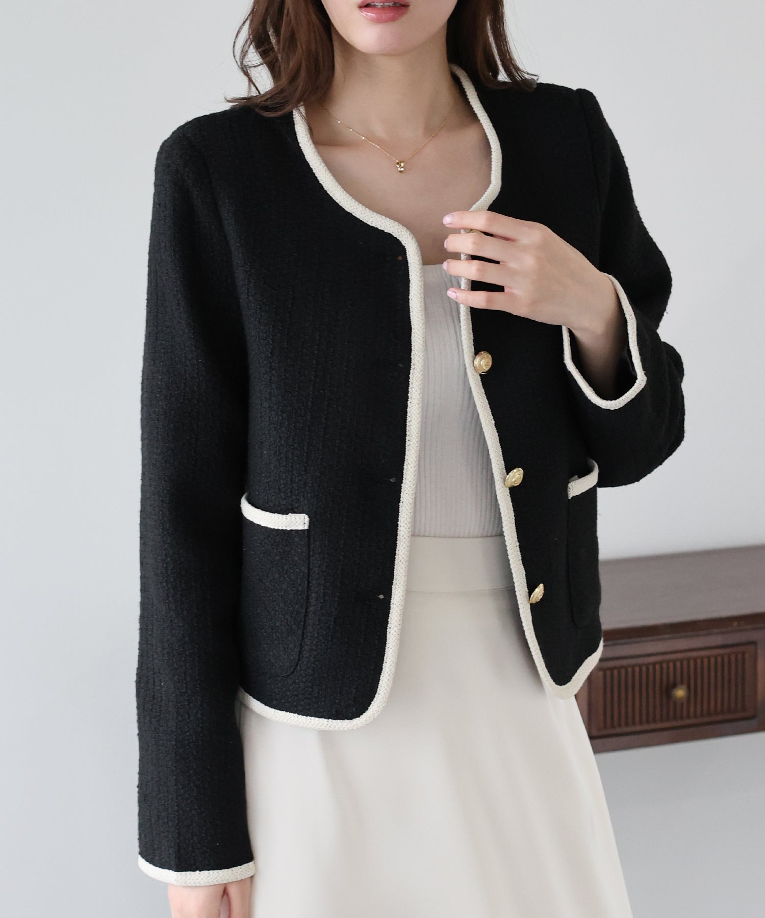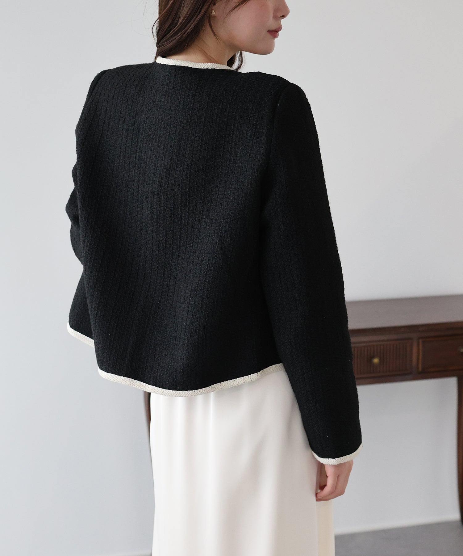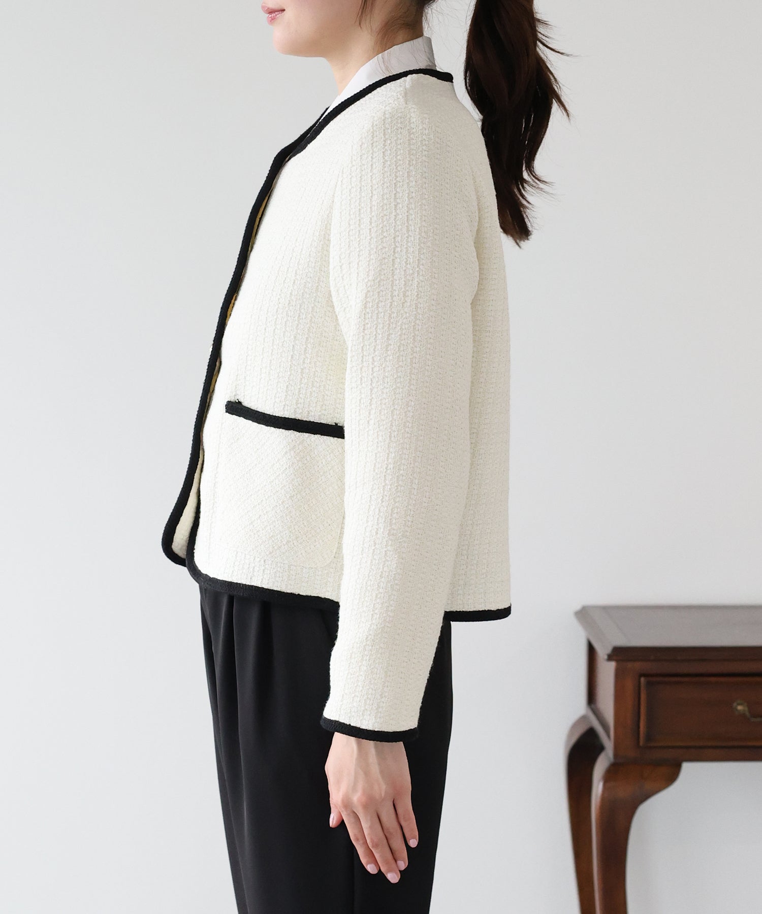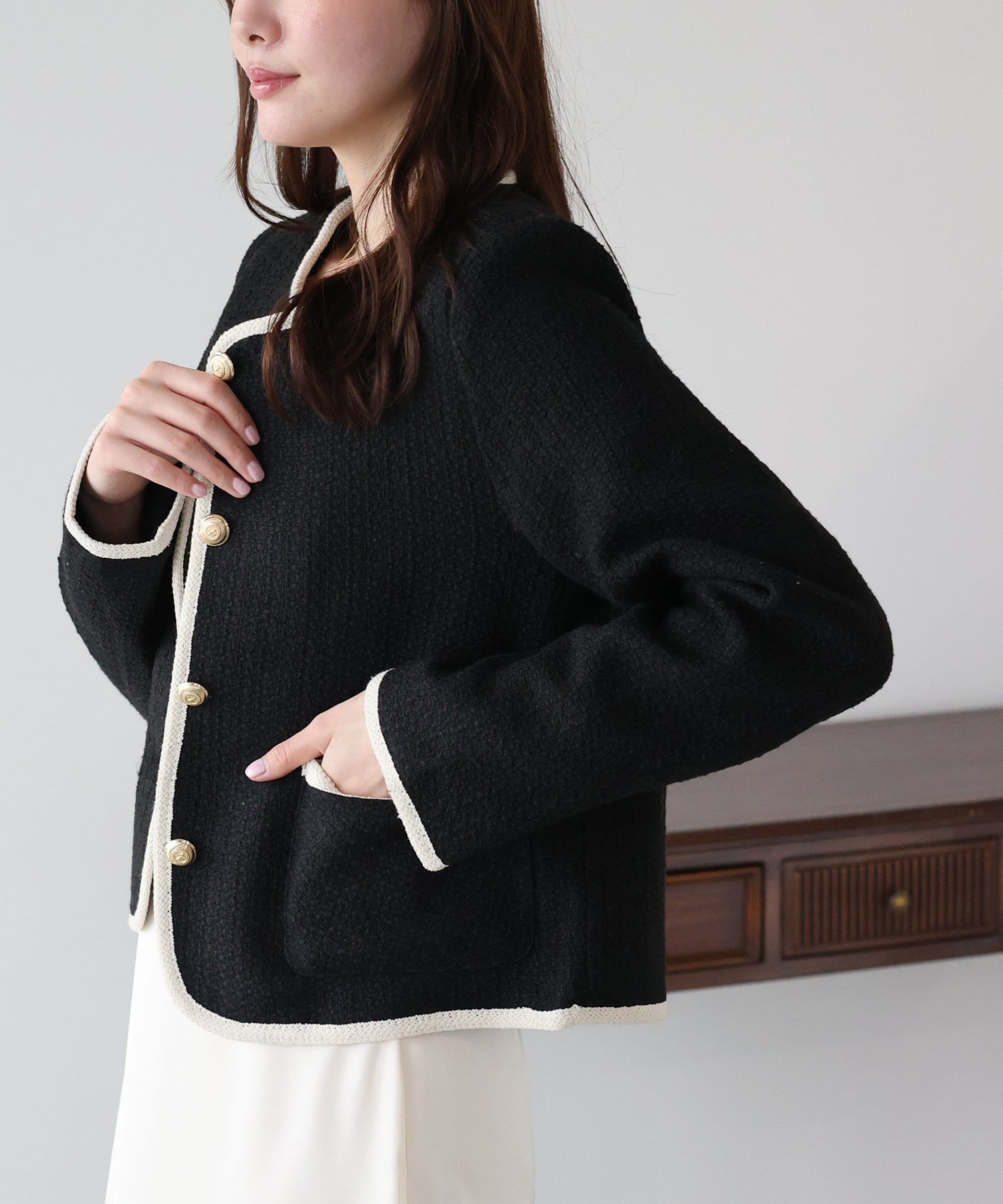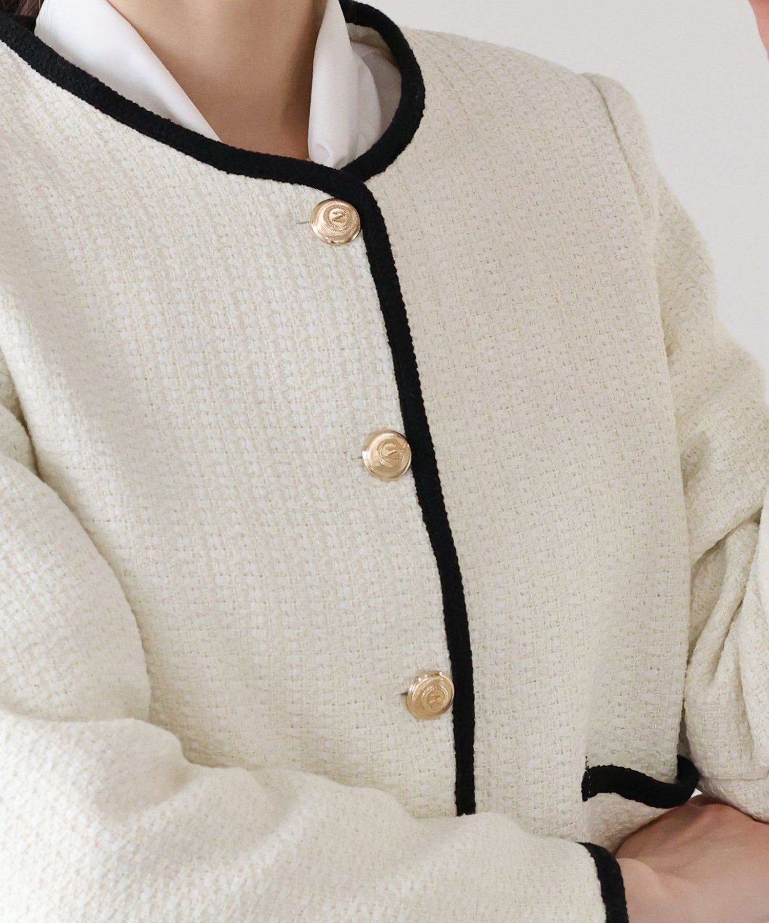 クラシカルなツイード素材に、配色のパイピングを効かせたトレンド感のあるノーカラージャケット。
