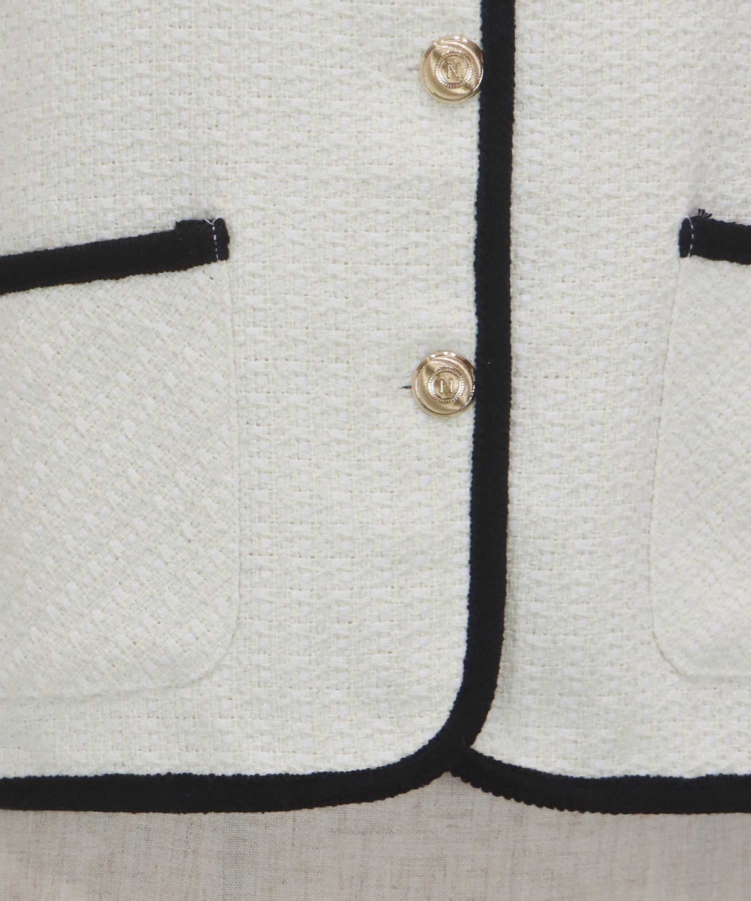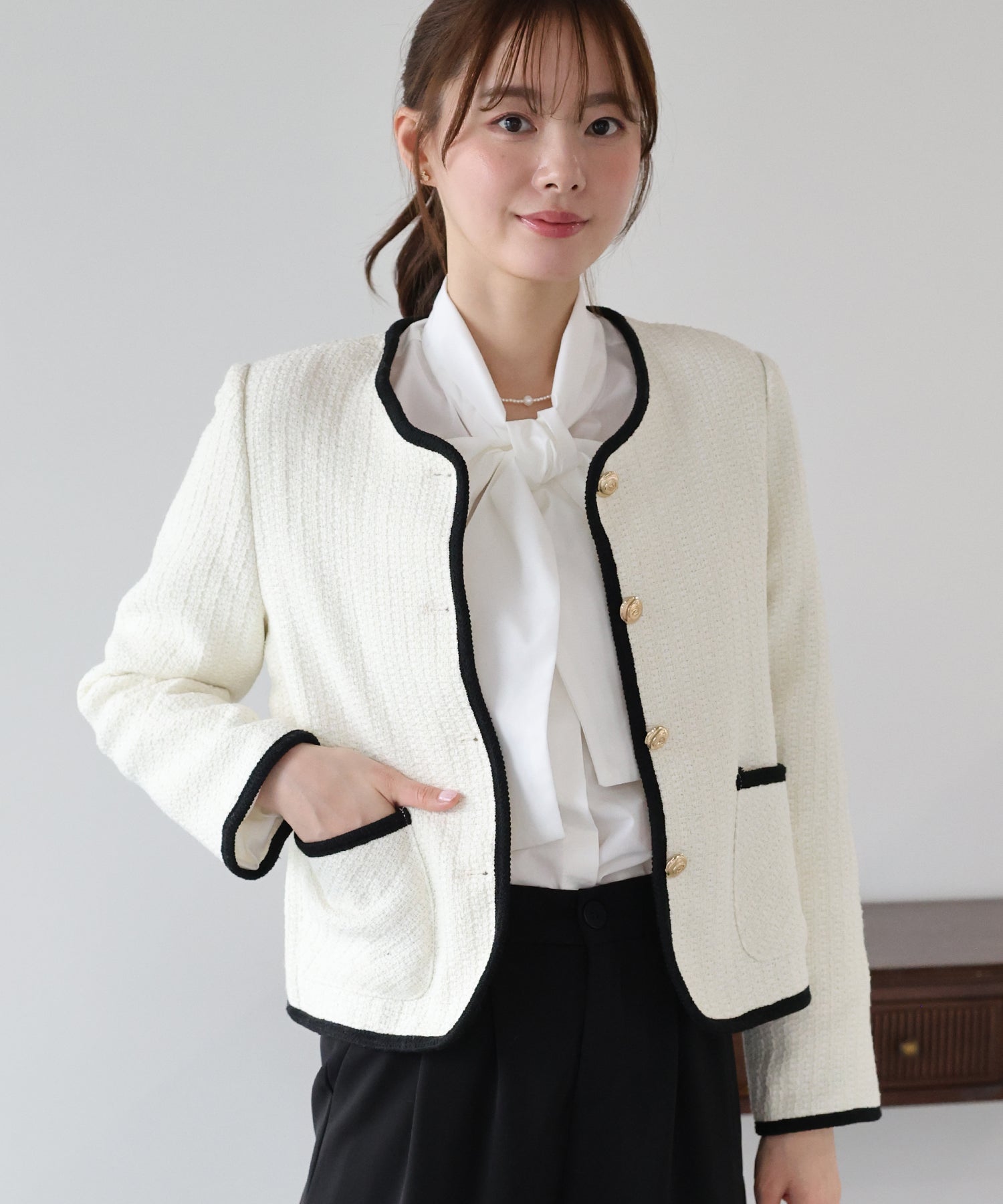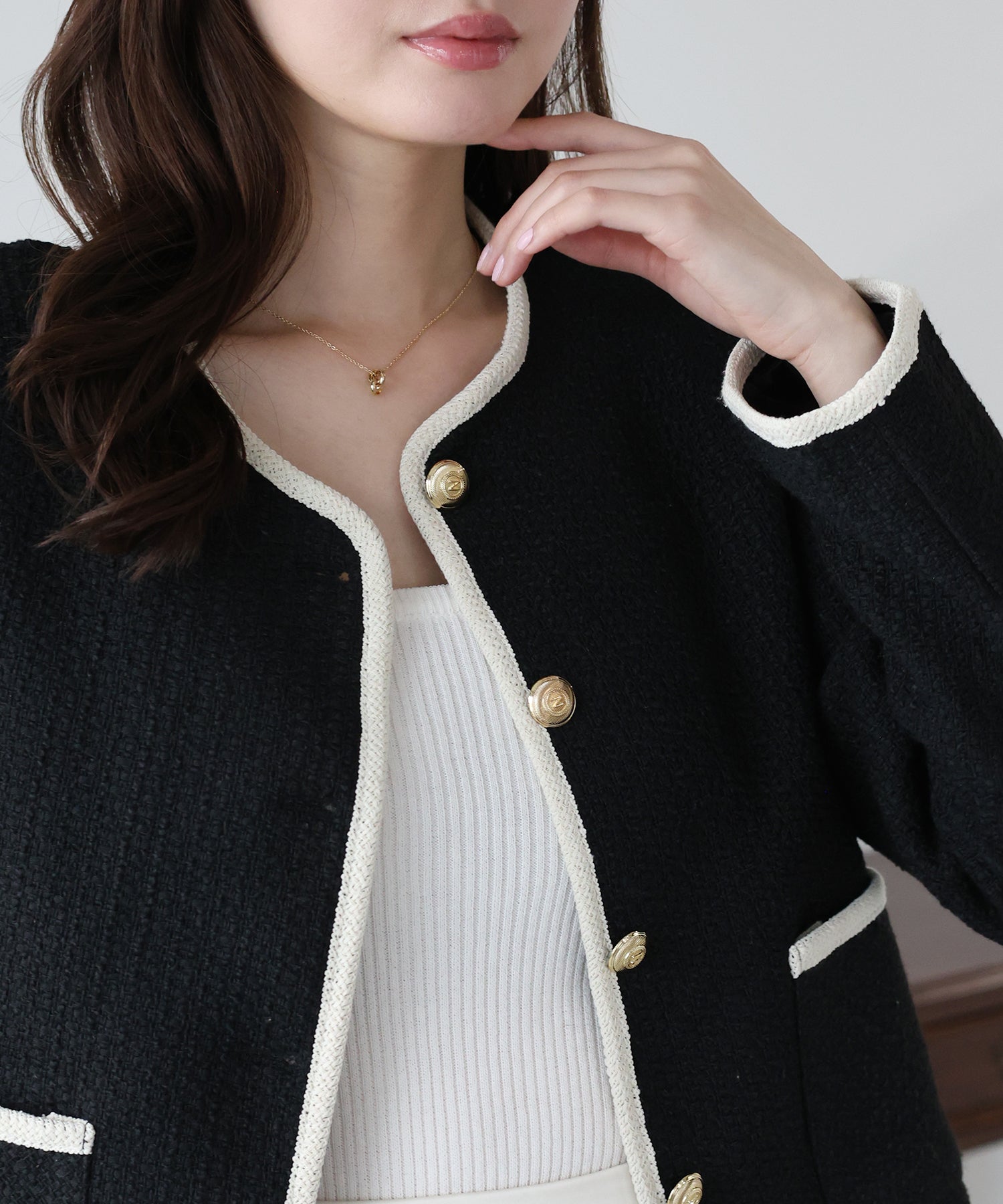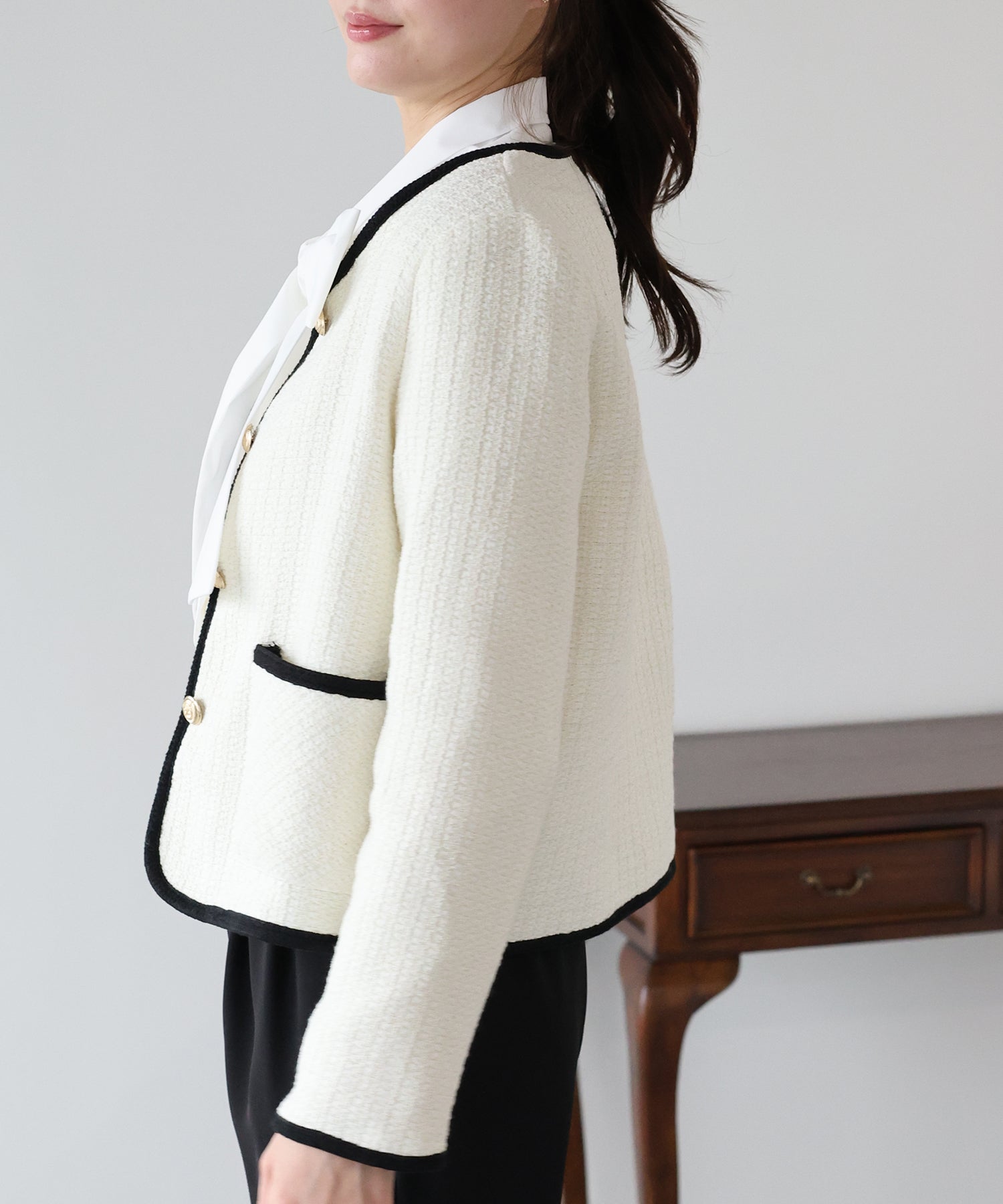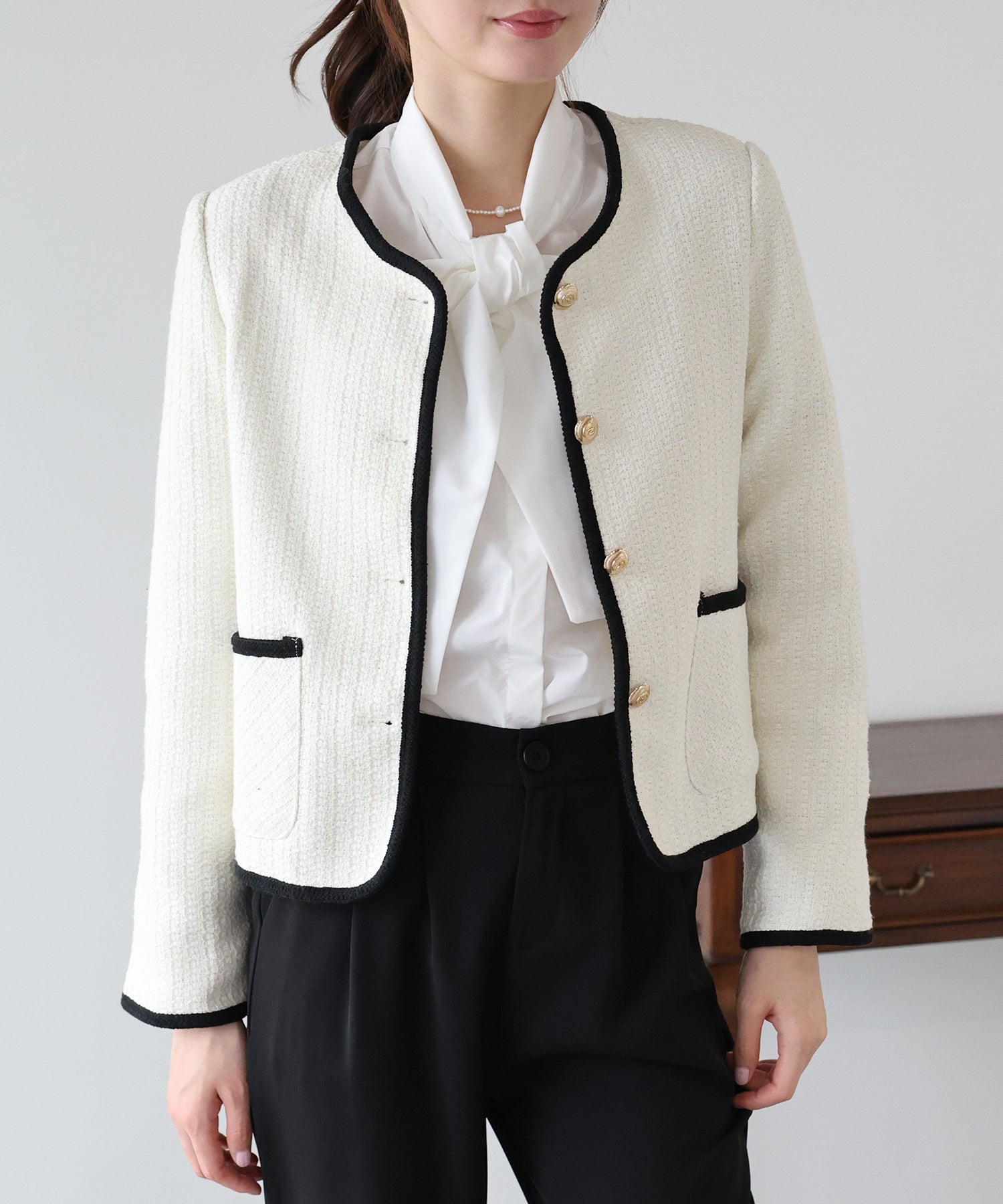 クラシカルなツイード素材に、配色のパイピングを効かせたトレンド感のあるノーカラージャケット。