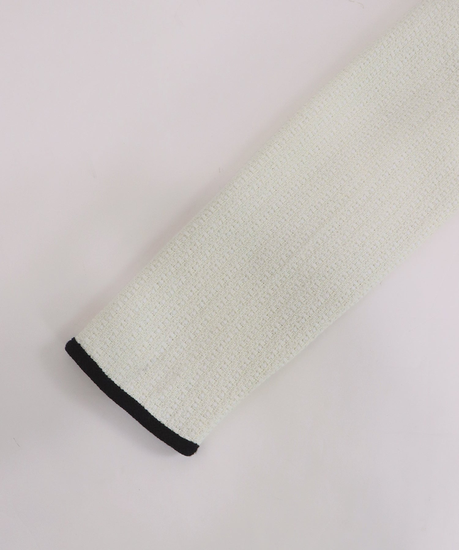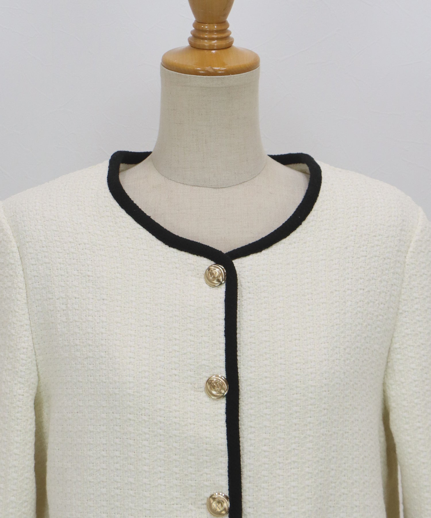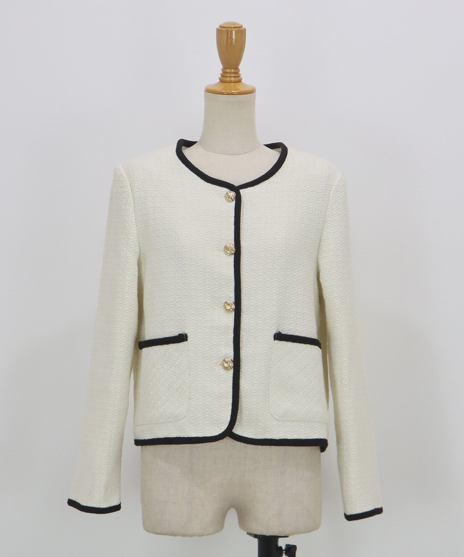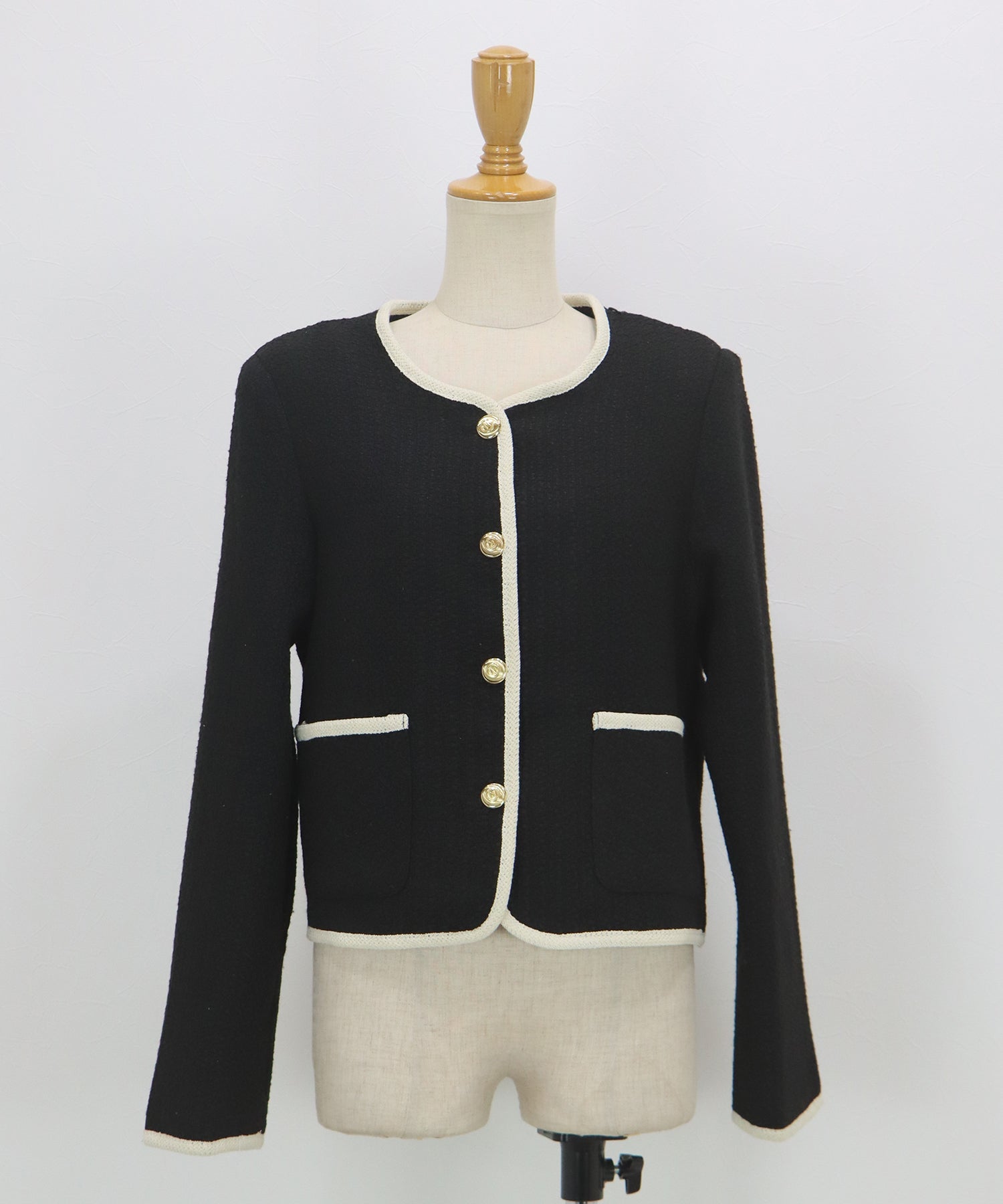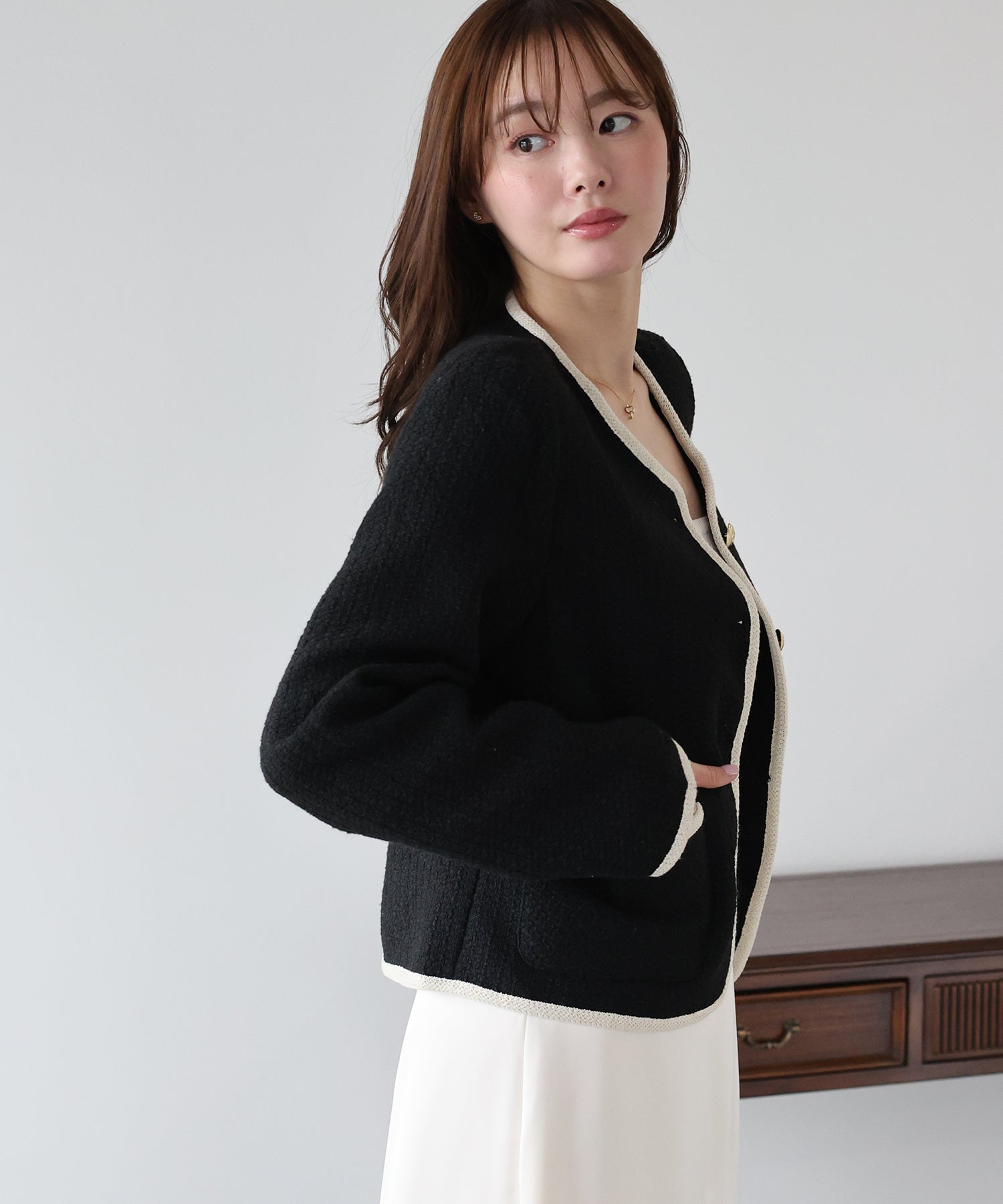 クラシカルなツイード素材に、配色のパイピングを効かせたトレンド感のあるノーカラージャケット。