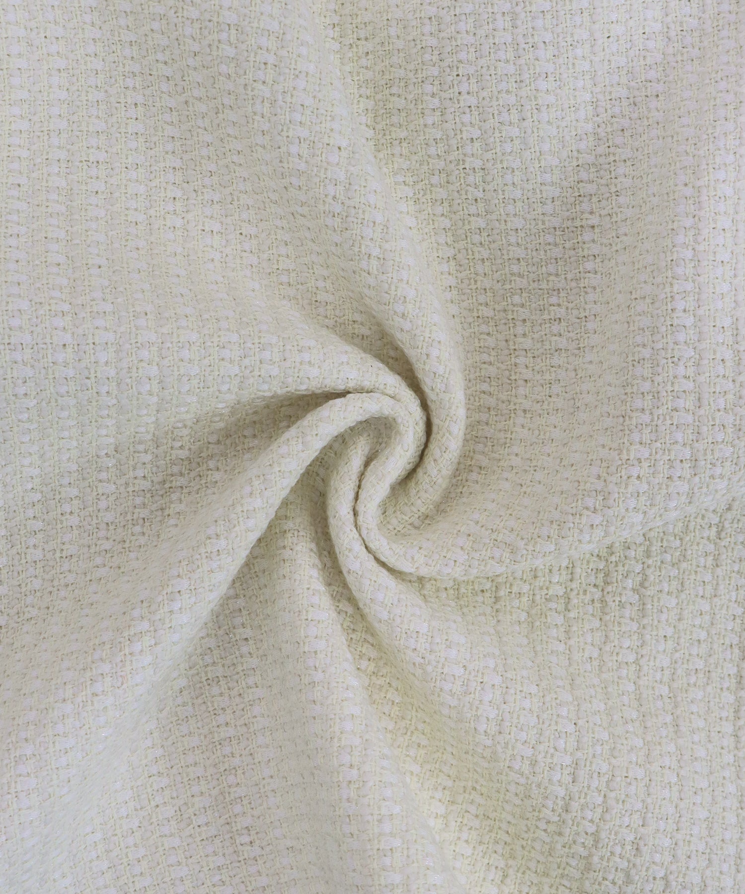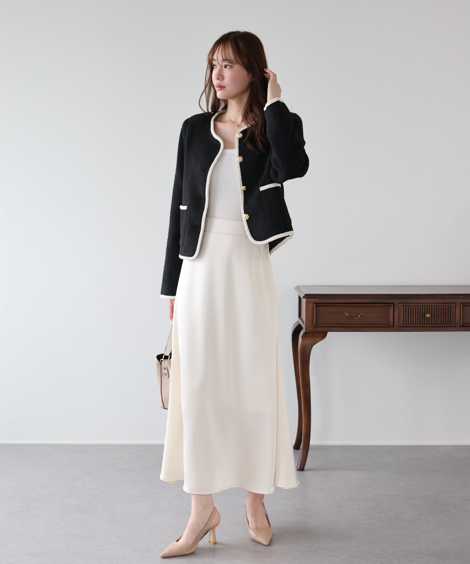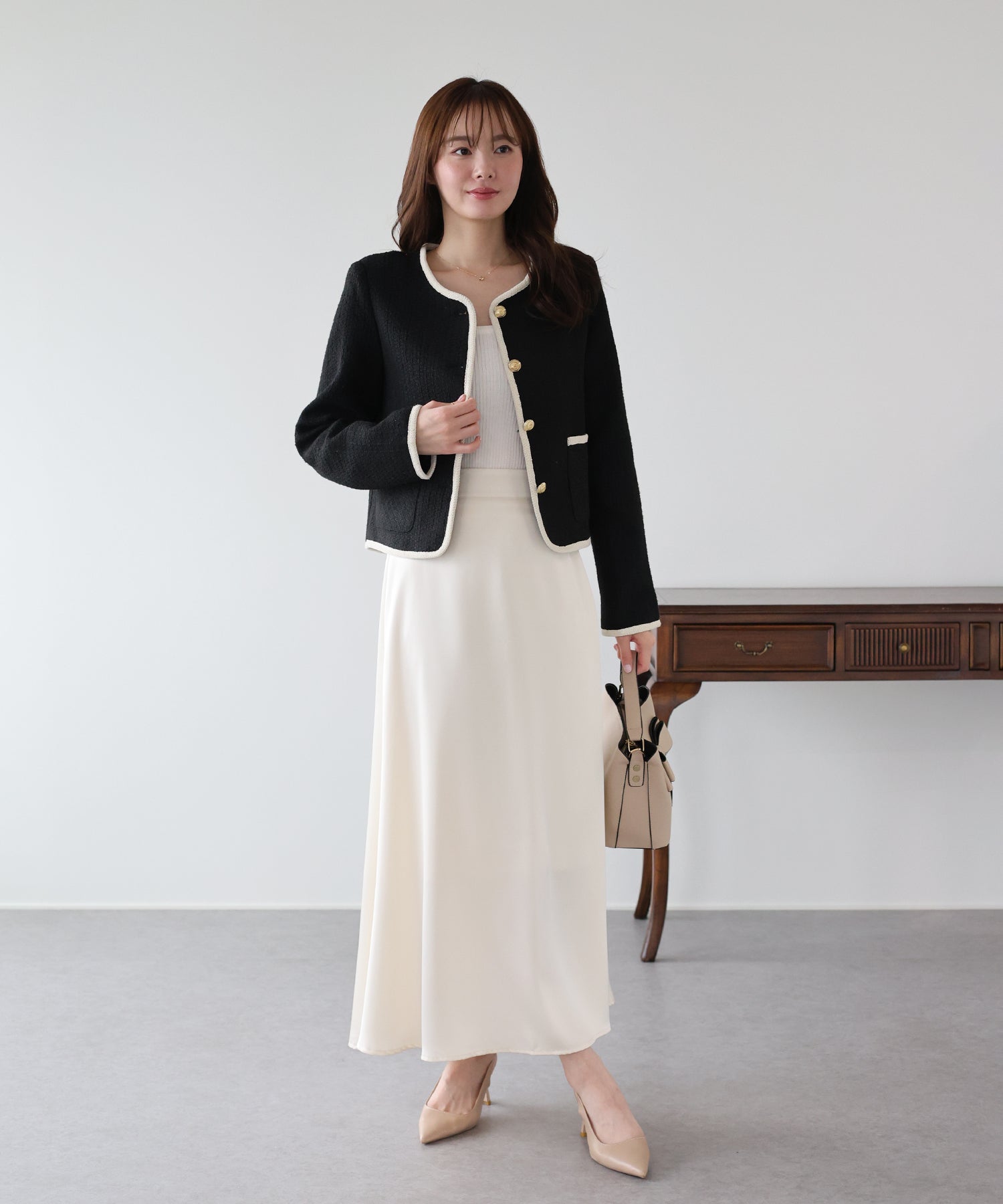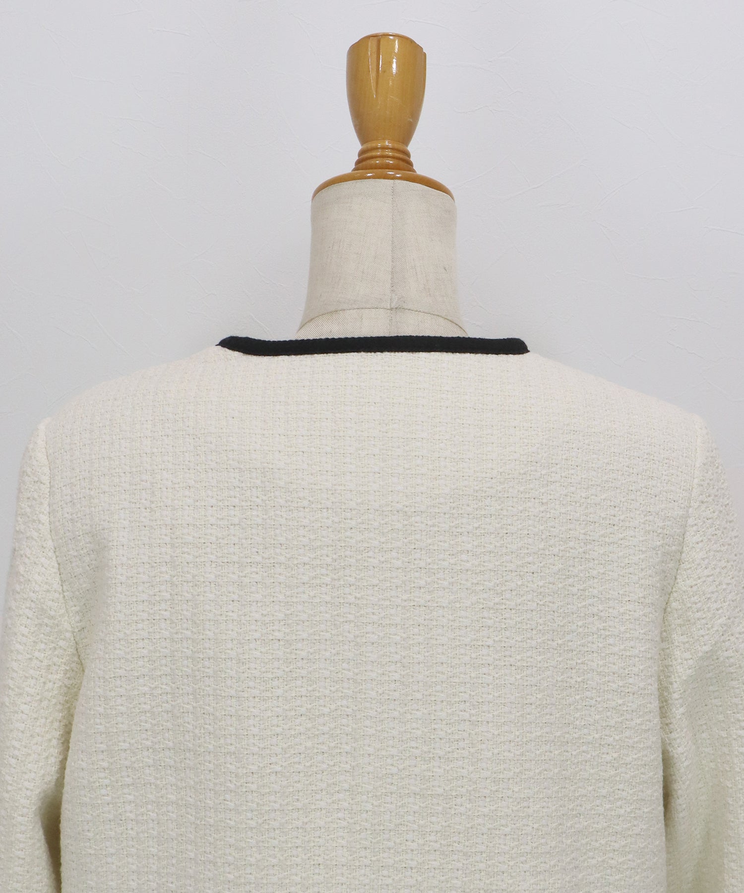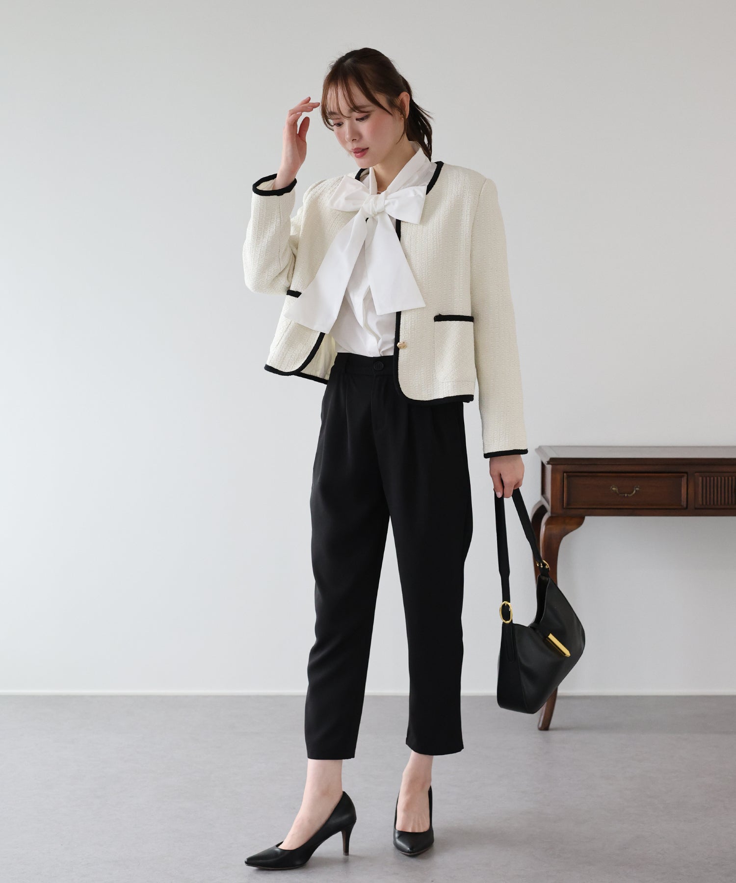 クラシカルなツイード素材に、配色のパイピングを効かせたトレンド感のあるノーカラージャケット。
