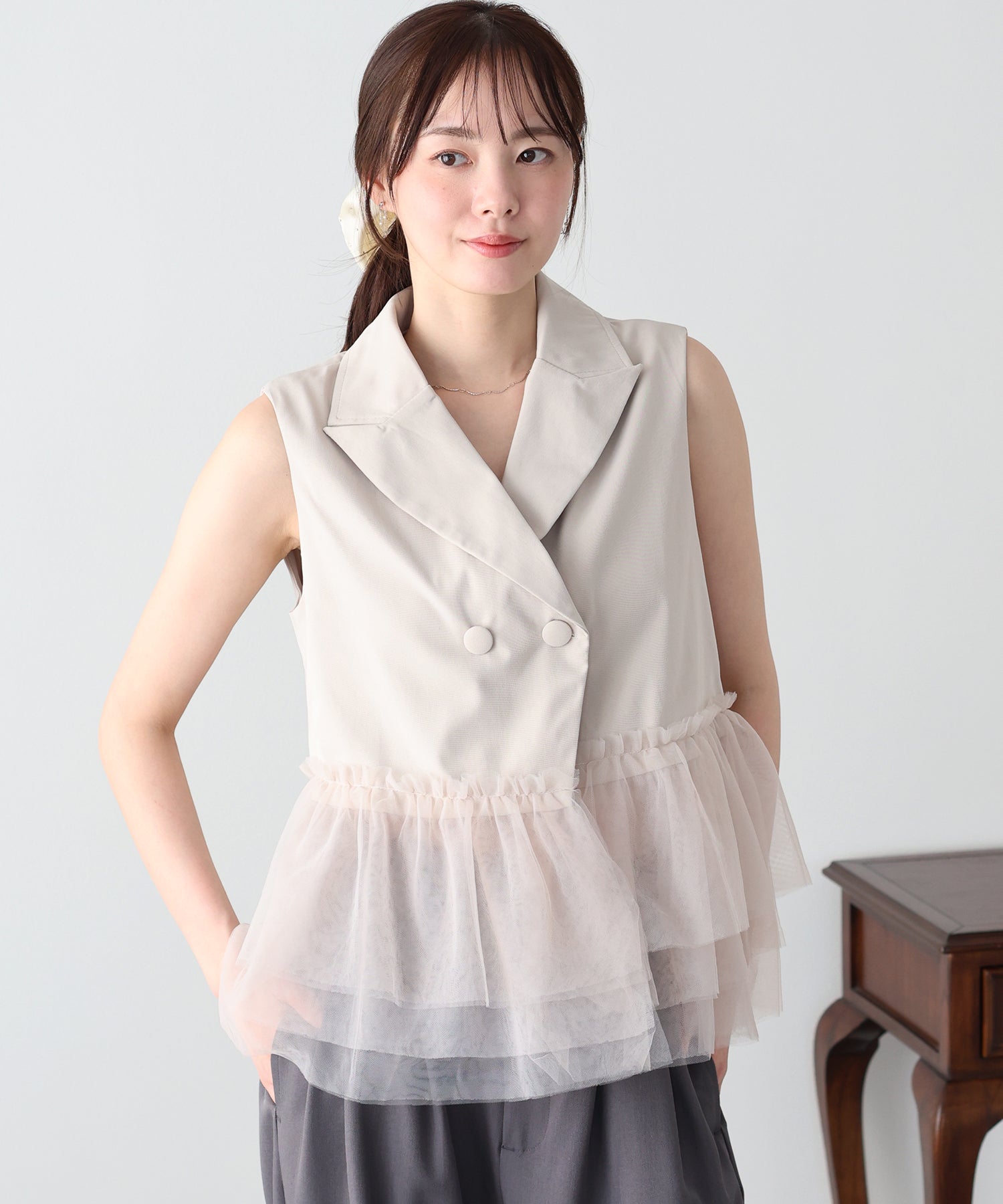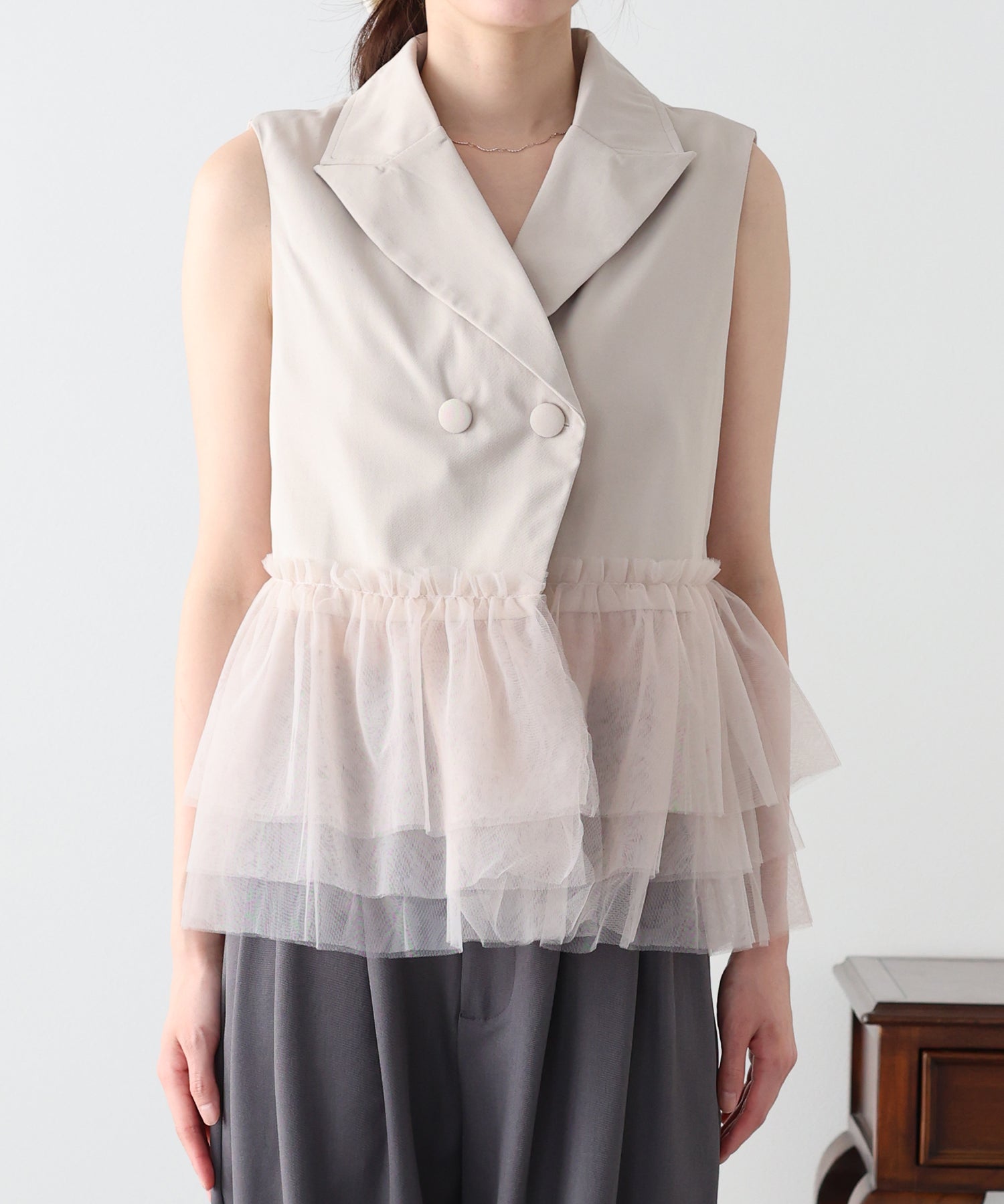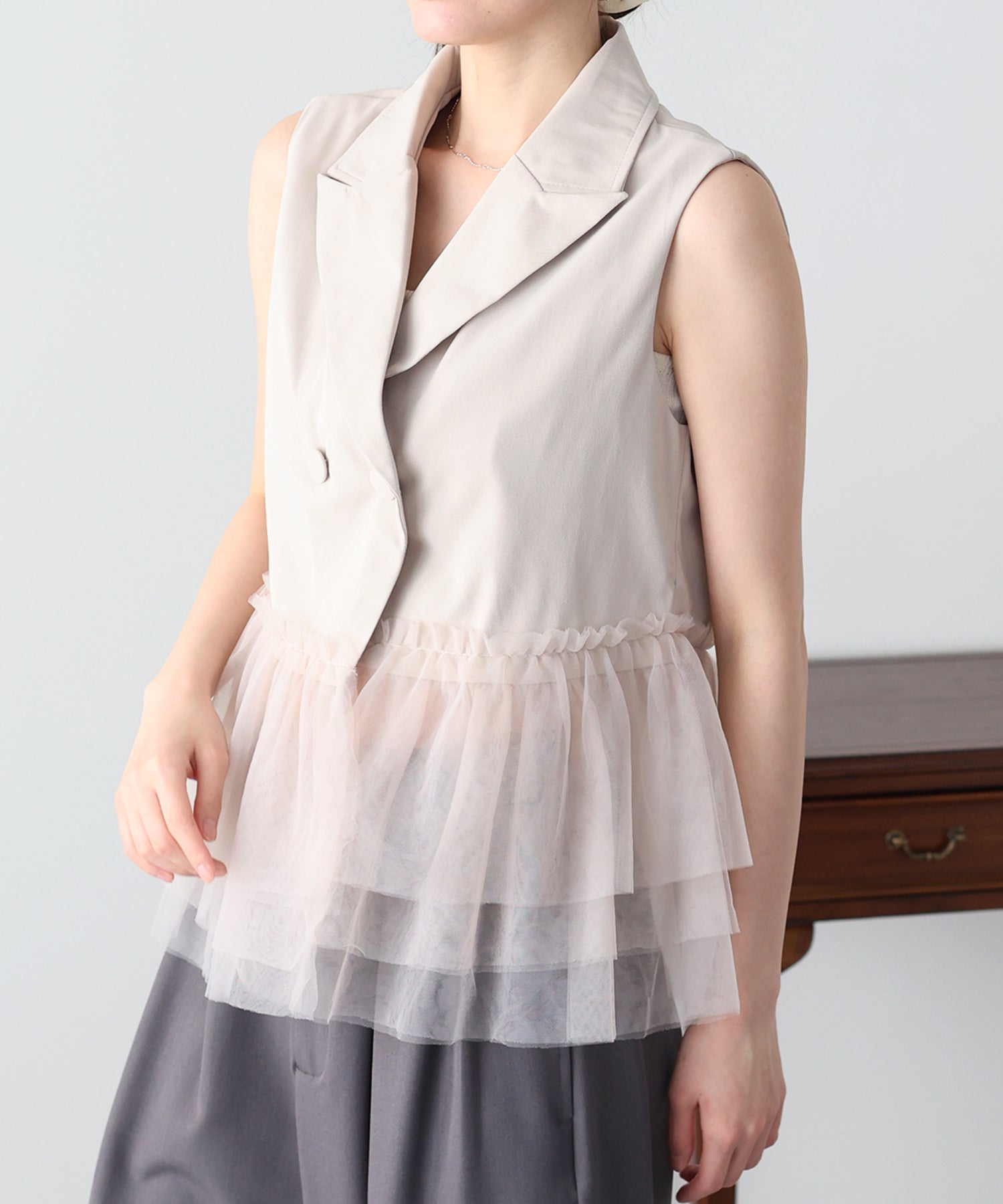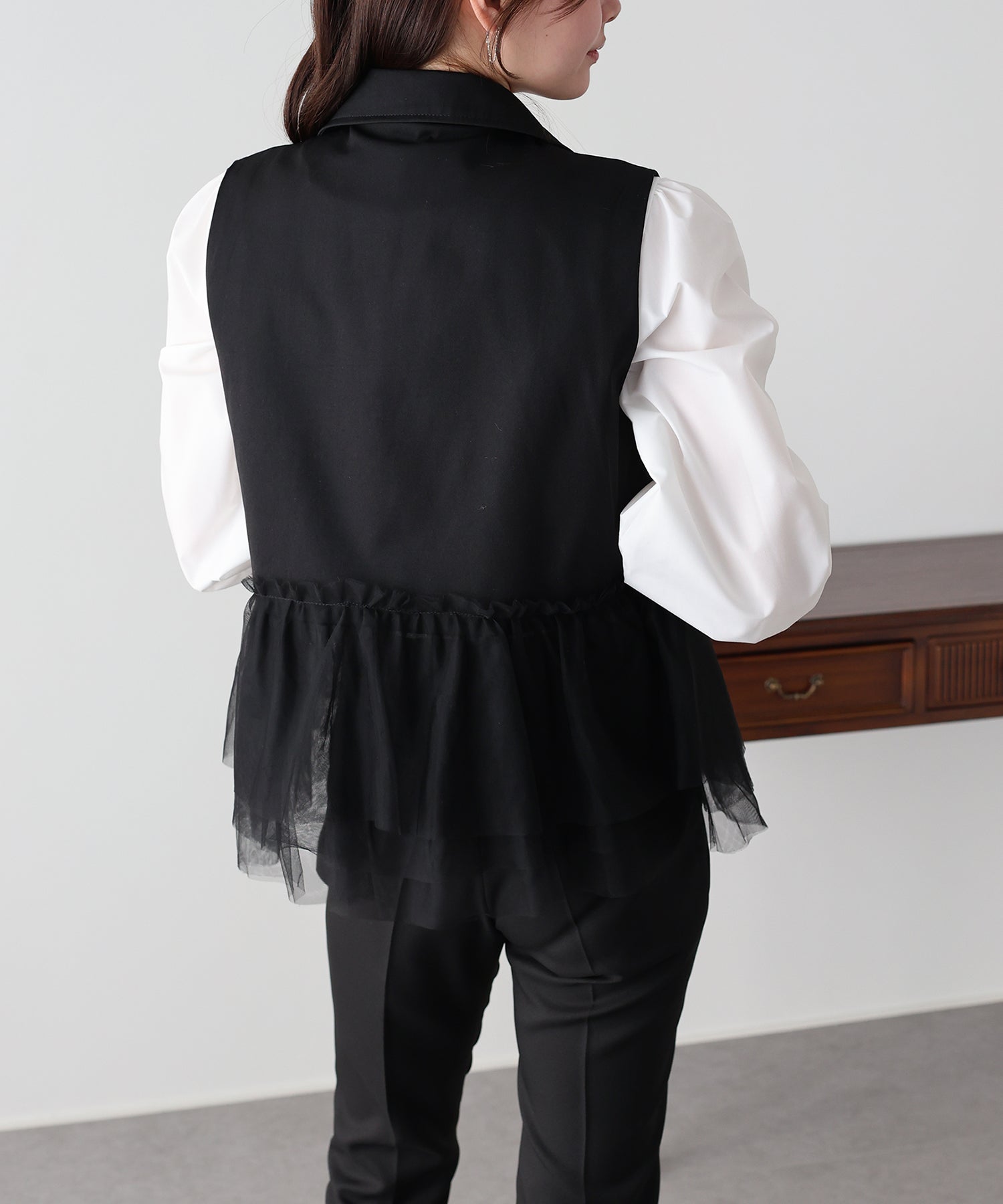 きれいめなテーラードベストとフェミニンなチュールを大胆にドッキングしたトレンドアイテム。