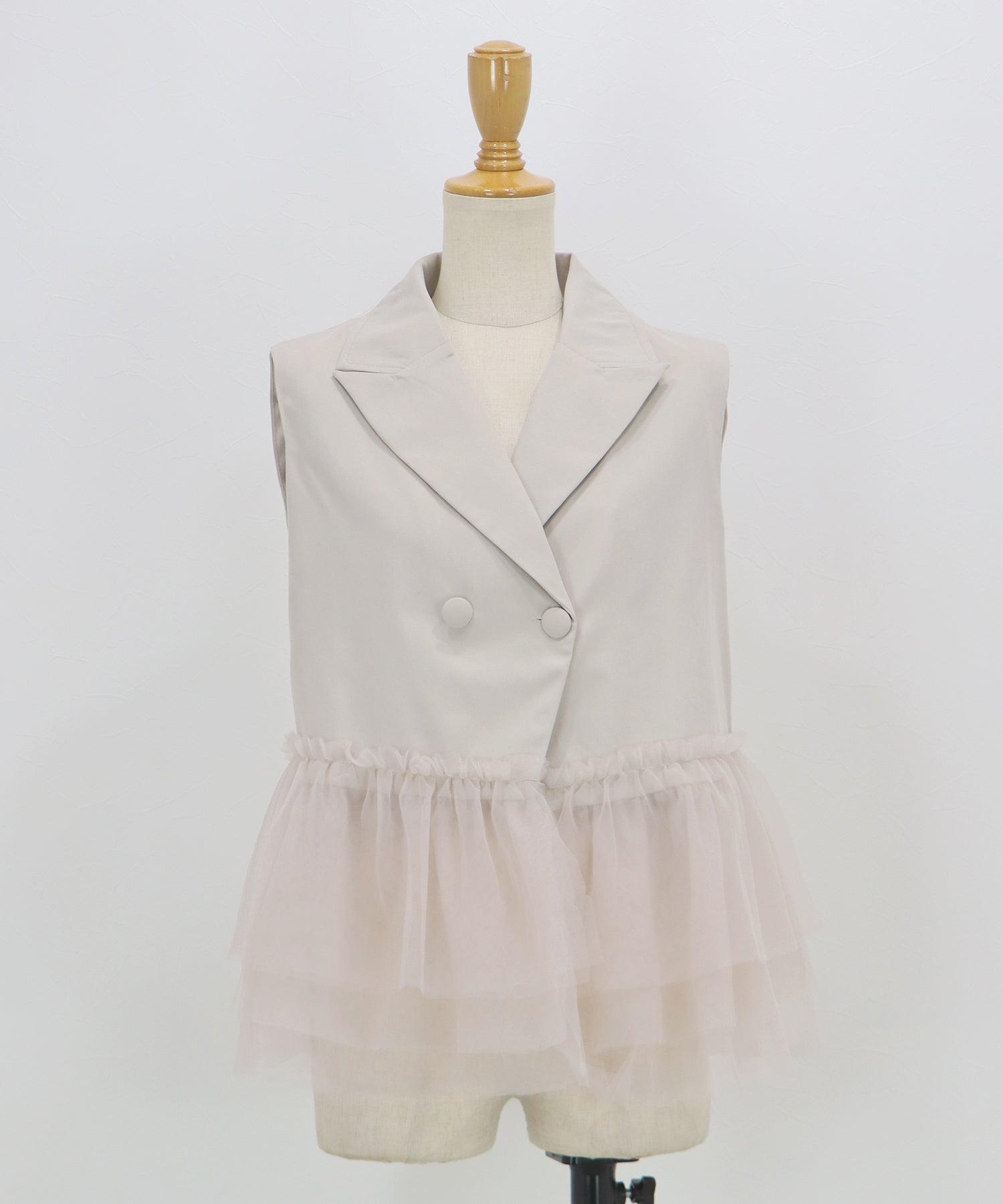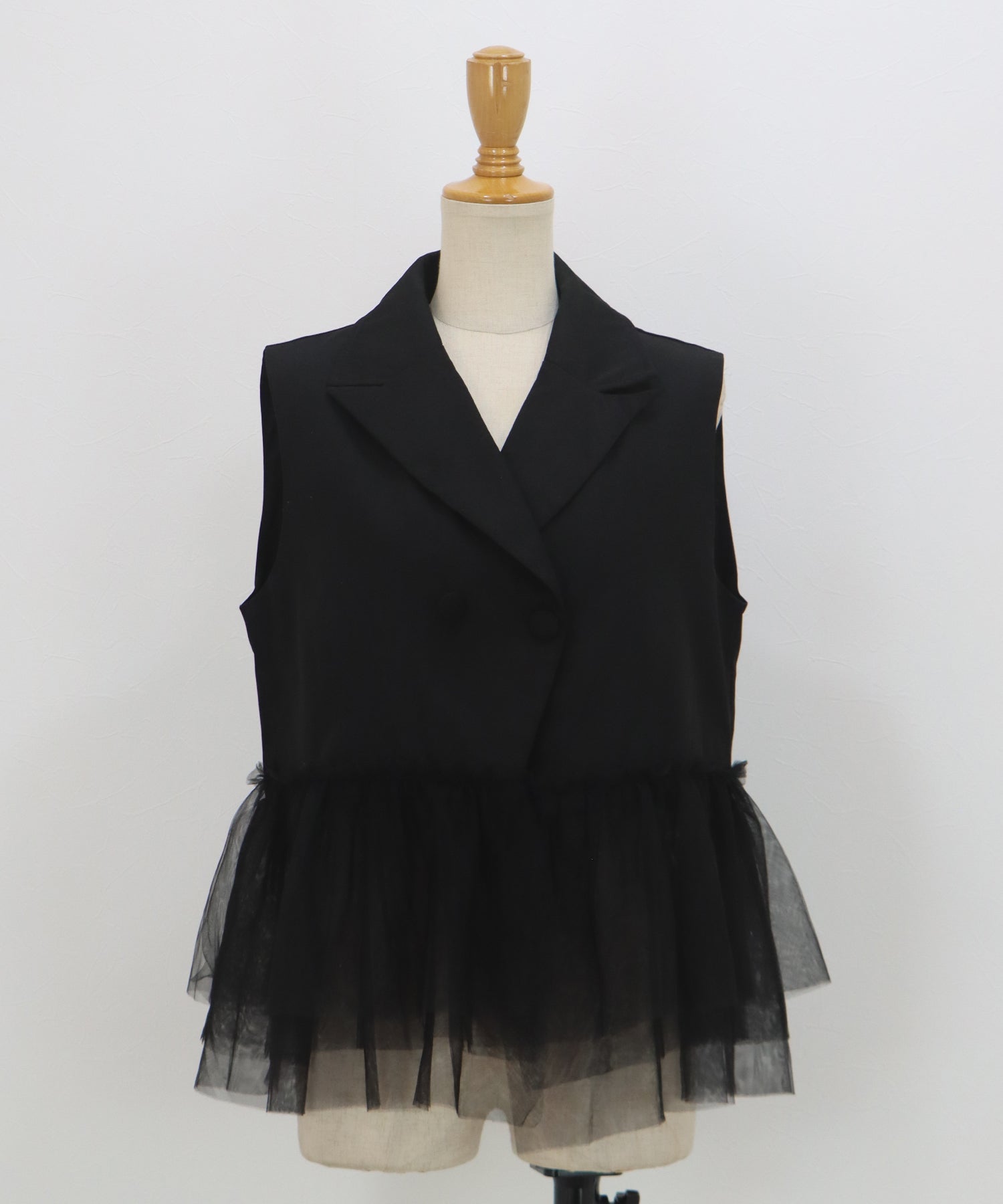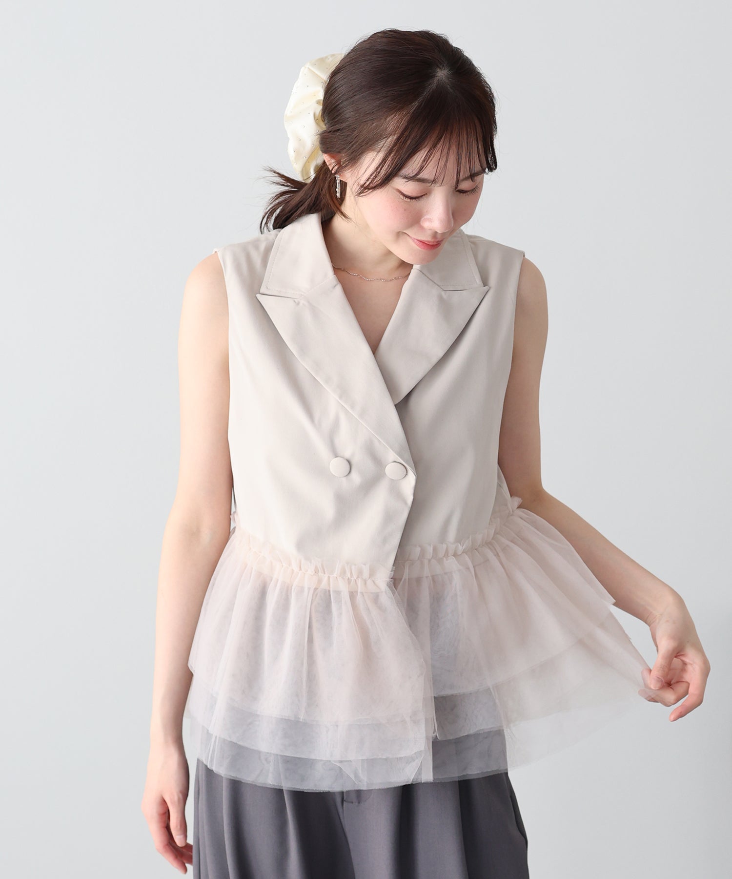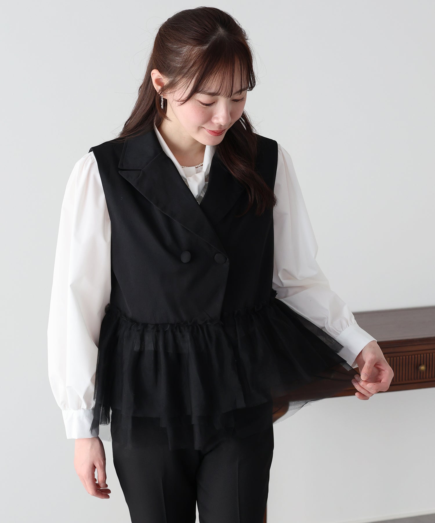 きれいめなテーラードベストとフェミニンなチュールを大胆にドッキングしたトレンドアイテム。