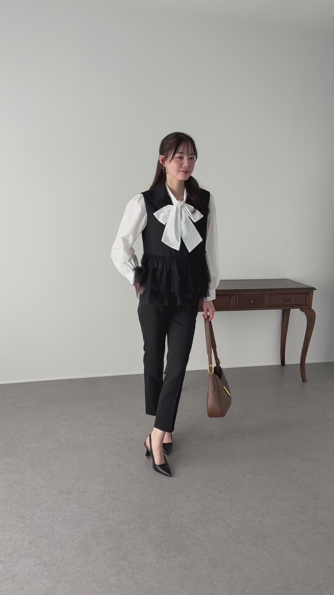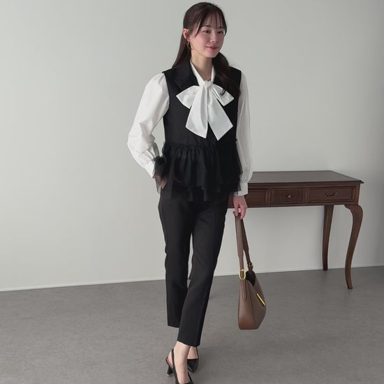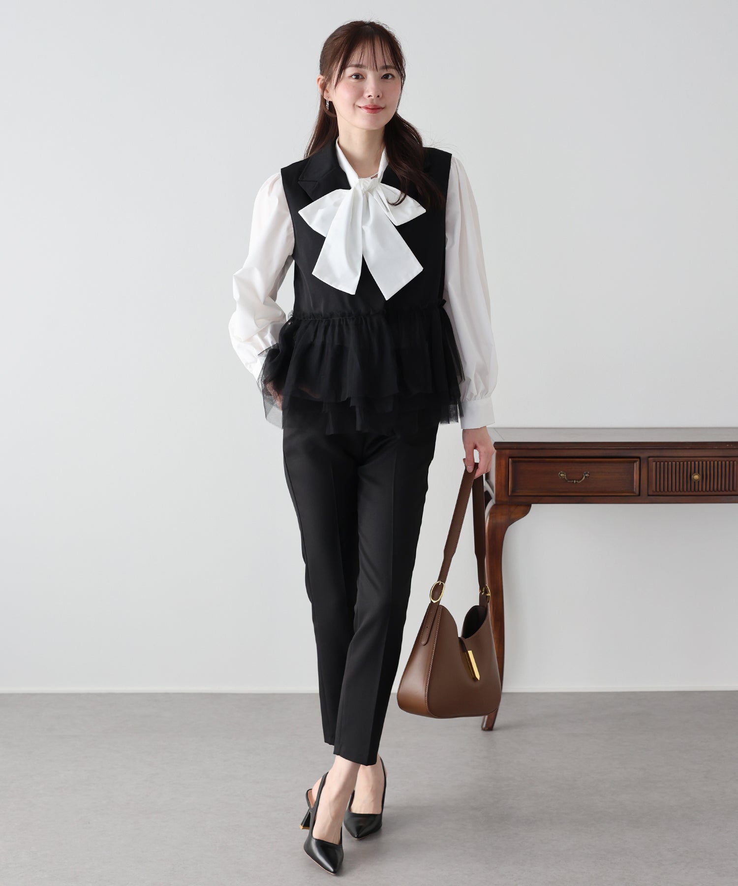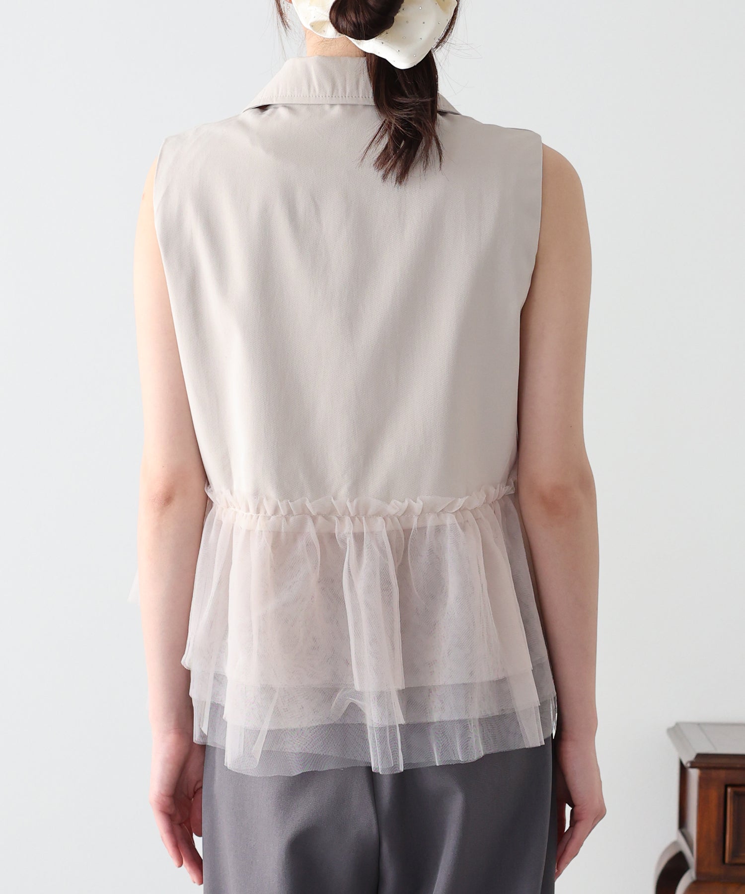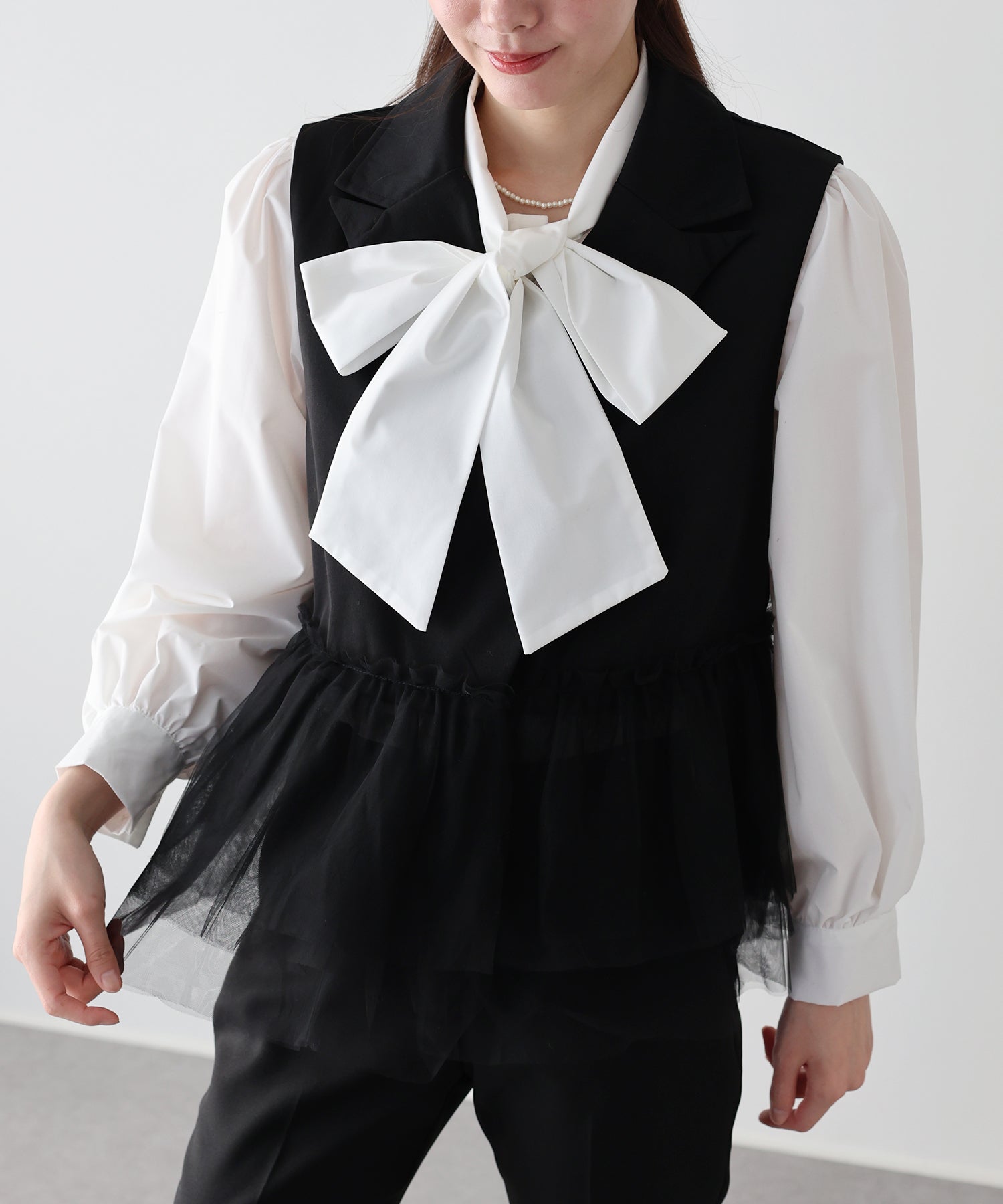 きれいめなテーラードベストとフェミニンなチュールを大胆にドッキングしたトレンドアイテム。