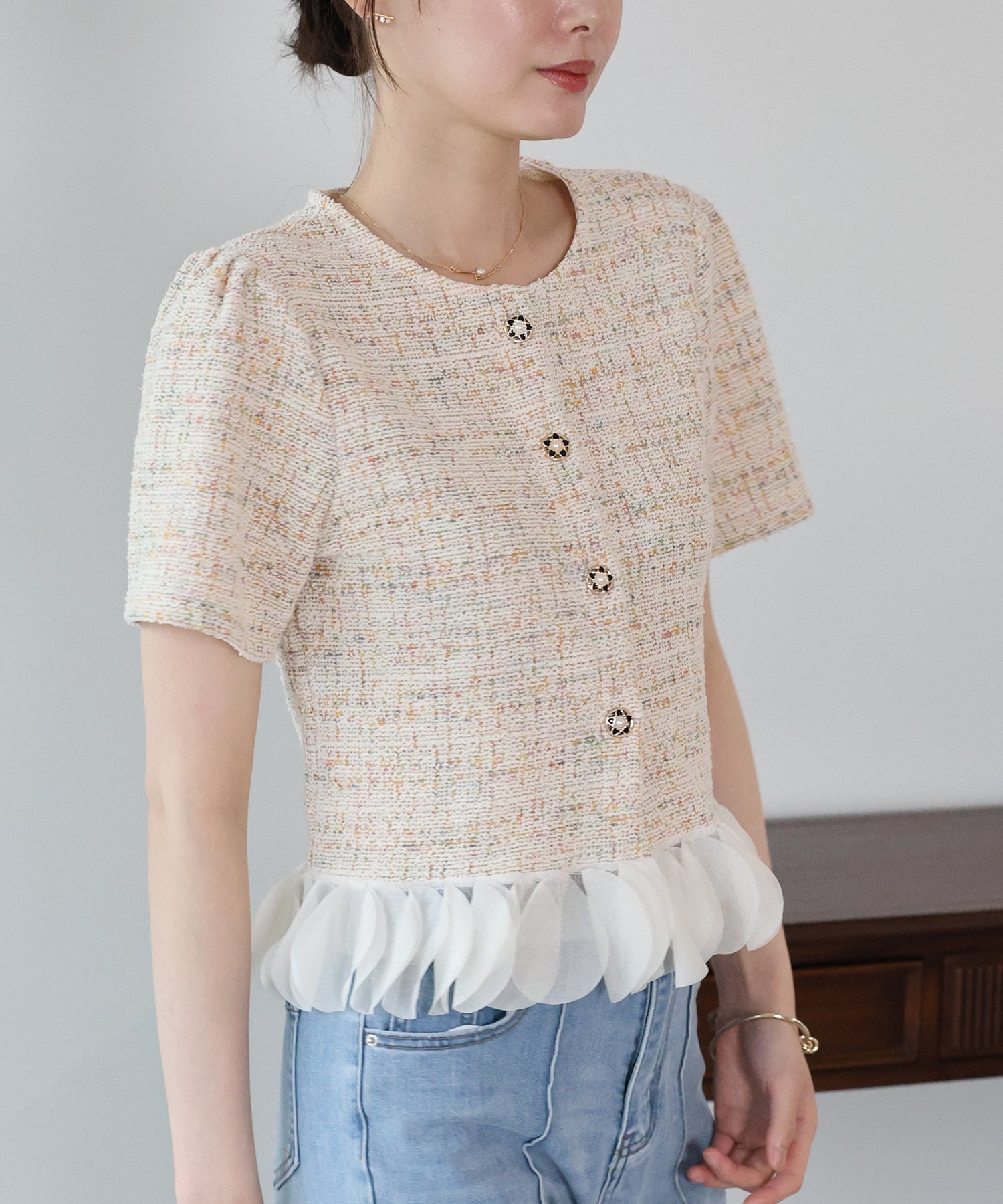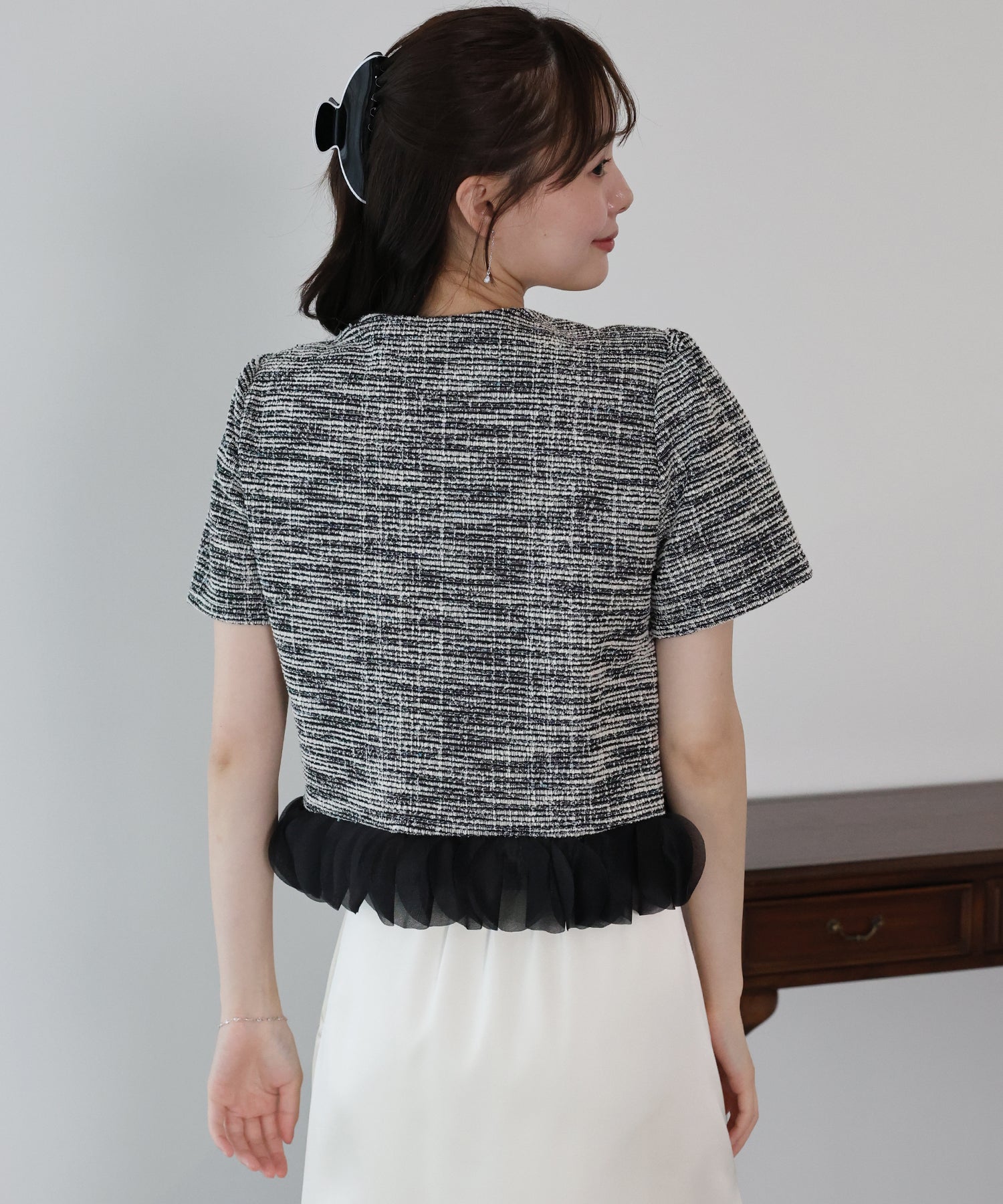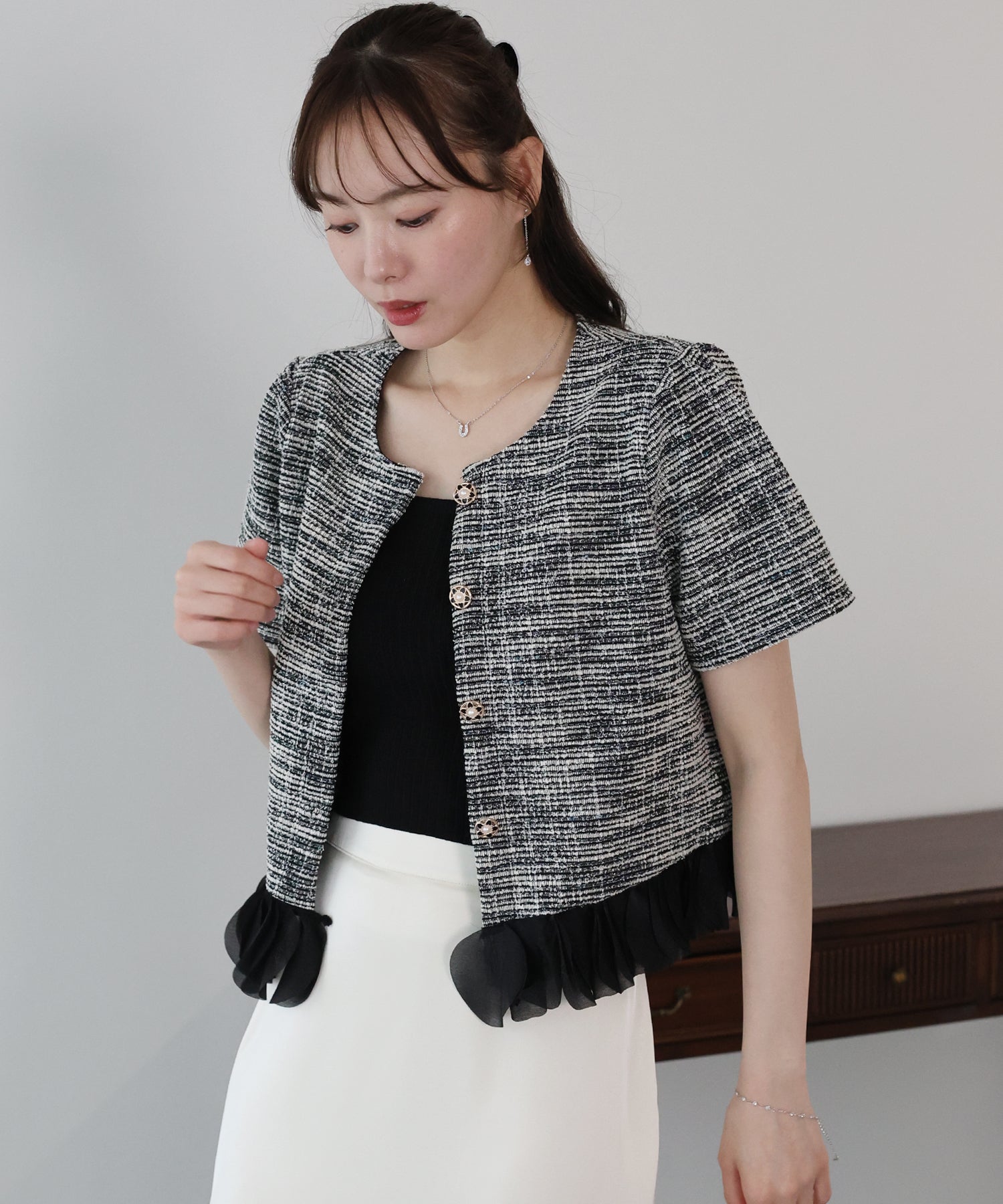 きちんと感×エレガントなフリルドッキング半袖ツイードジャケット