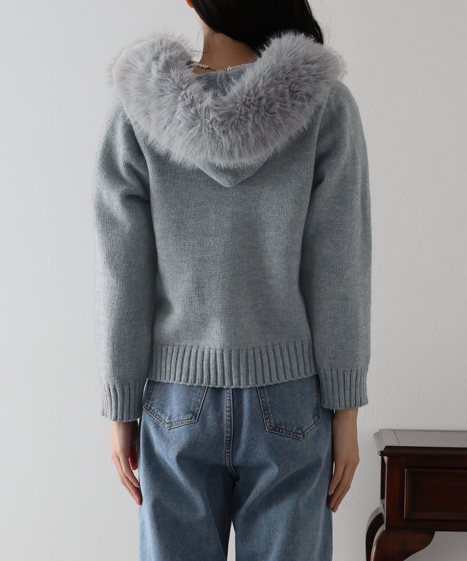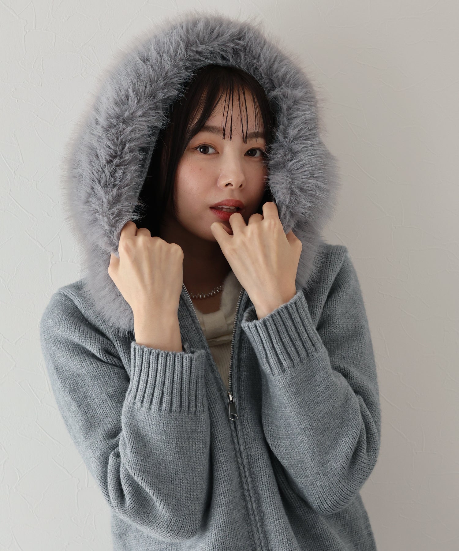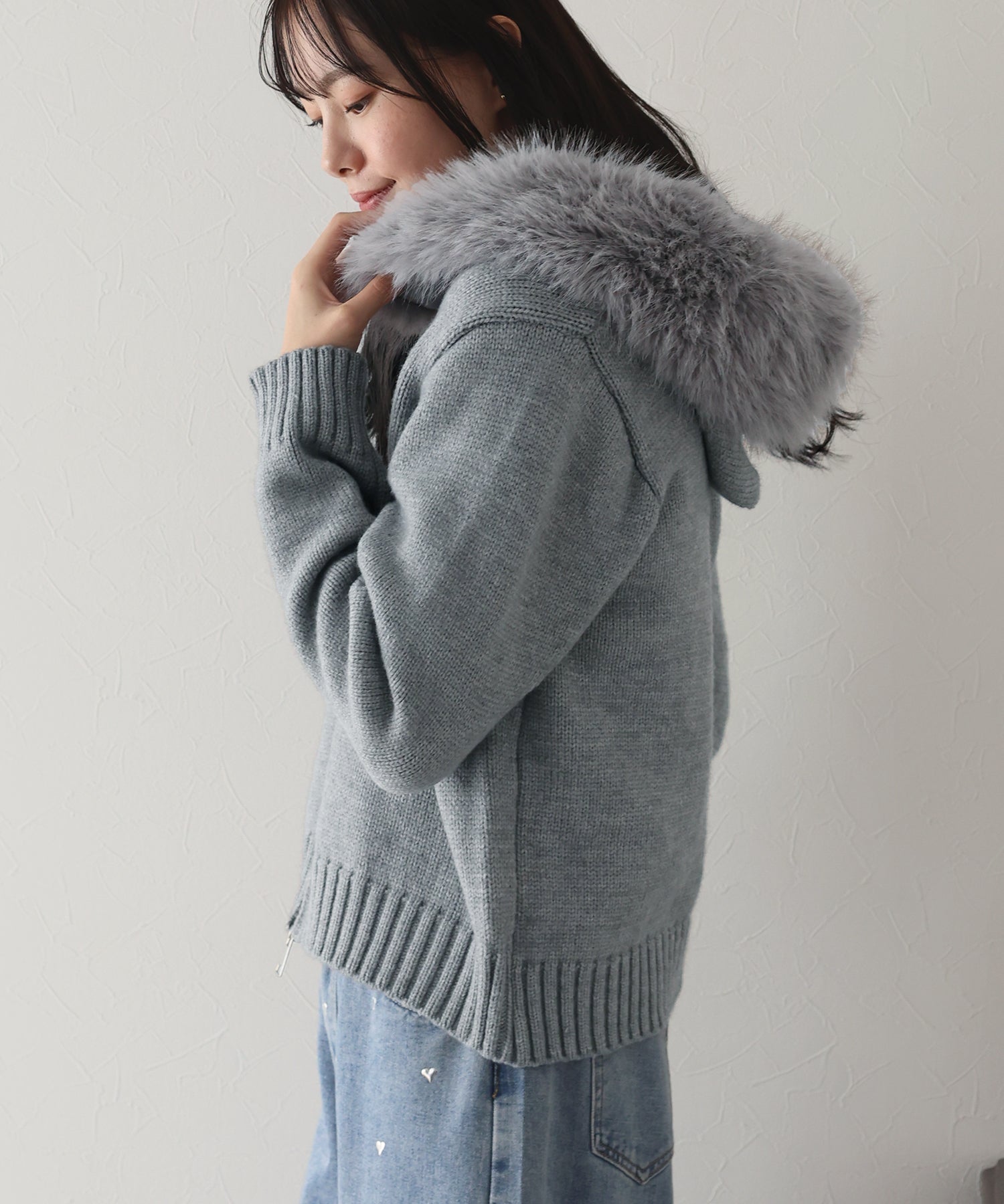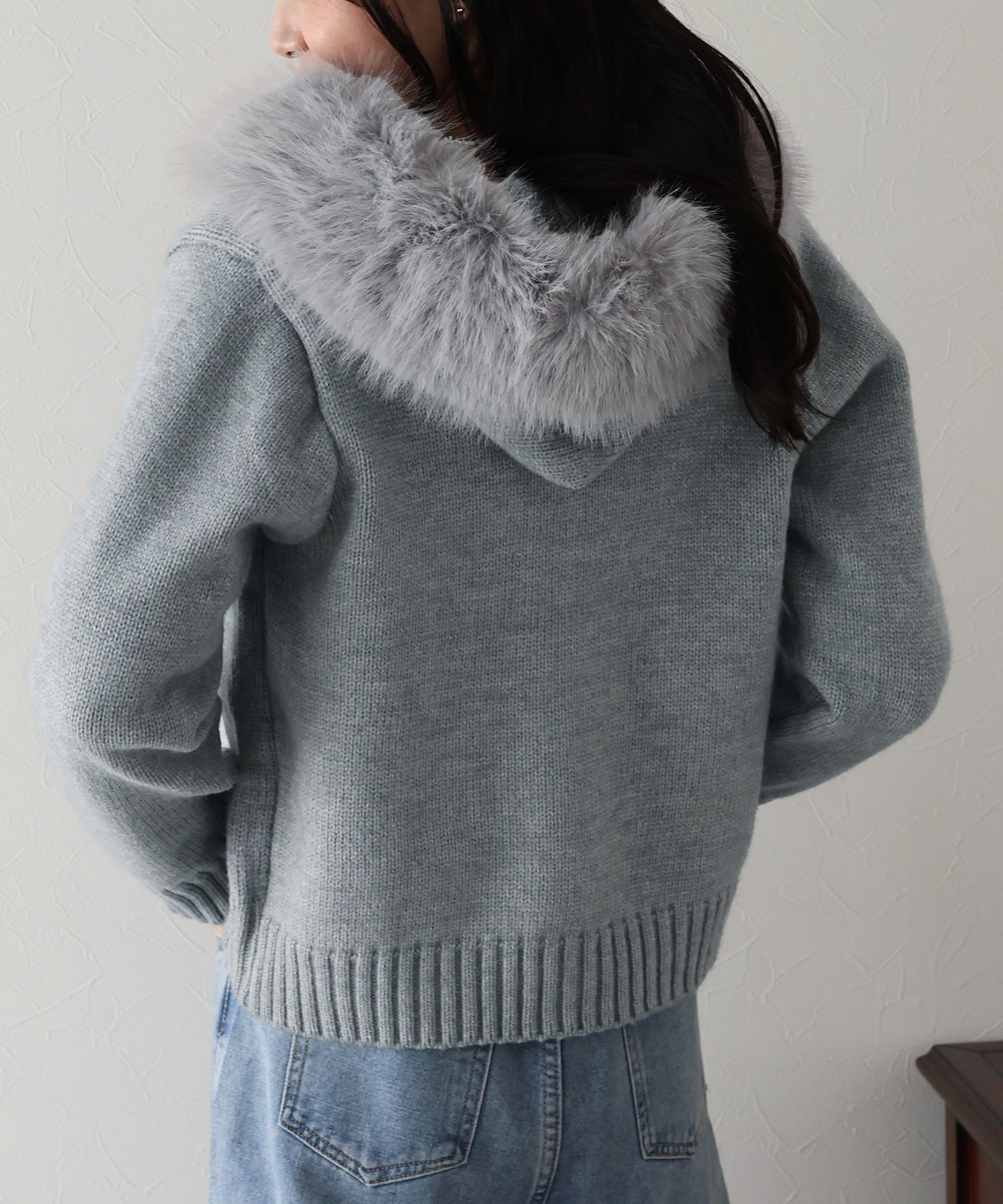 ファーがかわいらしく暖かみのあるニットフーディ。