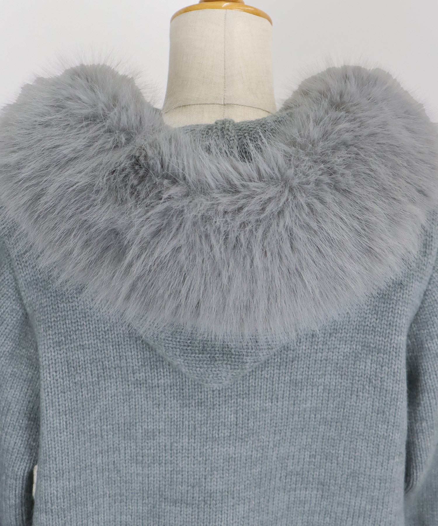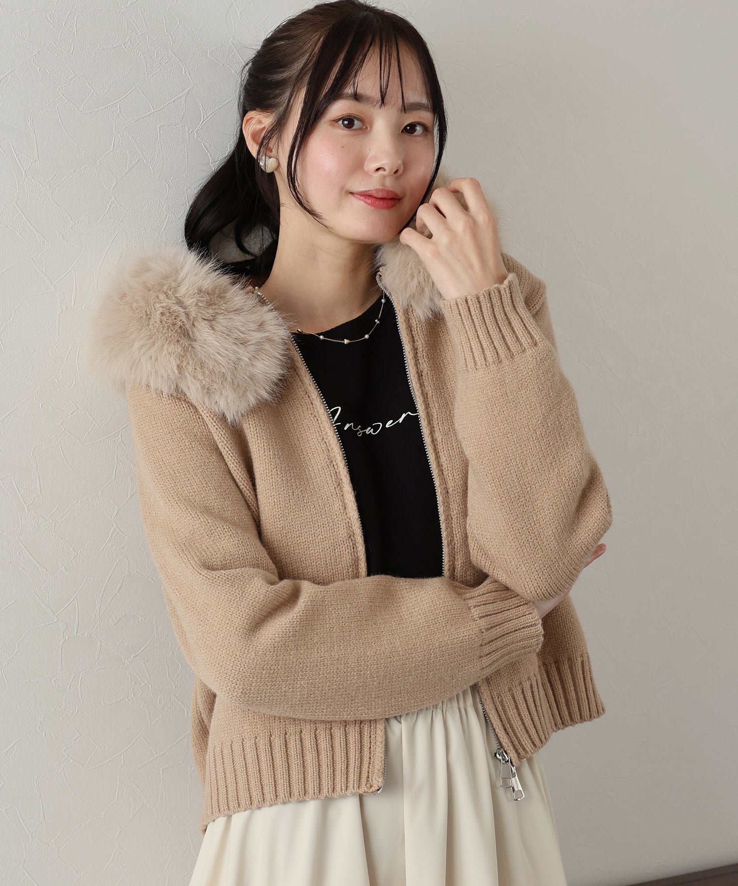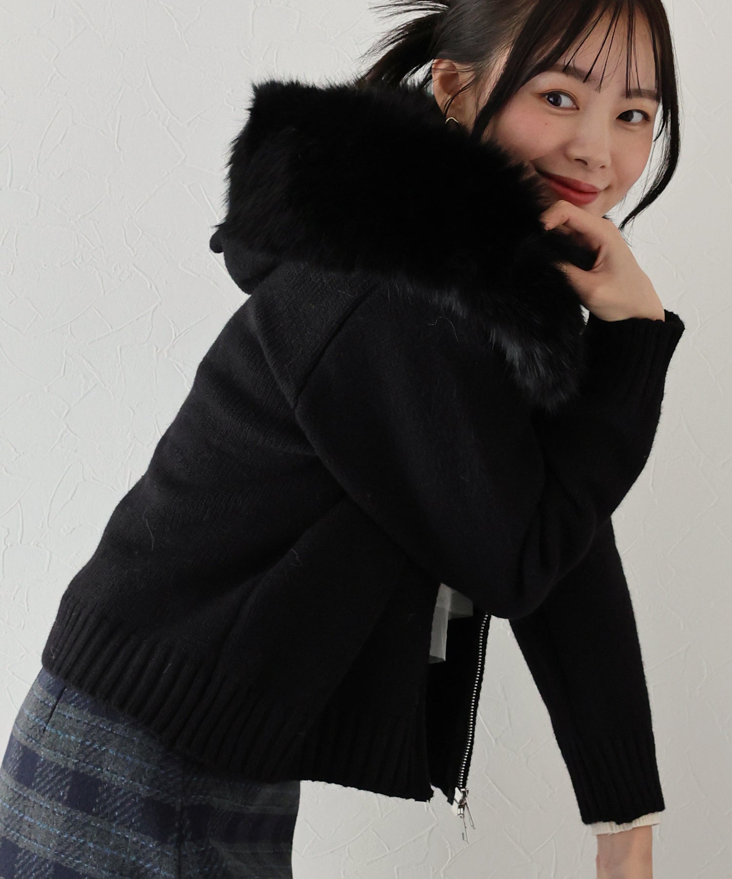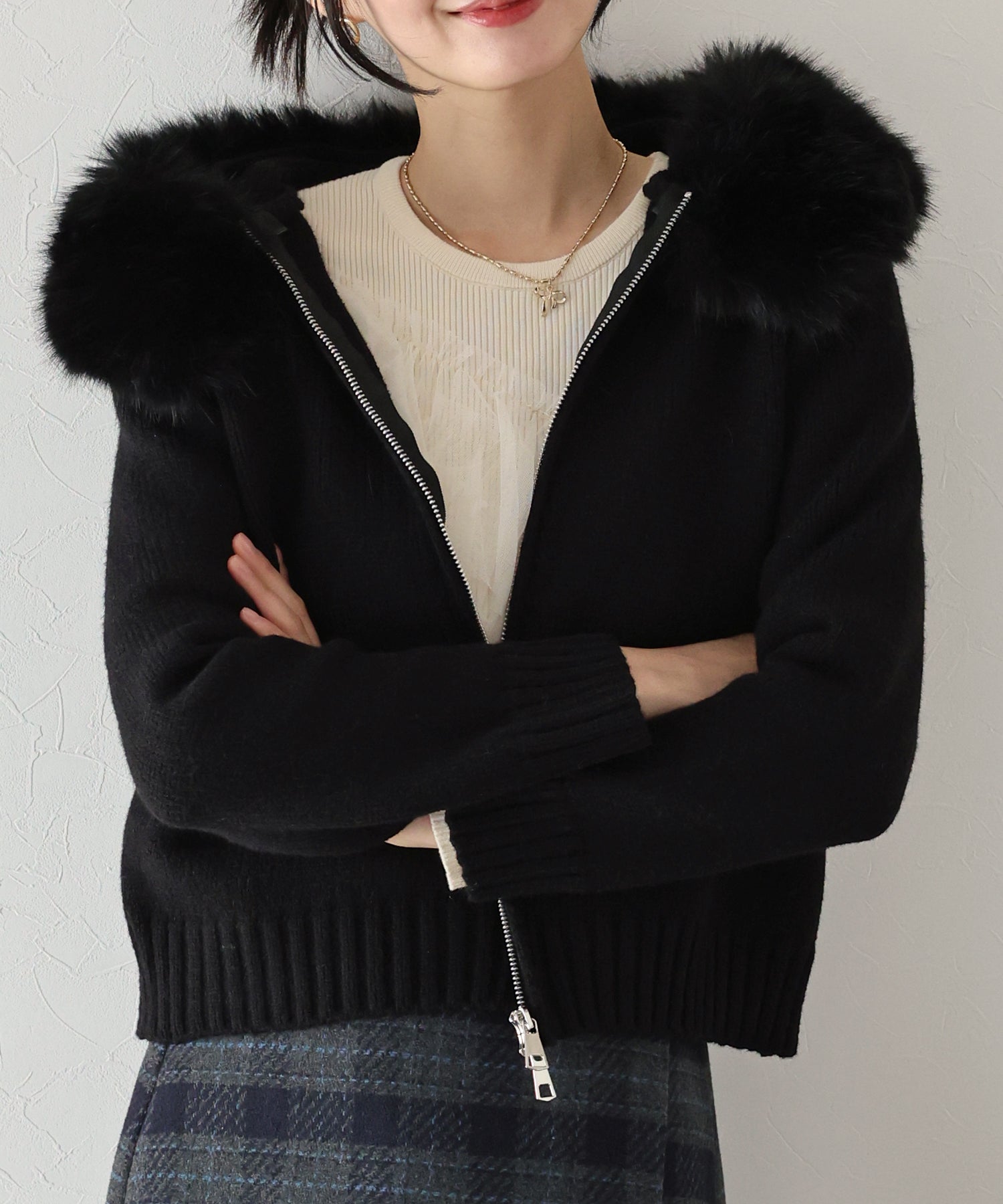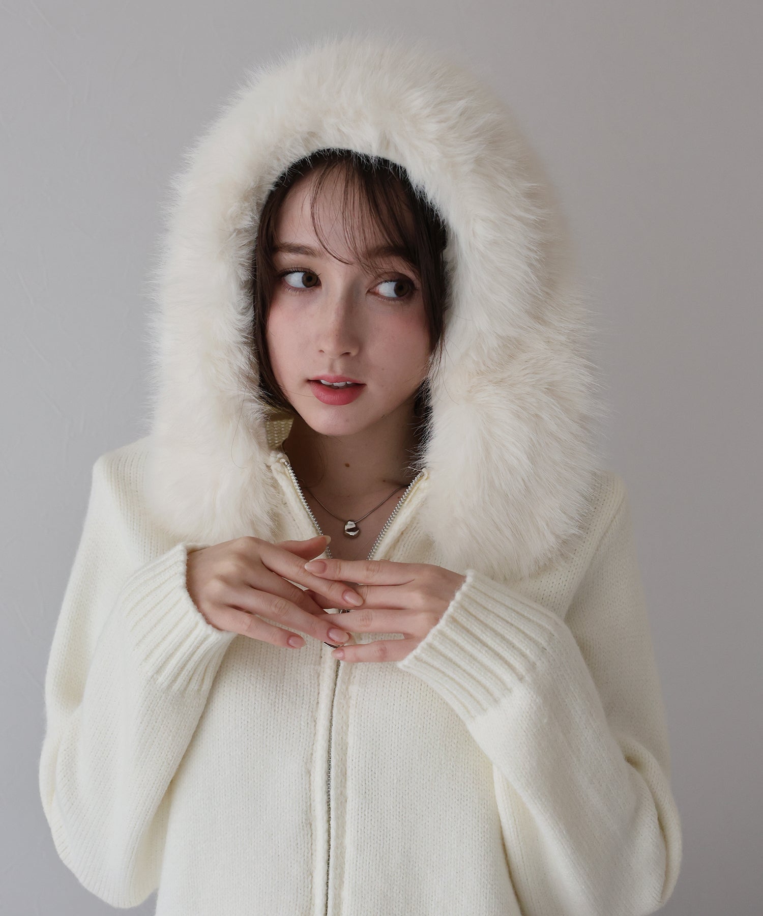 ファーがかわいらしく暖かみのあるニットフーディ。