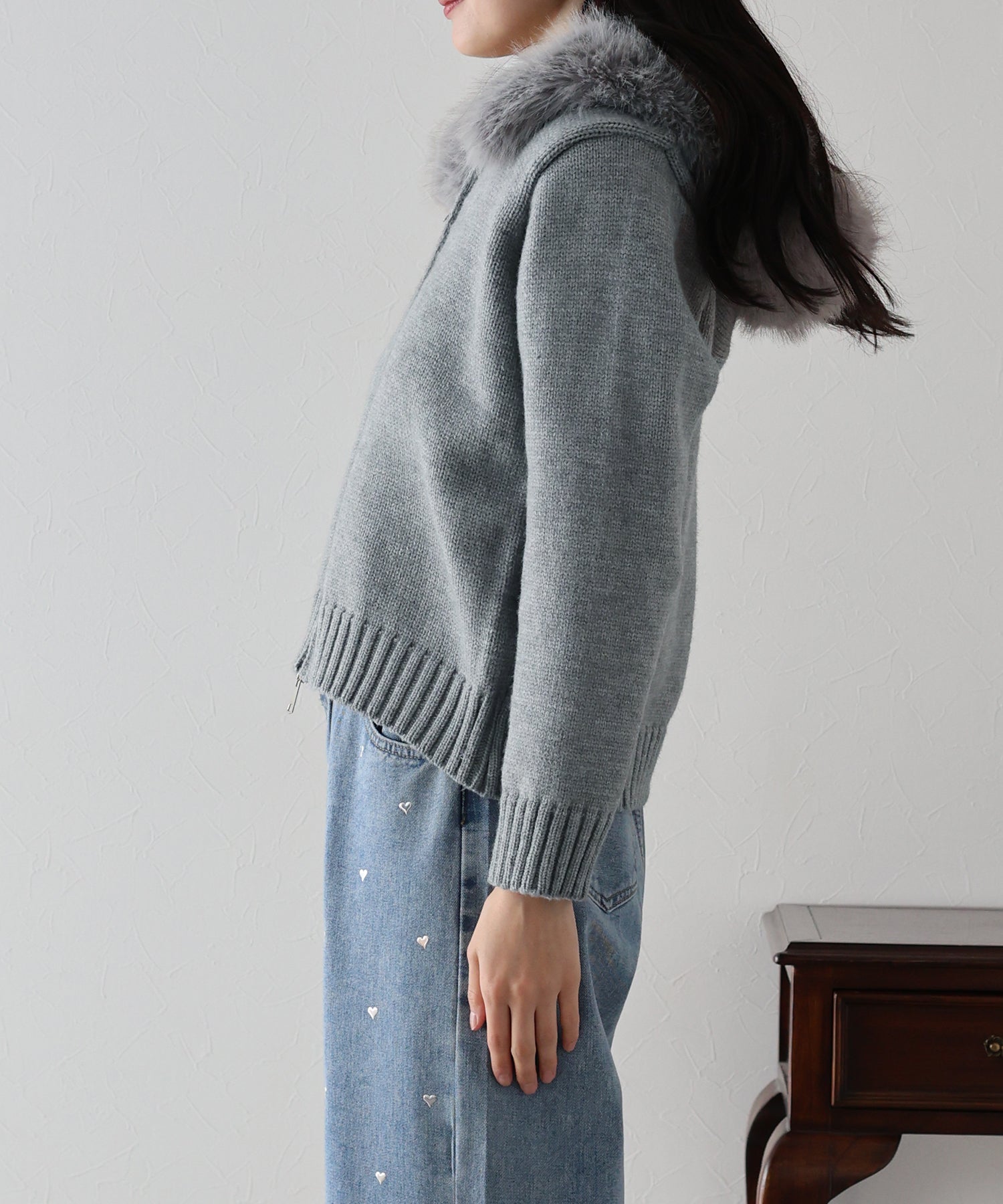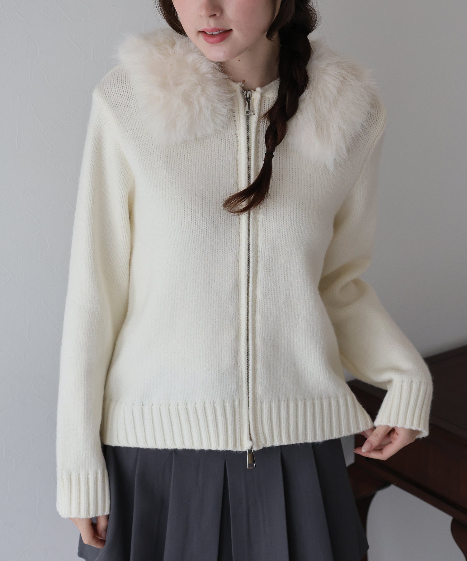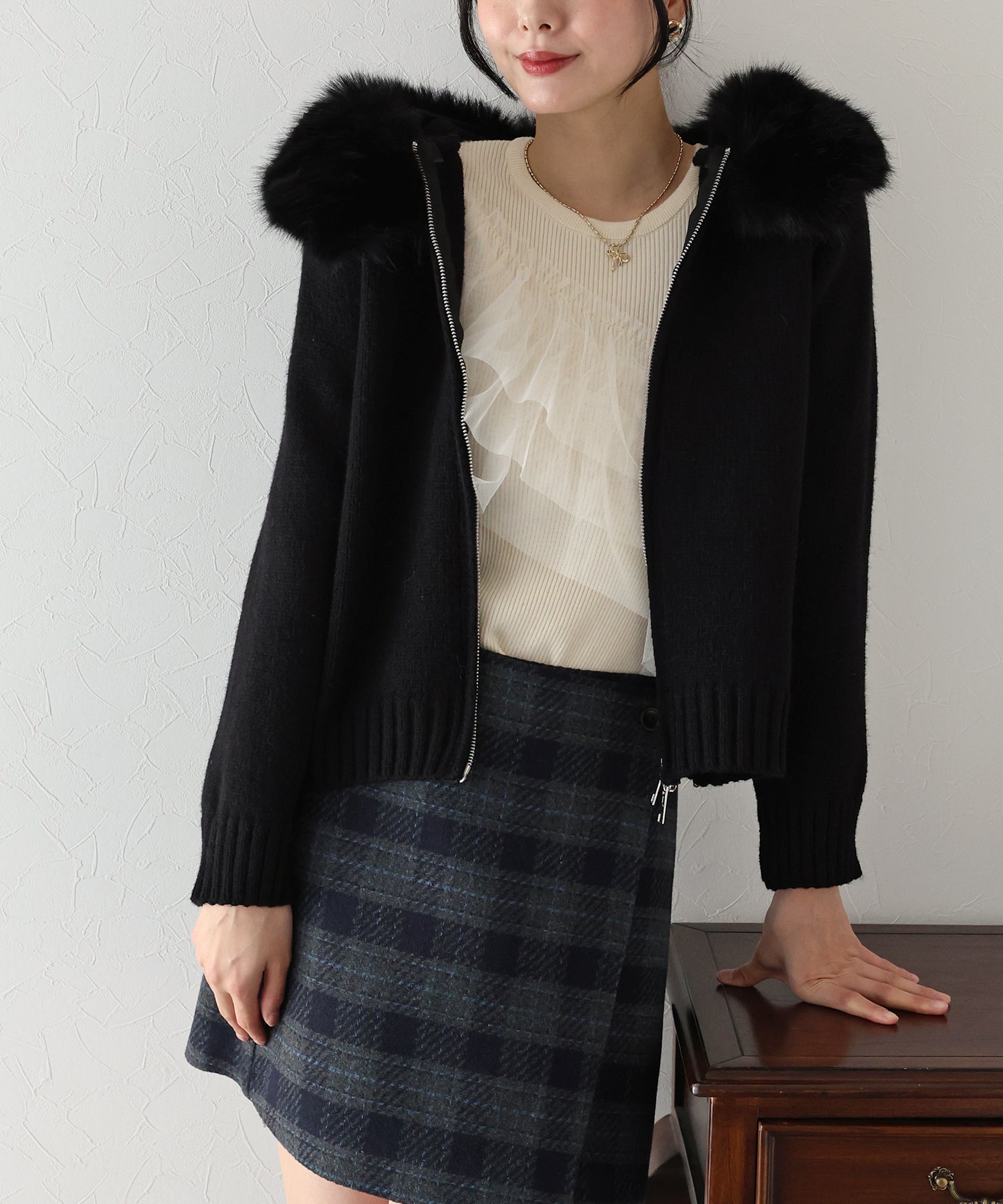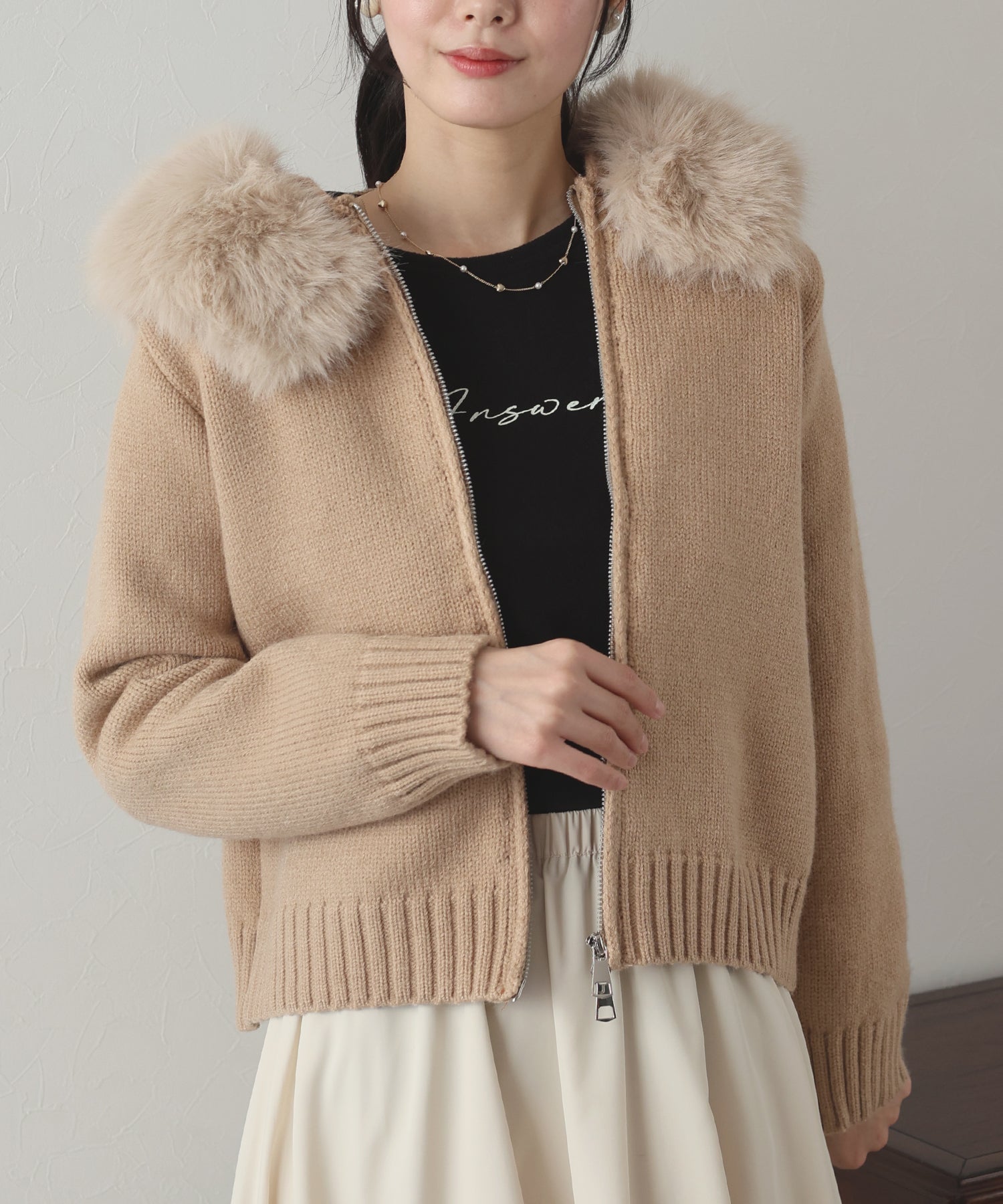 ファーがかわいらしく暖かみのあるニットフーディ。