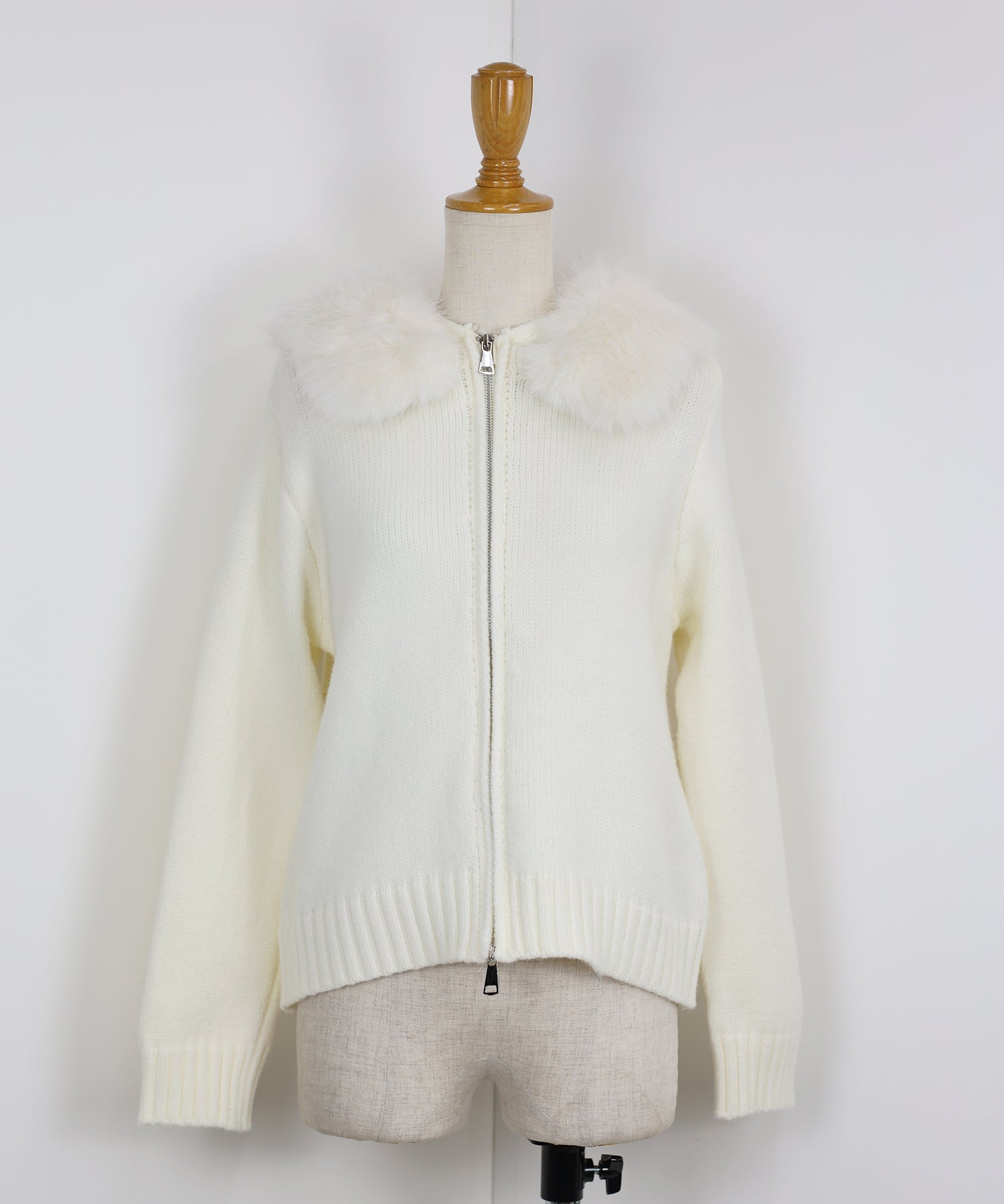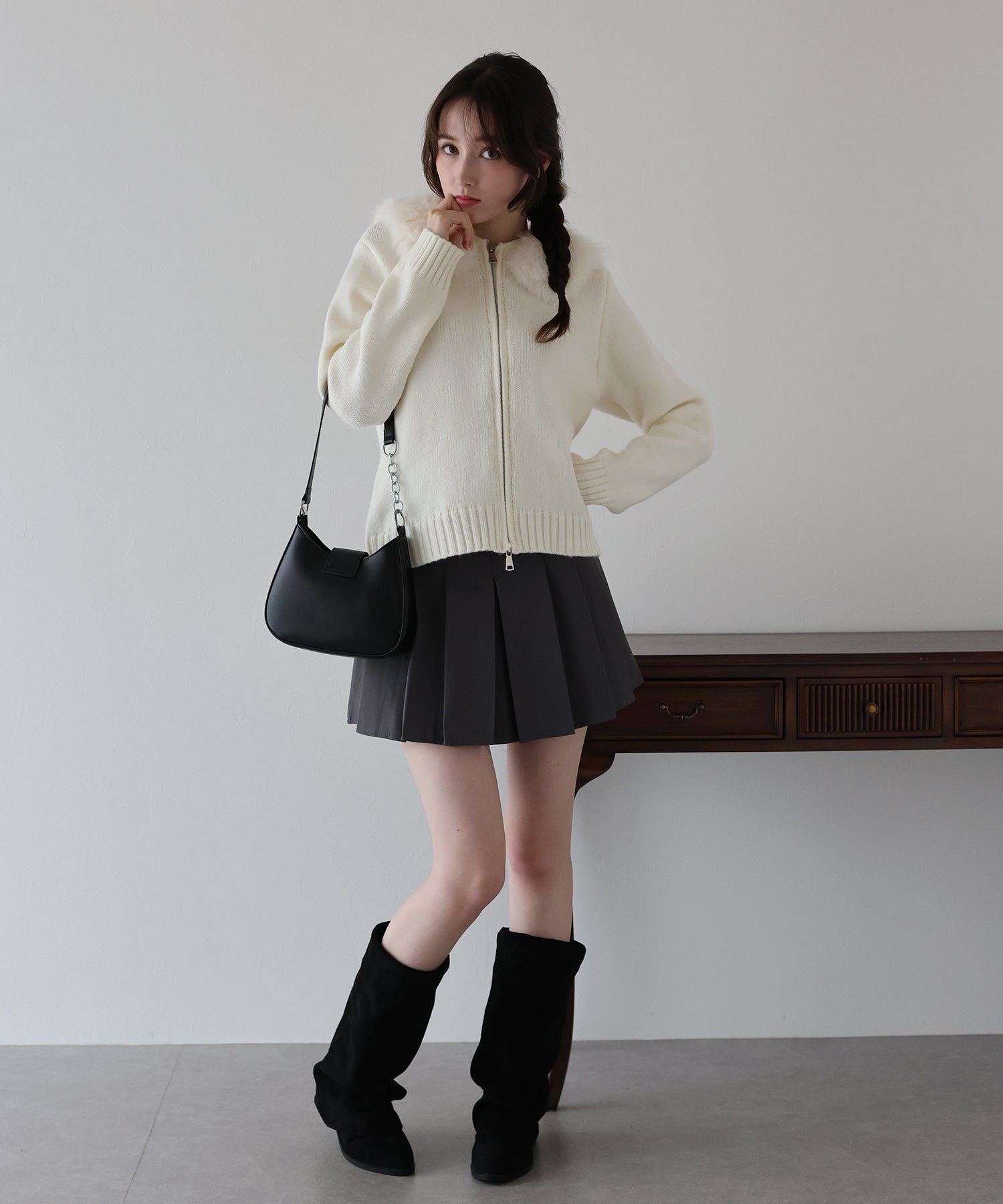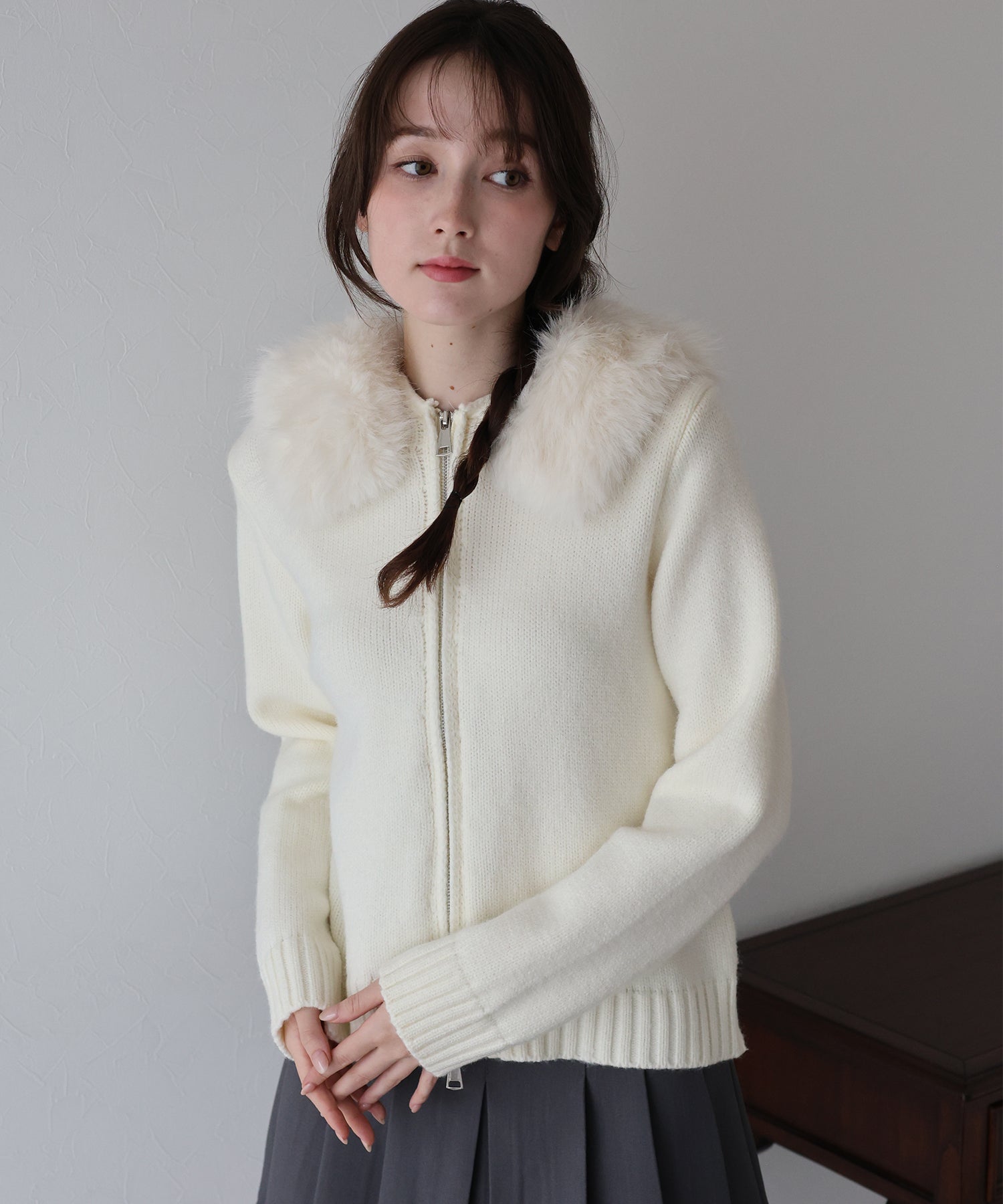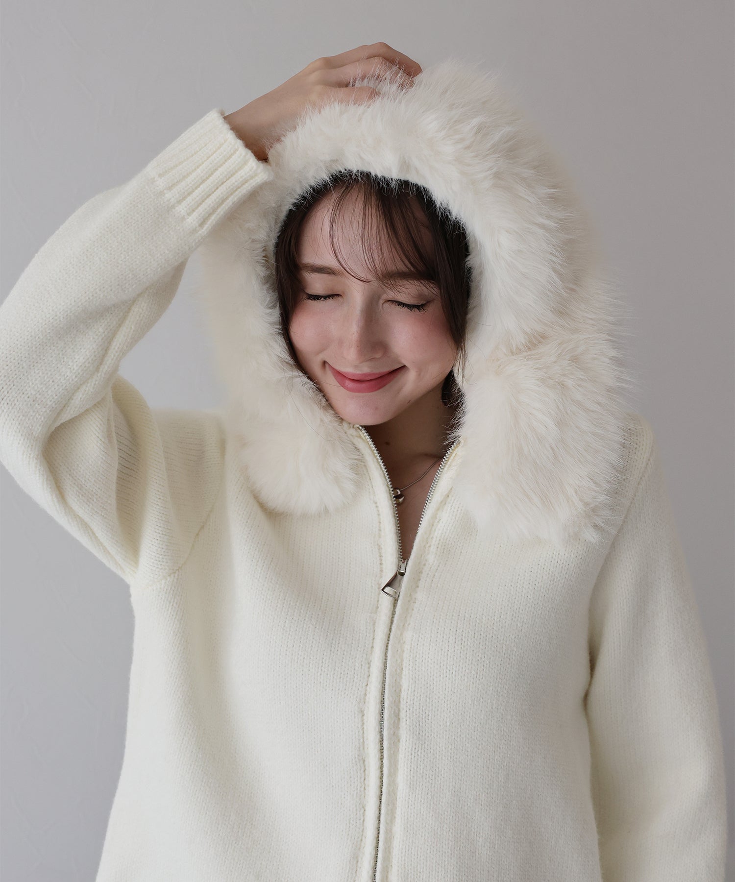 ファーがかわいらしく暖かみのあるニットフーディ。