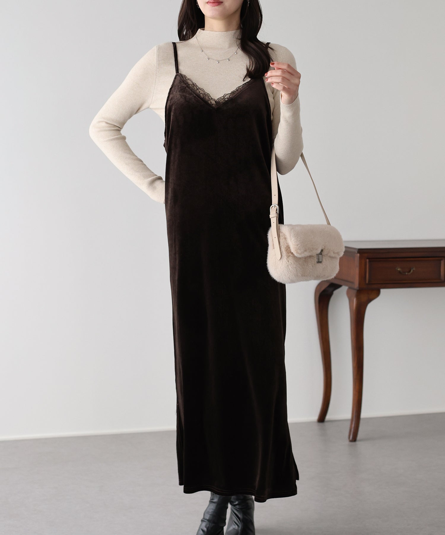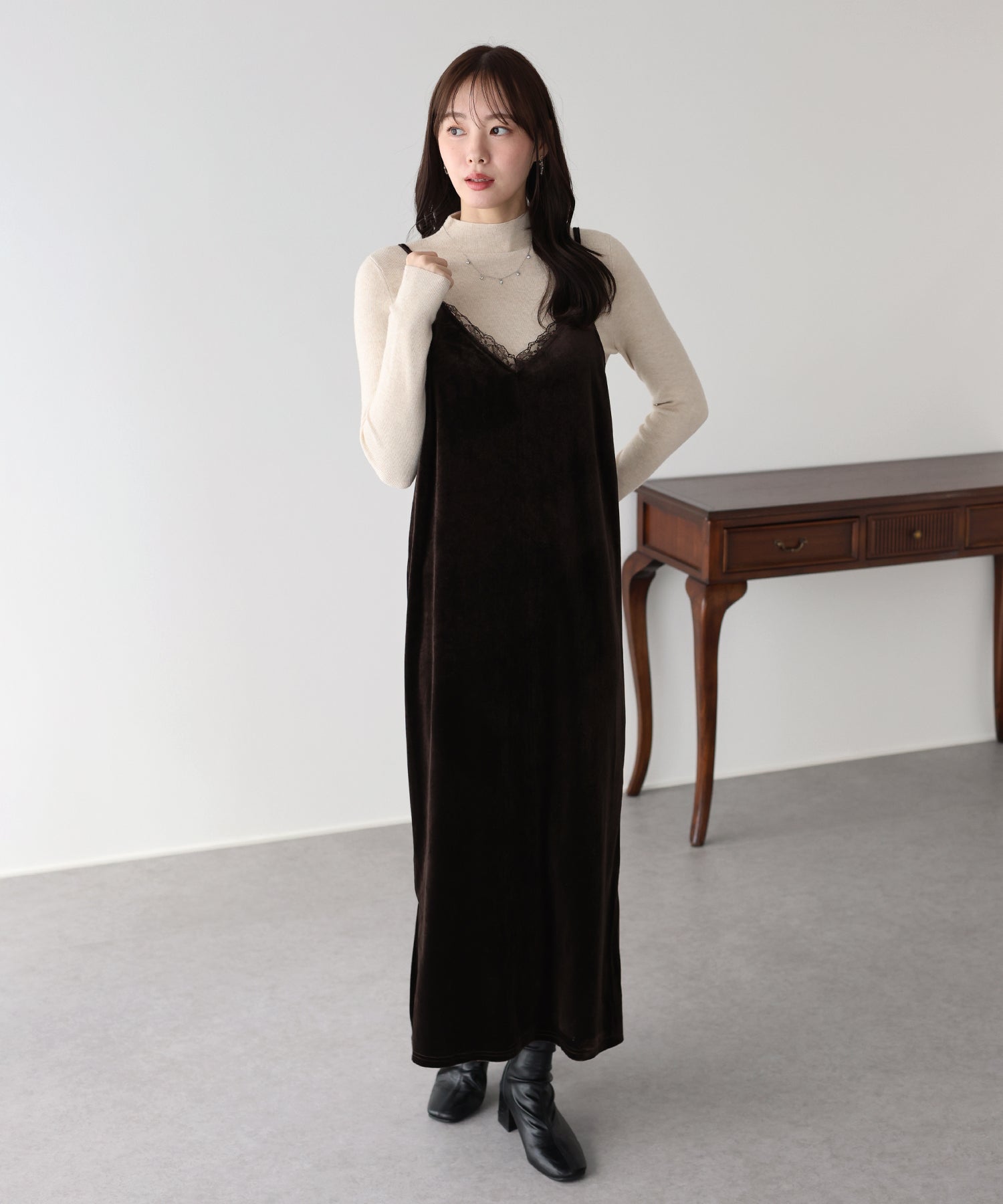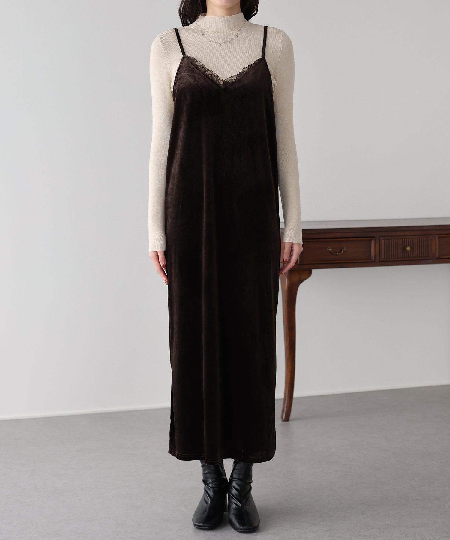 首元のレースがポイントの上品&フェミニンなベロアキャミワンピース