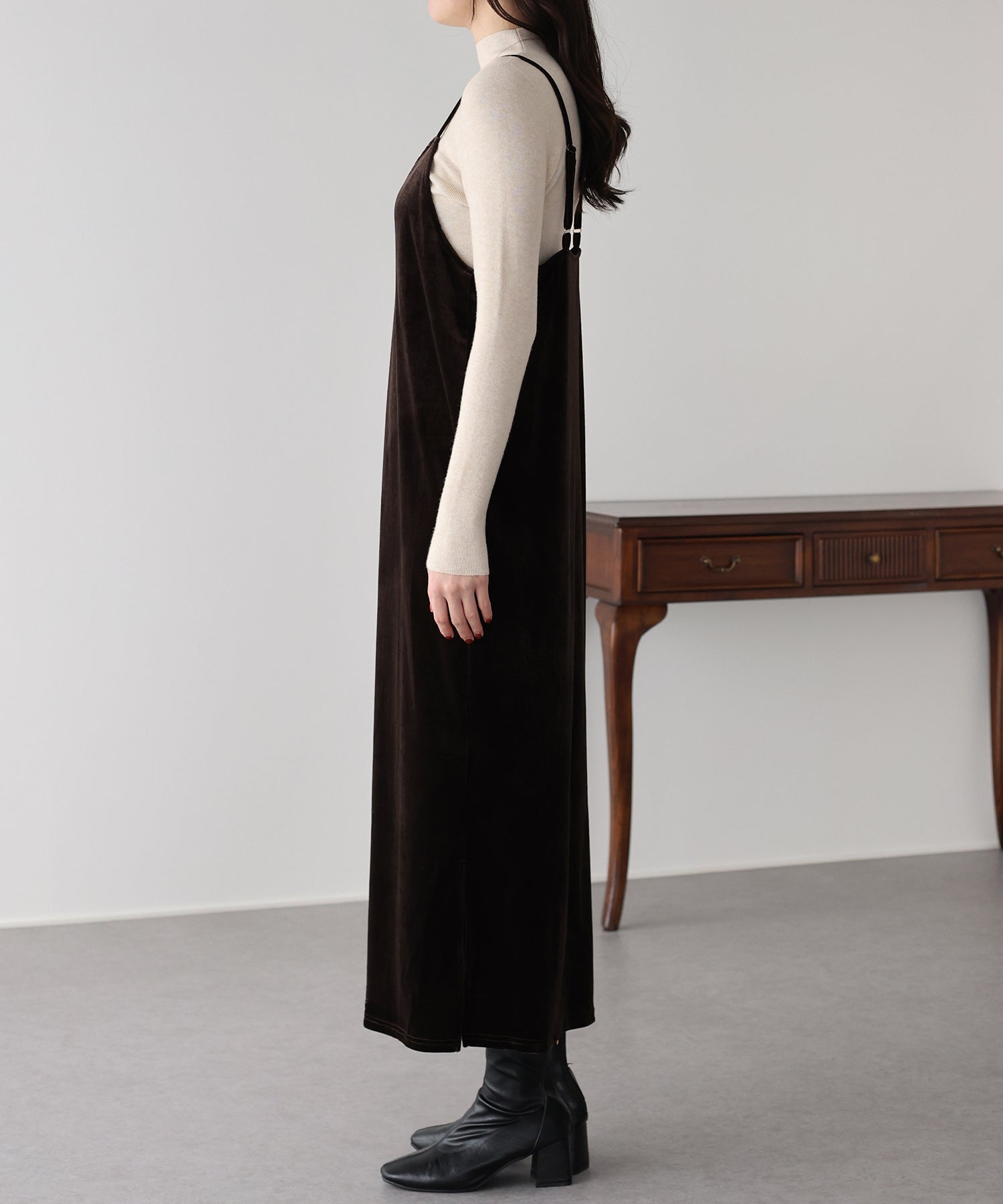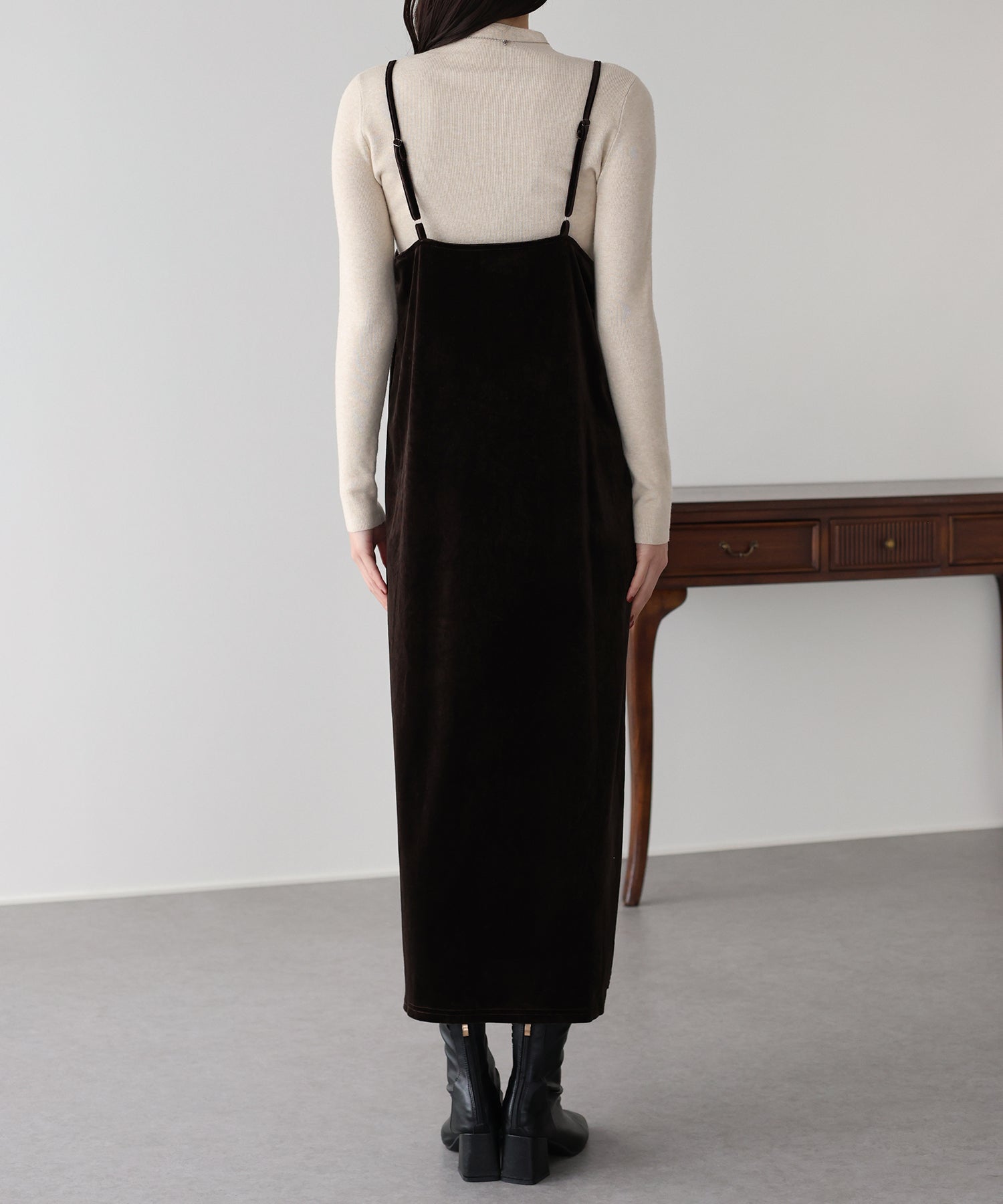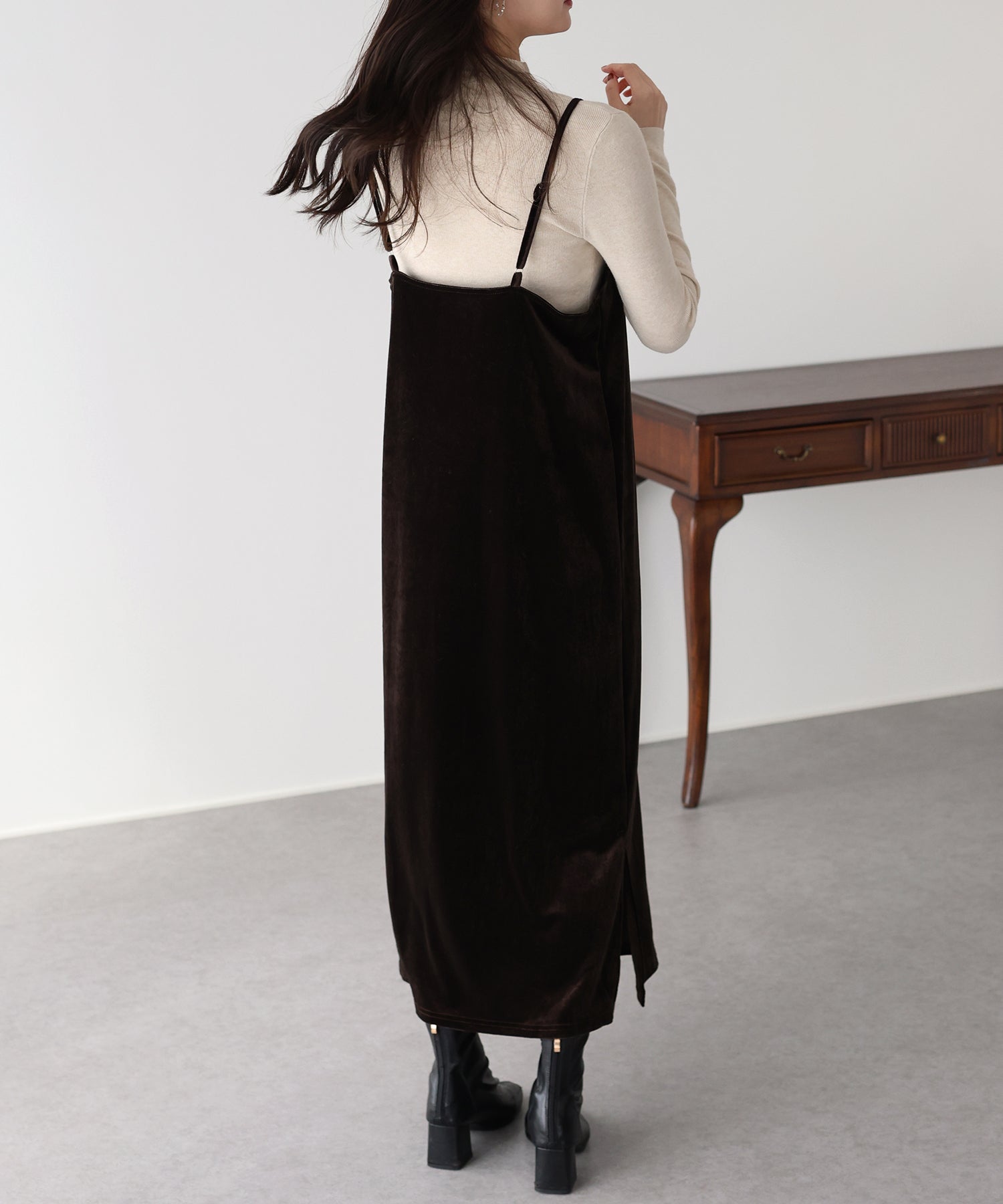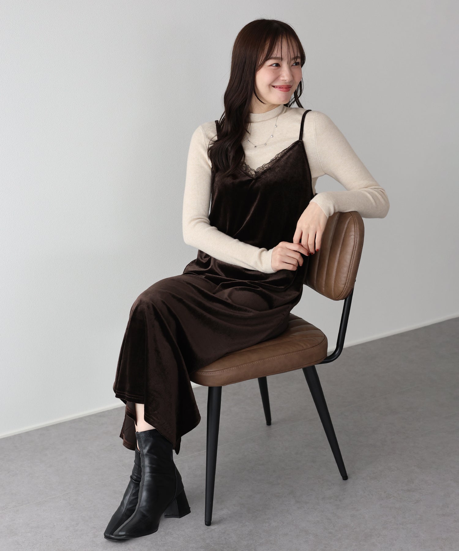 首元のレースがポイントの上品&フェミニンなベロアキャミワンピース