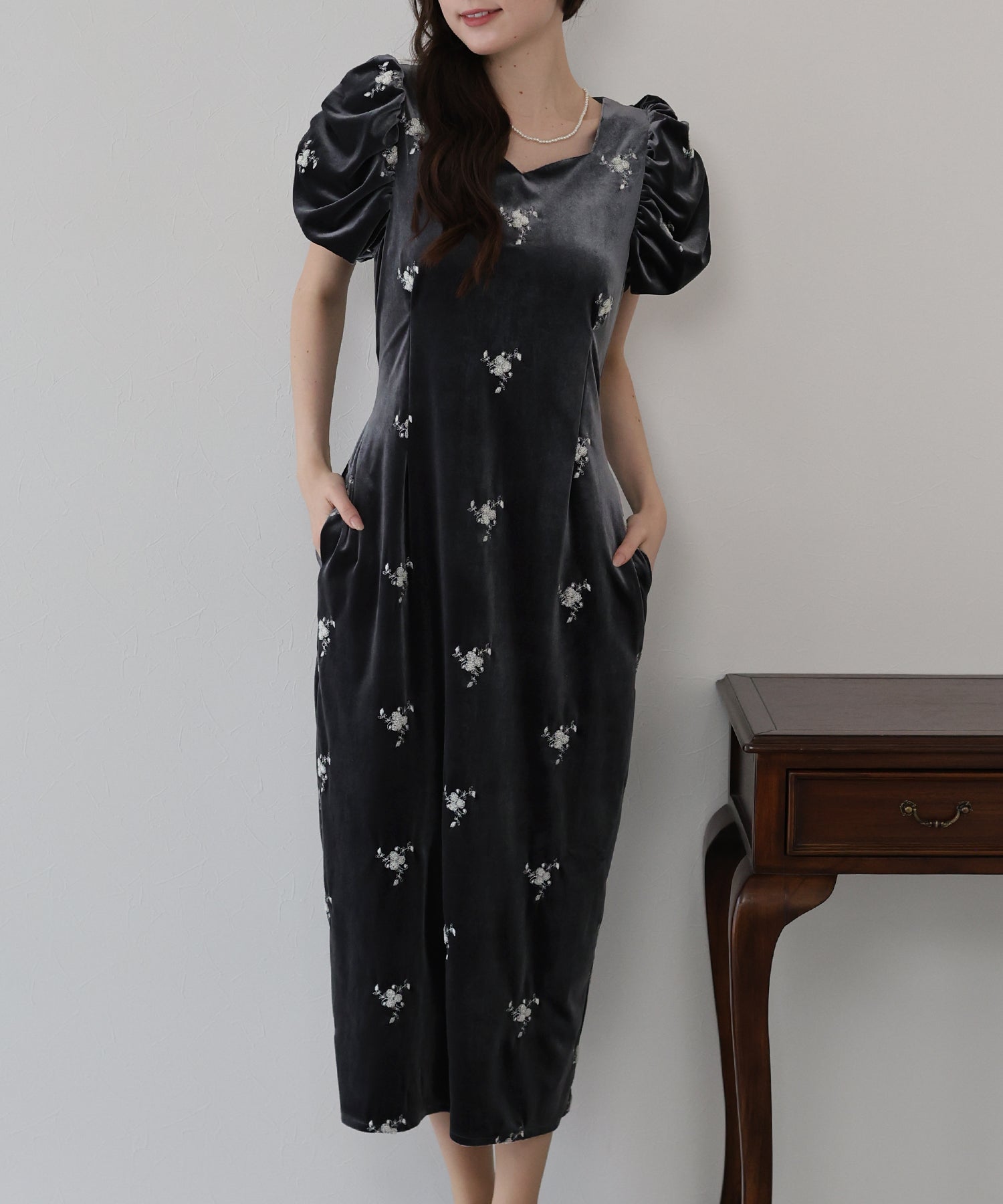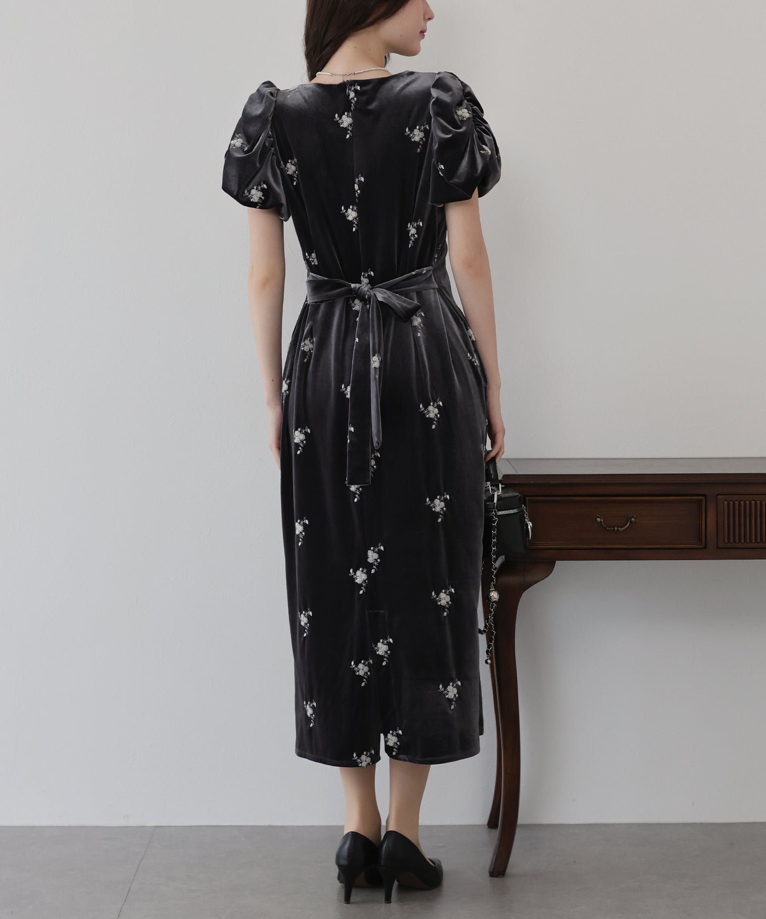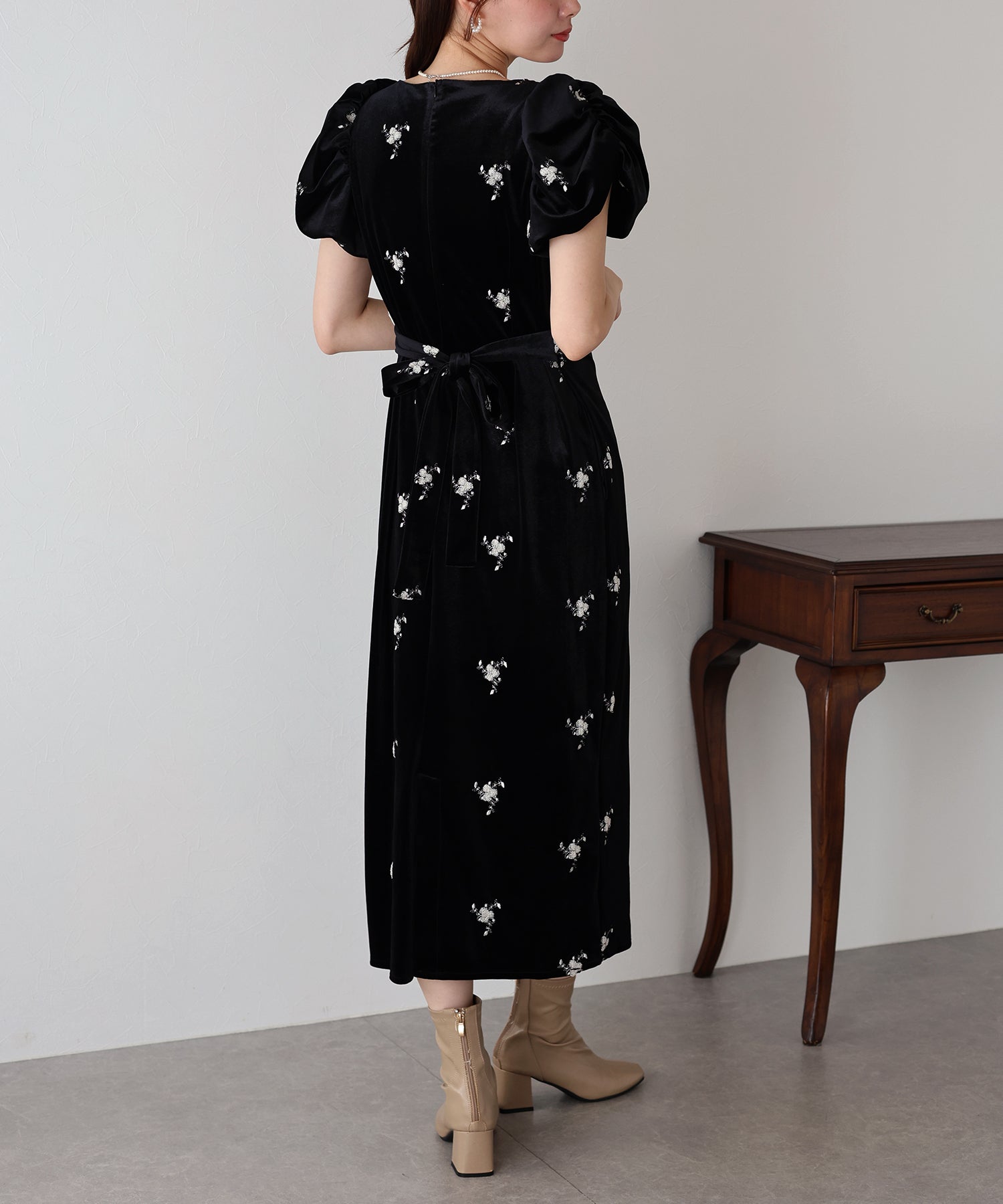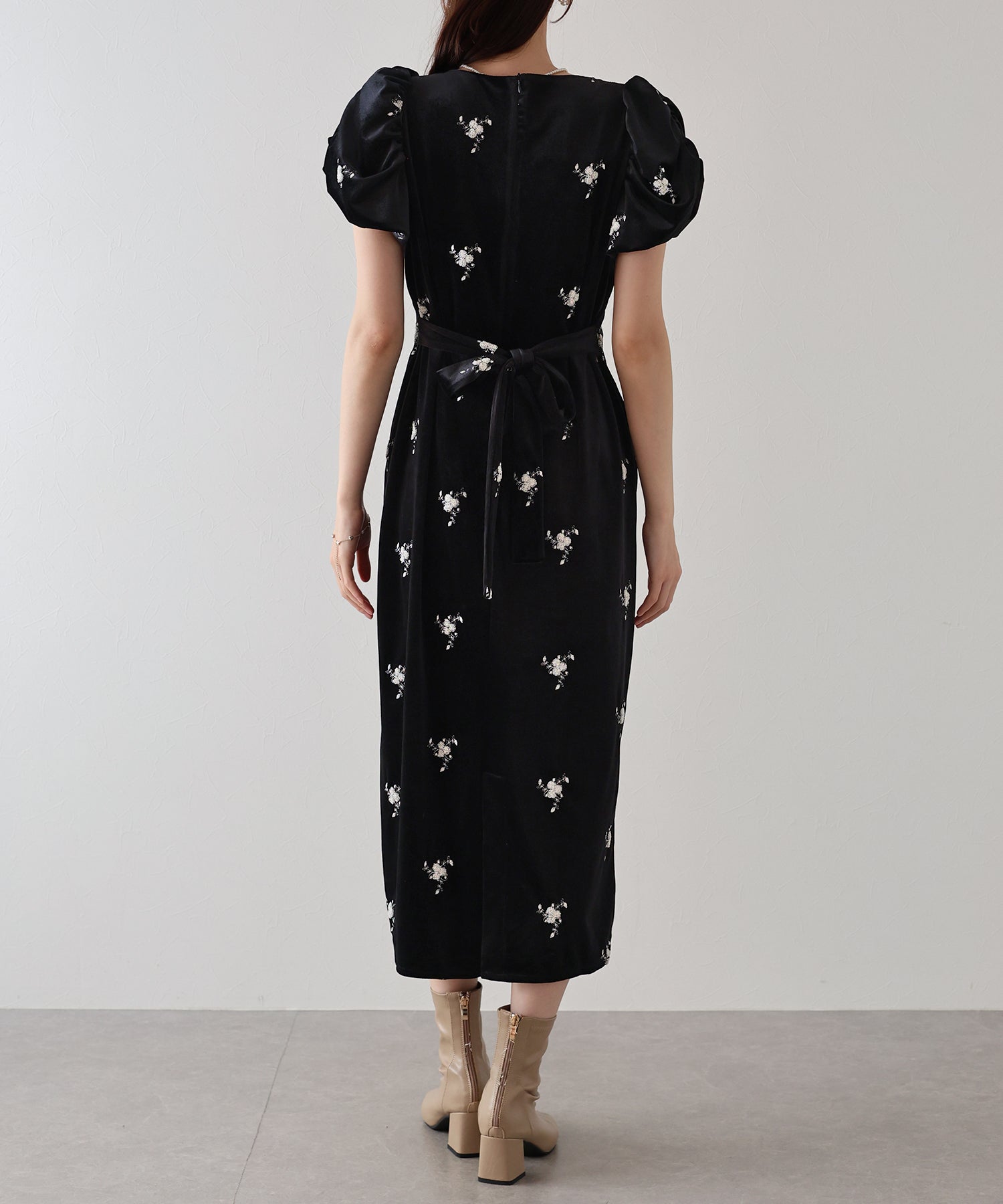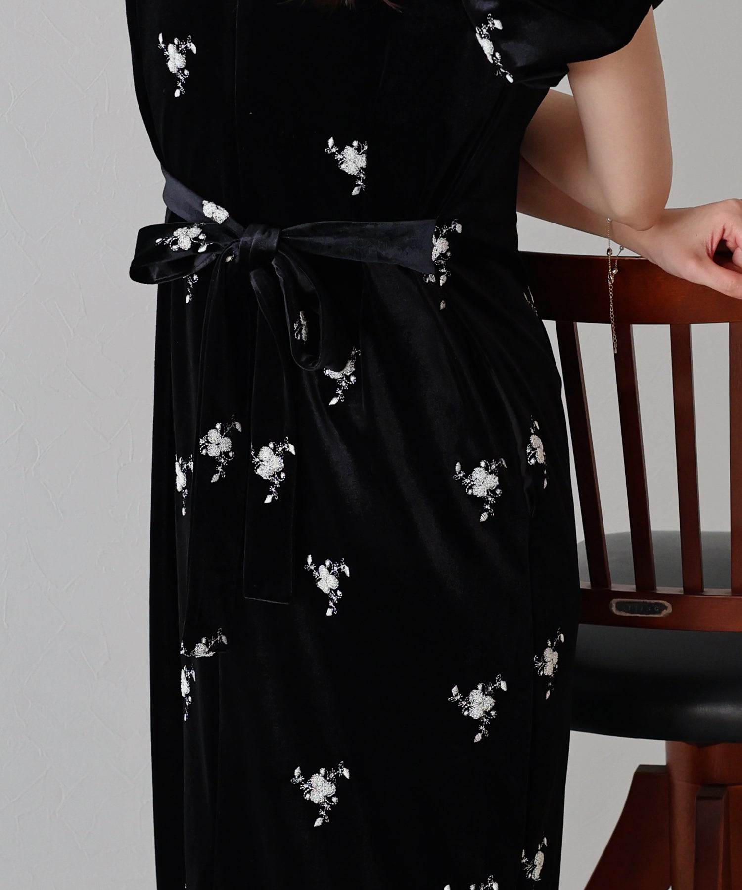 高級感のあるトレンドのベロア生地に花柄刺繍をあしらったワンピース。