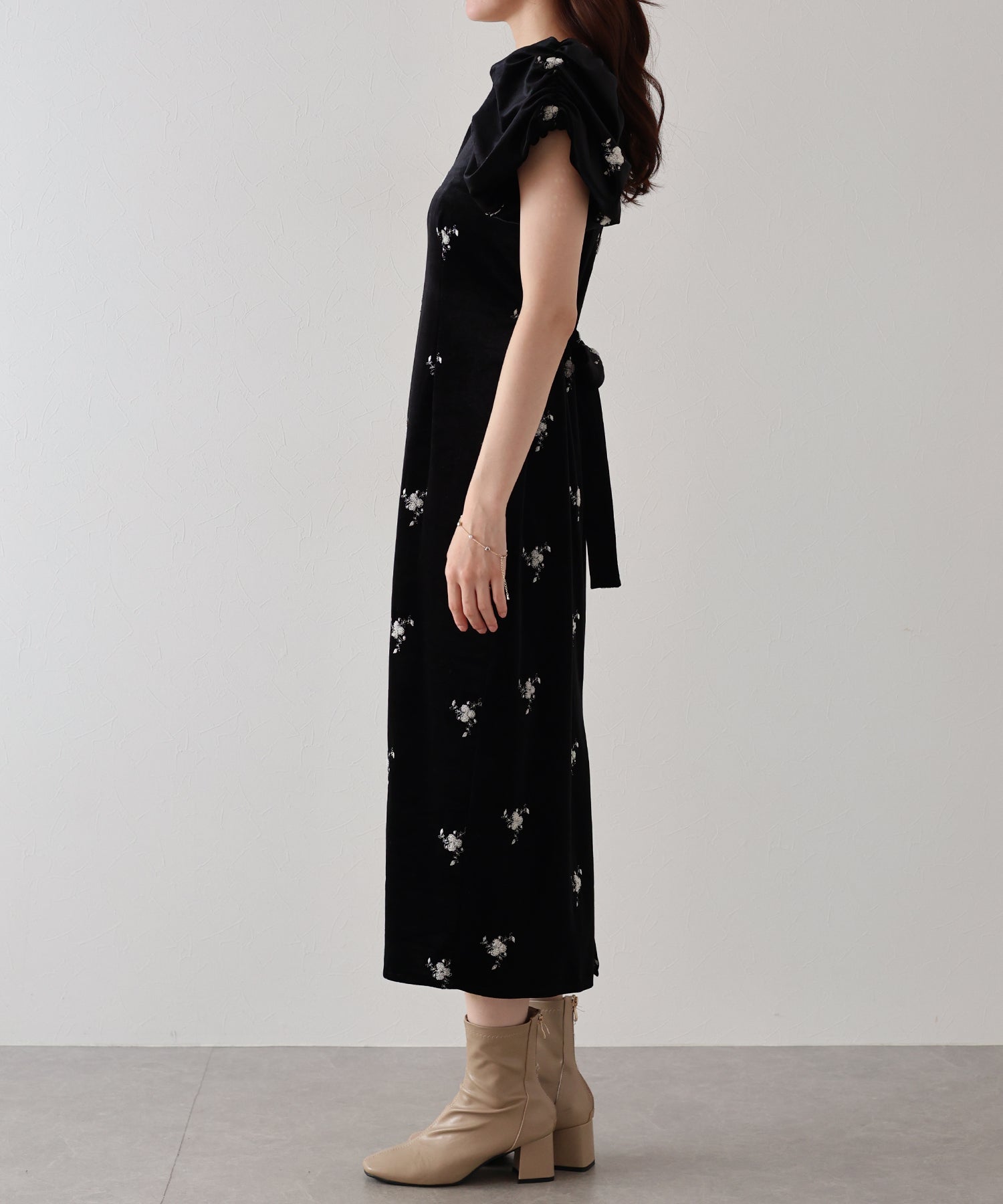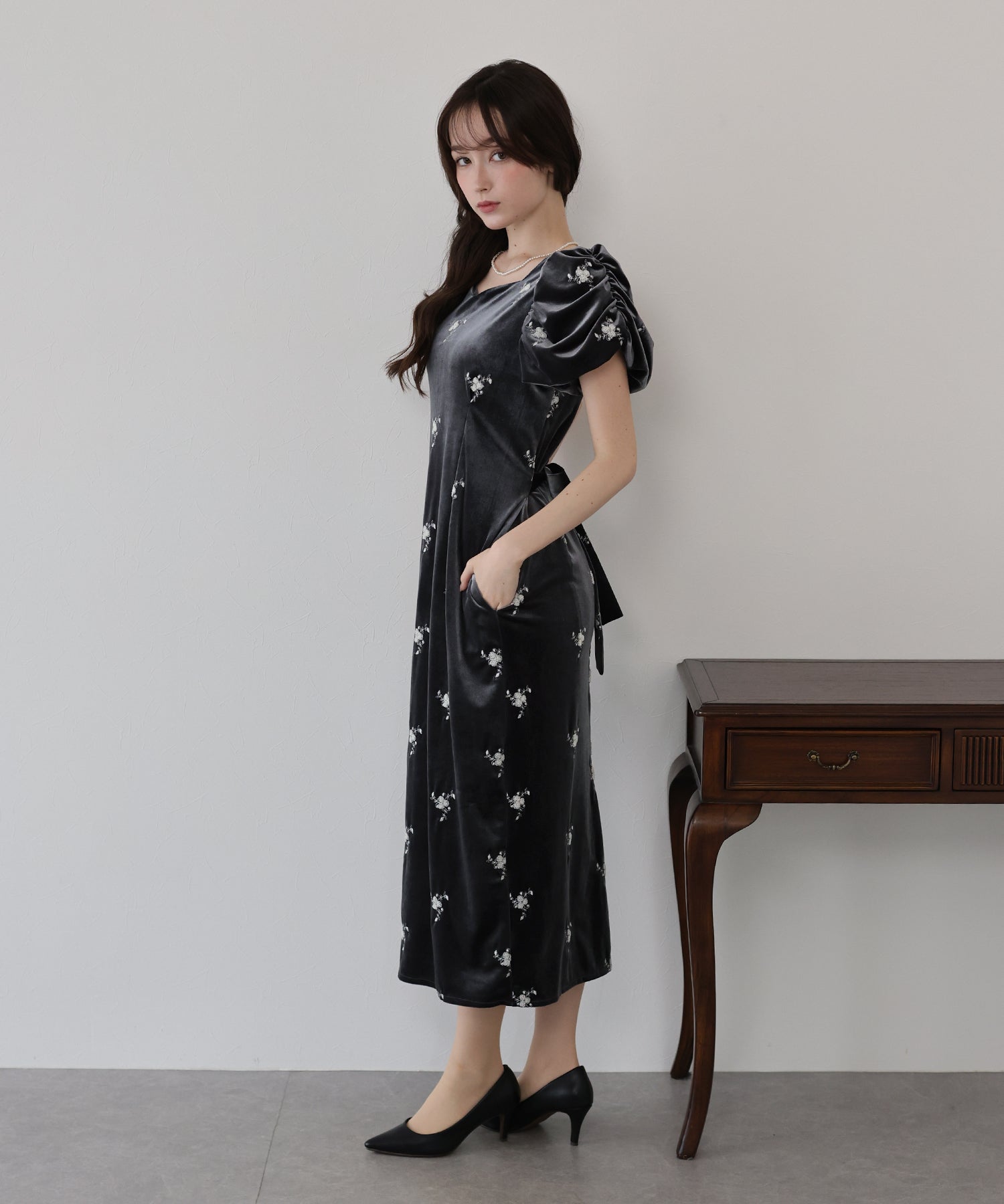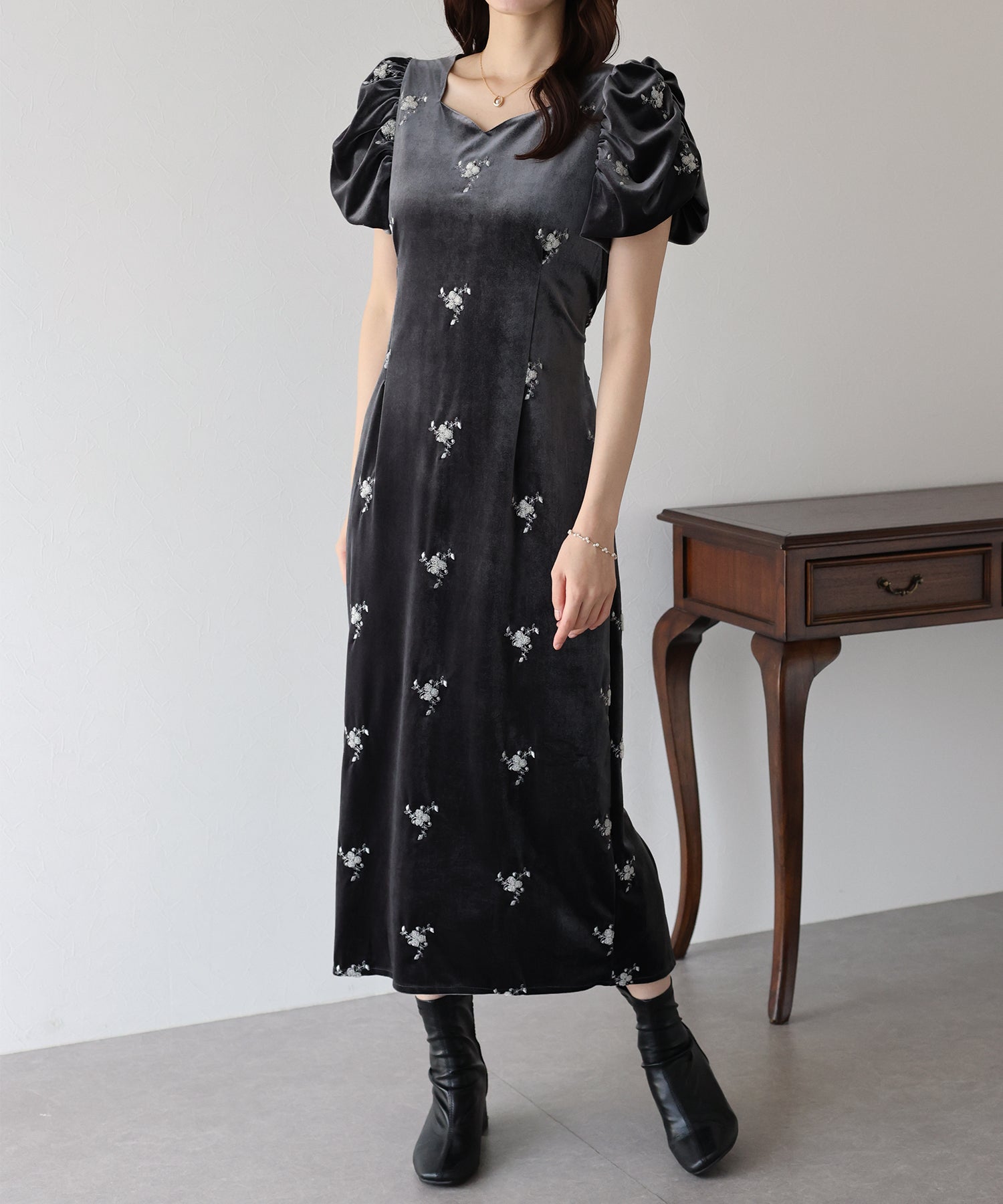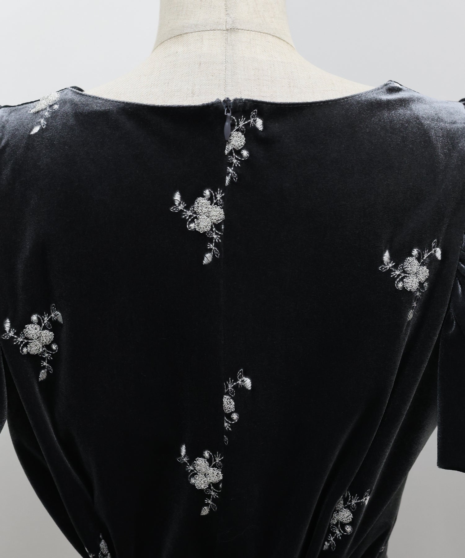 高級感のあるトレンドのベロア生地に花柄刺繍をあしらったワンピース。
