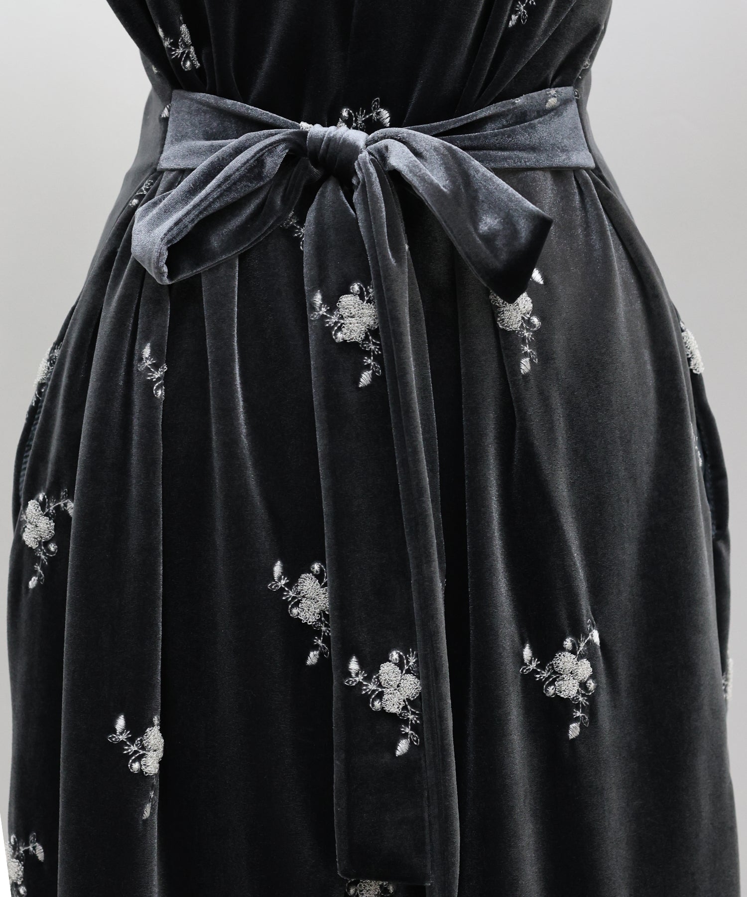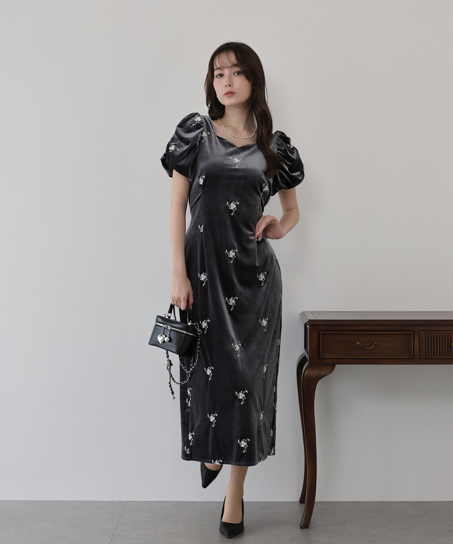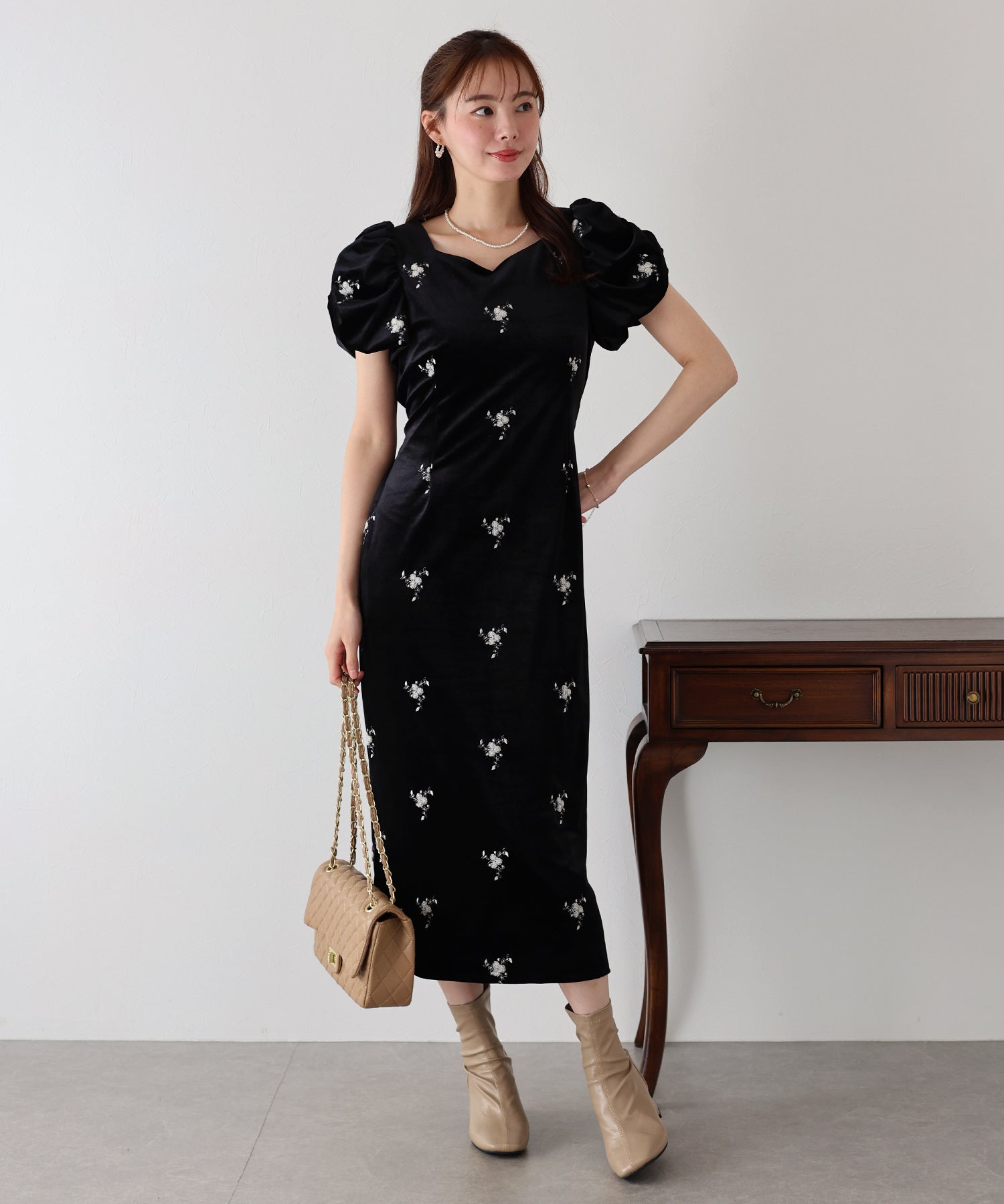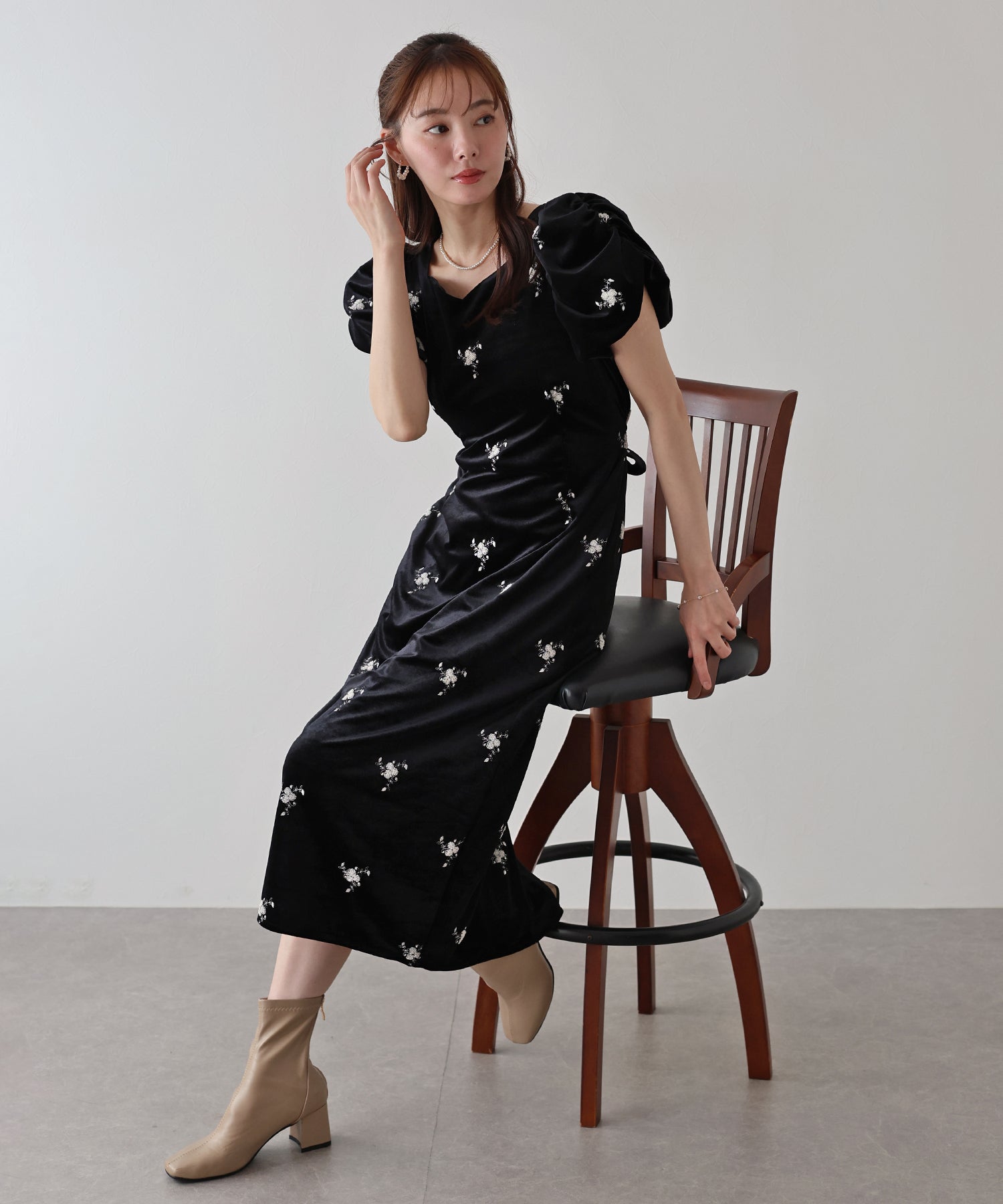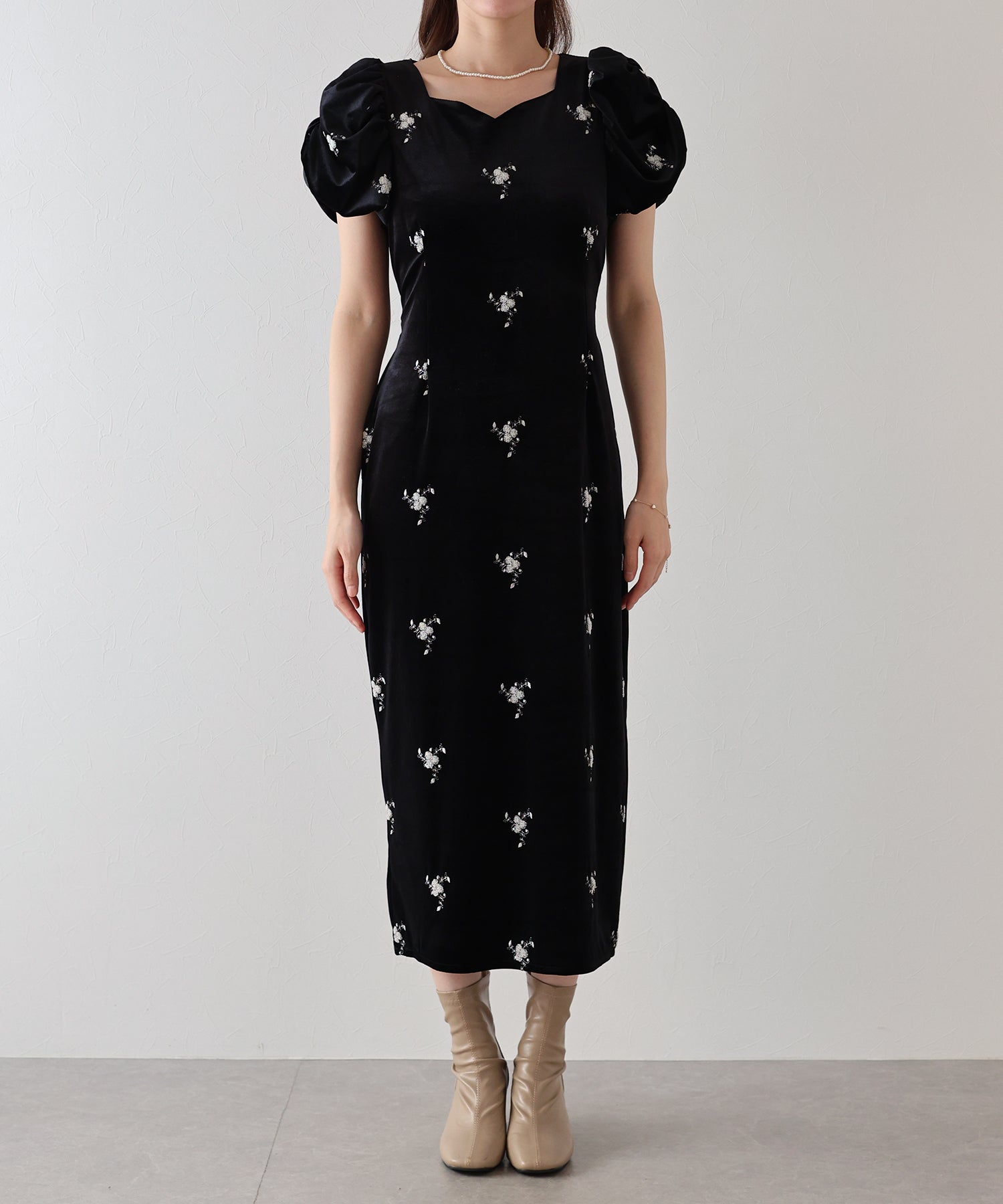 高級感のあるトレンドのベロア生地に花柄刺繍をあしらったワンピース。