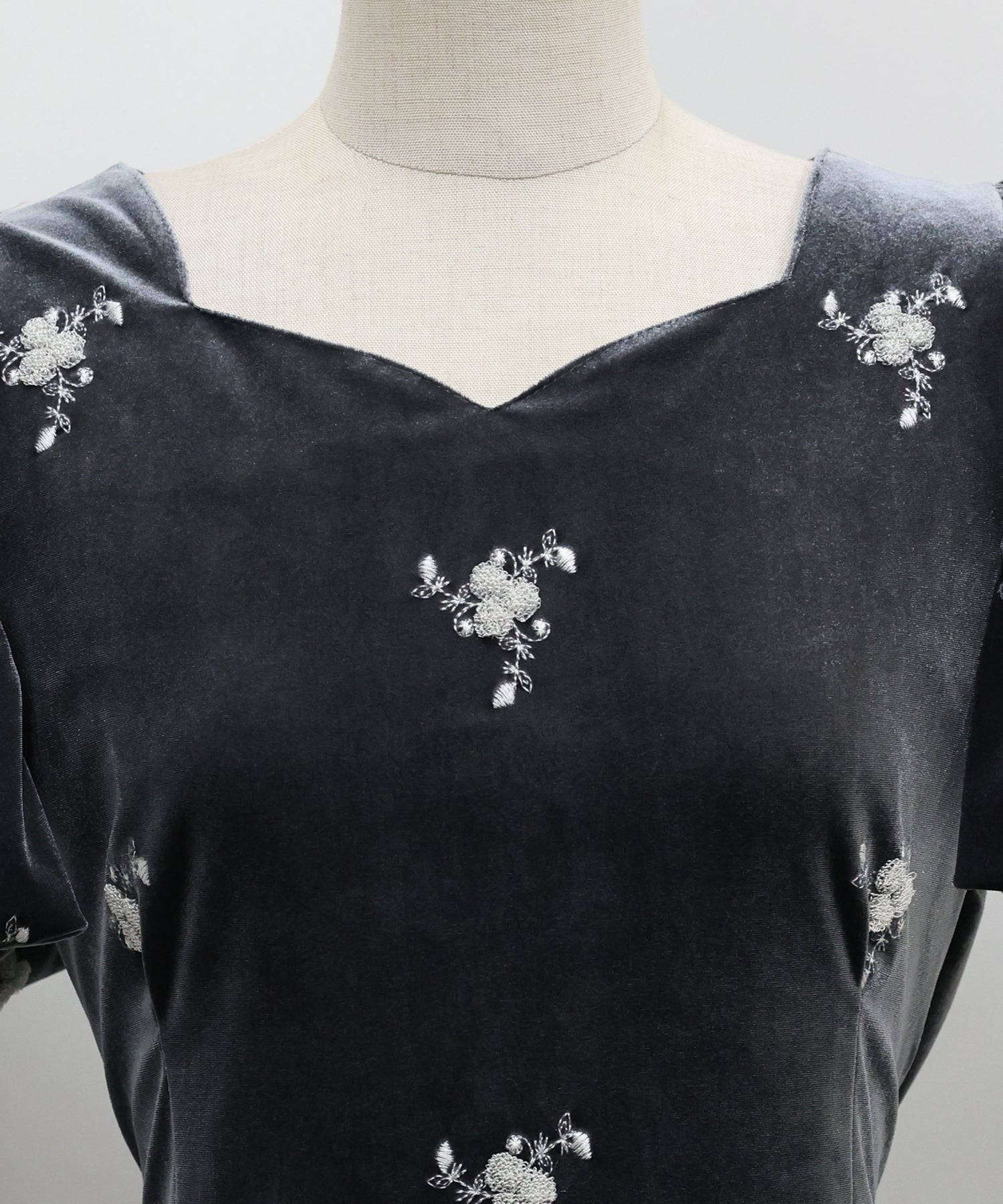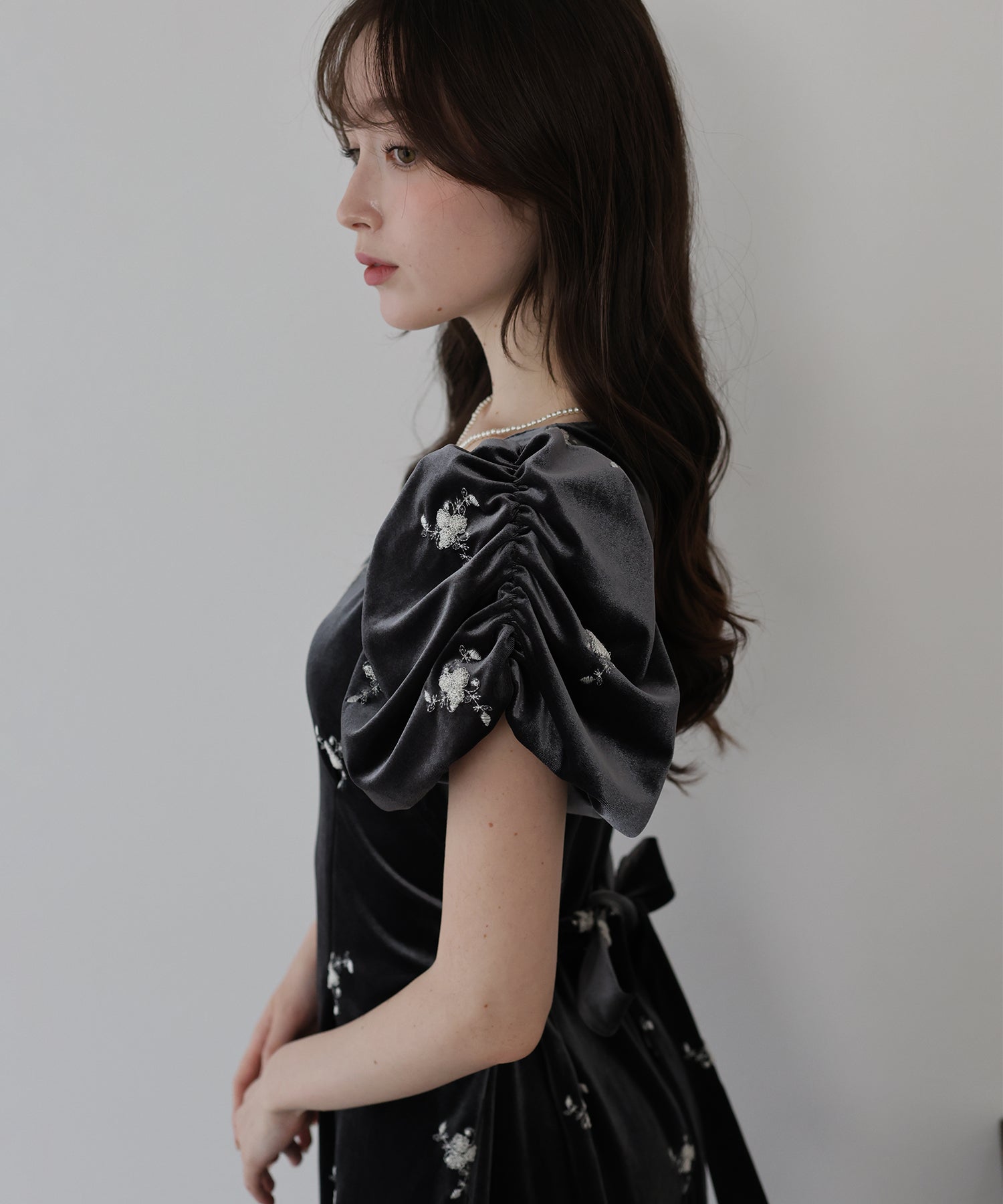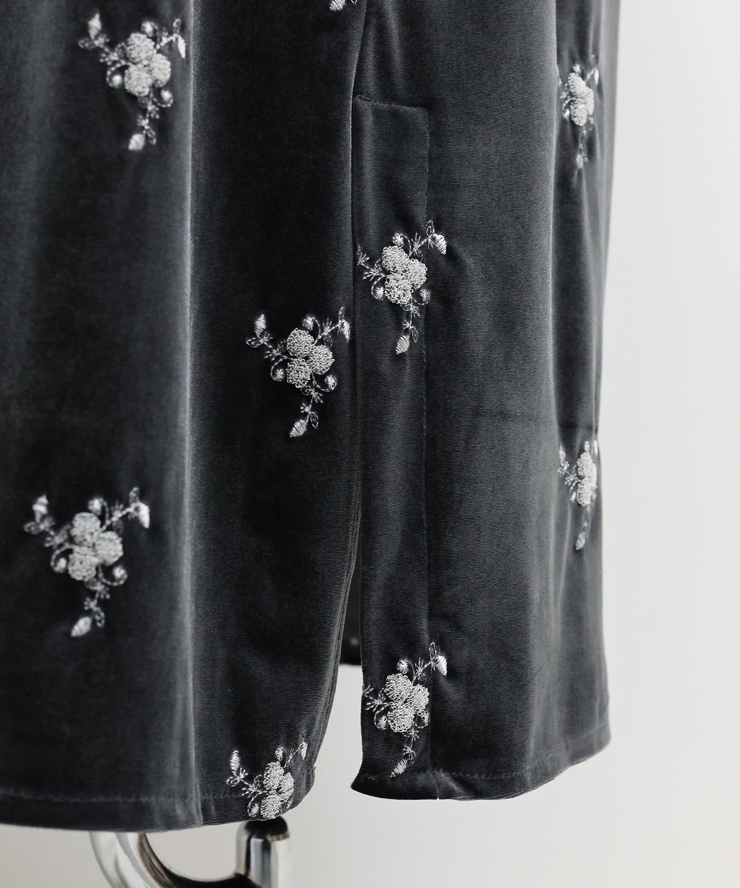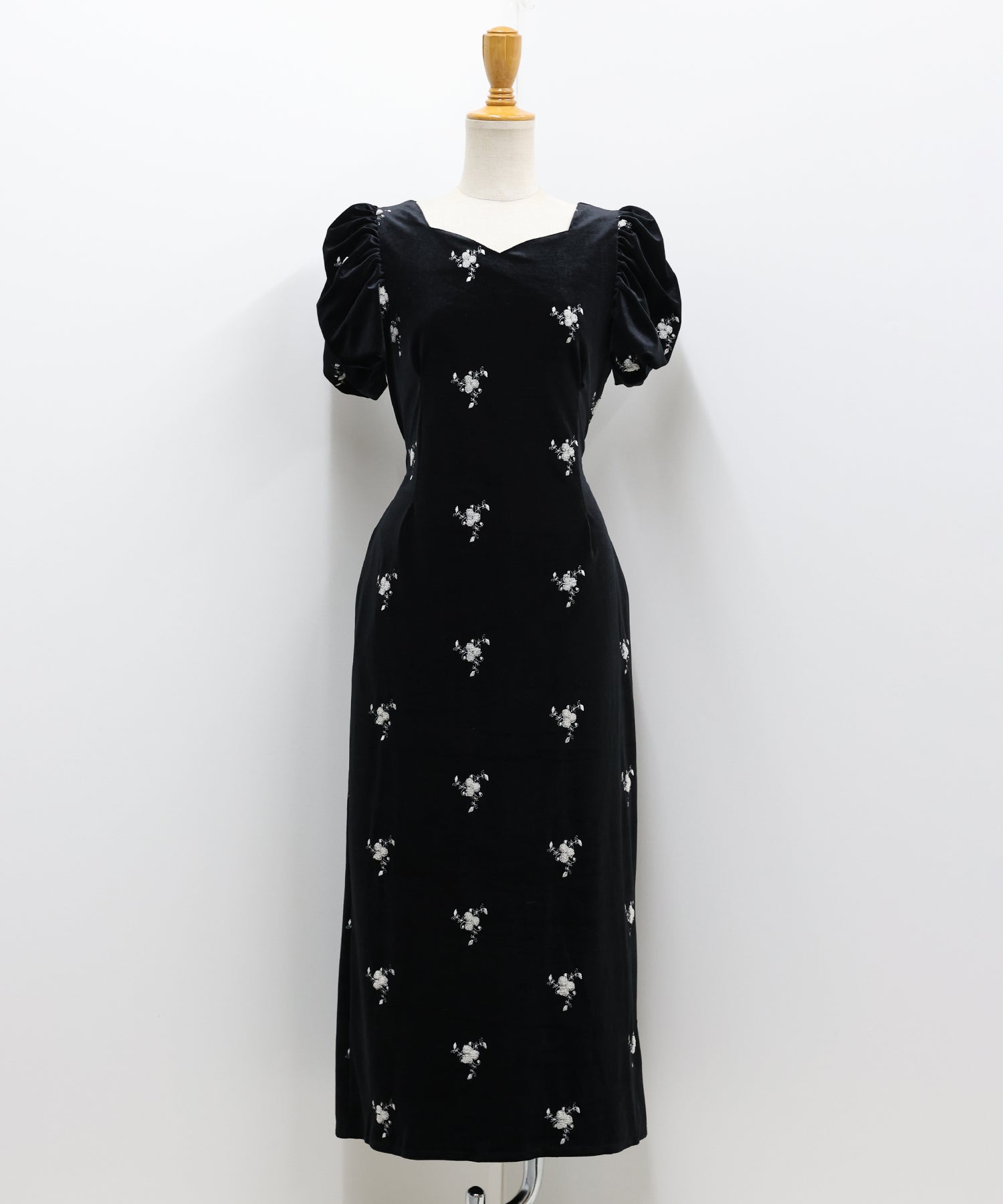 高級感のあるトレンドのベロア生地に花柄刺繍をあしらったワンピース。