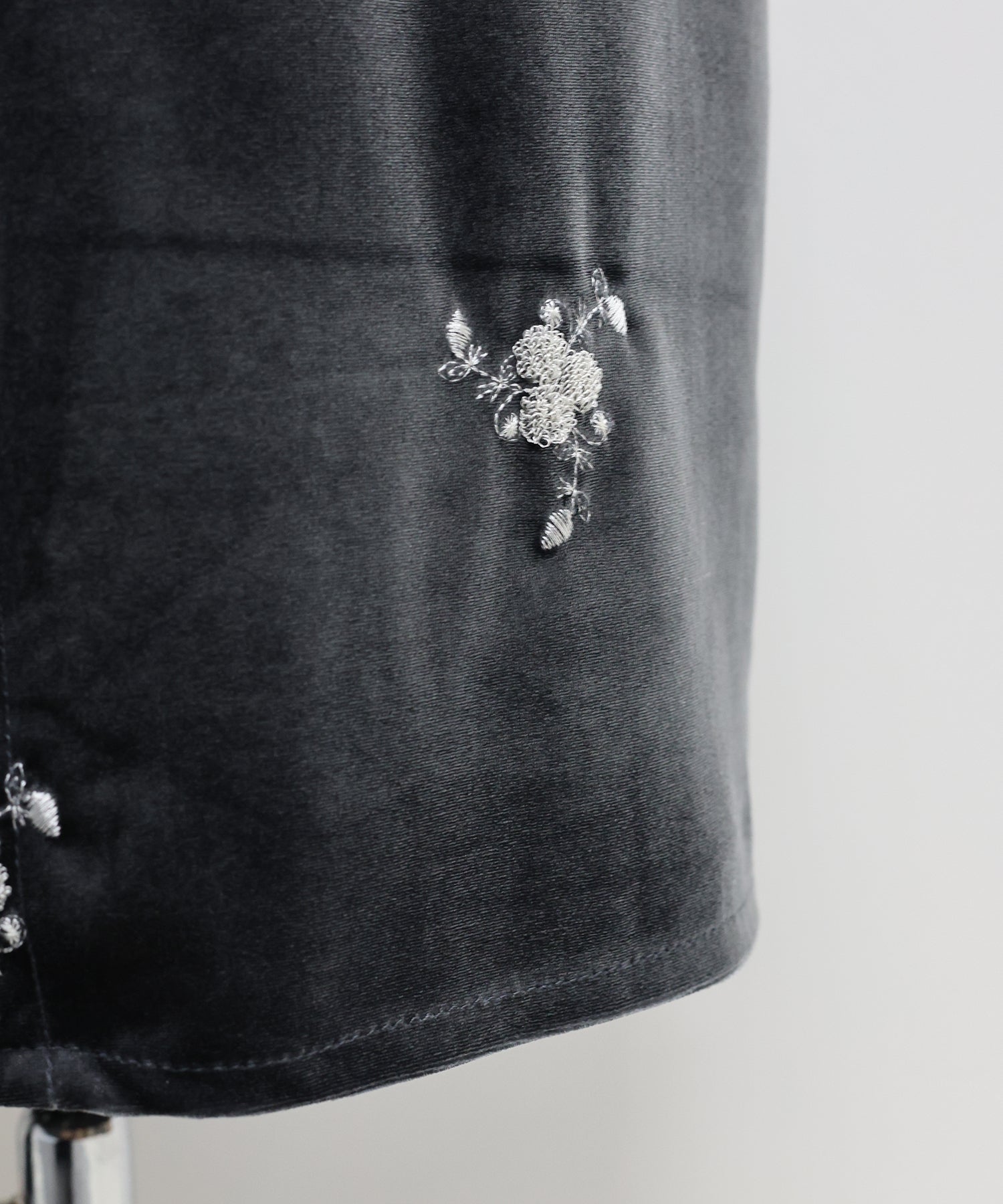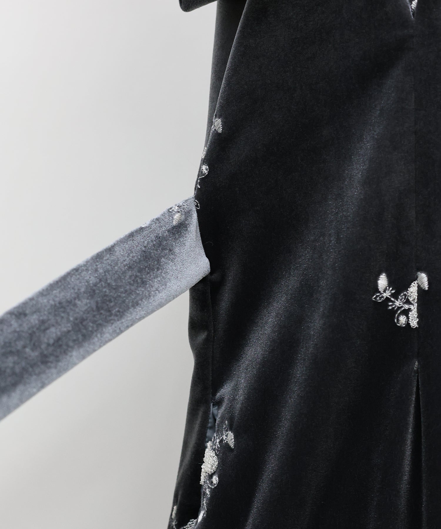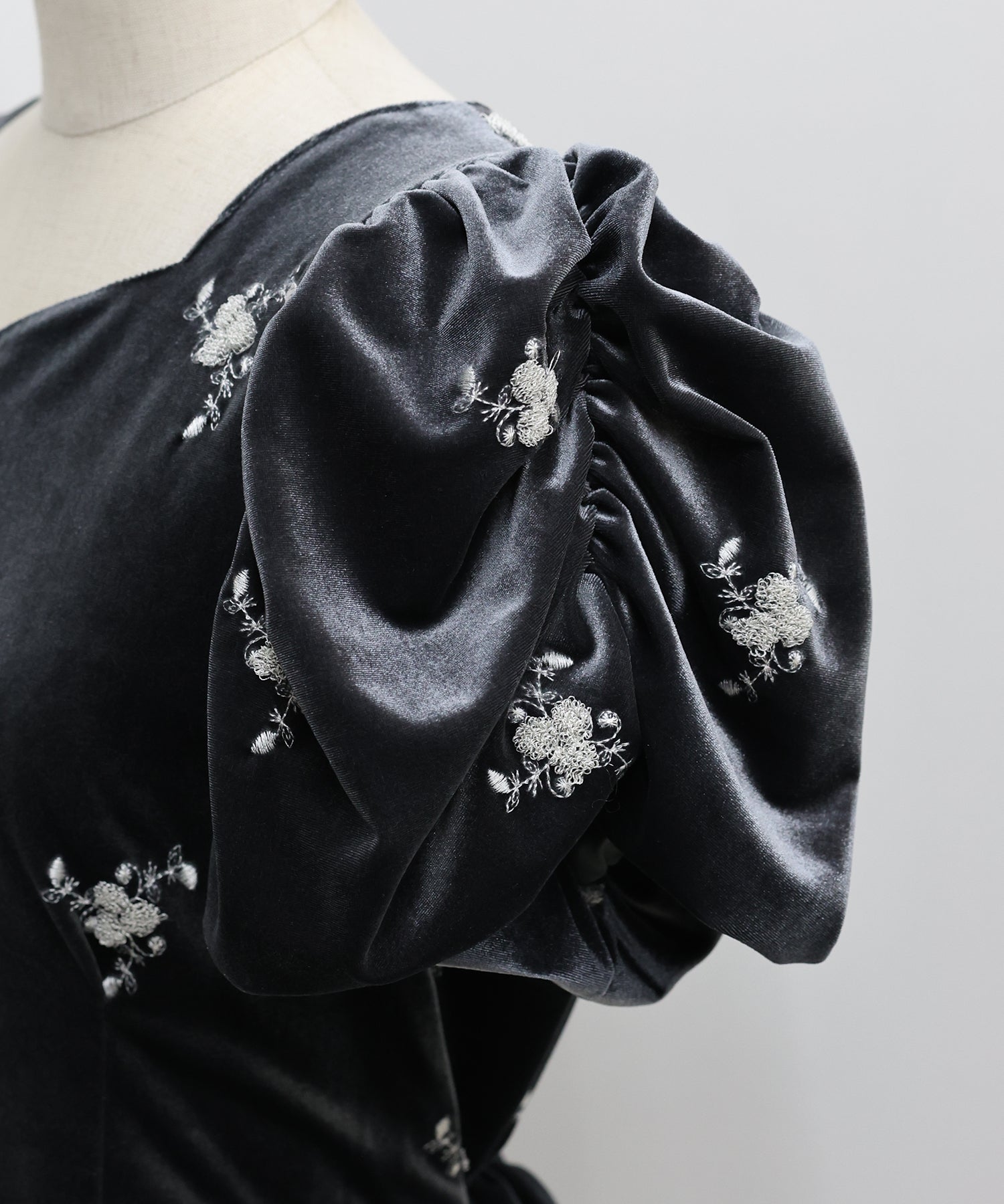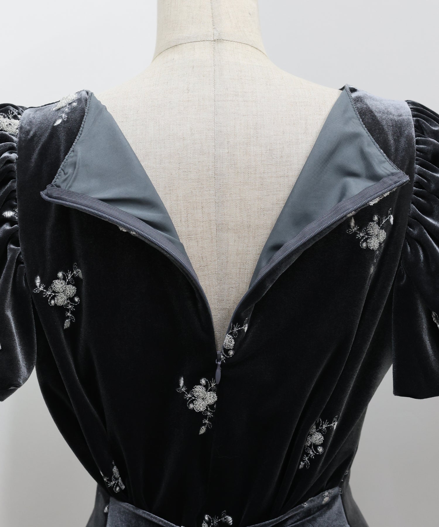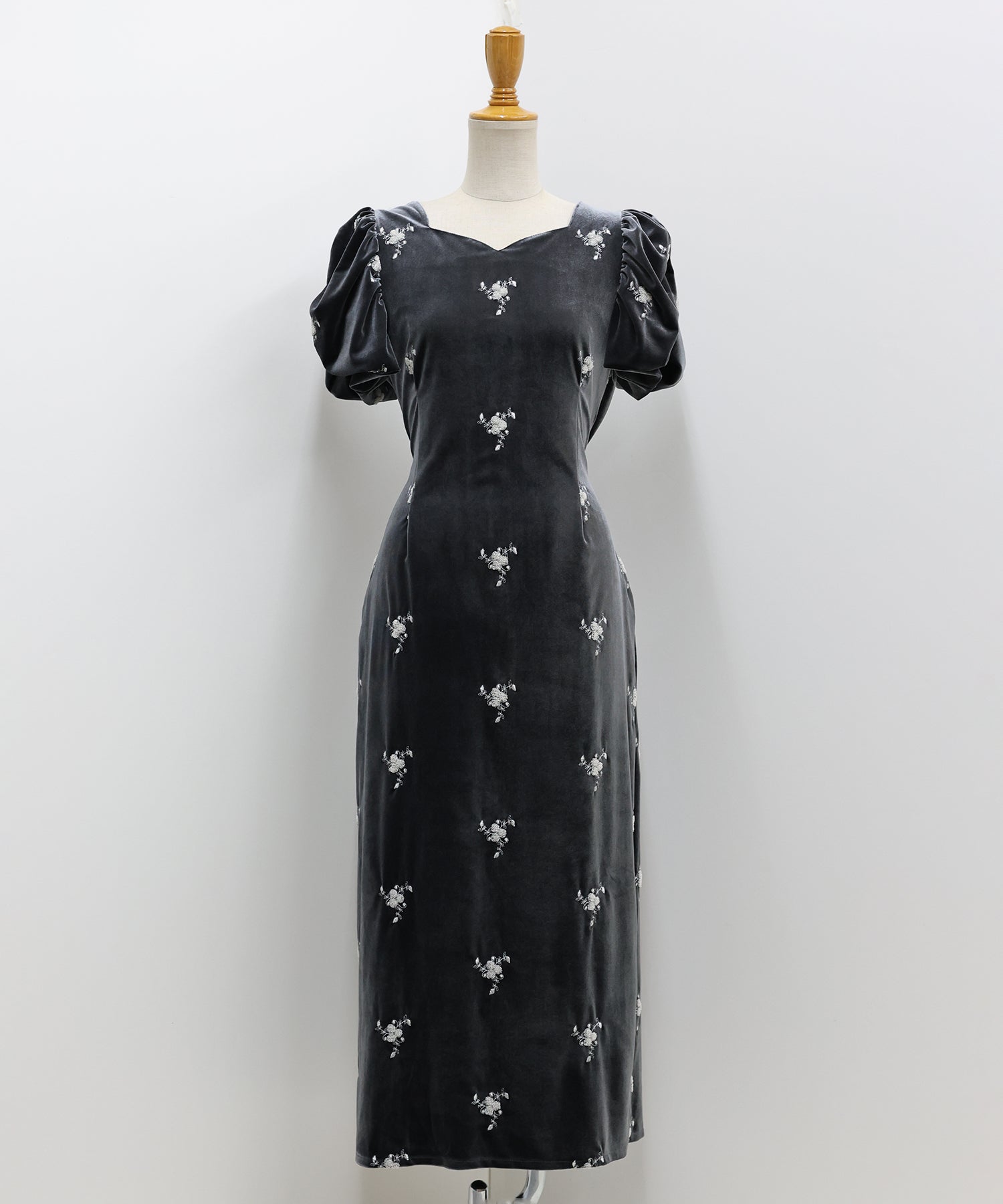 高級感のあるトレンドのベロア生地に花柄刺繍をあしらったワンピース。
