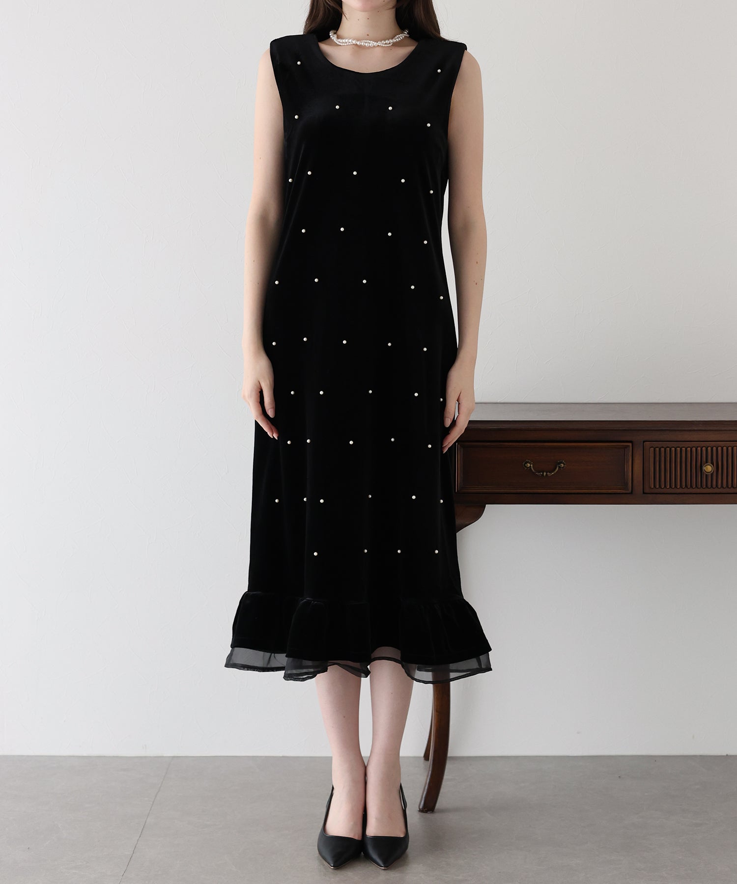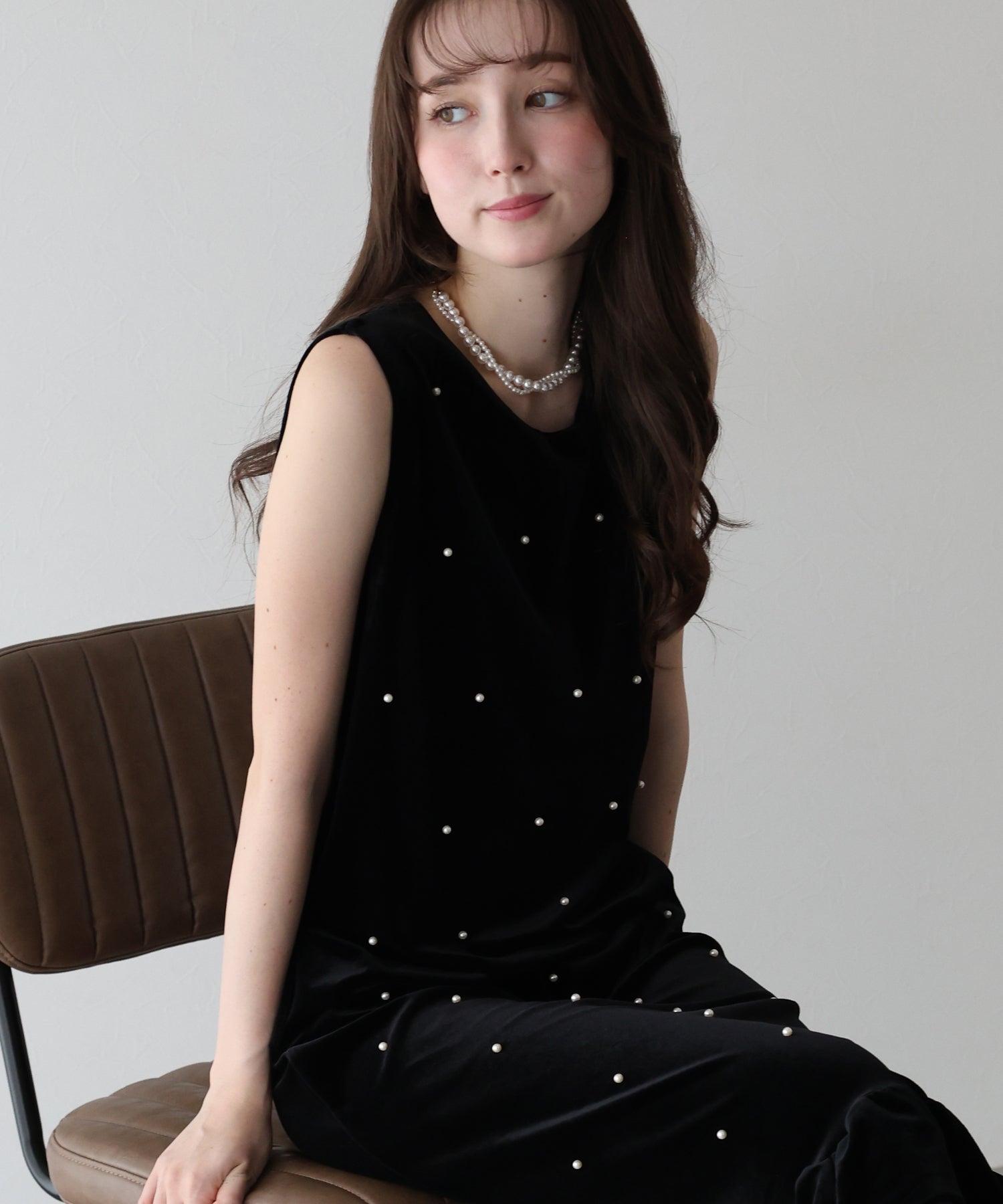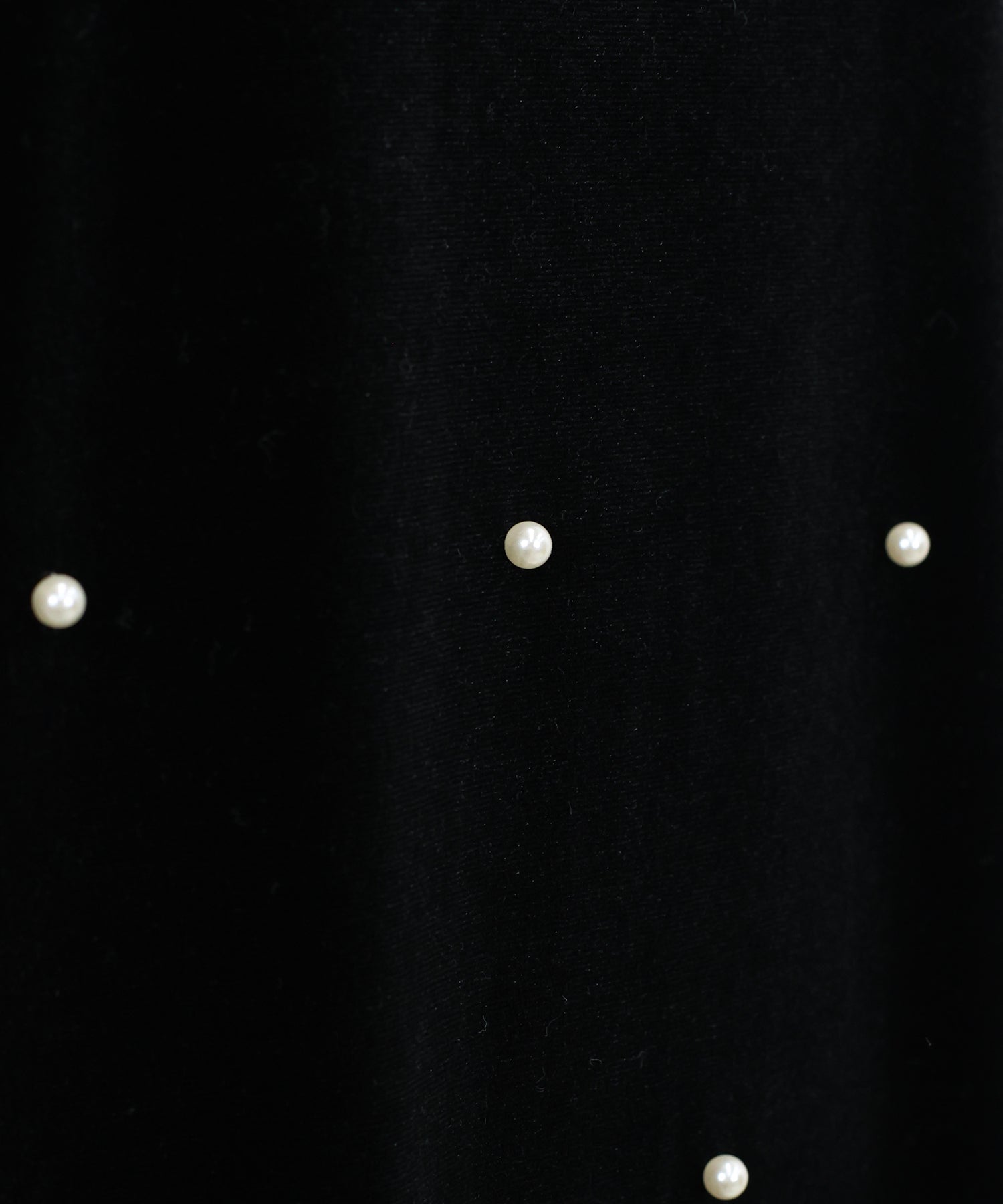 高級感のあるトレンドのベロア生地にパールをランダムにあしらったワンピース。