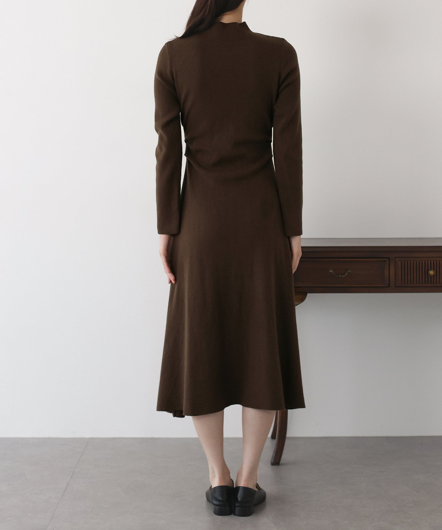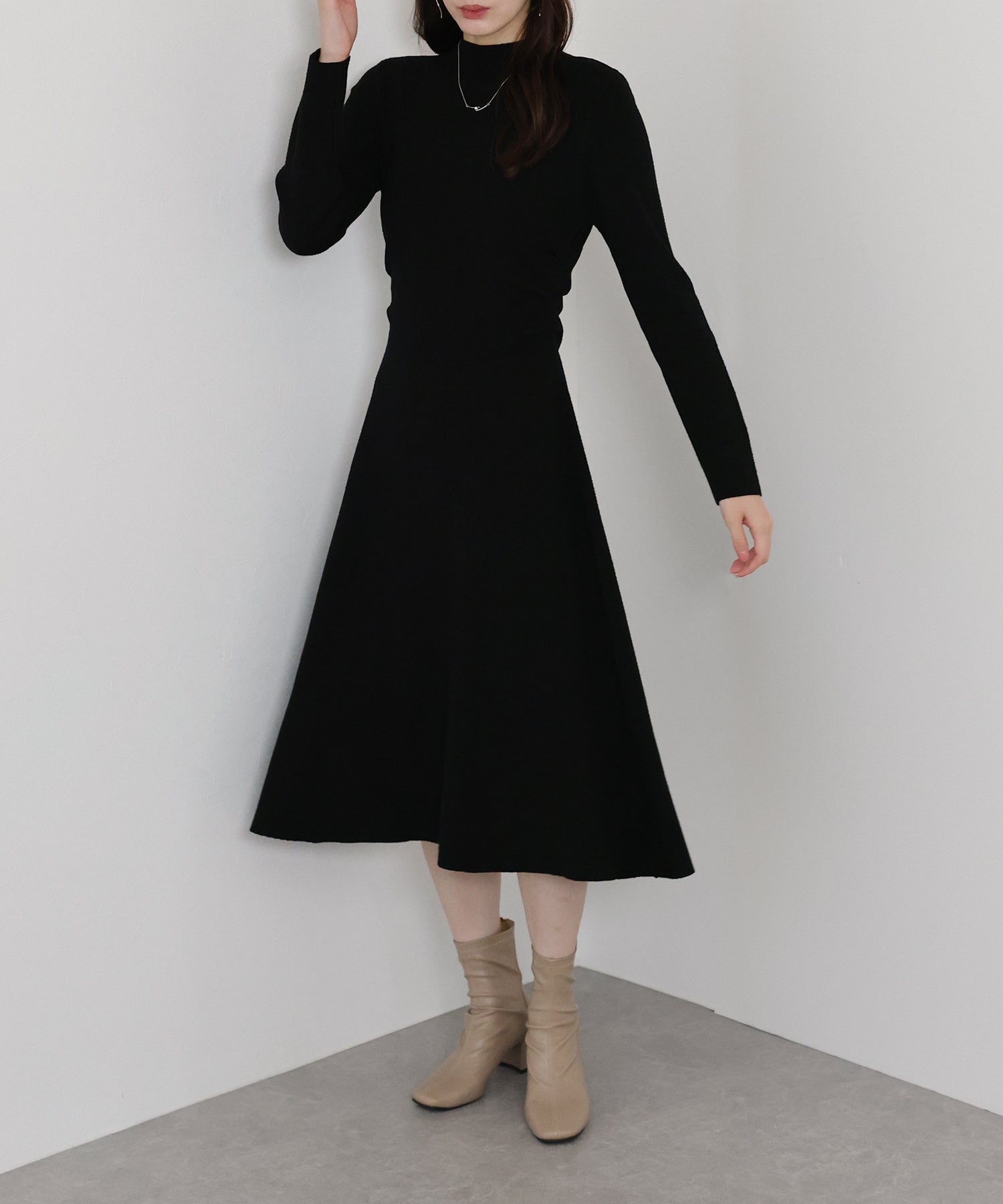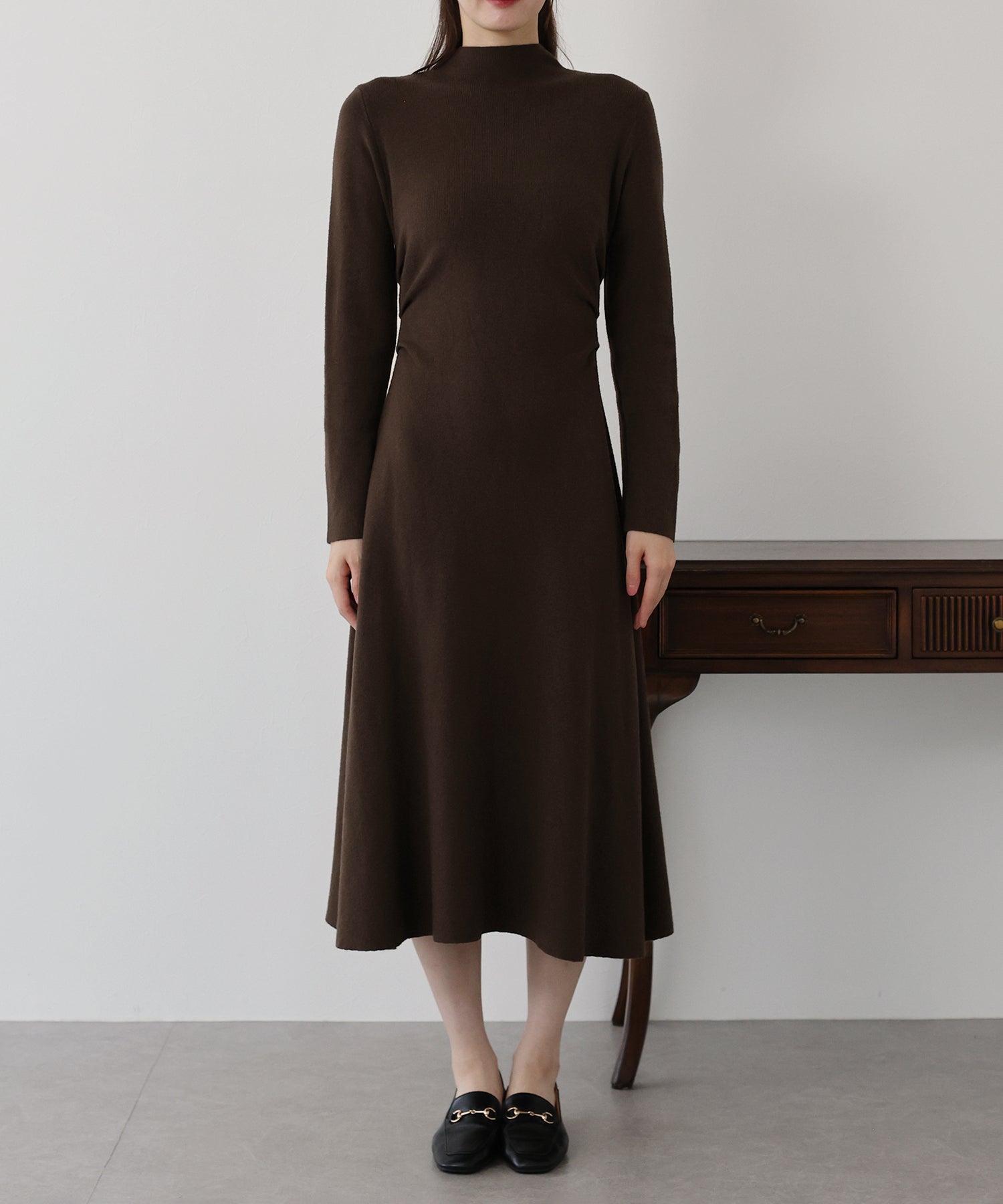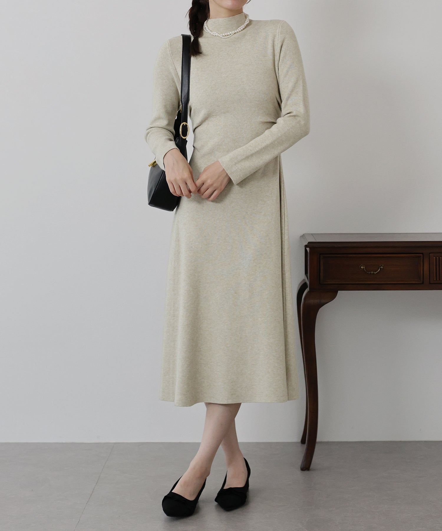 ハイネックとサイドタックが上品な印象のニットワンピース。